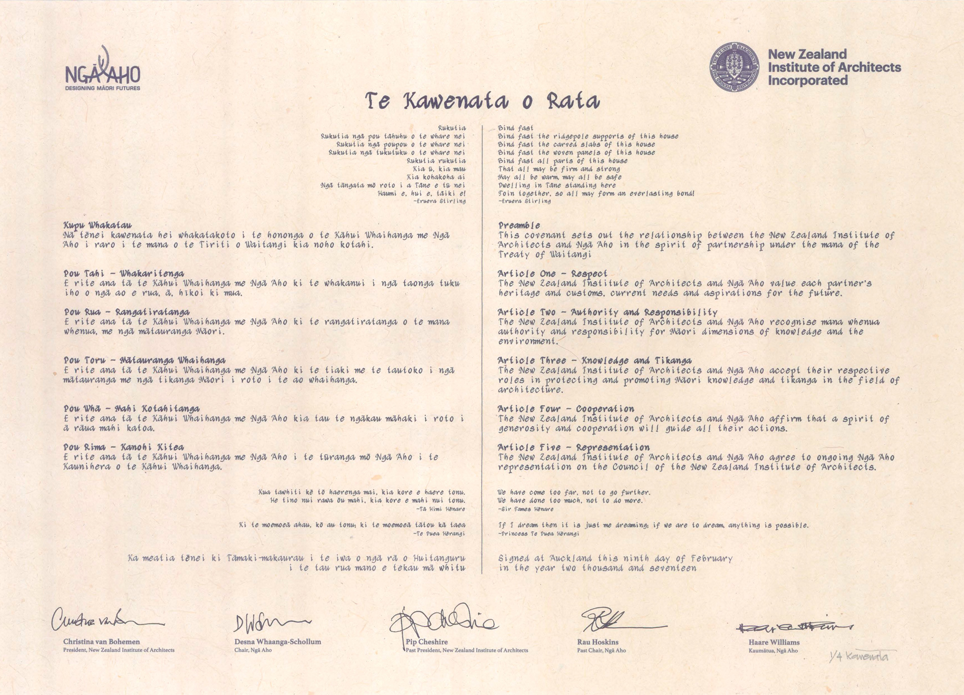 In order to give meaningful effect to the document, the working party that developed the draft kawenanta agreed to the ongoing representation of Ngā Aho on the NZIA Council.