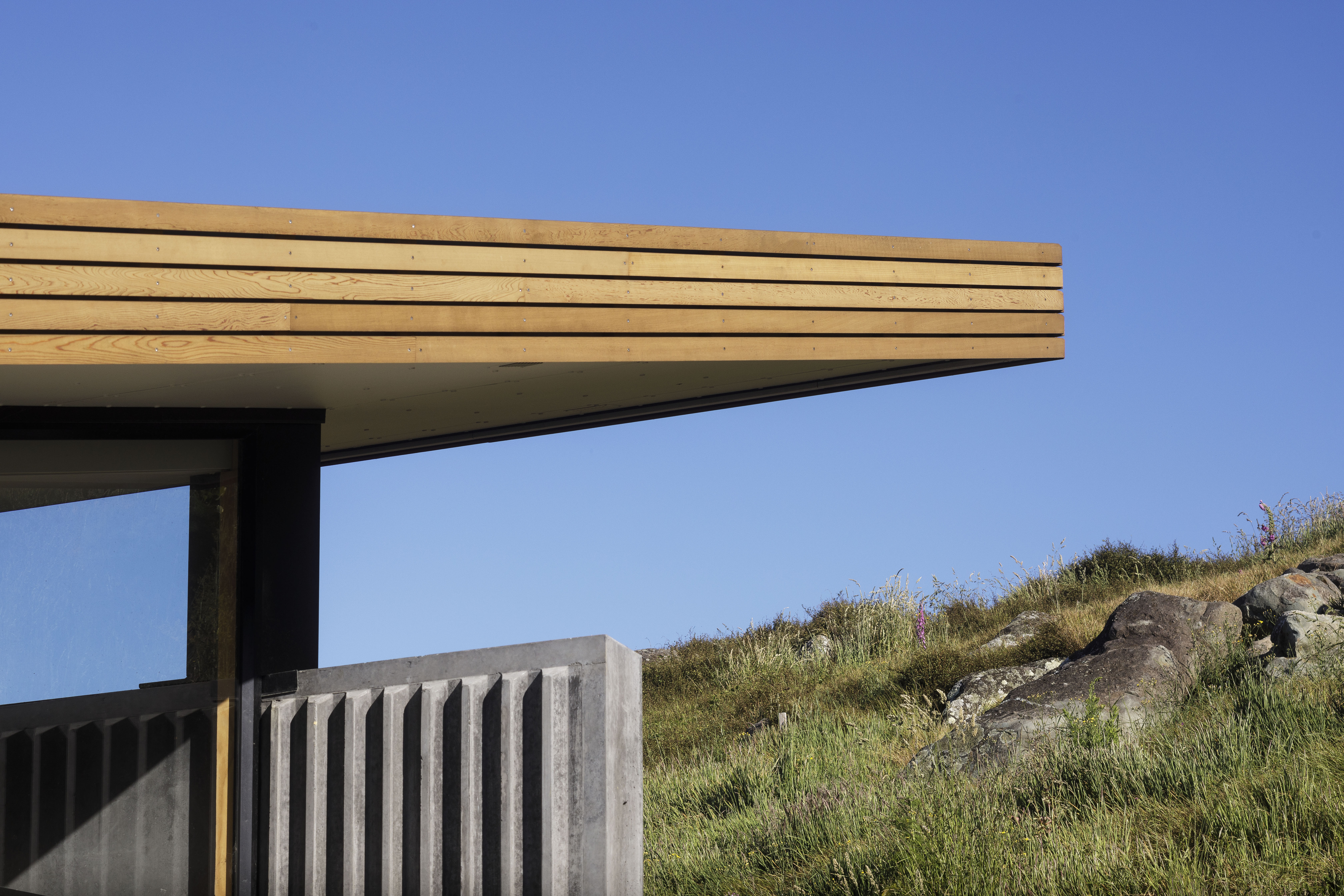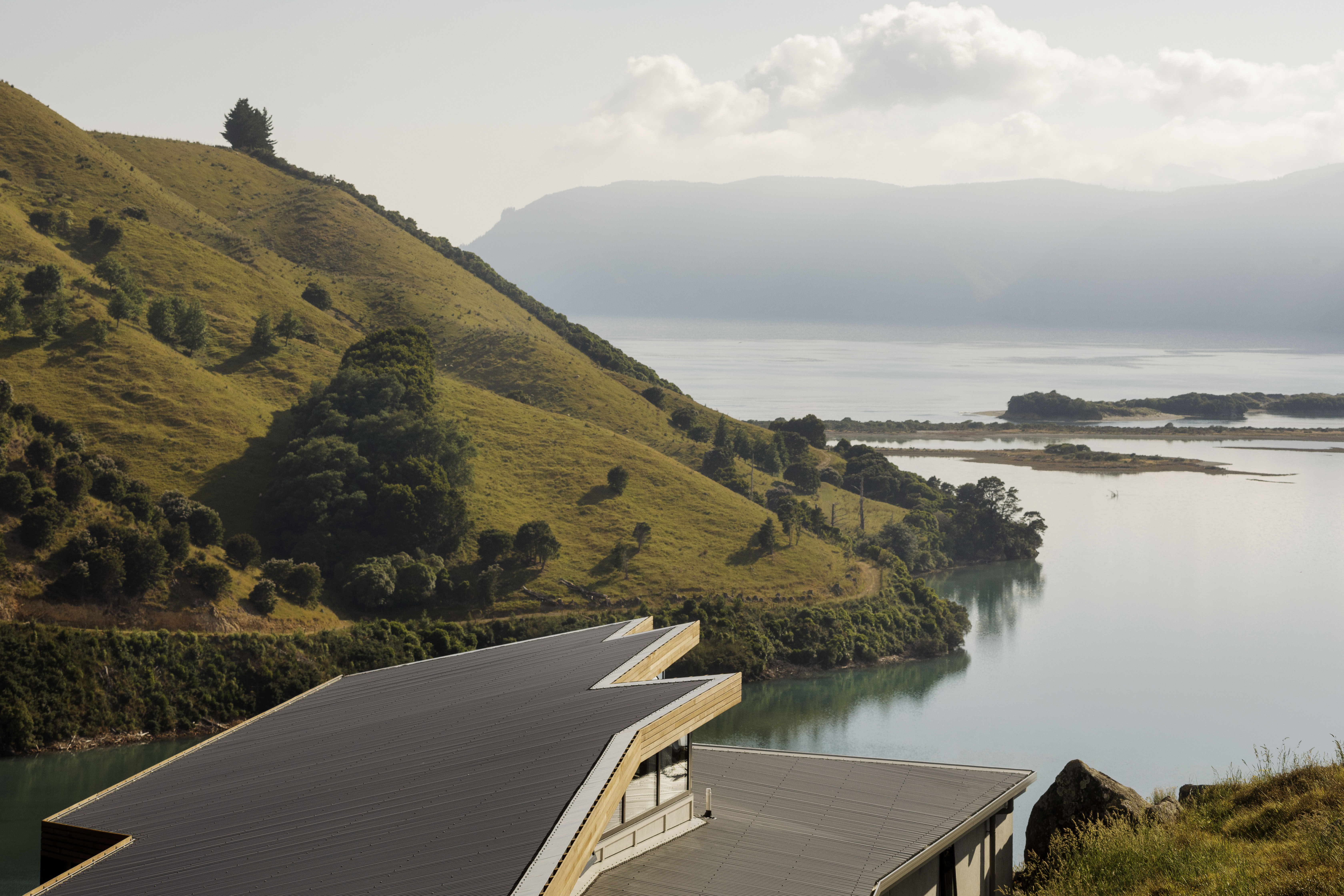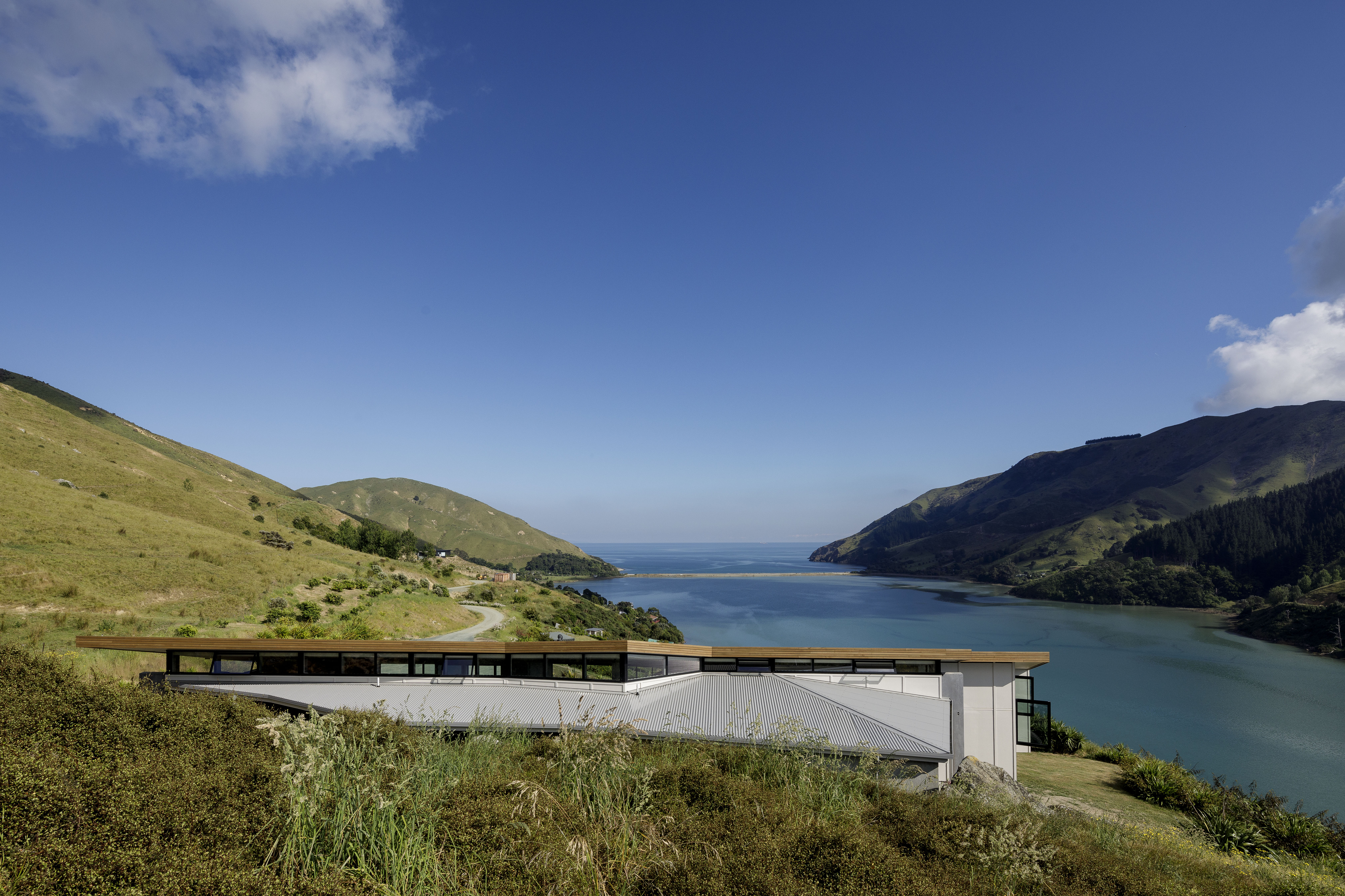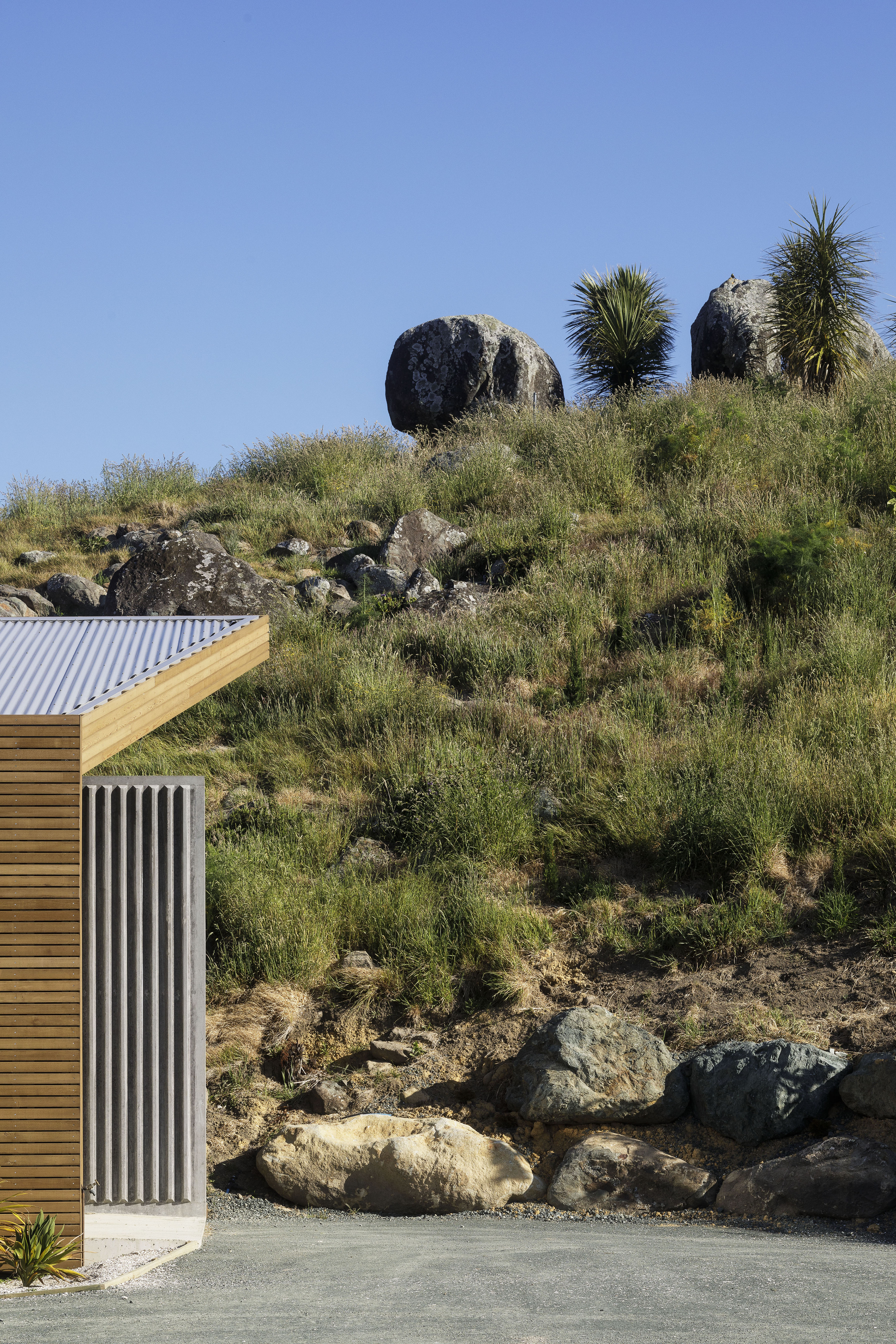 A precast concrete spine embeds this farmhouse into huge boulders on a steep hillside site above Cable Bay. The long, skinny form echoes the contours of the land, carefully framing a long, telescopic view over Delaware Bay Estuary and a framed panorama over Cable Bay Beach. A central opening in the cranked form has made a welcoming veranda entry for this compact, original and creative new home.