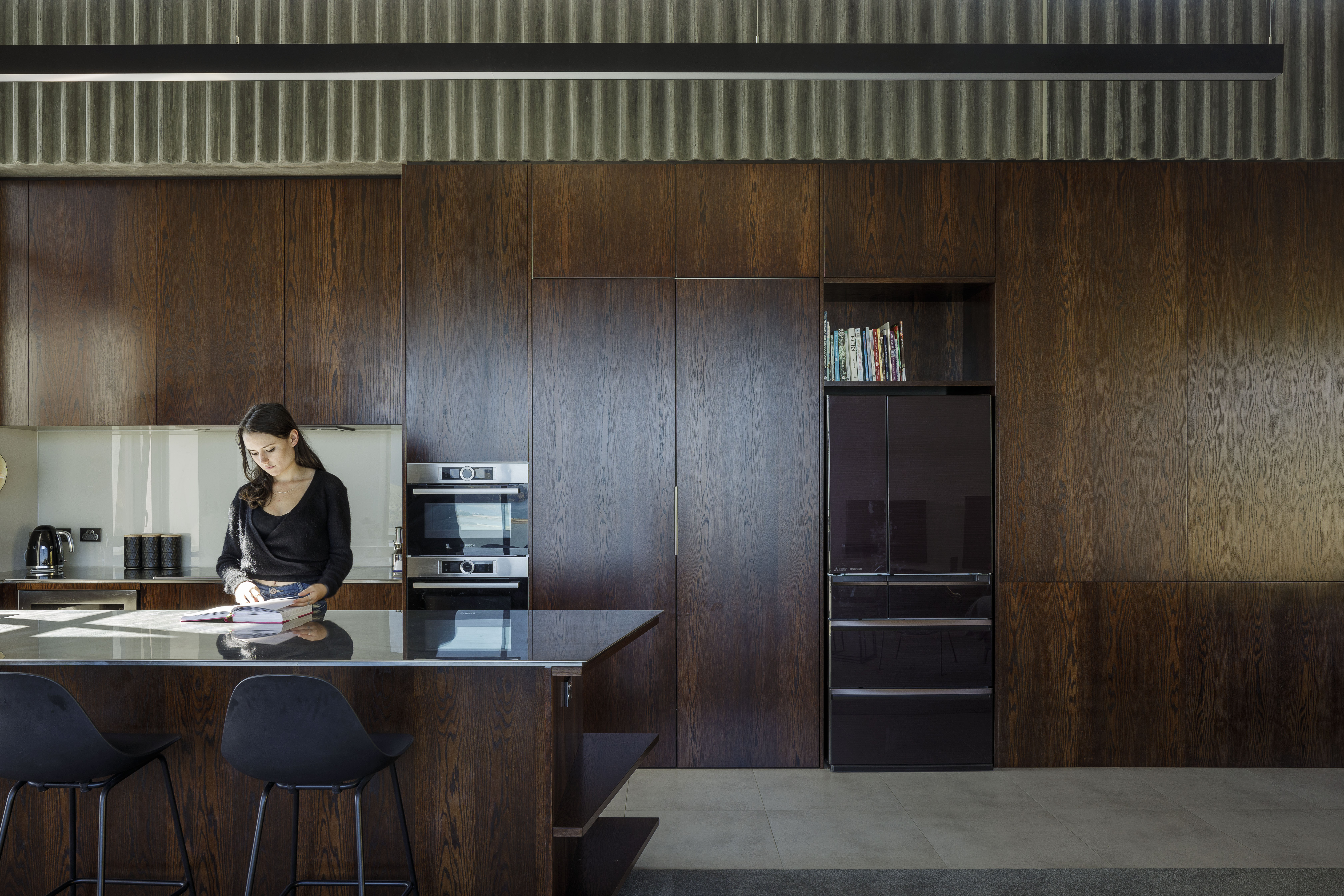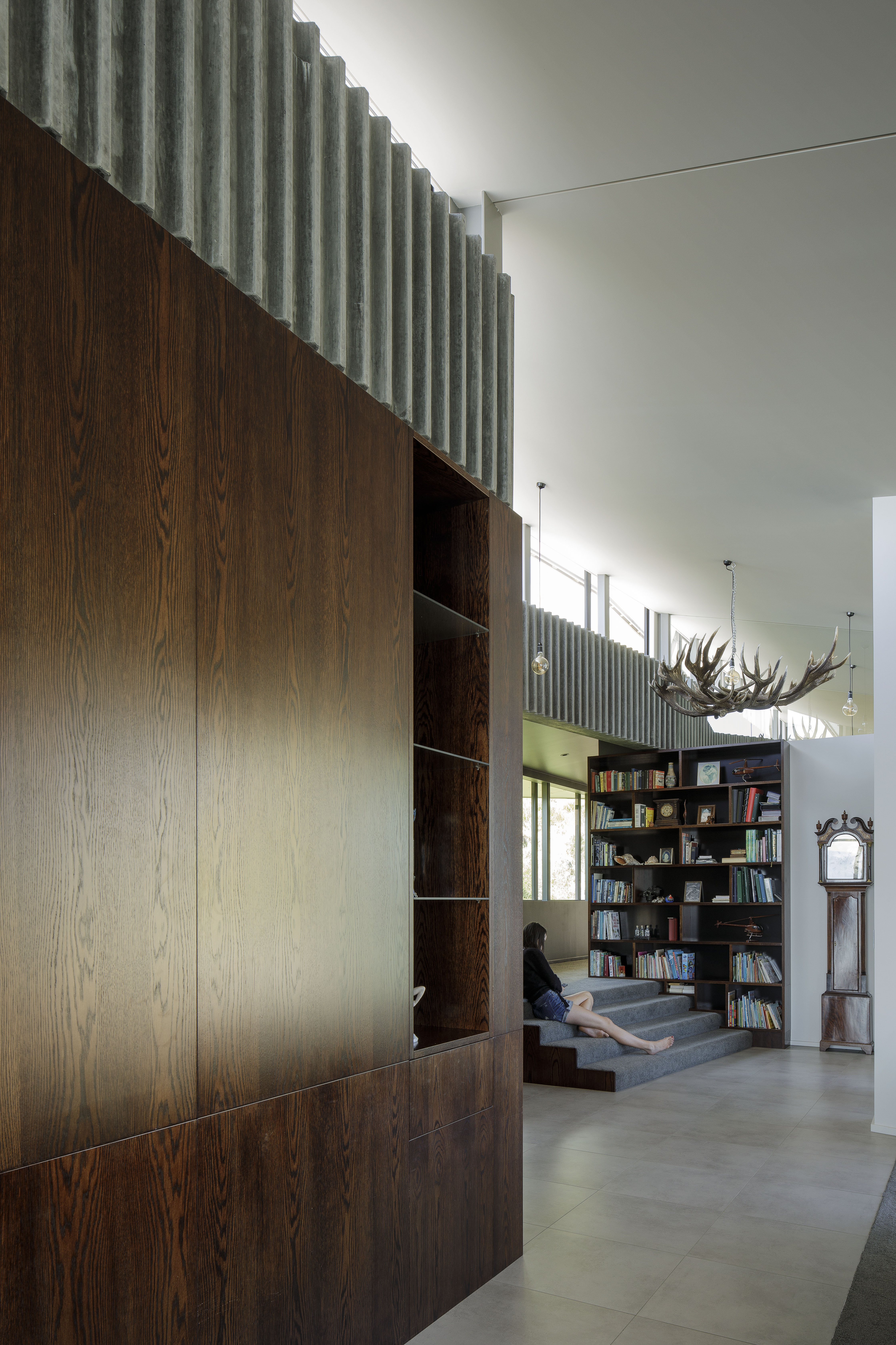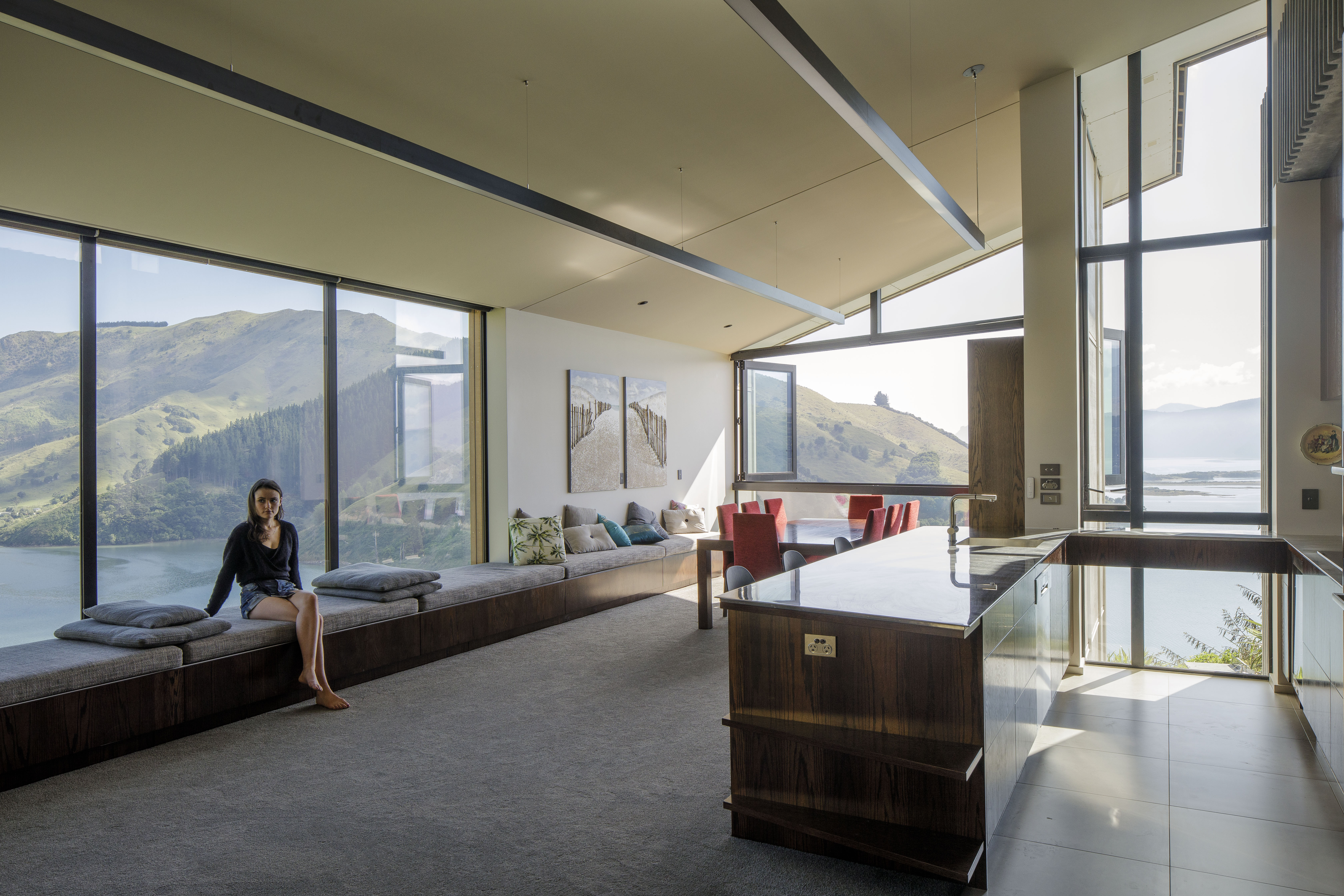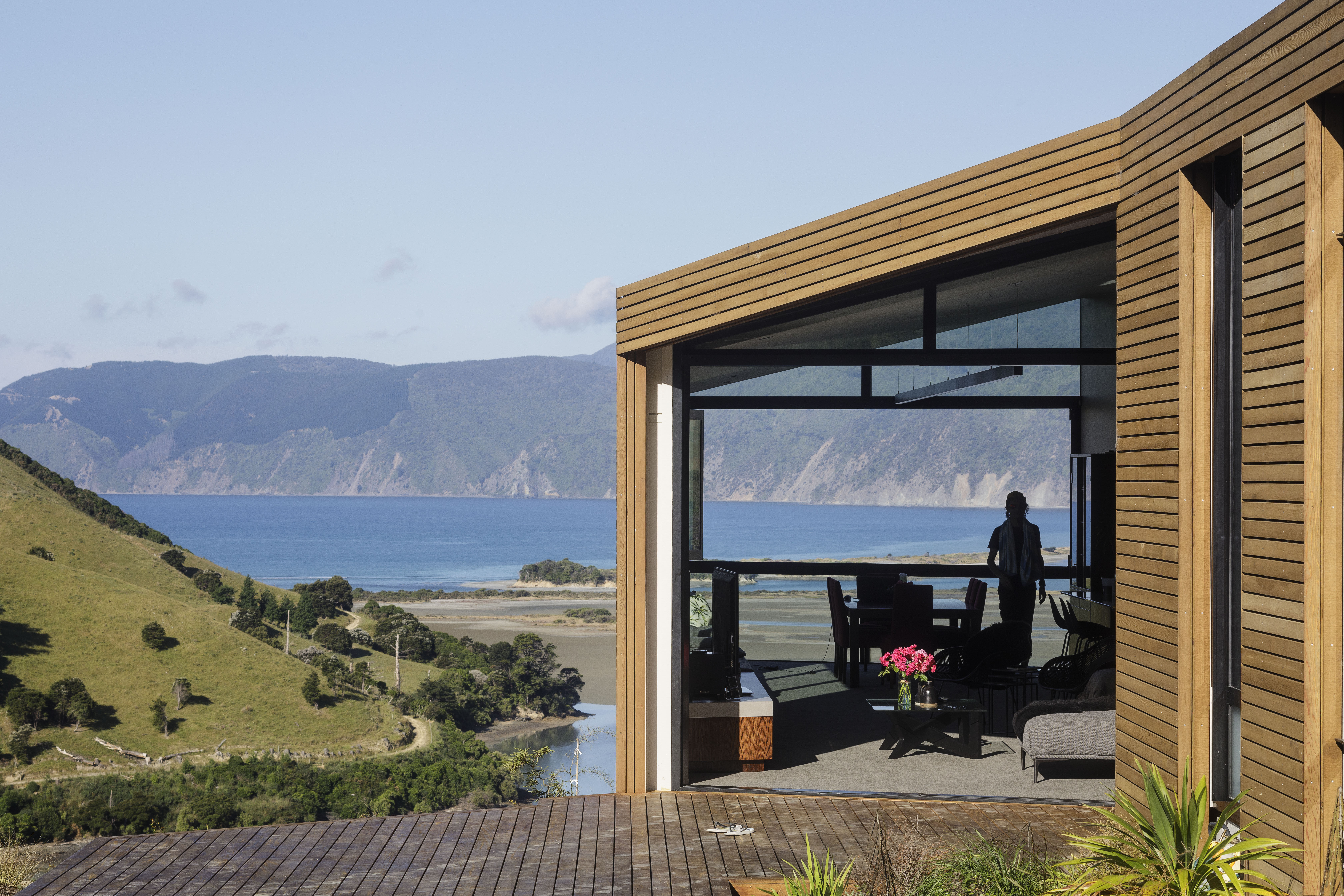 A precast concrete spine embeds this farmhouse into huge boulders on a steep hillside site above Cable Bay. The long, skinny form echoes the contours of the land, carefully framing a long, telescopic view over Delaware Bay Estuary and a framed panorama over Cable Bay Beach. A central opening in the cranked form has made a welcoming veranda entry for this compact, original and creative new home.