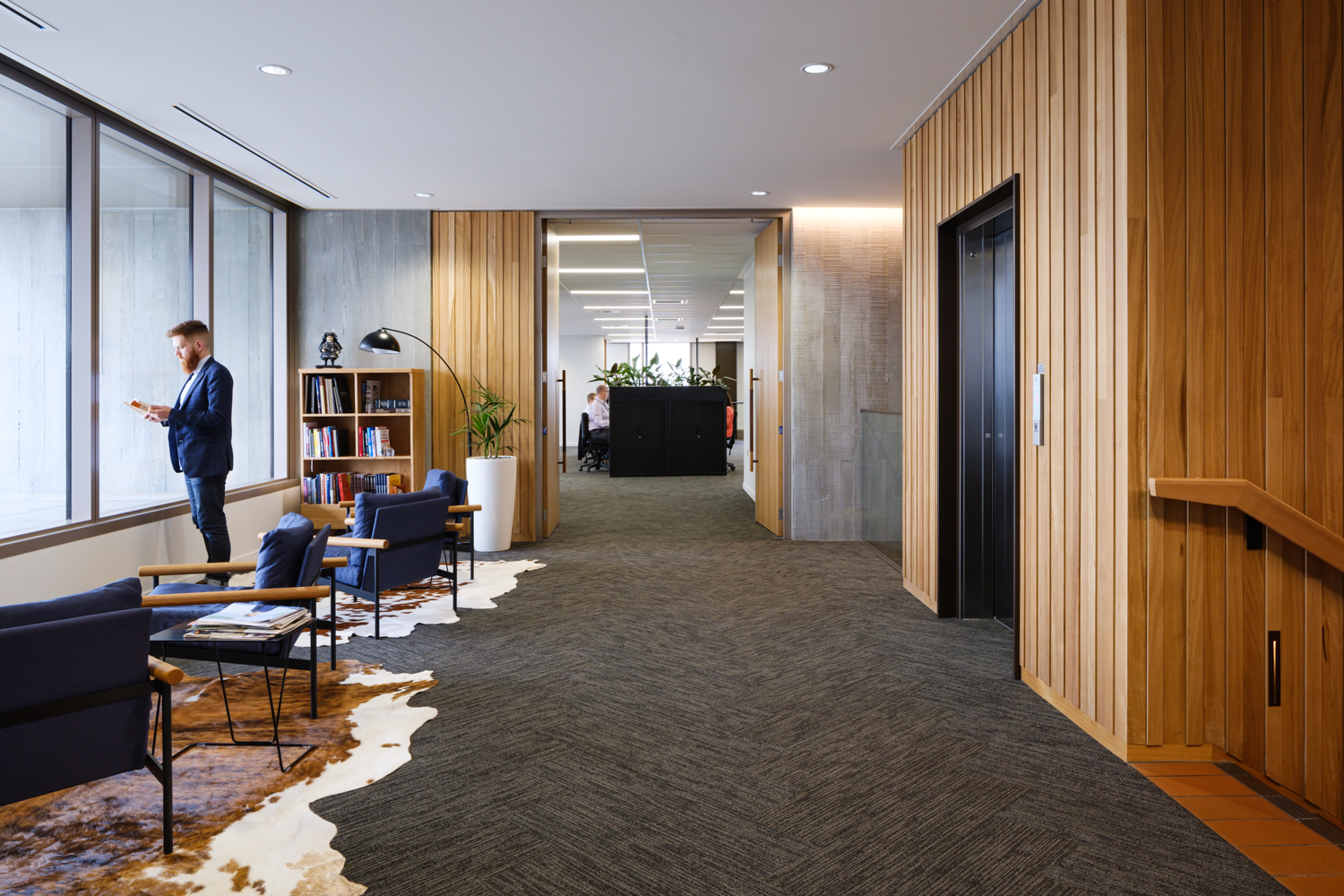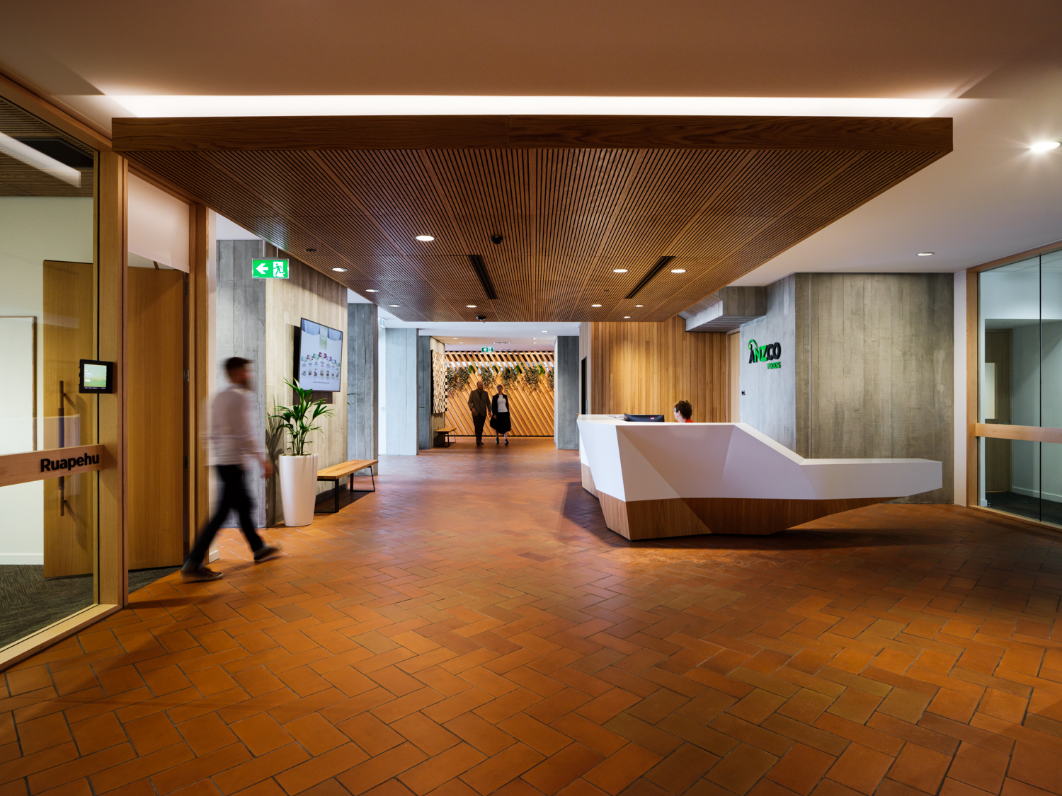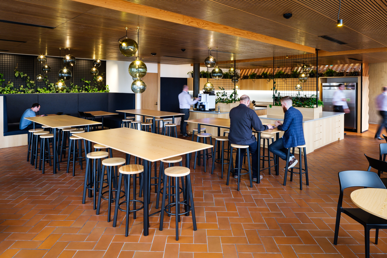 In this enviable workplace a sophisticated interior alludes to the client’s industry in a tasteful and unpretentious manner. An agricultural narrative has been translated through rich, earthy tones of exposed concrete, New Zealand Blackbutt timber and earthen tiles. Industry references are used subtly throughout, none more impressively so than a screen wall made of 300-year-old timber sourced from the butcher’s floor in London’s famous Smithfield Market. A successful collaboration between the interior and base build architects has enabled the seamless incorporation of client-requested modifications while maintaining the architectural integrity of the broader concept.