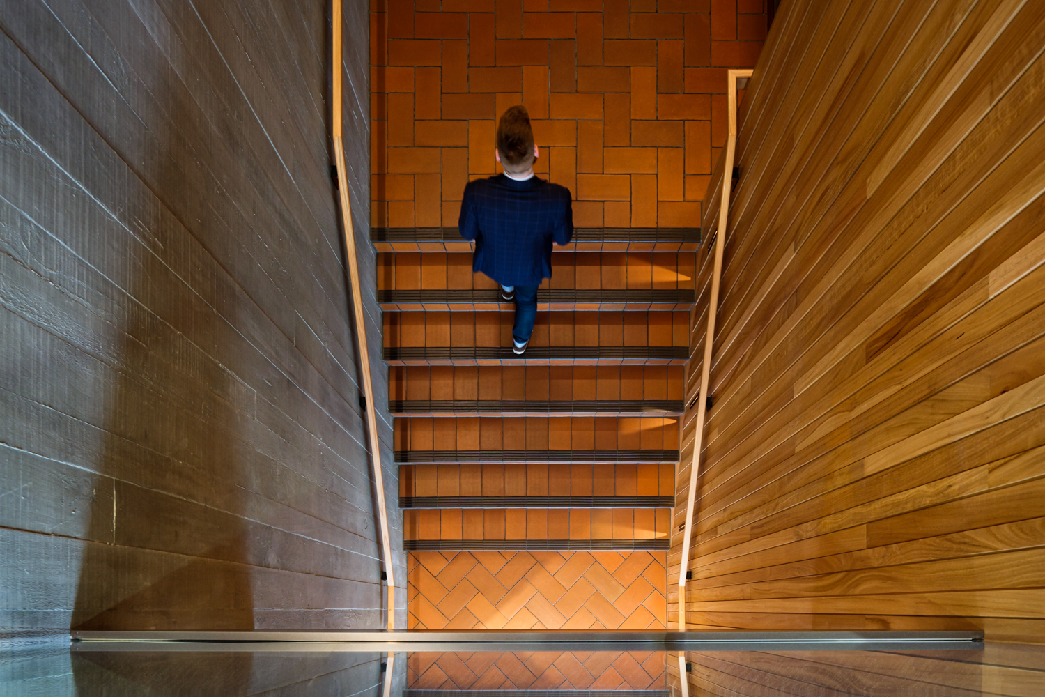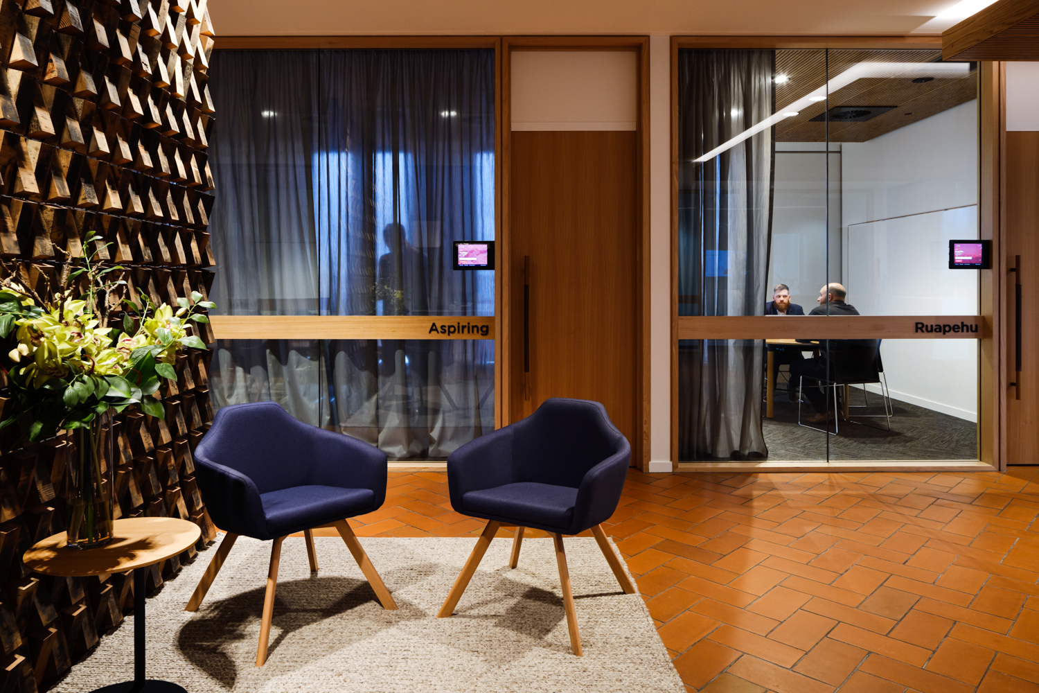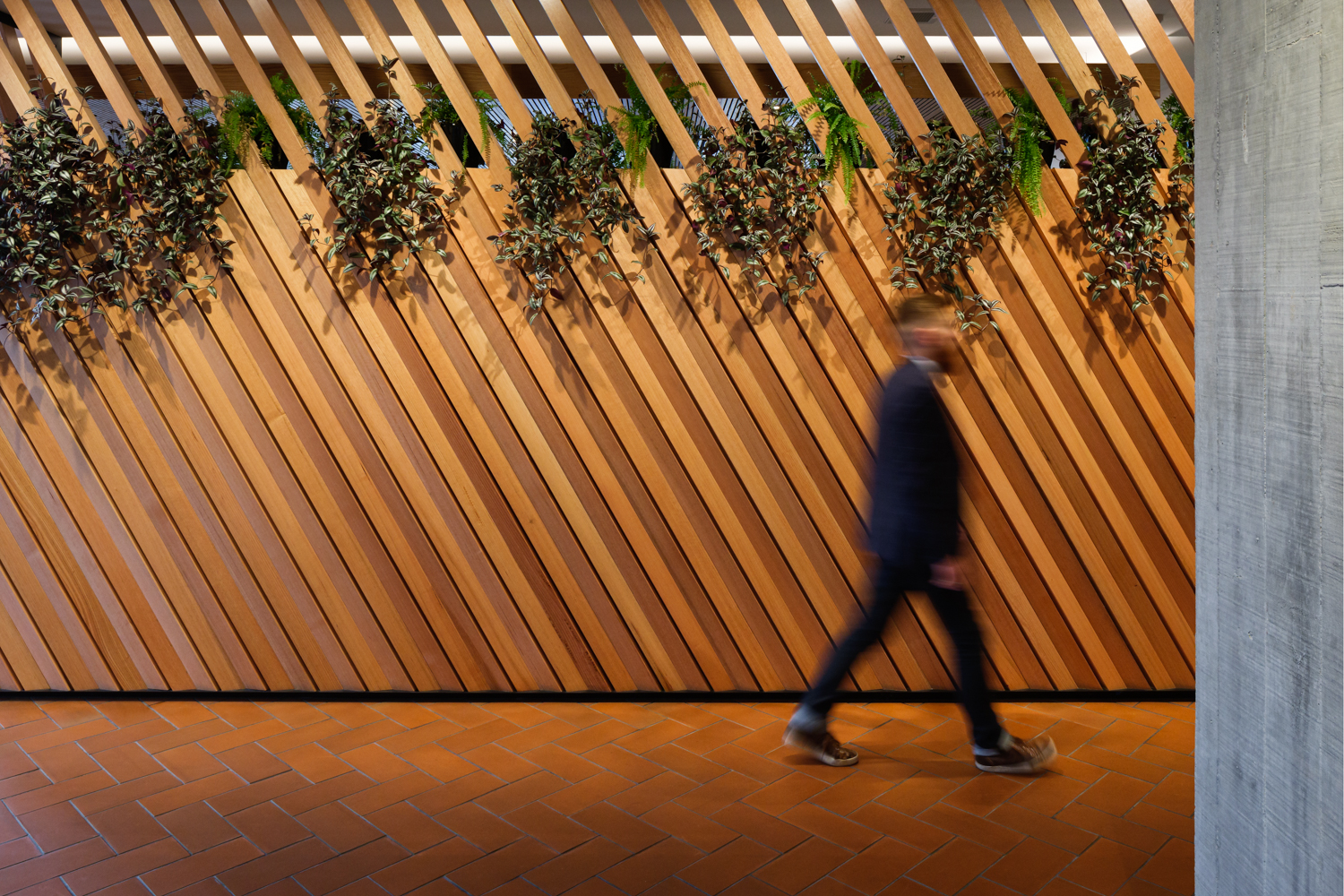 In this enviable workplace a sophisticated interior alludes to the client’s industry in a tasteful and unpretentious manner. An agricultural narrative has been translated through rich, earthy tones of exposed concrete, New Zealand Blackbutt timber and earthen tiles. Industry references are used subtly throughout, none more impressively so than a screen wall made of 300-year-old timber sourced from the butcher’s floor in London’s famous Smithfield Market. A successful collaboration between the interior and base build architects has enabled the seamless incorporation of client-requested modifications while maintaining the architectural integrity of the broader concept.