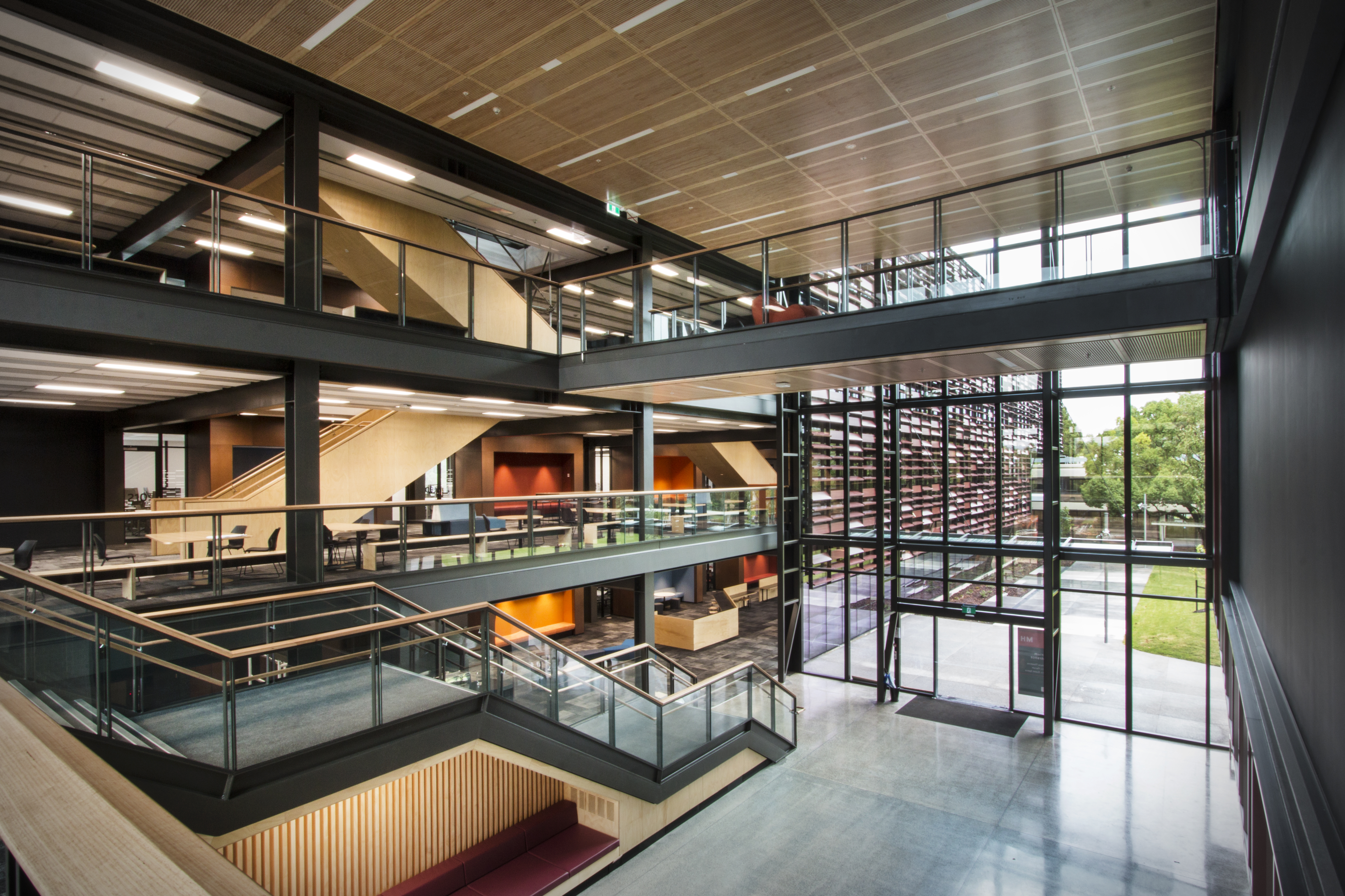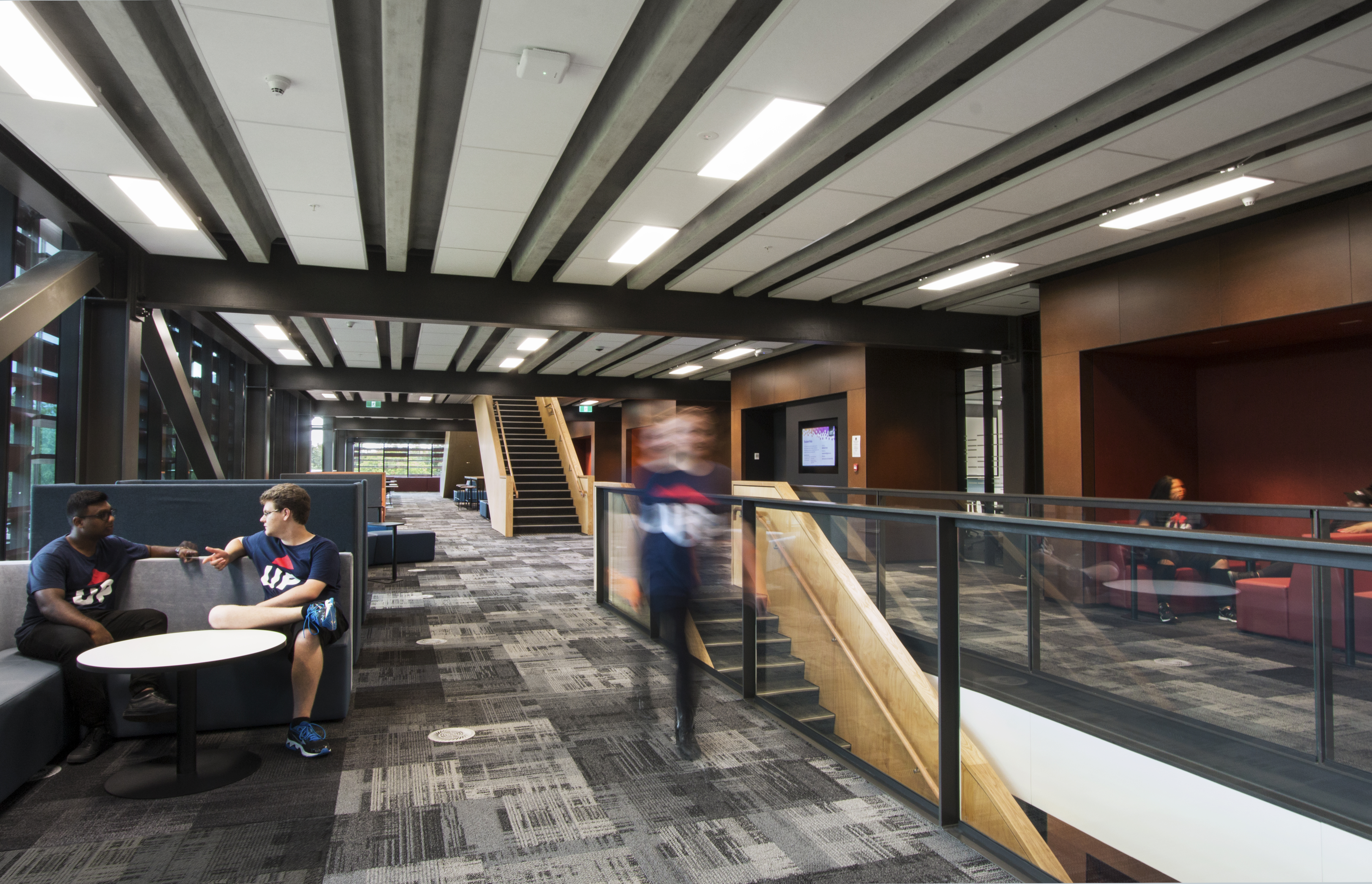 The institutional approach to education is avoided through the provision of generous “living room” spaces at various scales along the circulation routes. Student break-out areas are privileged over structured teaching spaces, gaining optimum daylight, views, sun and orientation. Materials are hardy yet homely in this building that seems to embrace spontaneity rather than suppress or control it.