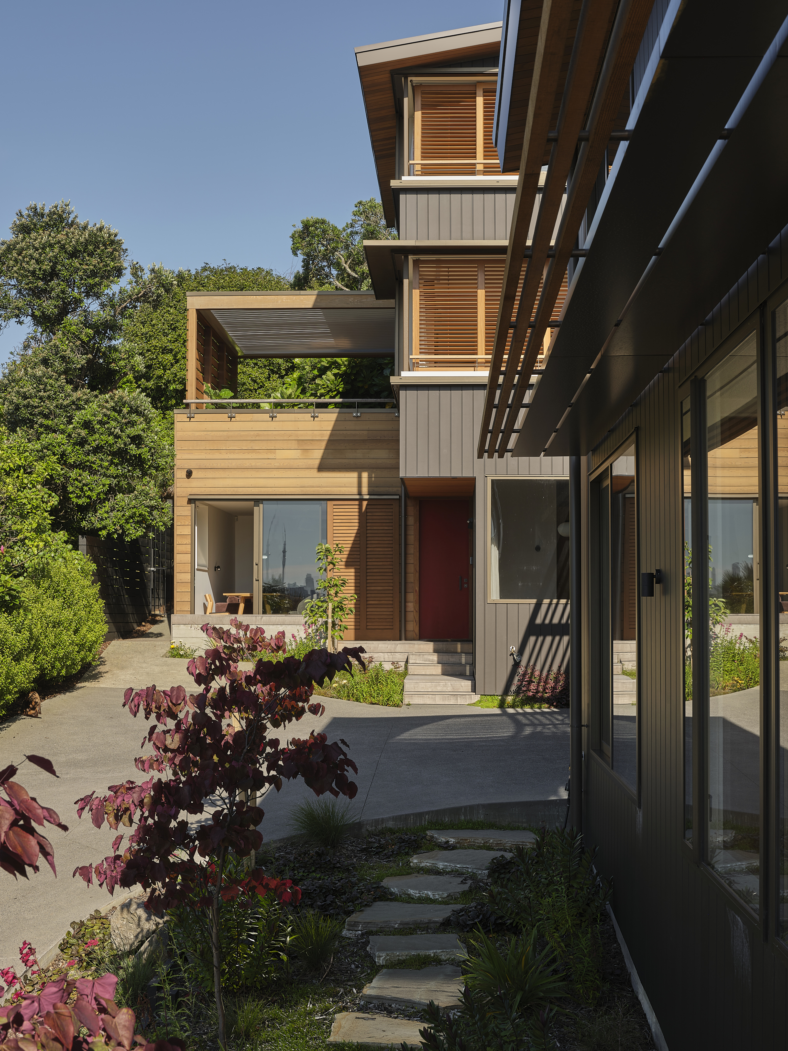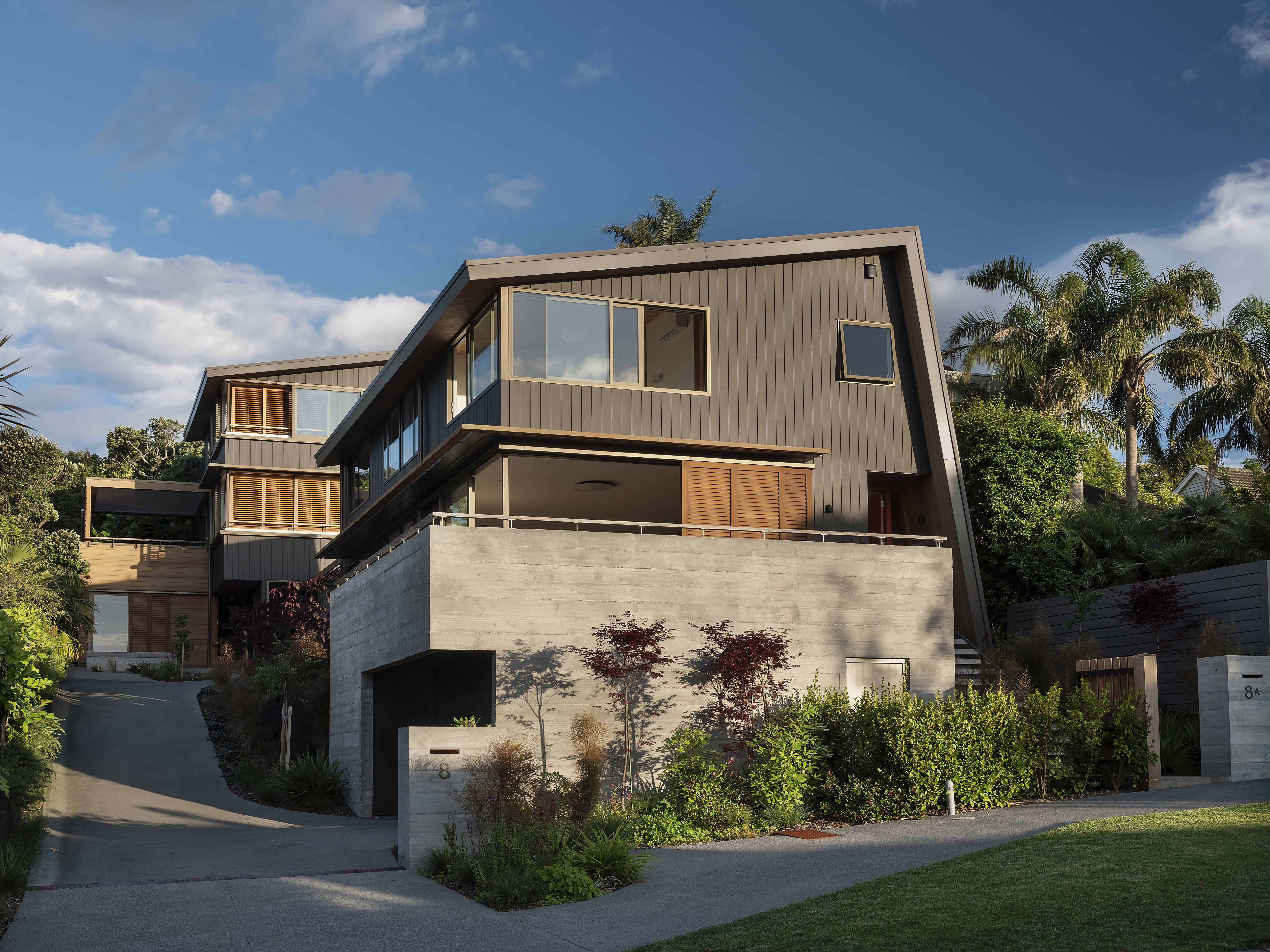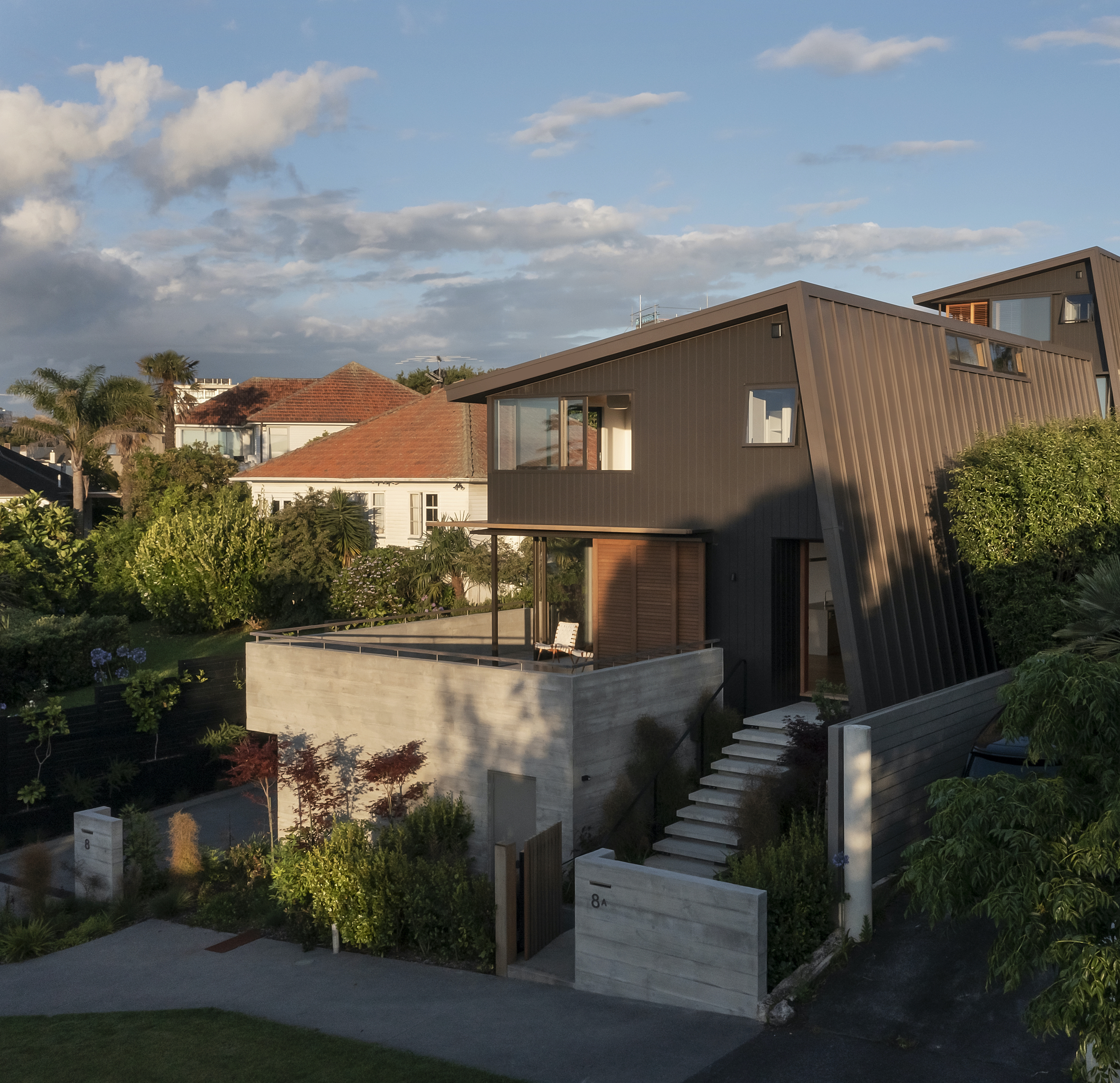 This elegant example of multi-generational living sets a new benchmark for the low-rise intensification of inner-suburban Auckland. Careful distribution of floor levels and windows provides access to superb views from numerous locations across the sophisticated development that carefully navigates a sloping site. The folded wall-to-roof element links the separate dwellings and transitions to an exceptional internal element. This project is a rare example of thoughtful, well-built in-fill housing that inspires and contributes to the debate around how density doesn’t necessarily preclude quality.