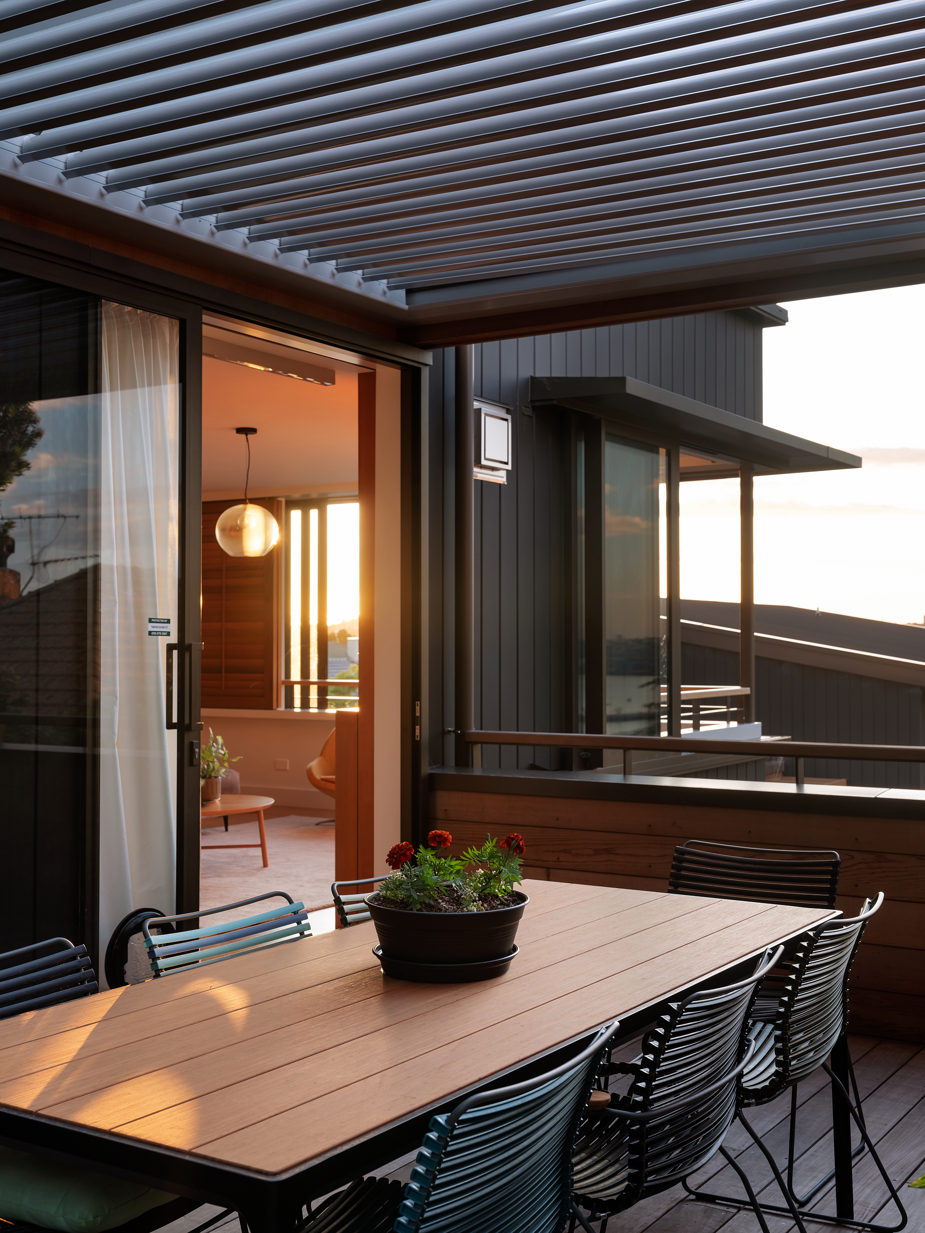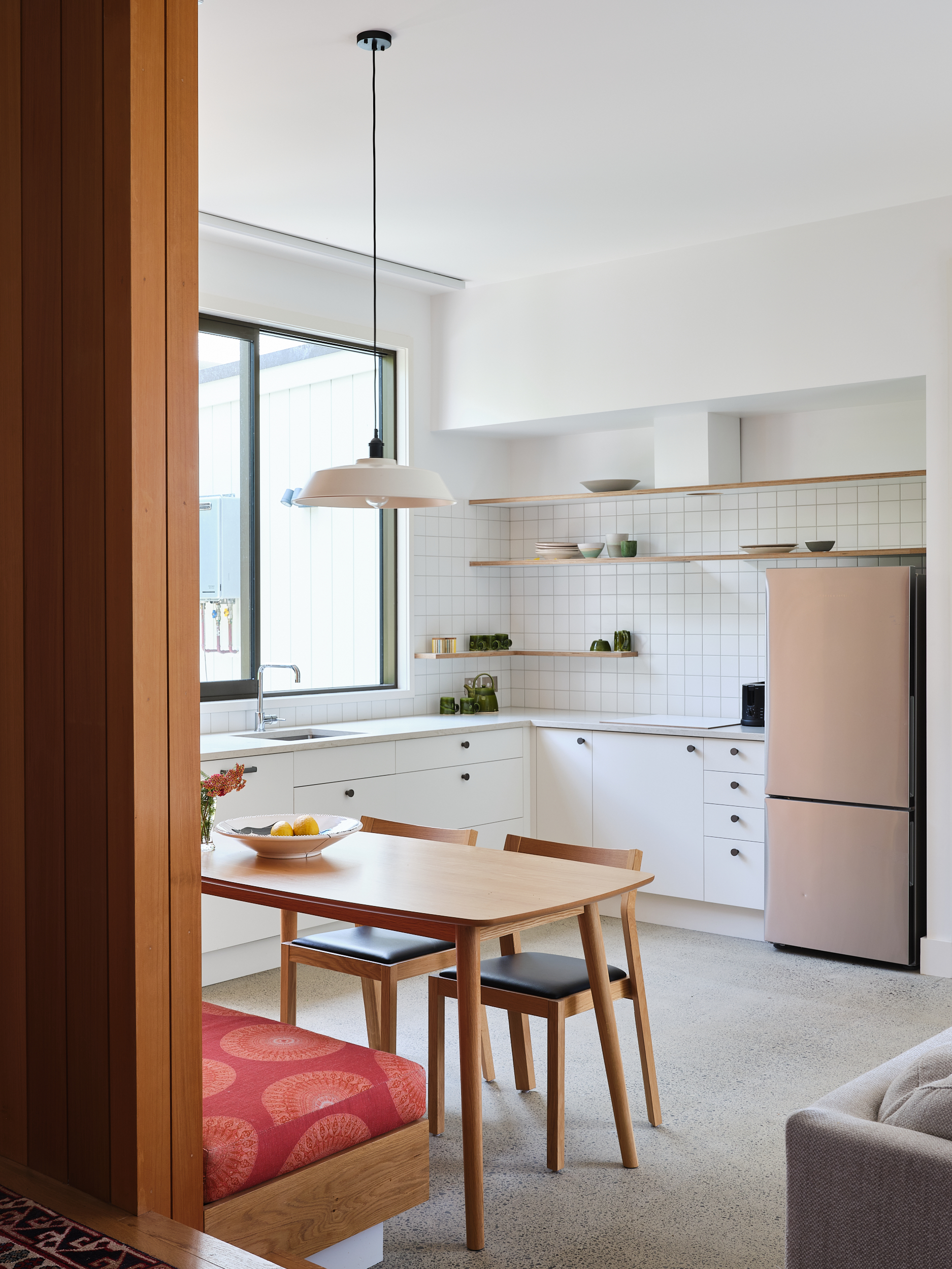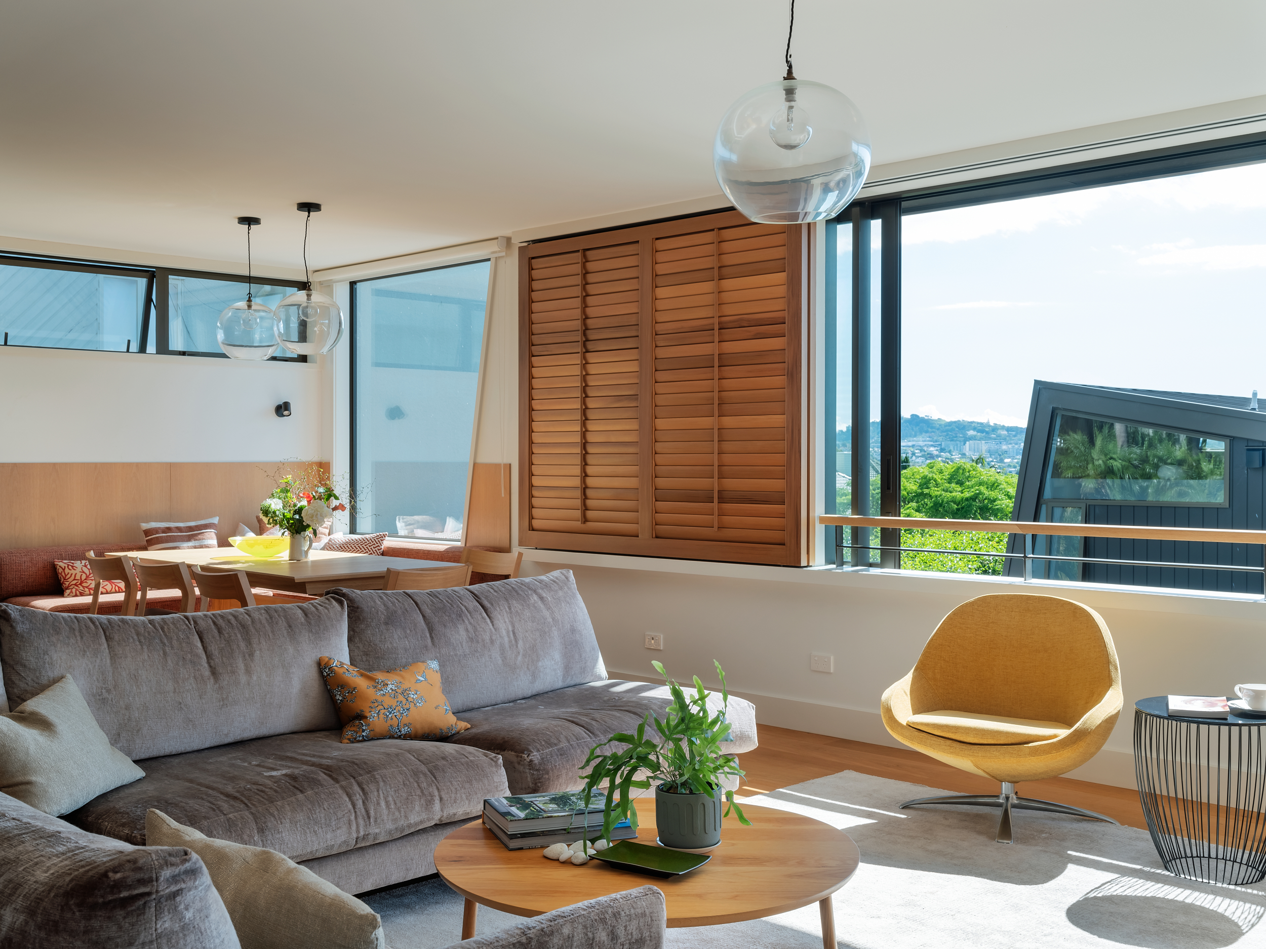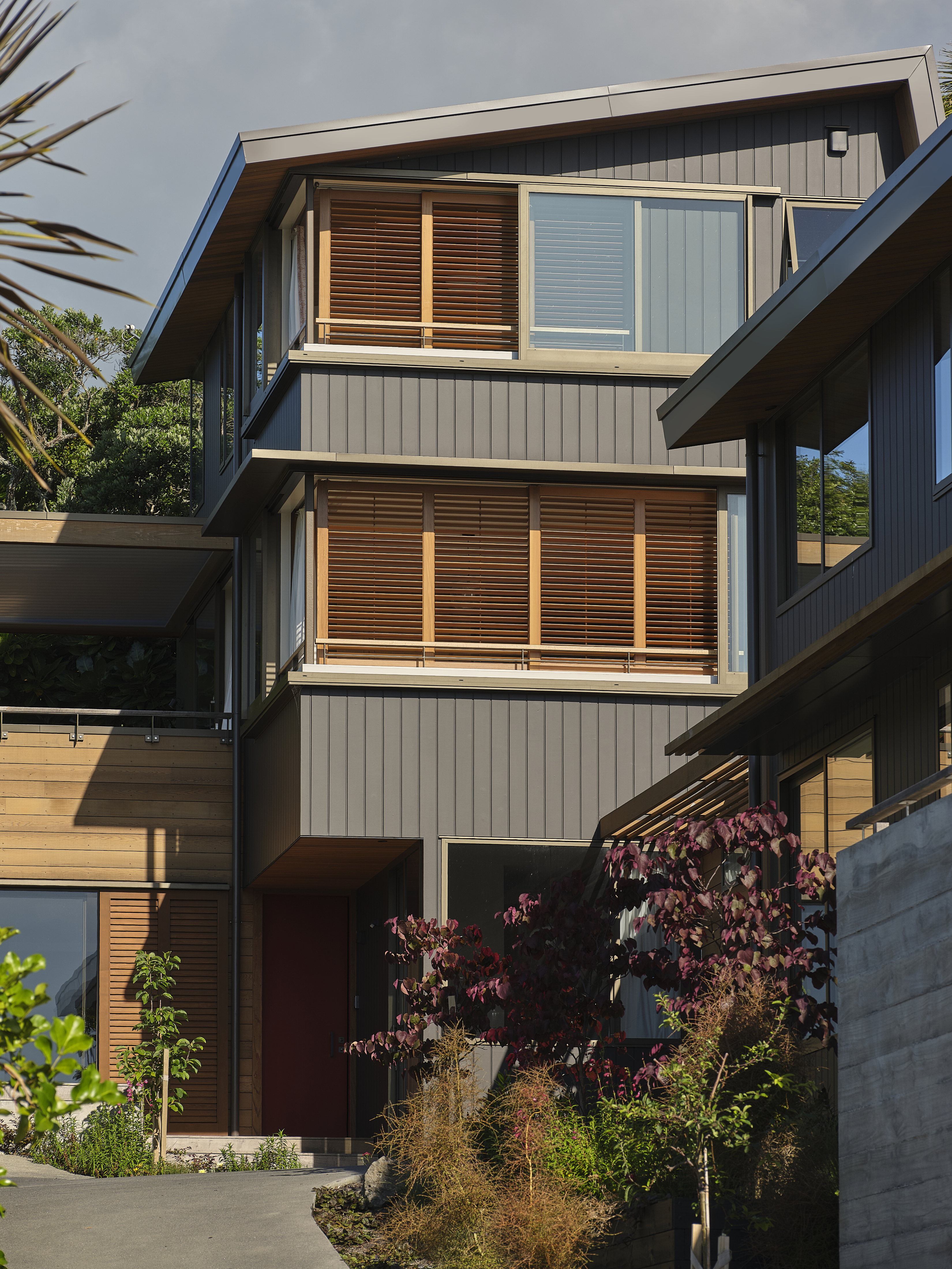 This elegant example of multi-generational living sets a new benchmark for the low-rise intensification of inner-suburban Auckland. Careful distribution of floor levels and windows provides access to superb views from numerous locations across the sophisticated development that carefully navigates a sloping site. The folded wall-to-roof element links the separate dwellings and transitions to an exceptional internal element. This project is a rare example of thoughtful, well-built in-fill housing that inspires and contributes to the debate around how density doesn’t necessarily preclude quality.
