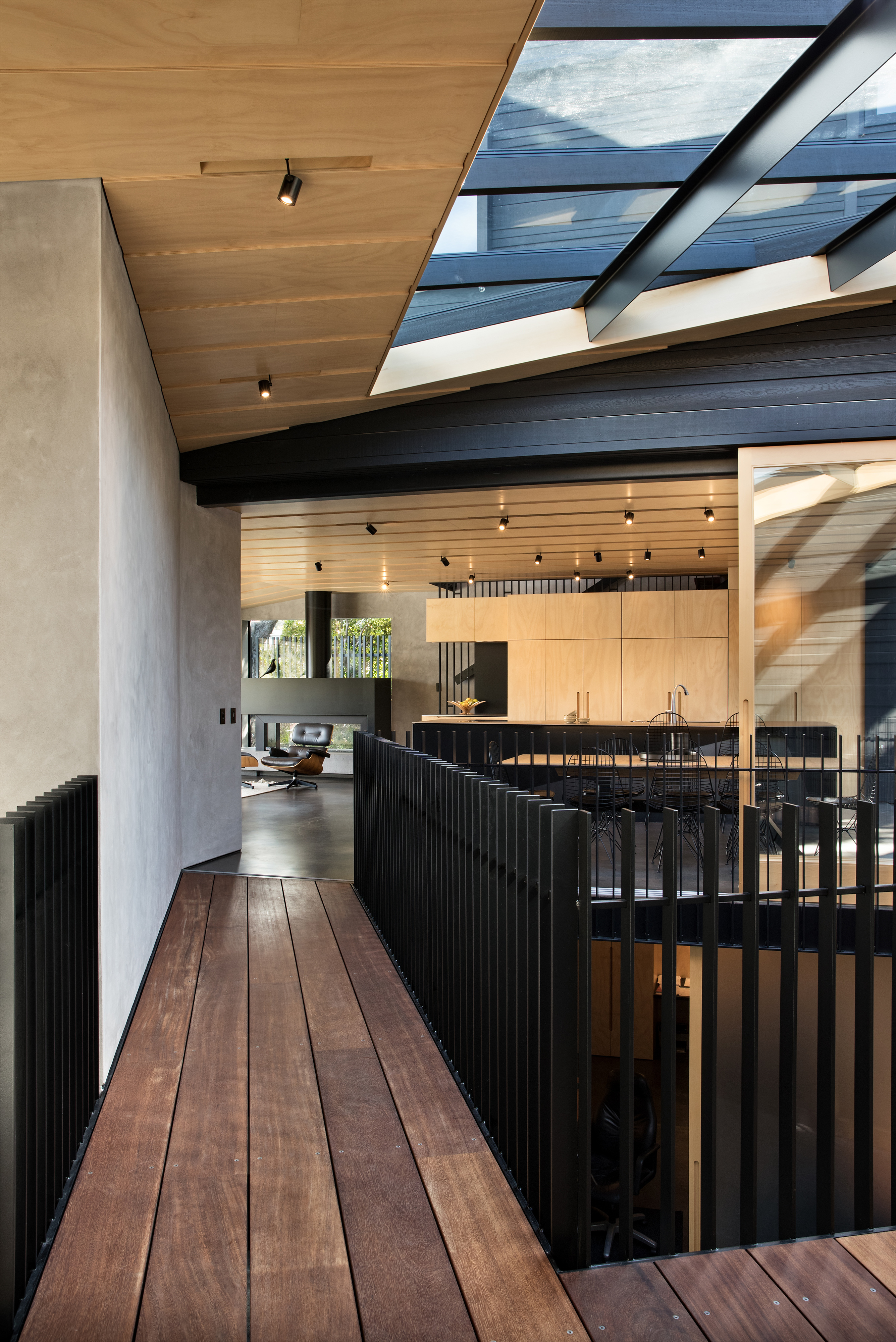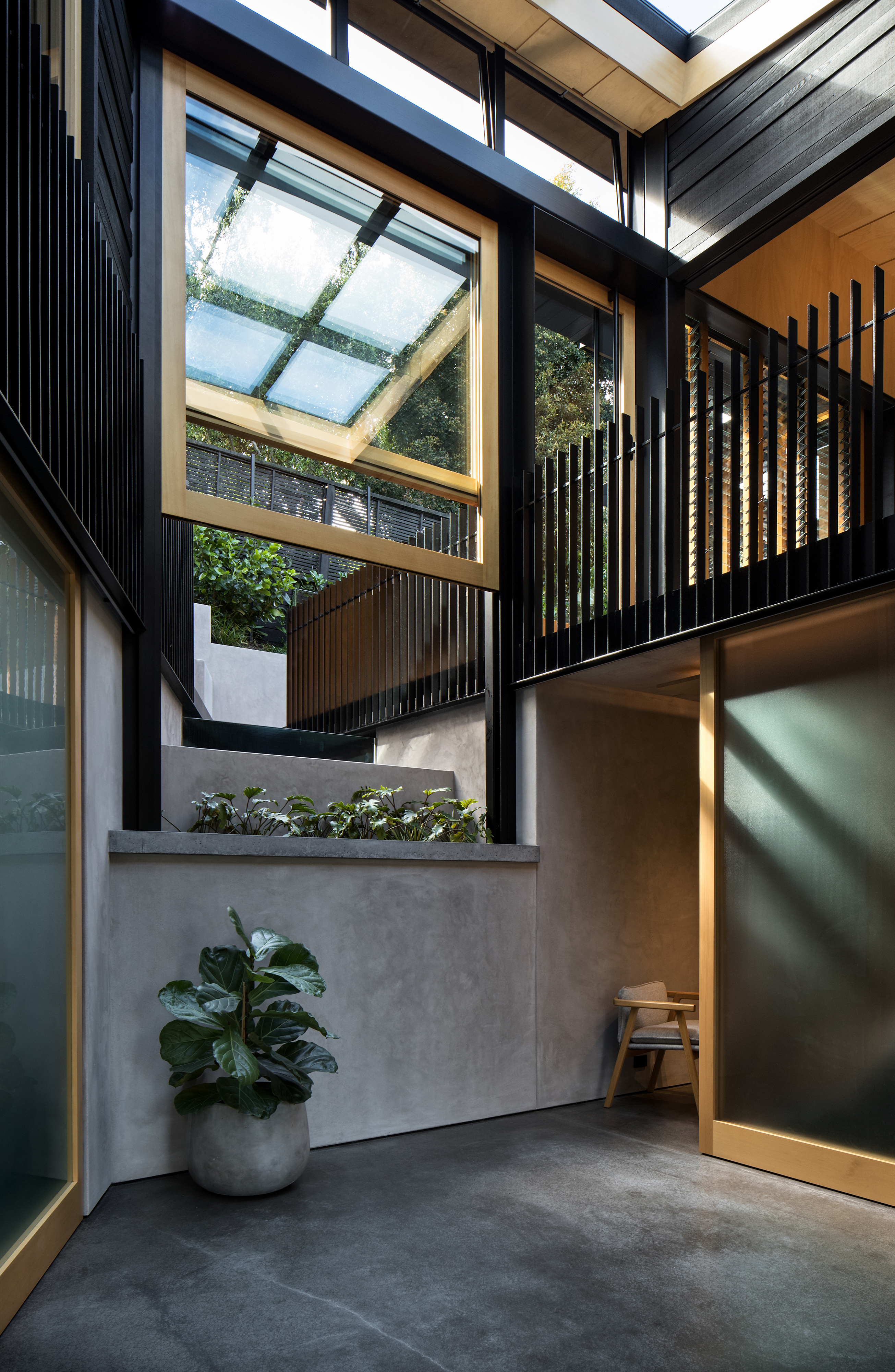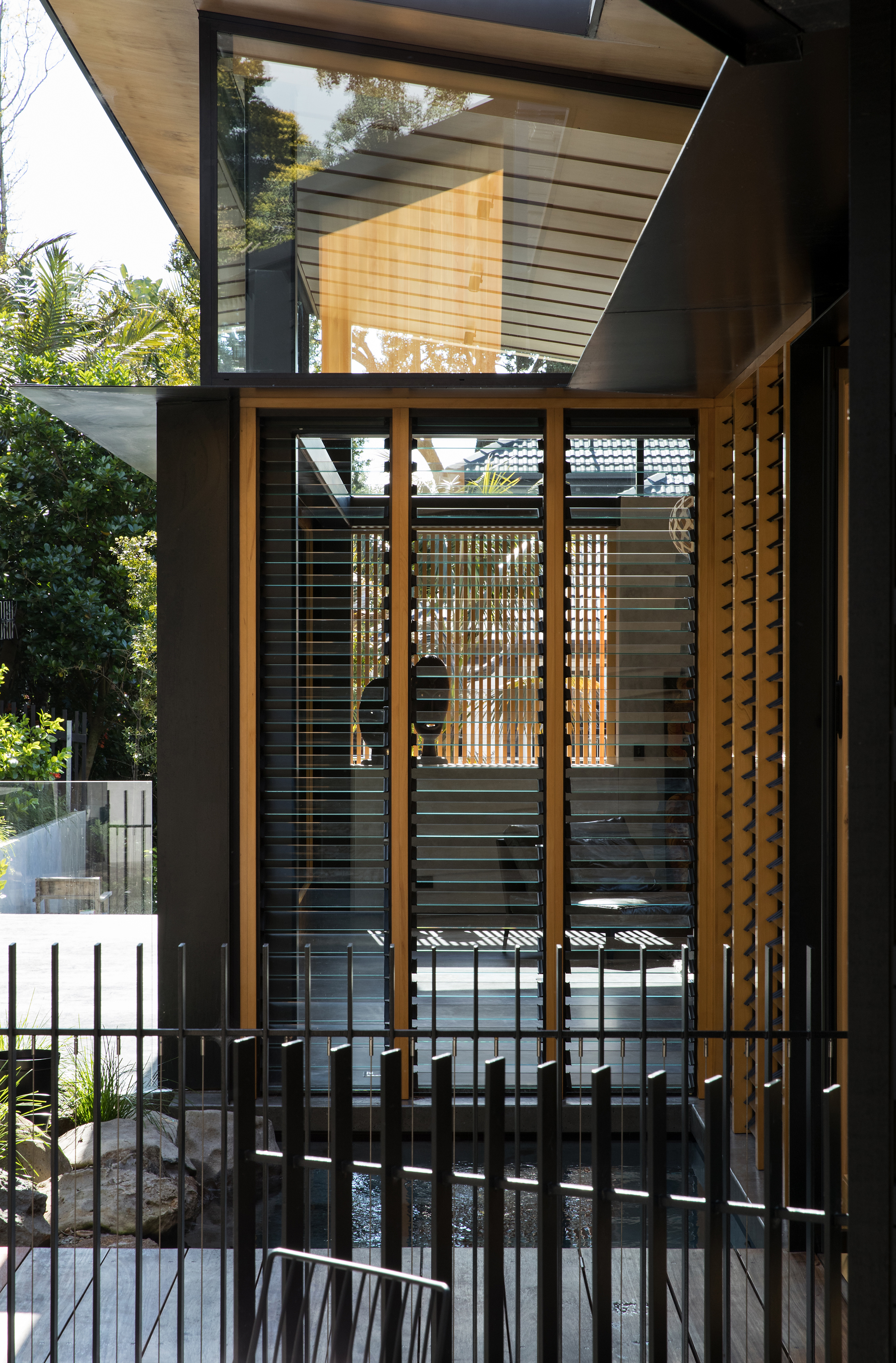 From nicely framed views – despite a steep, south-facing site – to the complex entrance atrium and circulation, this house is full of surprises. Throughout this project there has been rigorous attention to detailing a concise material palette, which is perhaps best illustrated by the adjustable screens that provide privacy, aid ventilation, and reveal views.