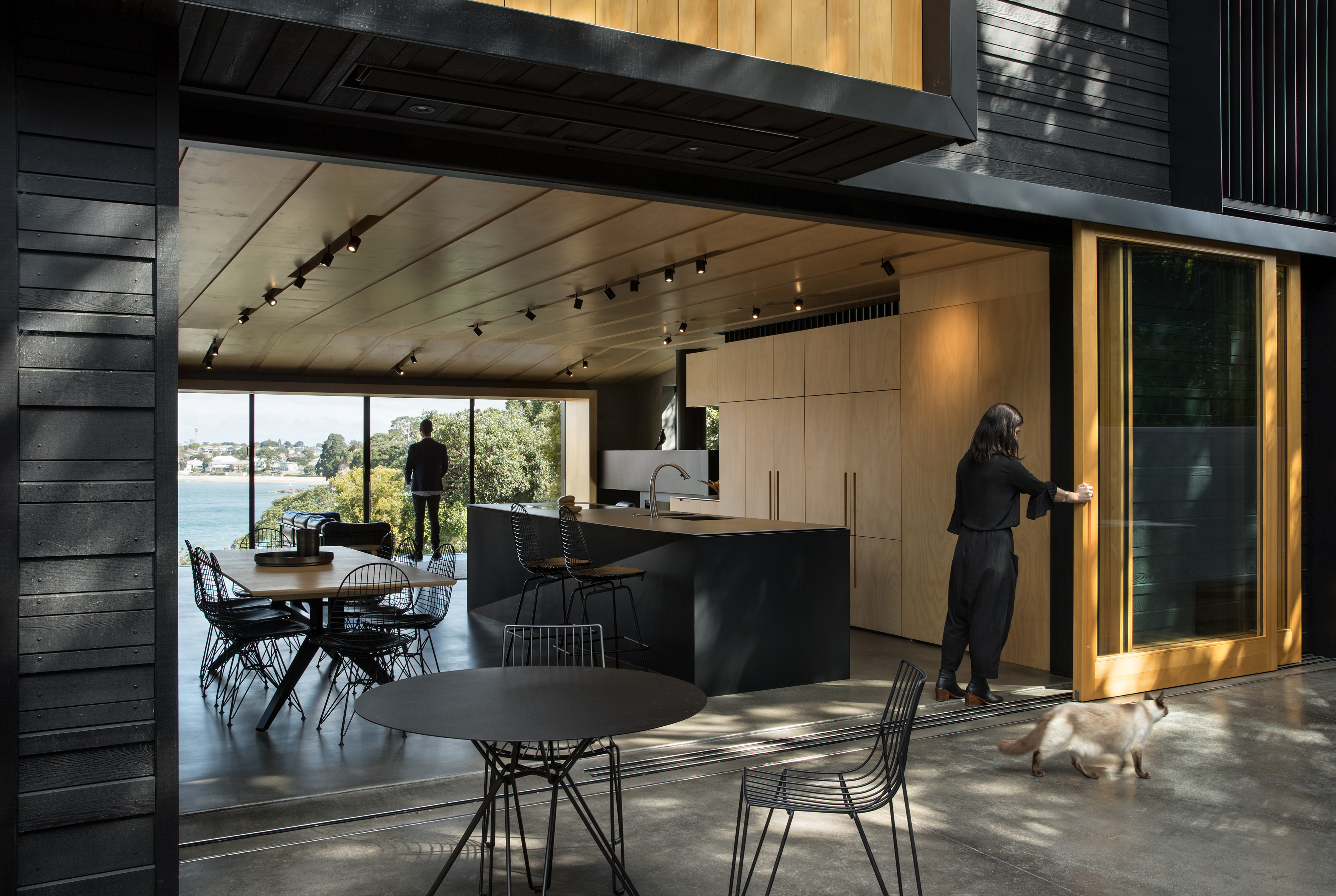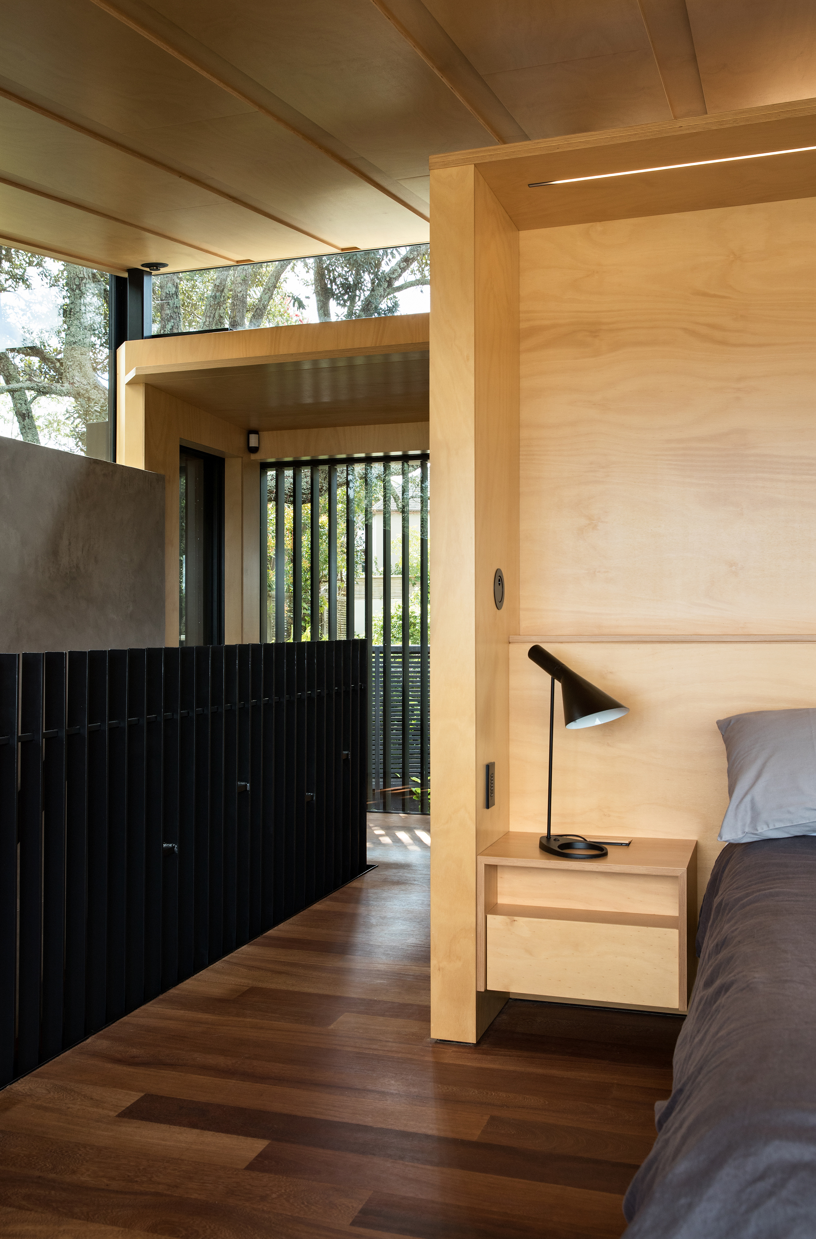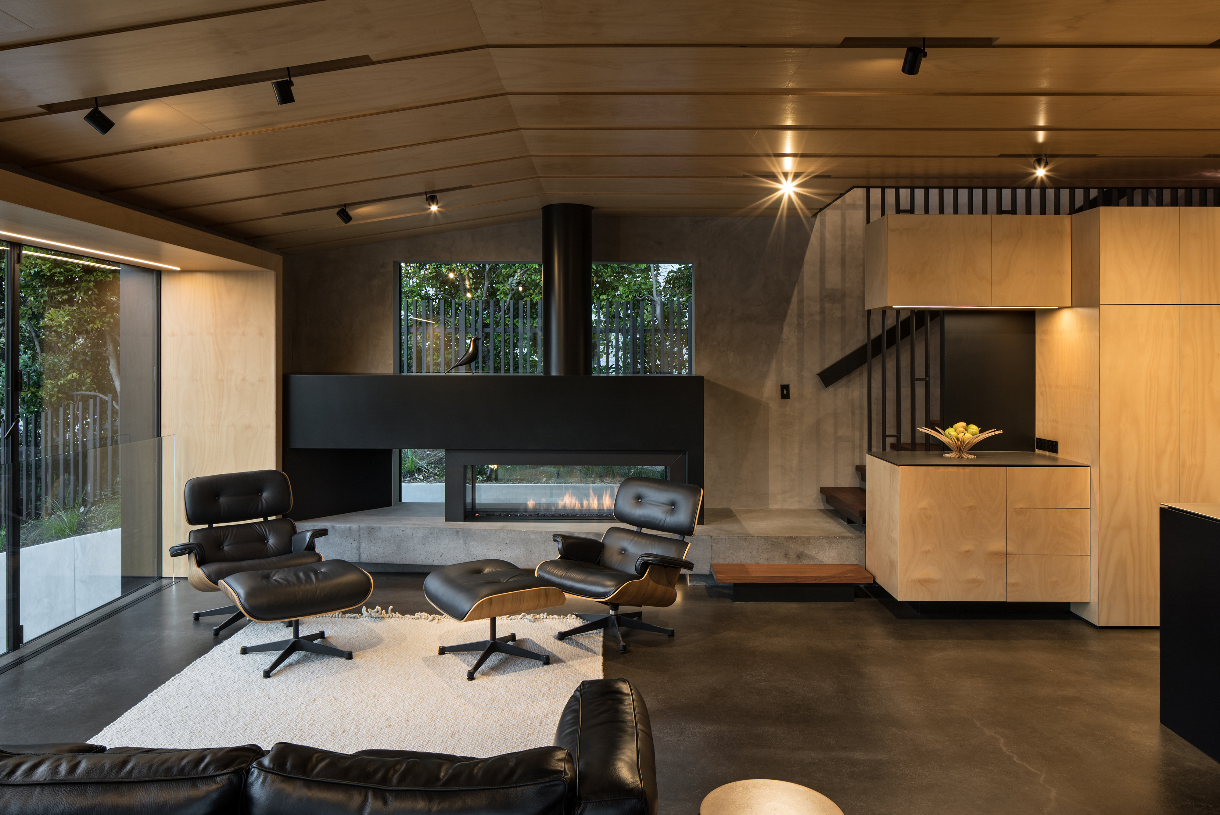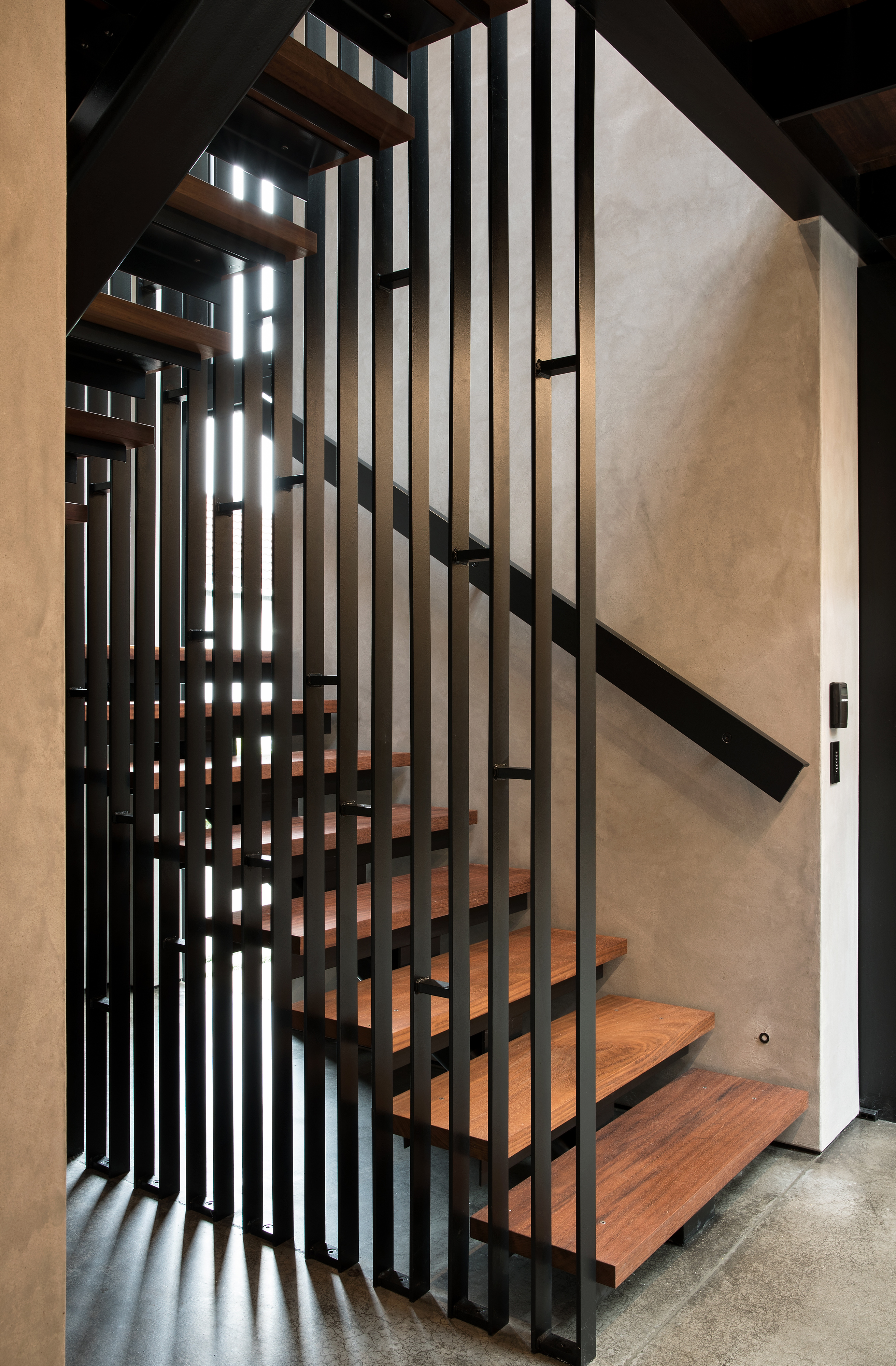 From nicely framed views – despite a steep, south-facing site – to the complex entrance atrium and circulation, this house is full of surprises. Throughout this project there has been rigorous attention to detailing a concise material palette, which is perhaps best illustrated by the adjustable screens that provide privacy, aid ventilation, and reveal views.