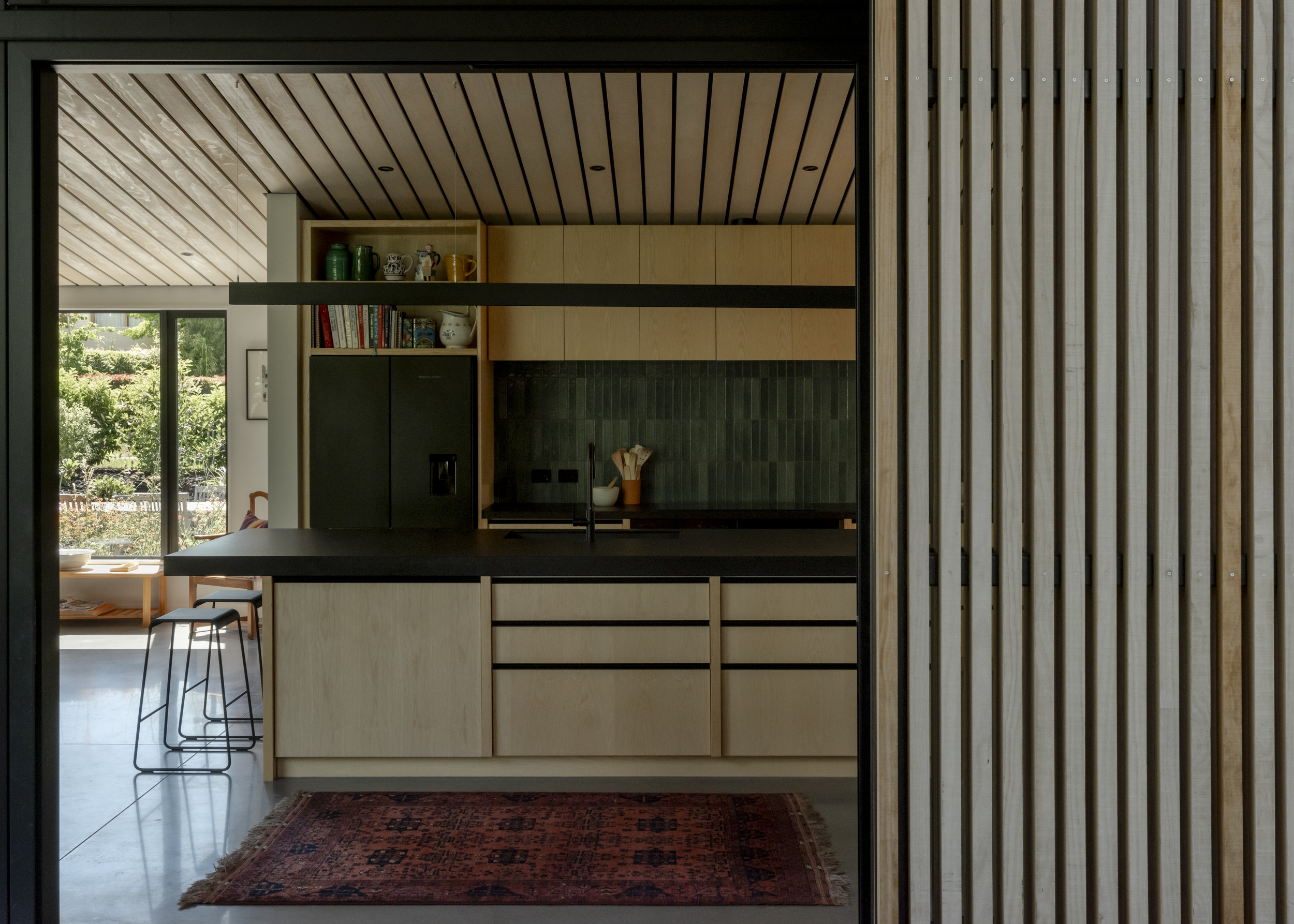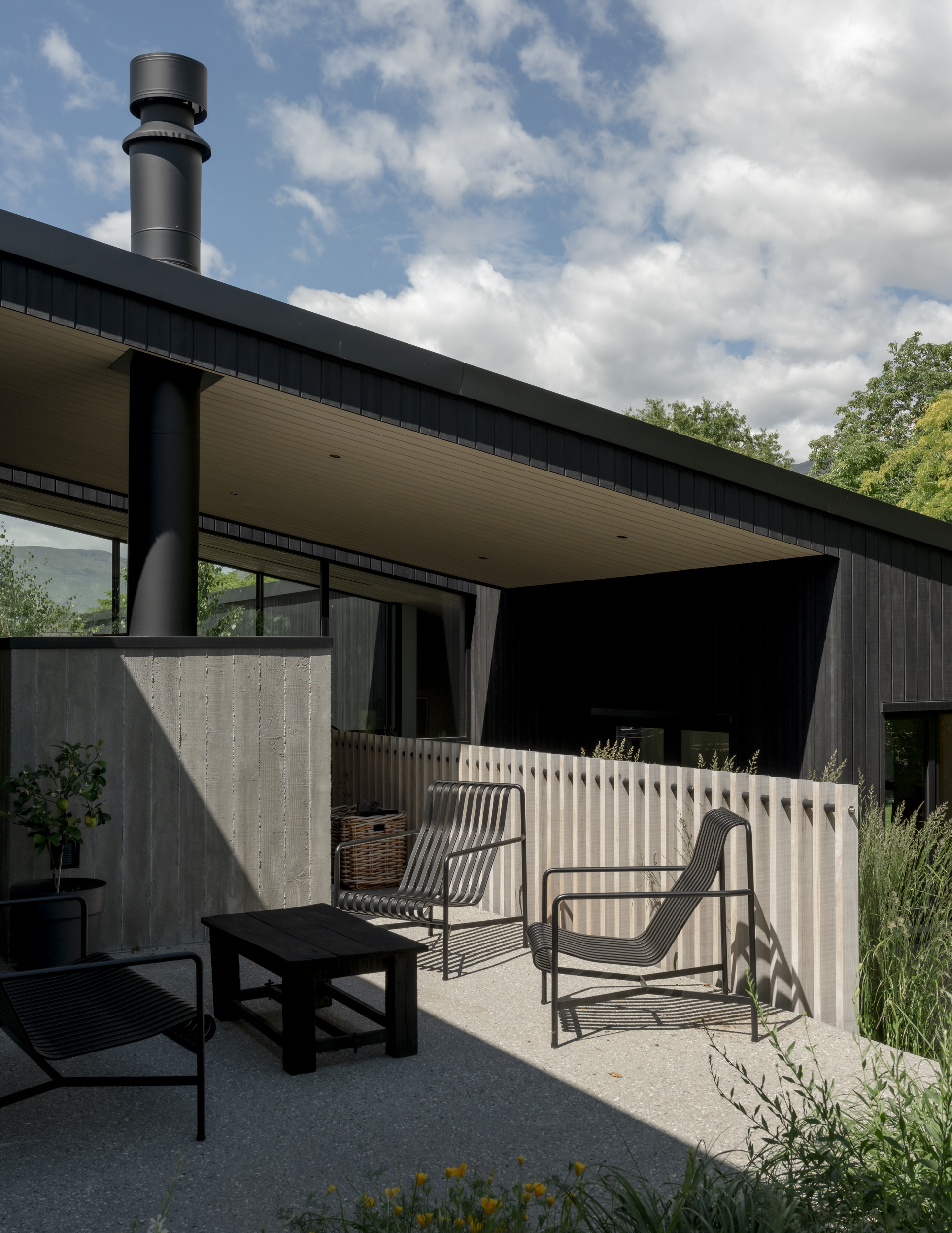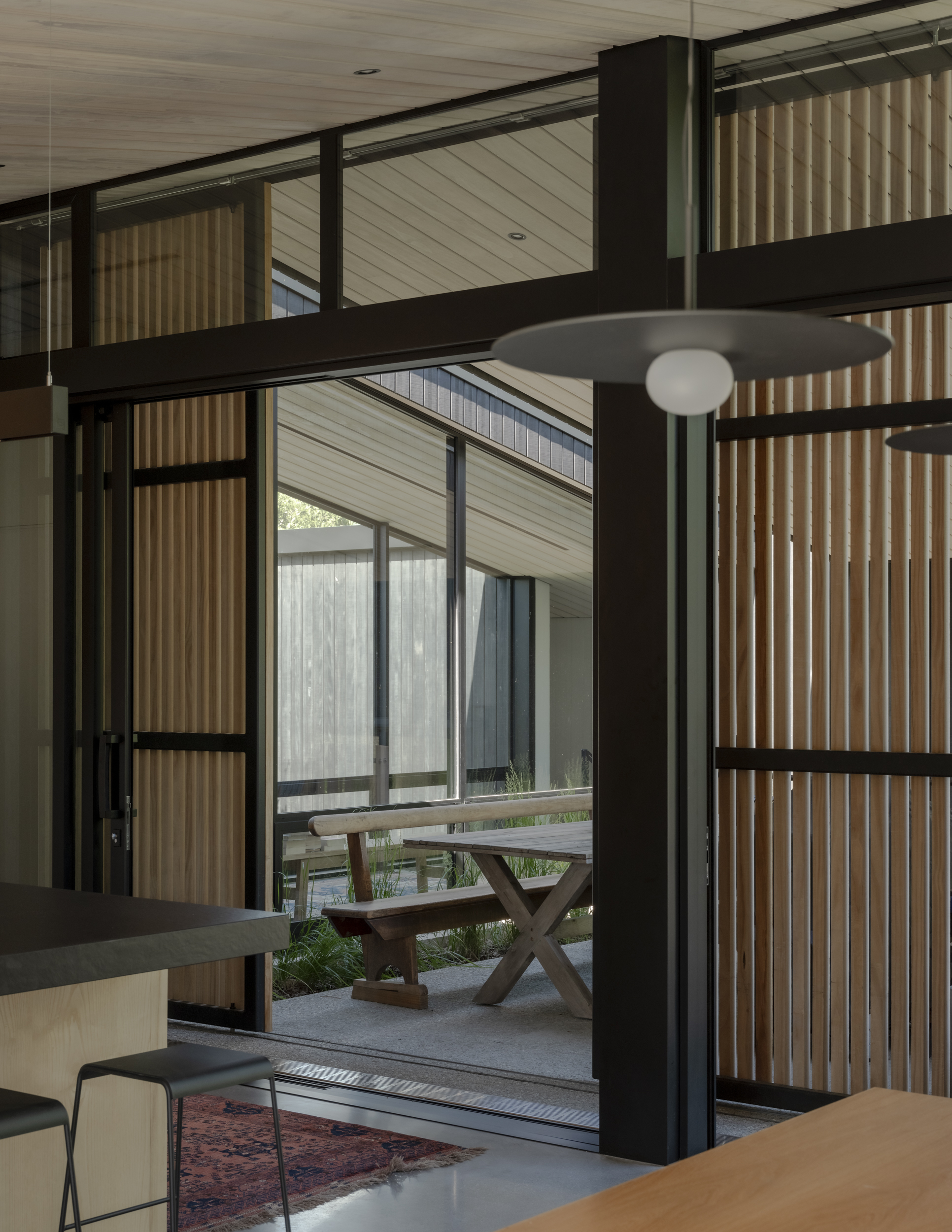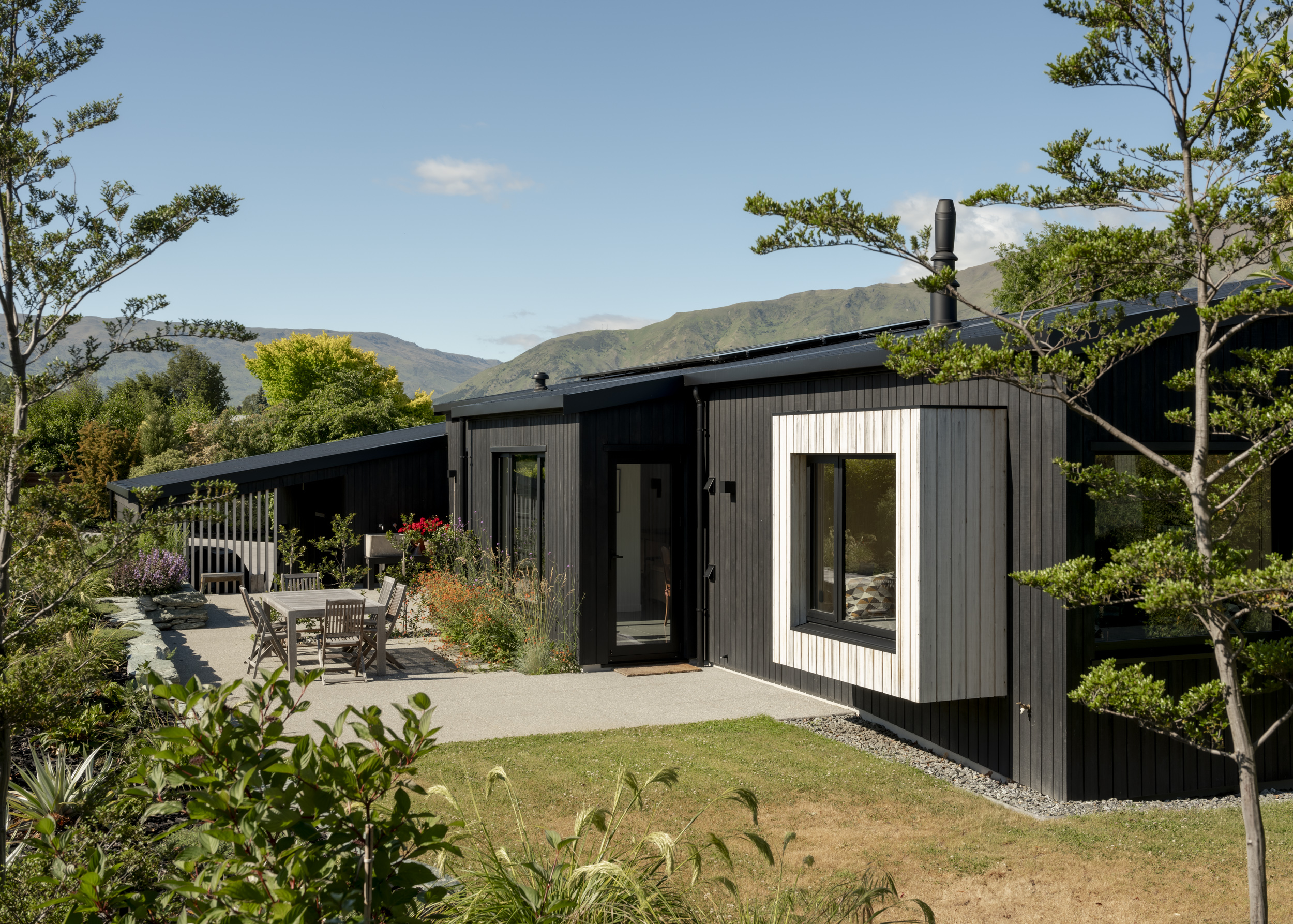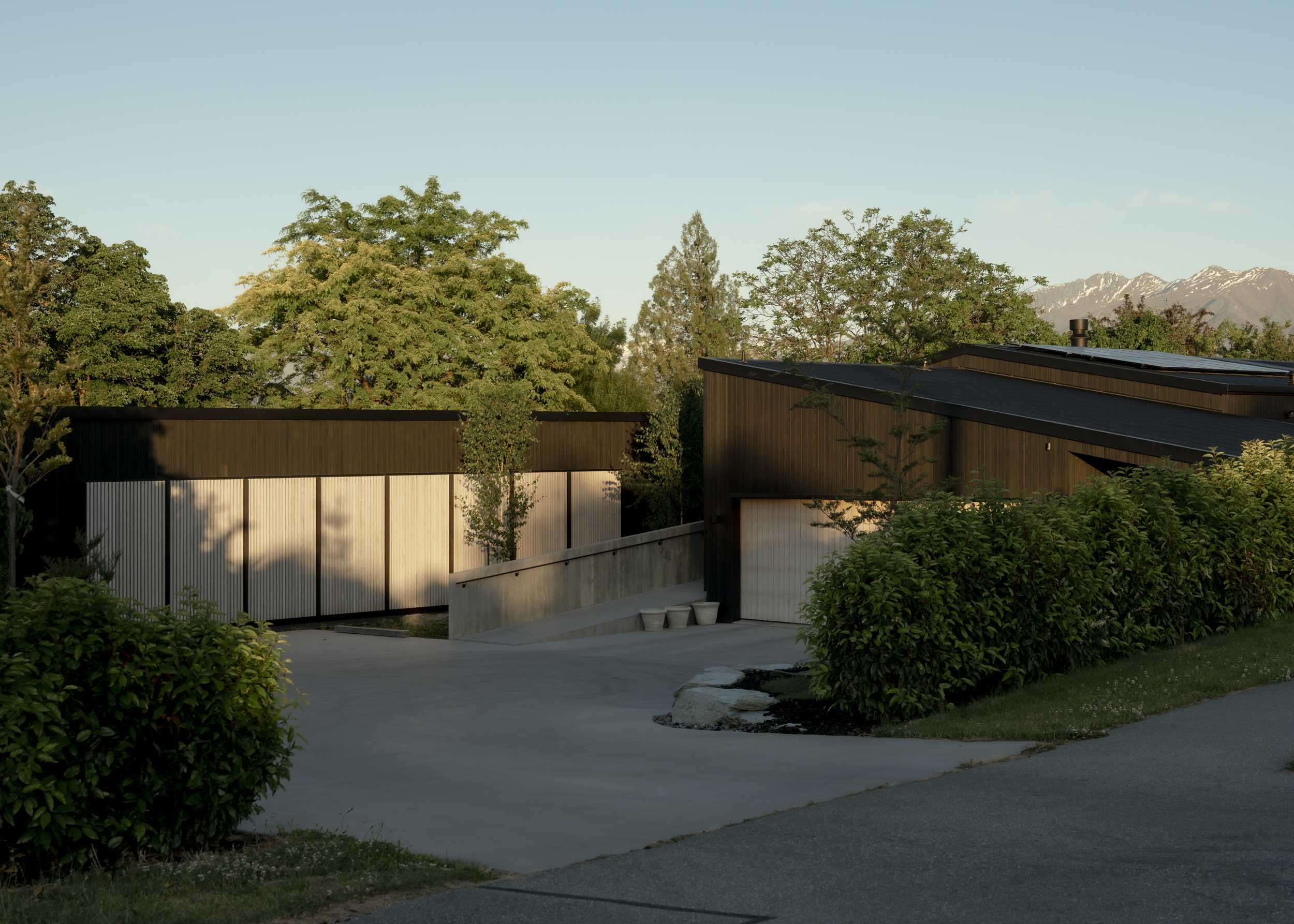 In a location often bound by attempts to capture expansive mountain views, Beacon Point House provides a refreshing contrast by nestling itself into the established landscape. The relationship with a former dwelling on the site built by the client’s father is evident in the new forms, which appear deceivingly modest from the street but expand inwards to hug a central terrace. Materiality has been approached with restraint, with the black-stained exterior timber contrasting the warmth of the interior palette.