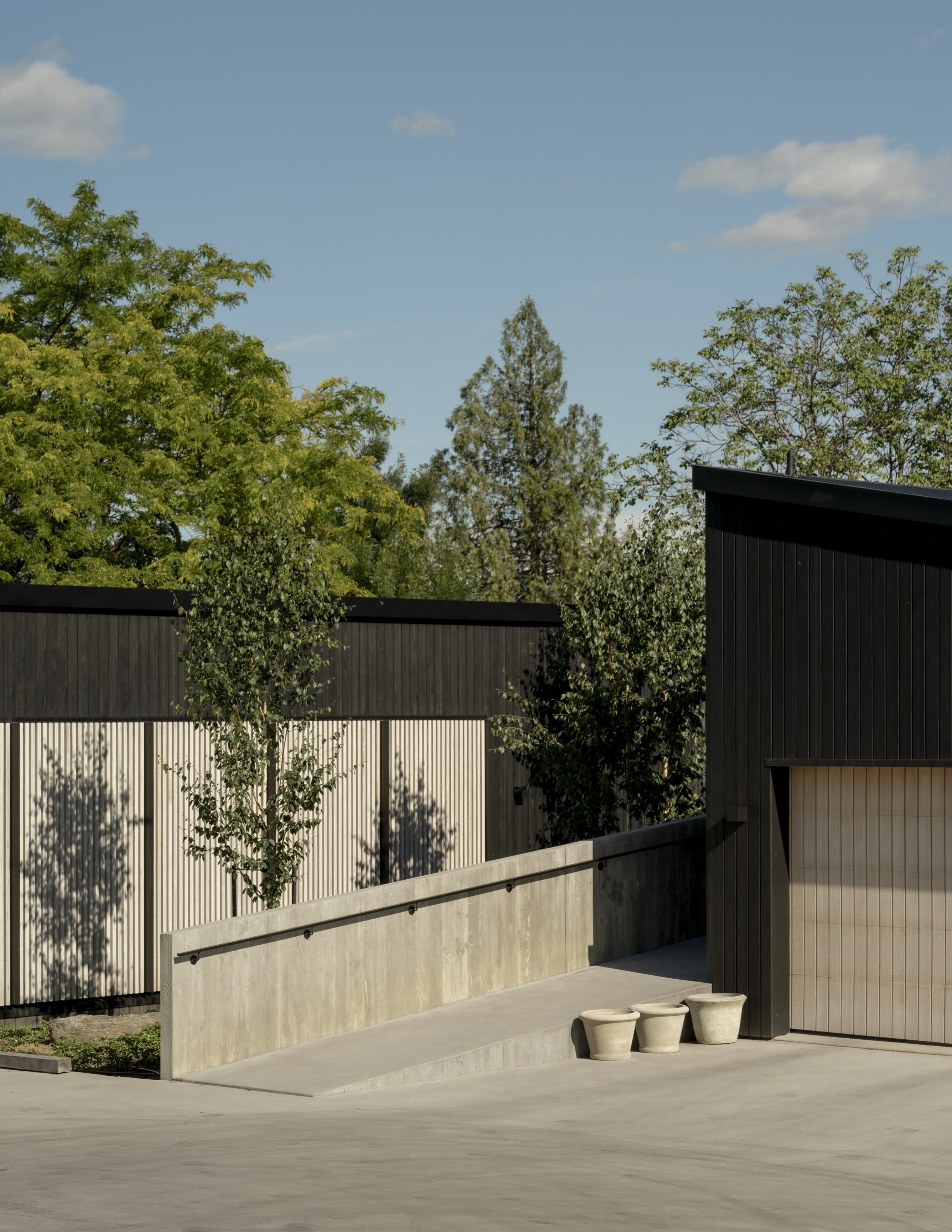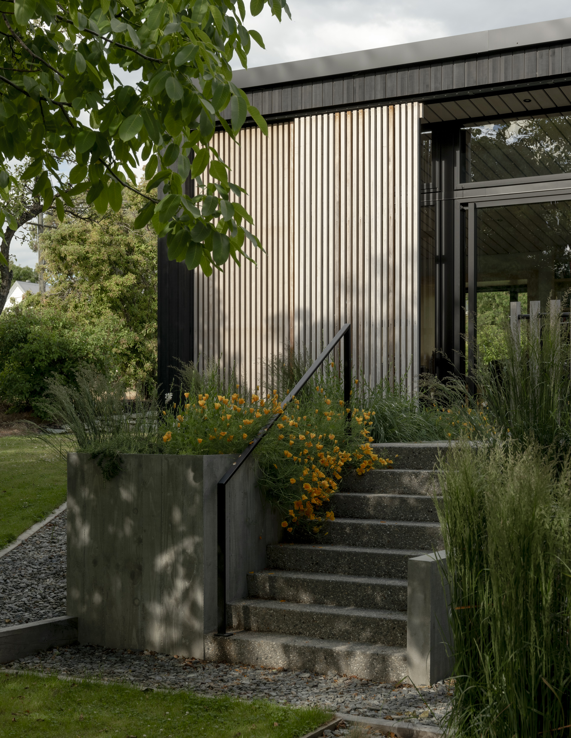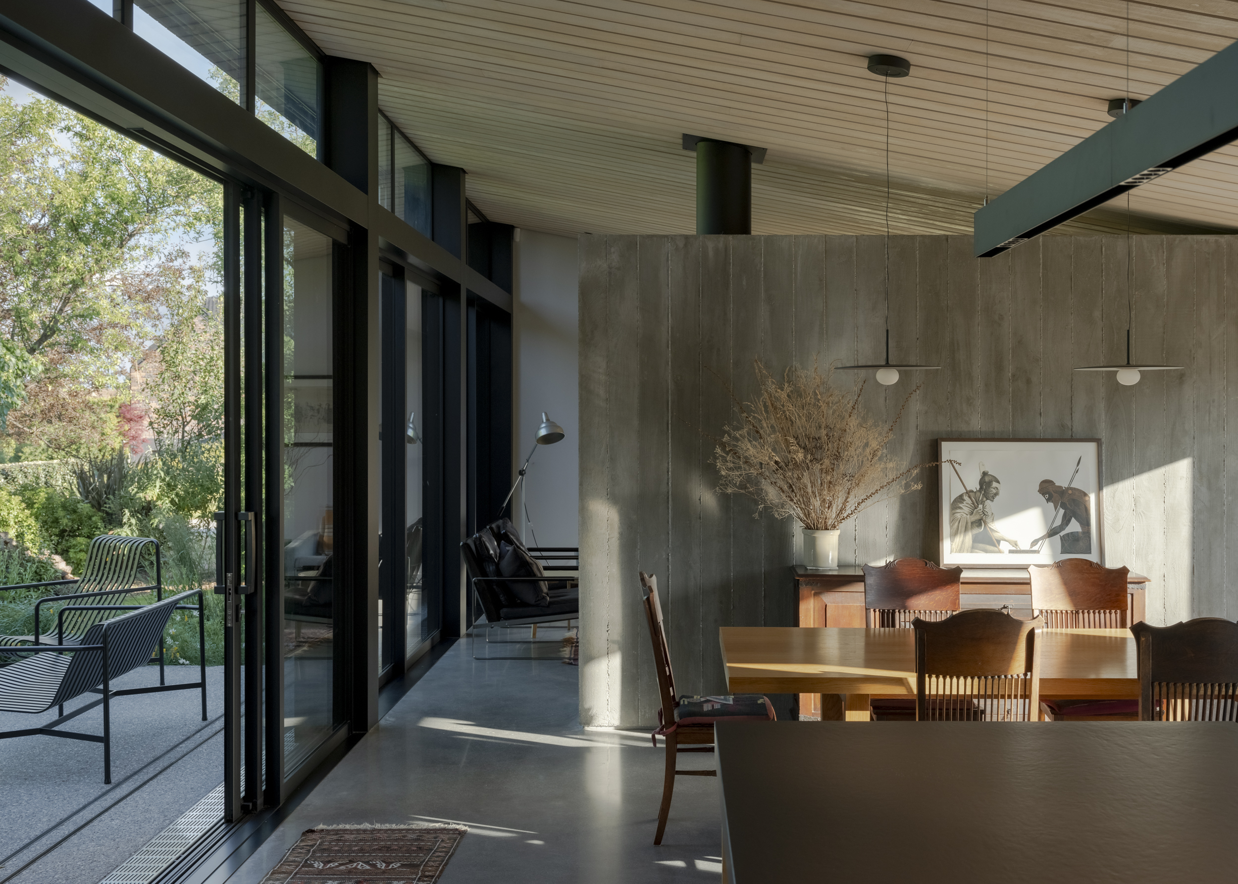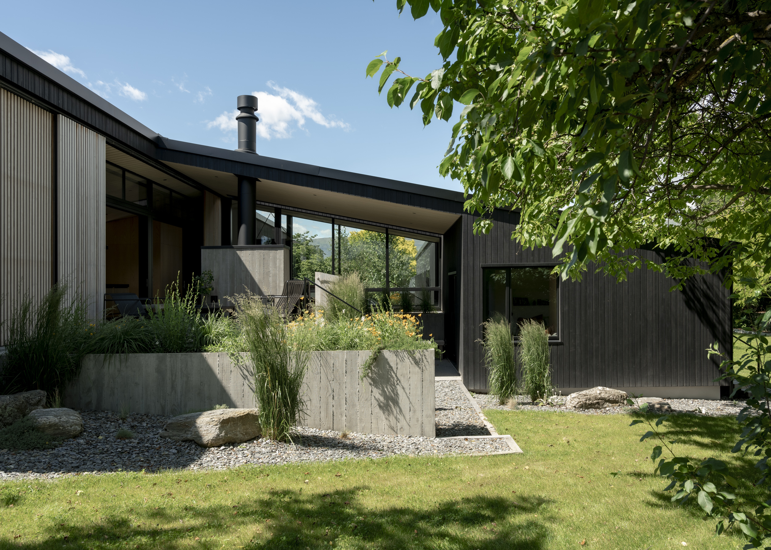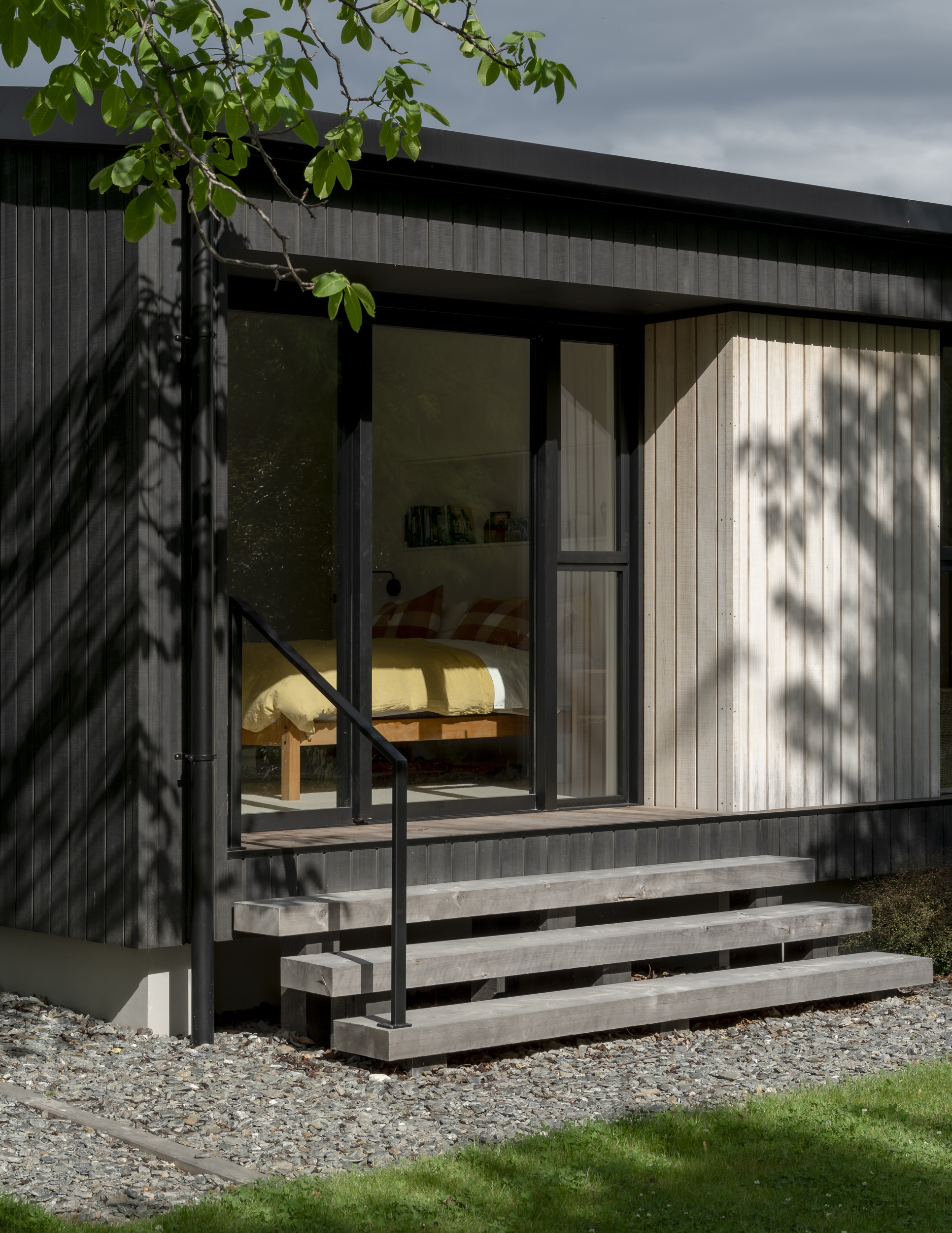 In a location often bound by attempts to capture expansive mountain views, Beacon Point House provides a refreshing contrast by nestling itself into the established landscape. The relationship with a former dwelling on the site built by the client’s father is evident in the new forms, which appear deceivingly modest from the street but expand inwards to hug a central terrace. Materiality has been approached with restraint, with the black-stained exterior timber contrasting the warmth of the interior palette.