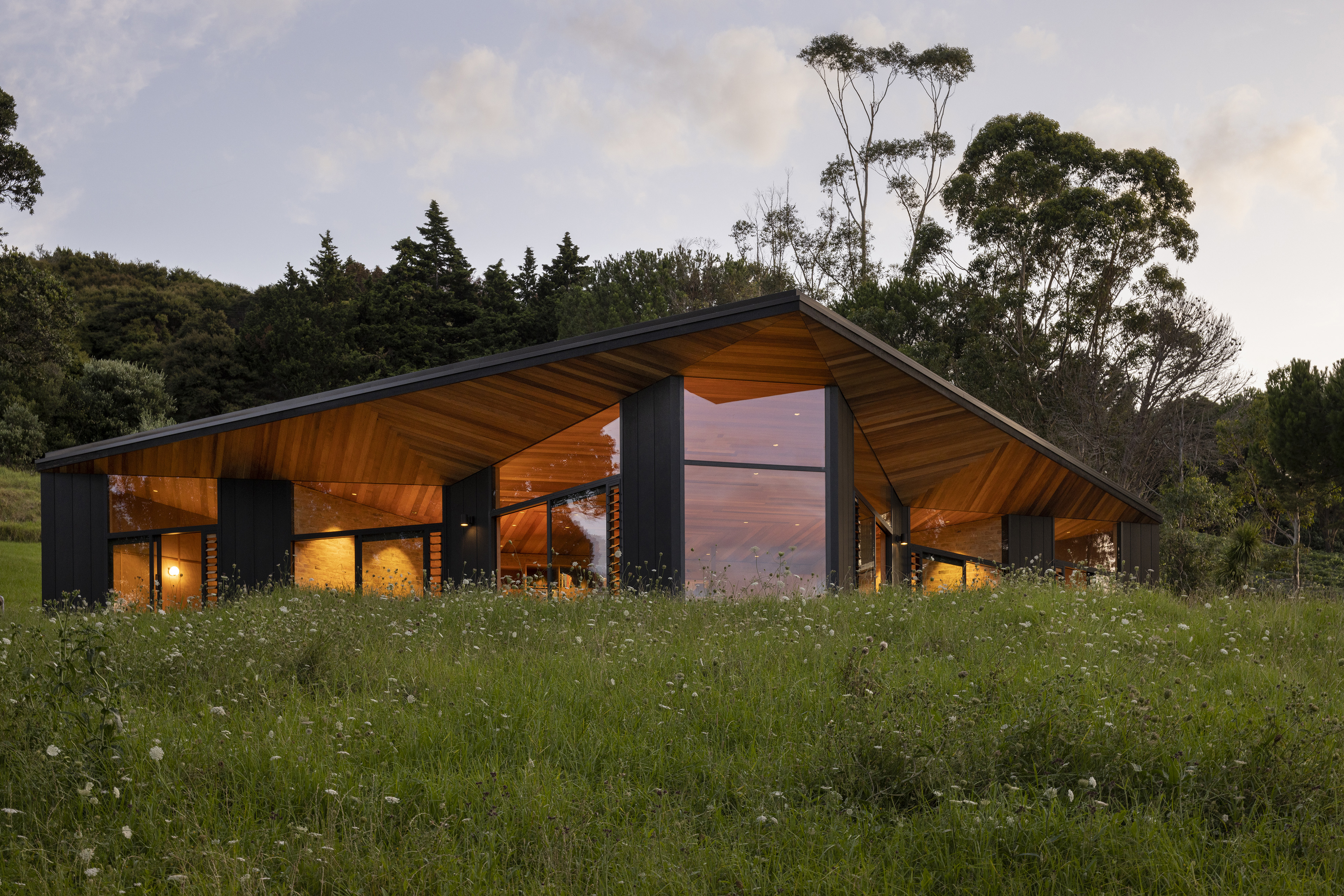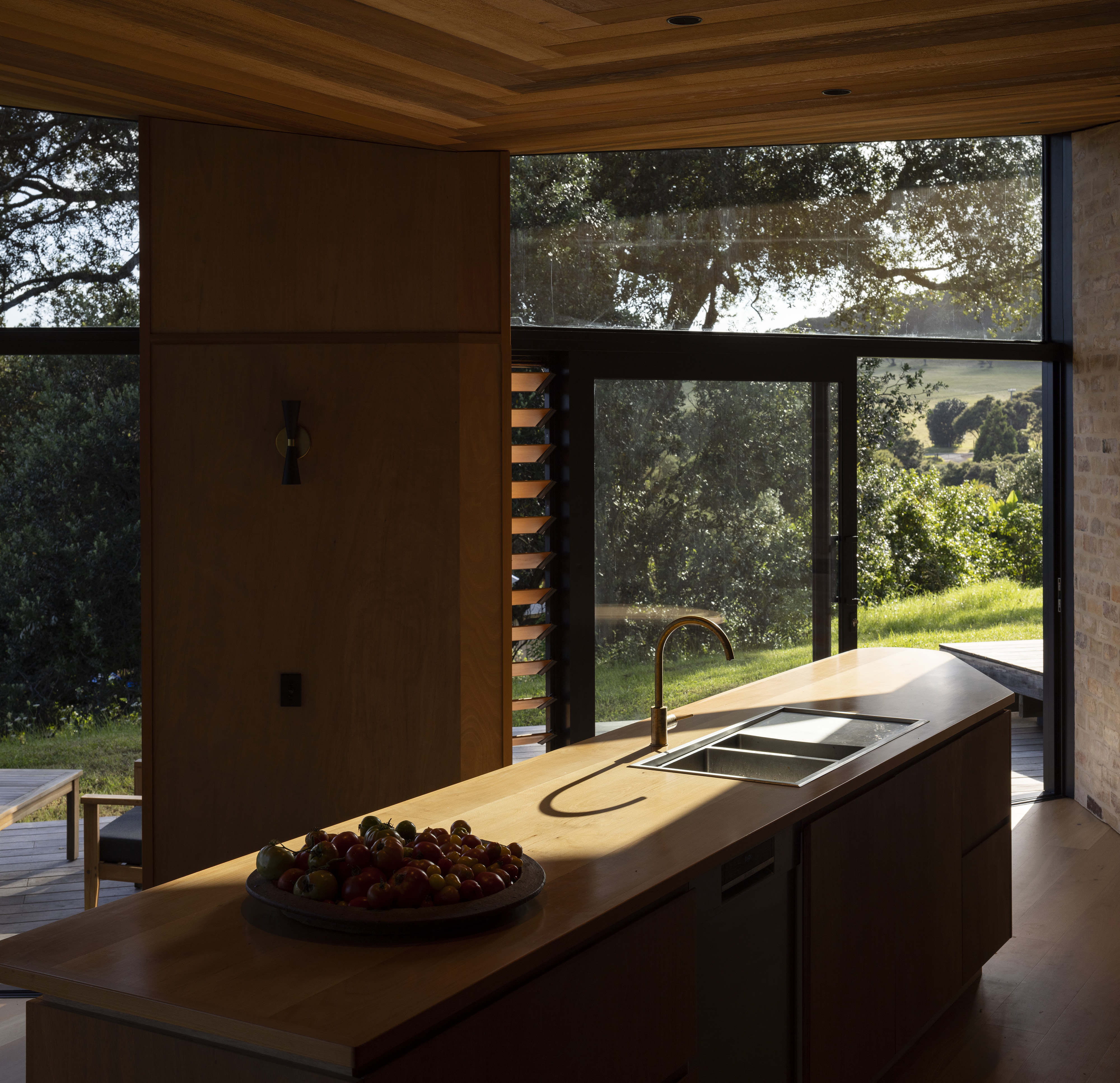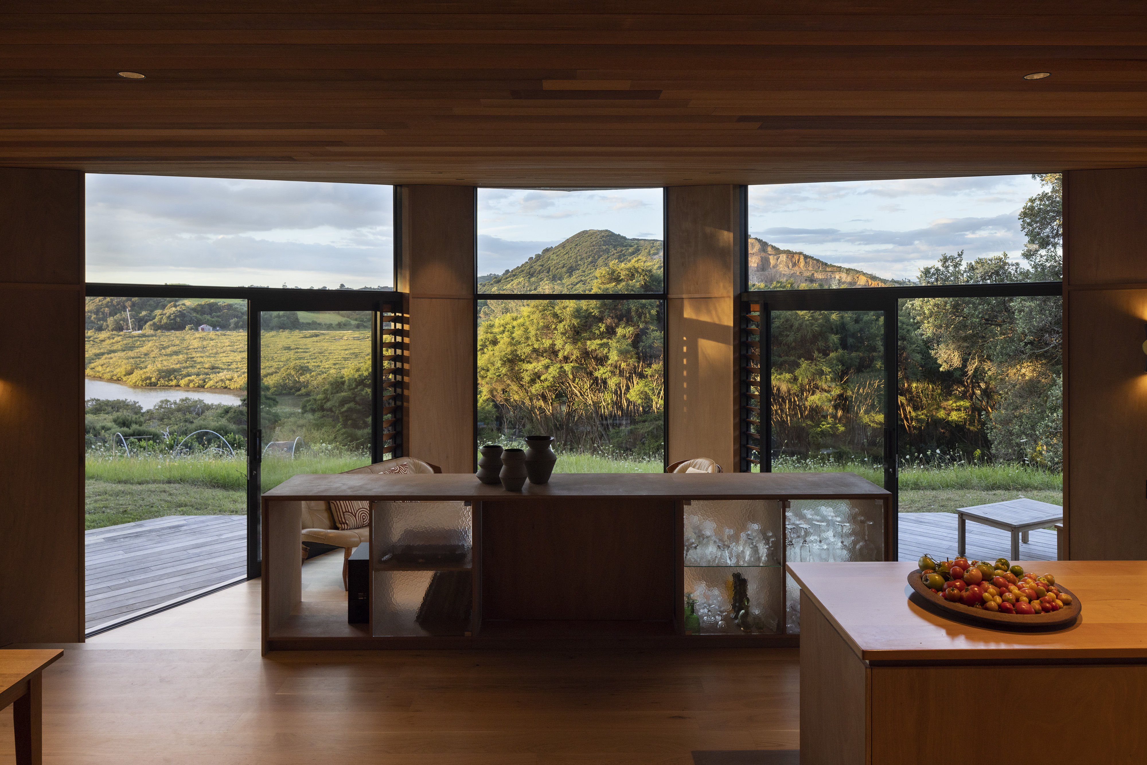 This house is modest in size but ambitious in expression. Testament to a trusting and collaborative relationship between architect and client, the house takes the generative idea of a bird in flight and marries it with the compass form of the pōhutukawa seed. The result is a home that feels simultaneously warm and inviting, yet open and connected to its surrounds. A heroic timber ceiling cloaks the north-facing rooms, which draw the eye out to the pōhutukawas and estuary beyond.