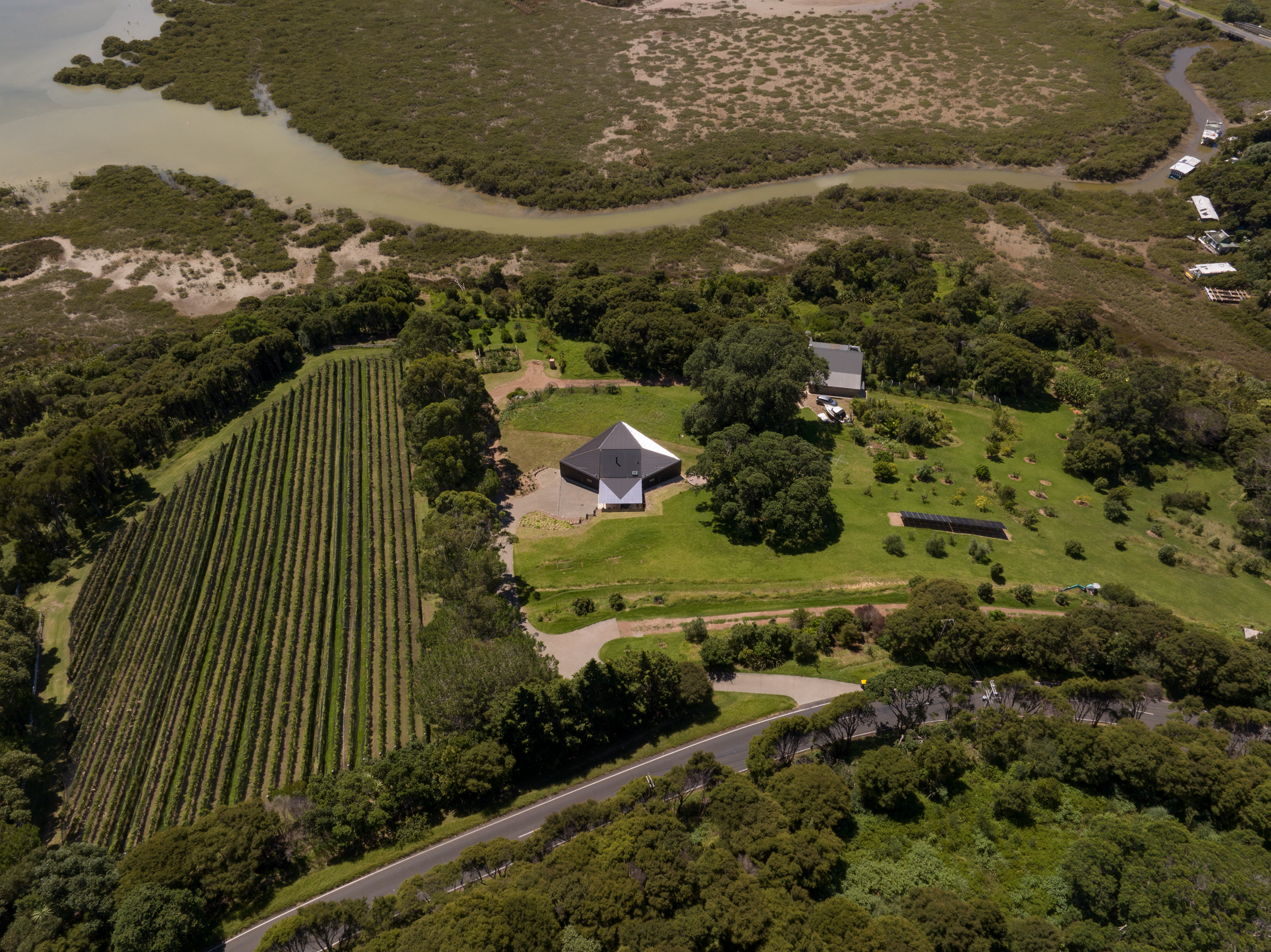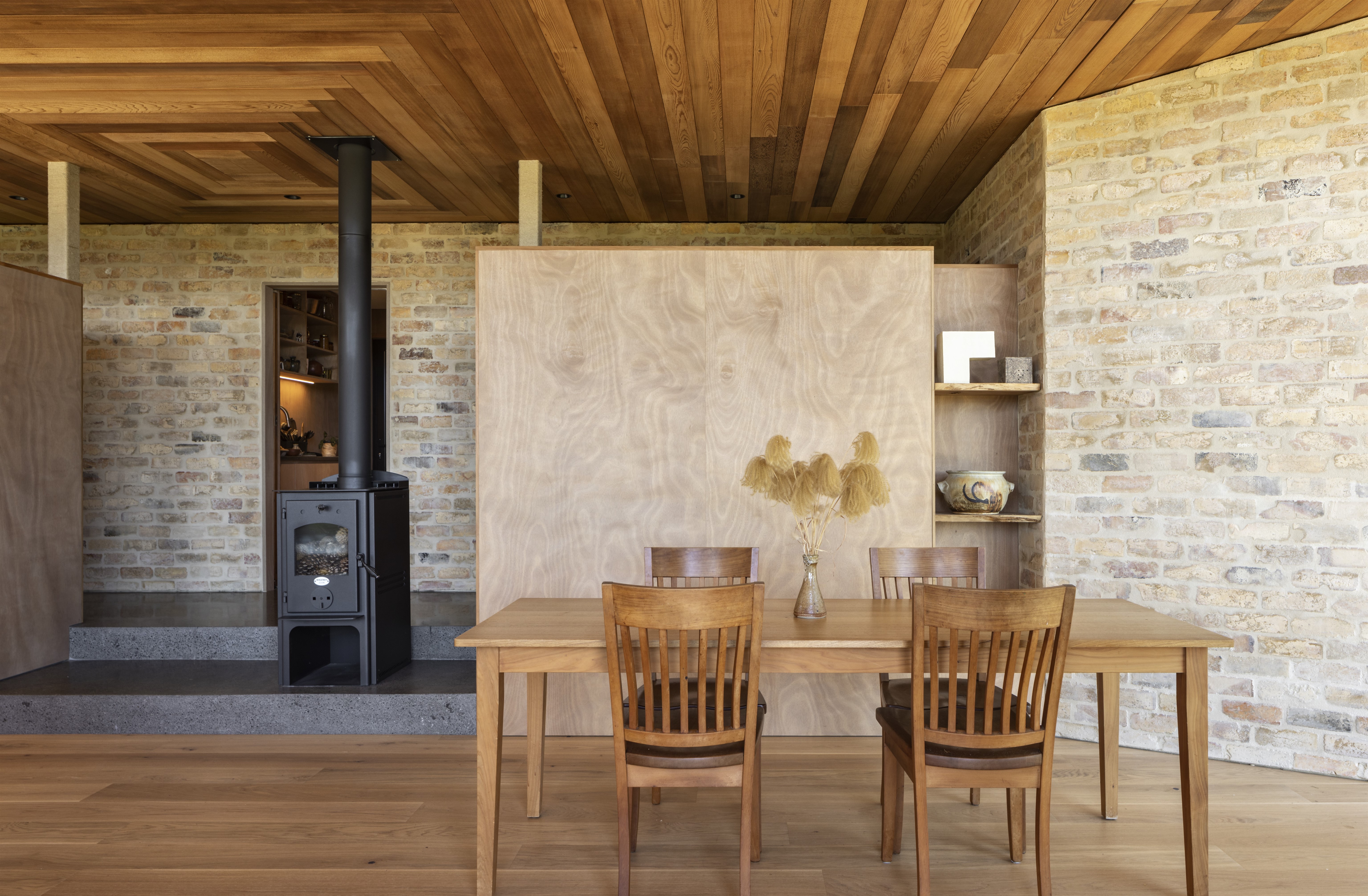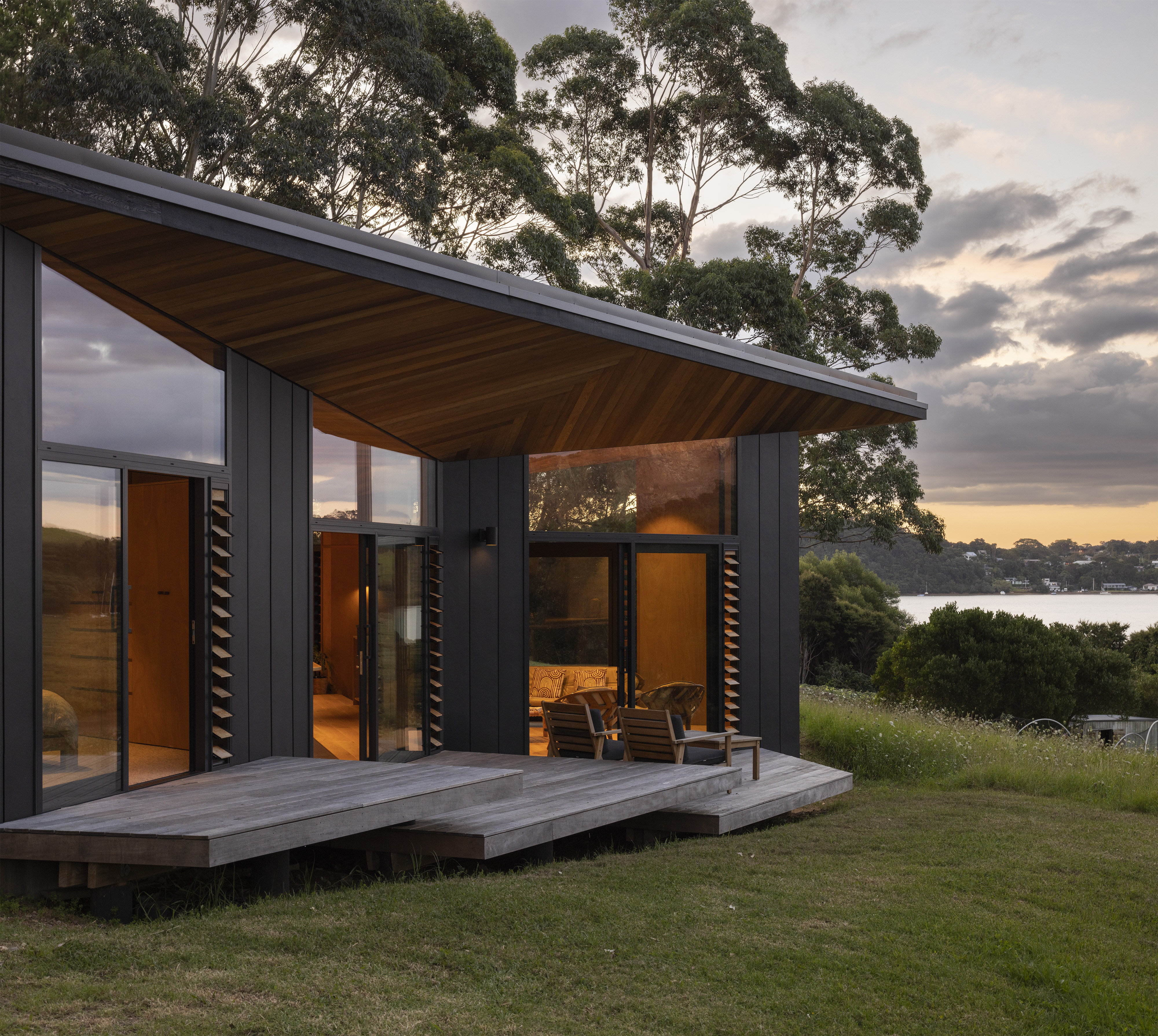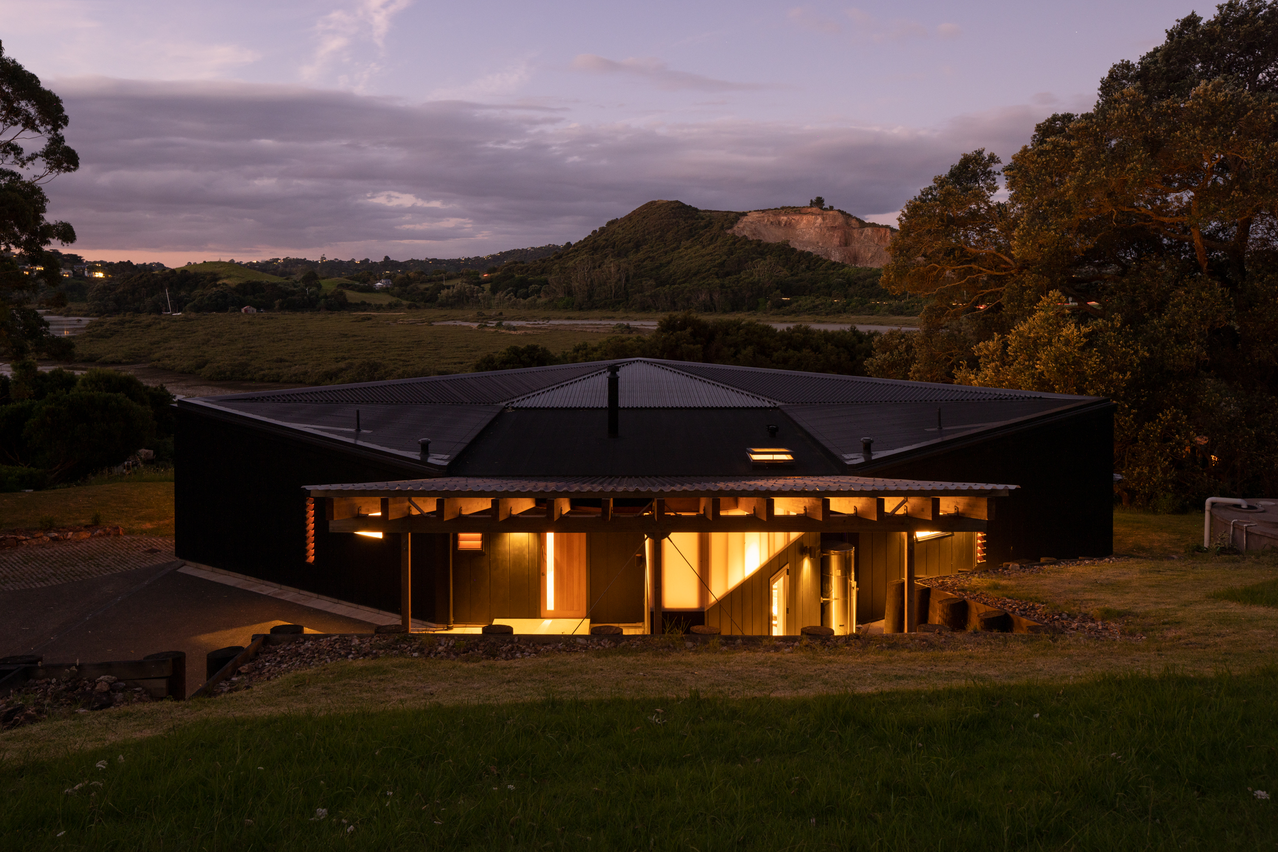 This house is modest in size but ambitious in expression. Testament to a trusting and collaborative relationship between architect and client, the house takes the generative idea of a bird in flight and marries it with the compass form of the pōhutukawa seed. The result is a home that feels simultaneously warm and inviting, yet open and connected to its surrounds. A heroic timber ceiling cloaks the north-facing rooms, which draw the eye out to the pōhutukawas and estuary beyond.