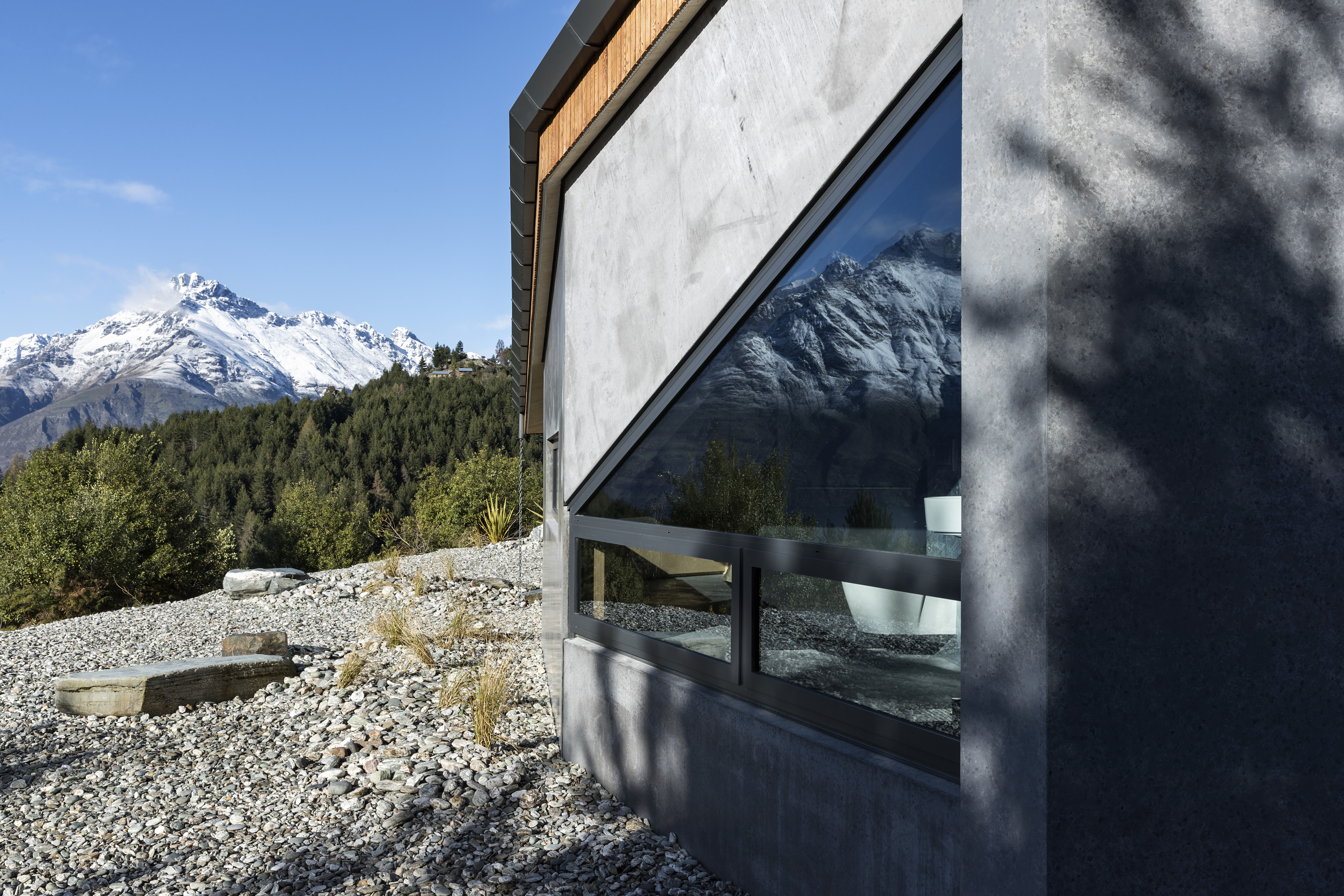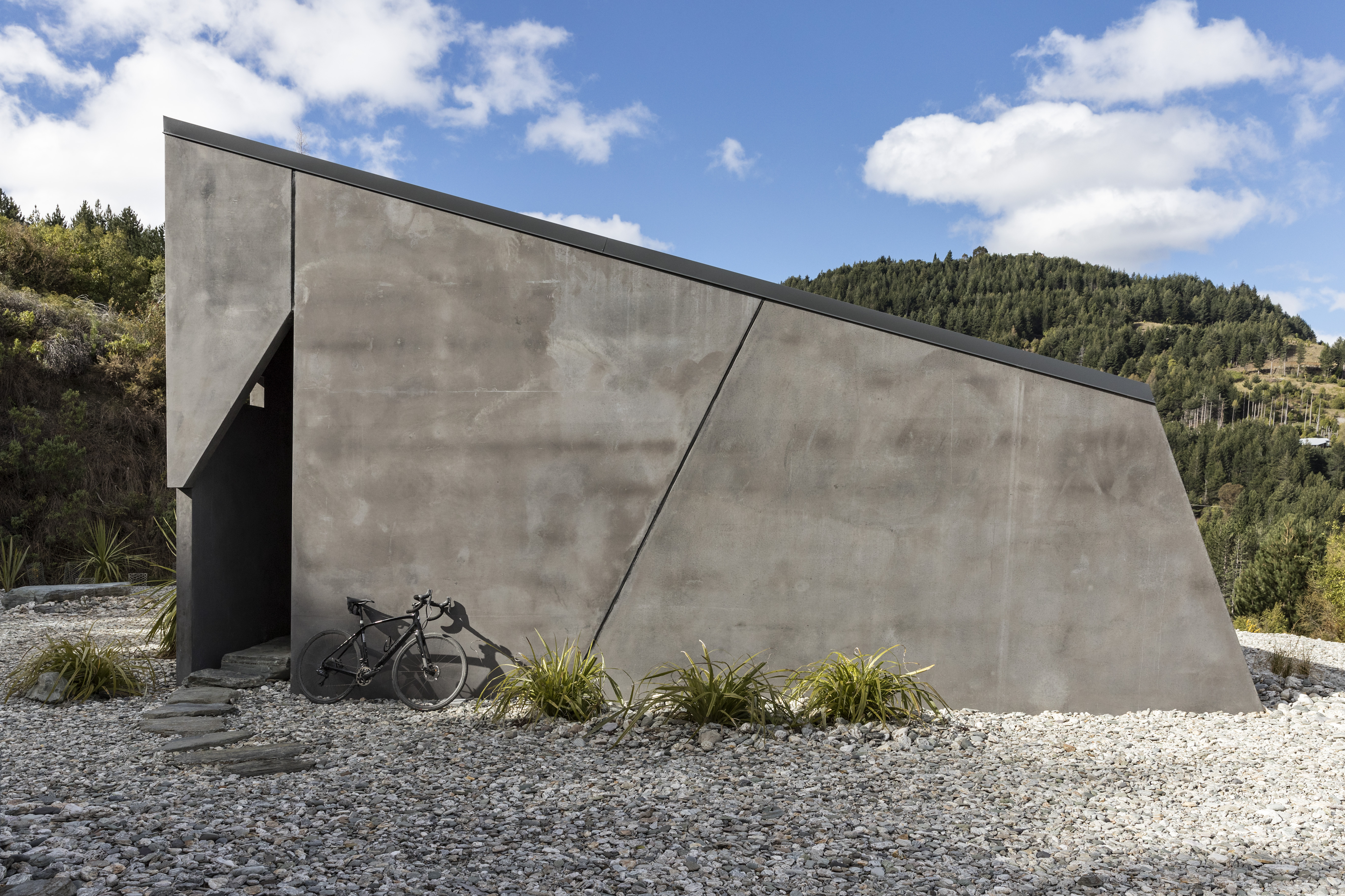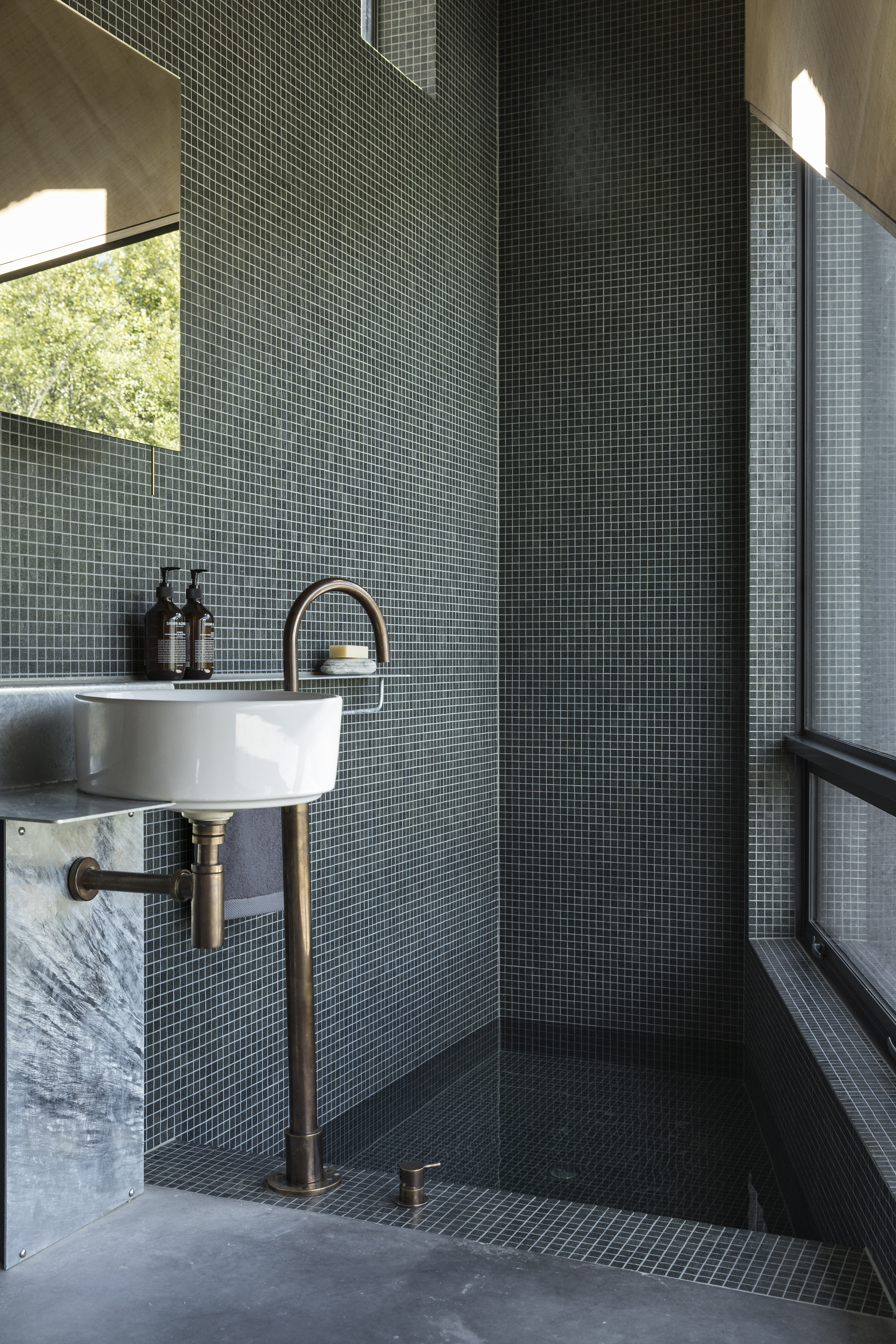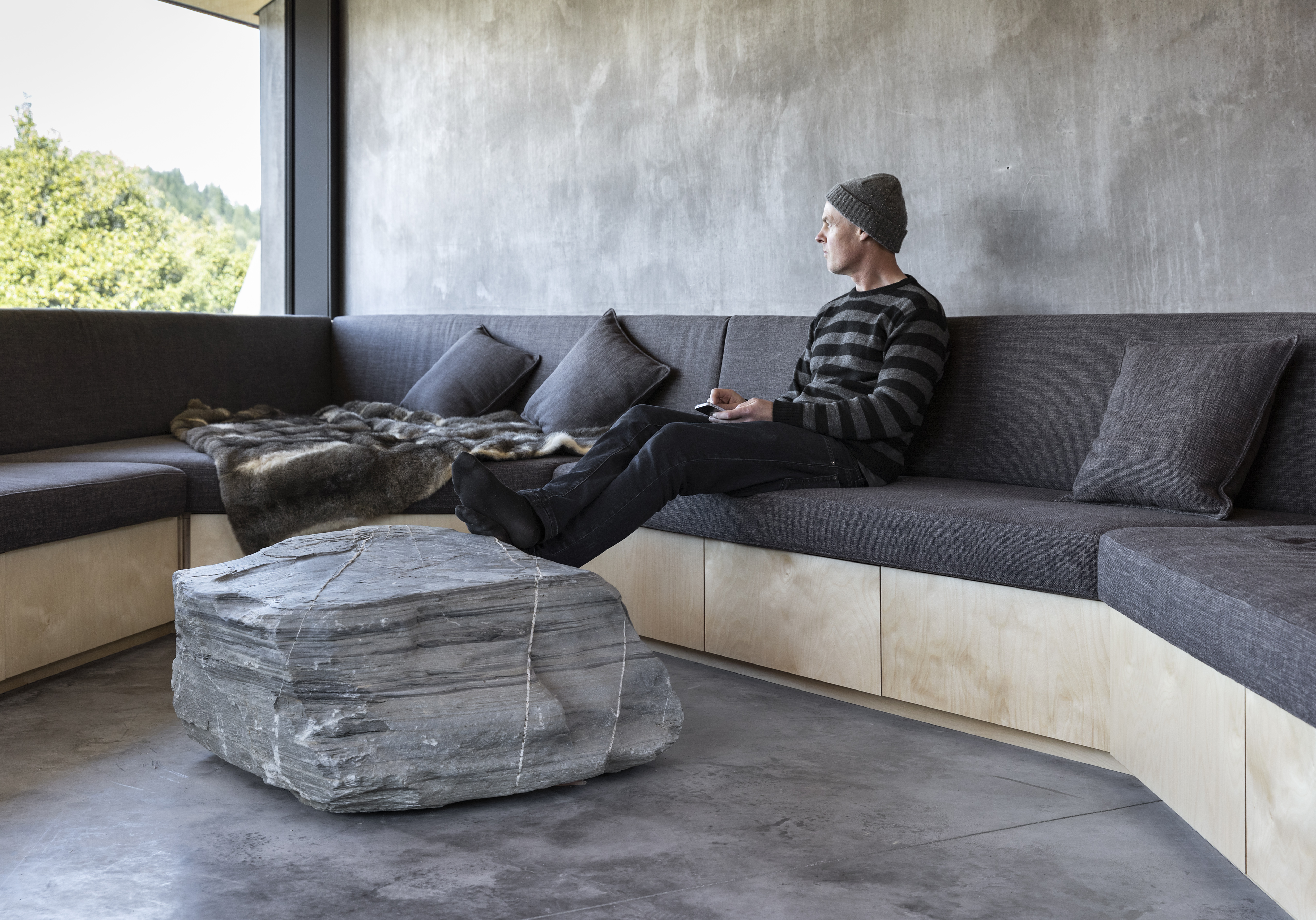 This compact dwelling follows the line of the hillside, bravely and unconventionally sloping down towards the view. The stepped plan stretches the view of the mountains long and low, just like a rock outcrop would. The interior is crafted with a charm that is addictive – slots between volumes and fissures in the concrete walls allow you to move effortlessly between spaces; the shower is a literal waterfall cascading from a great height down moss coloured walls into a deep pool.