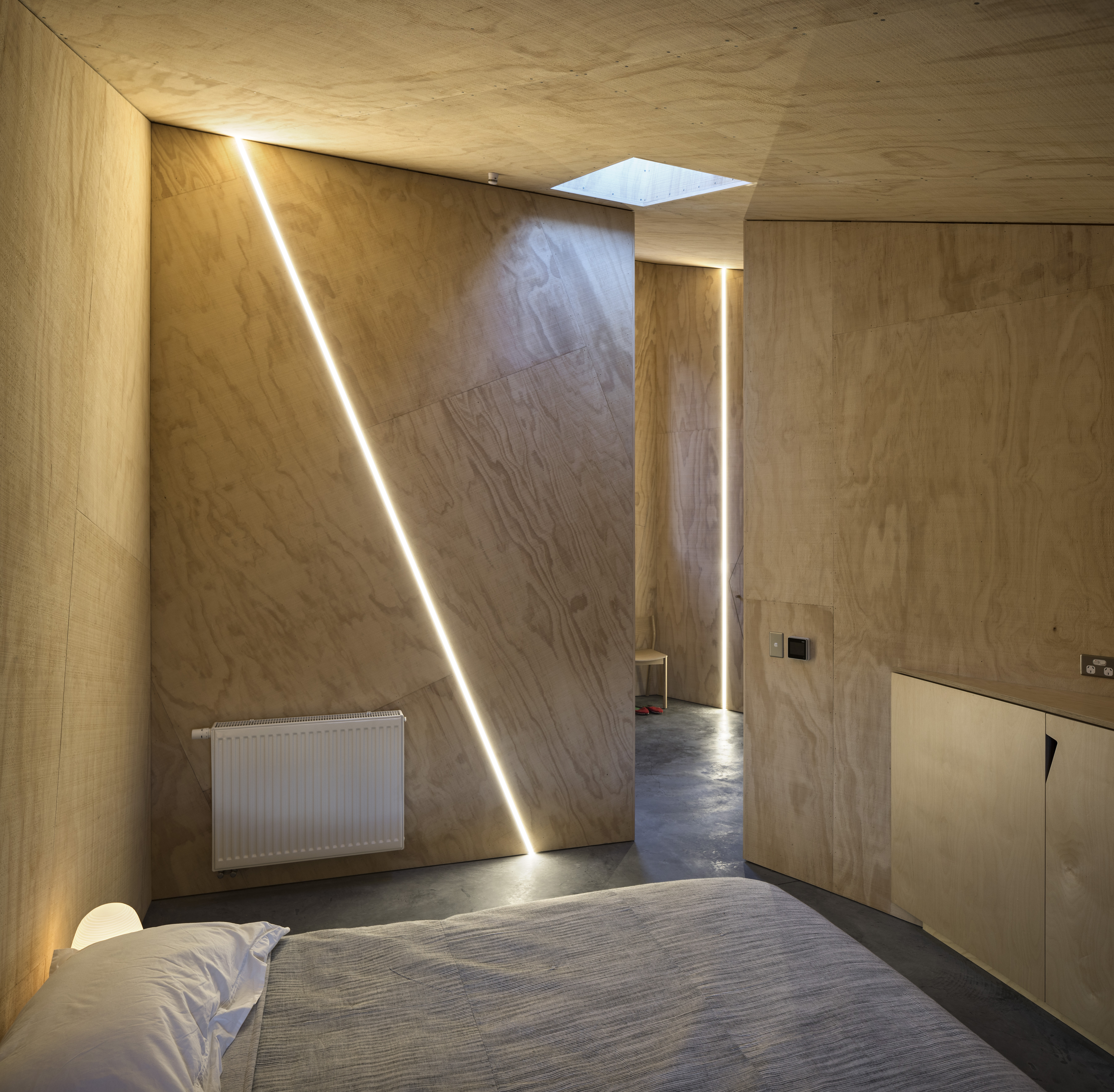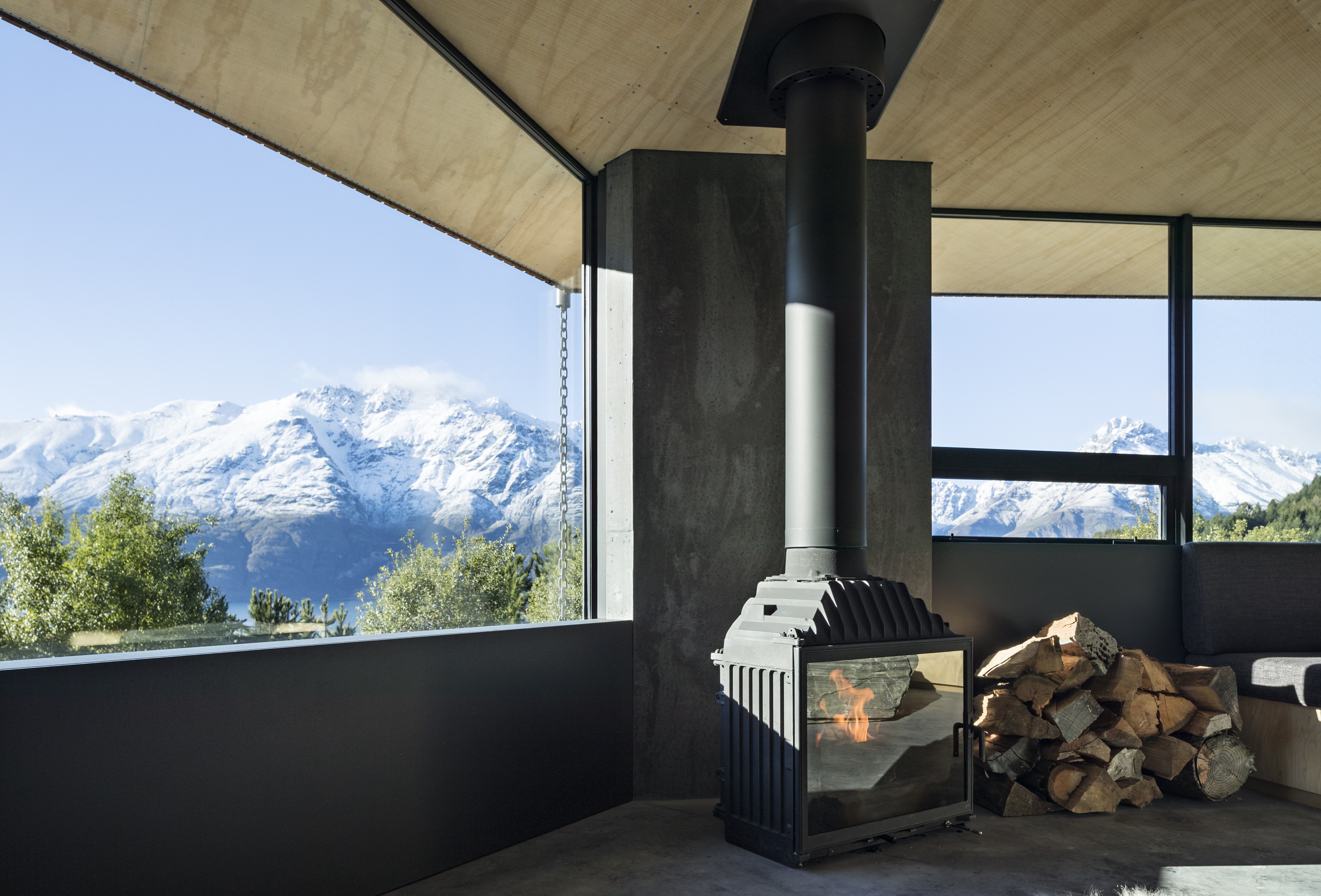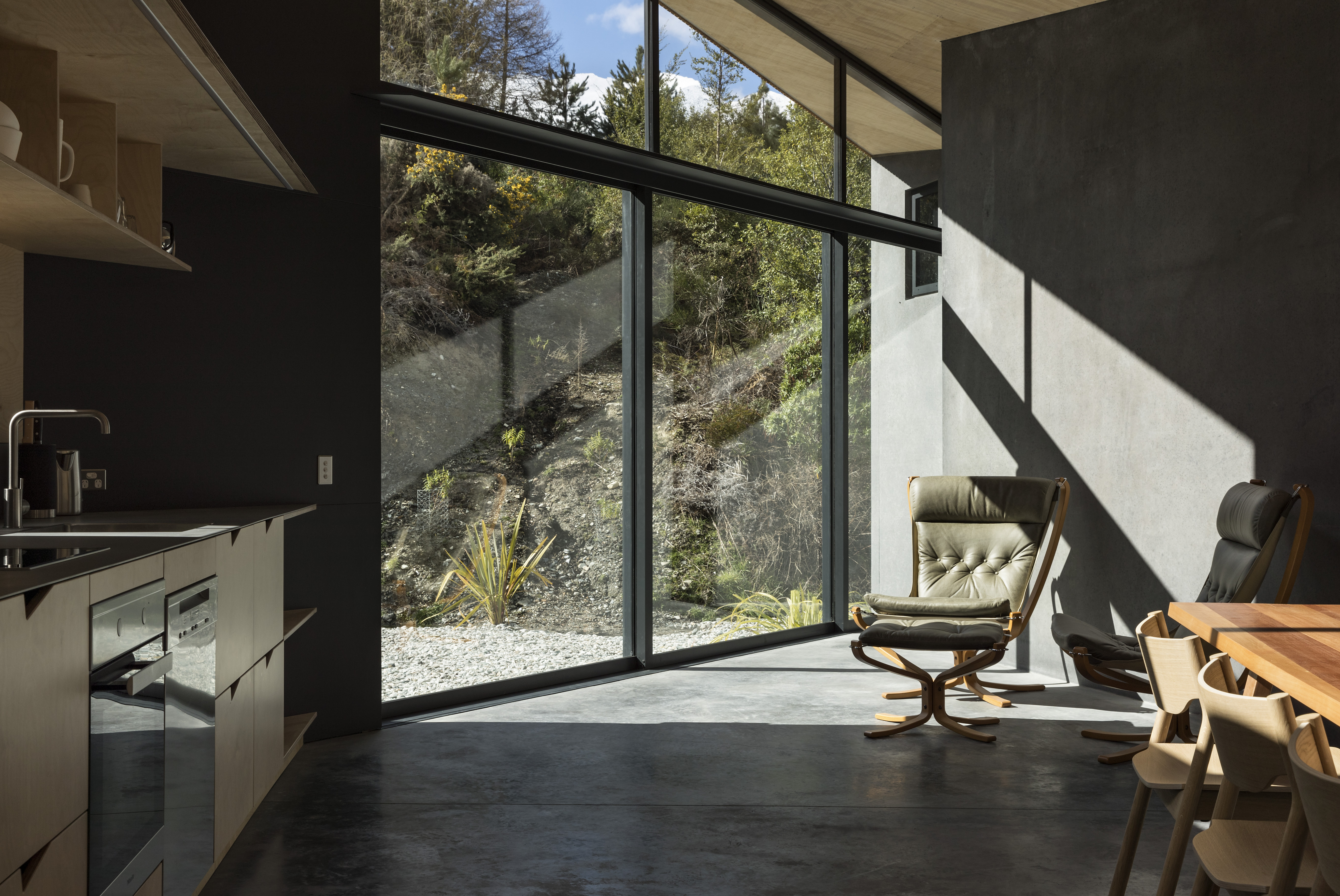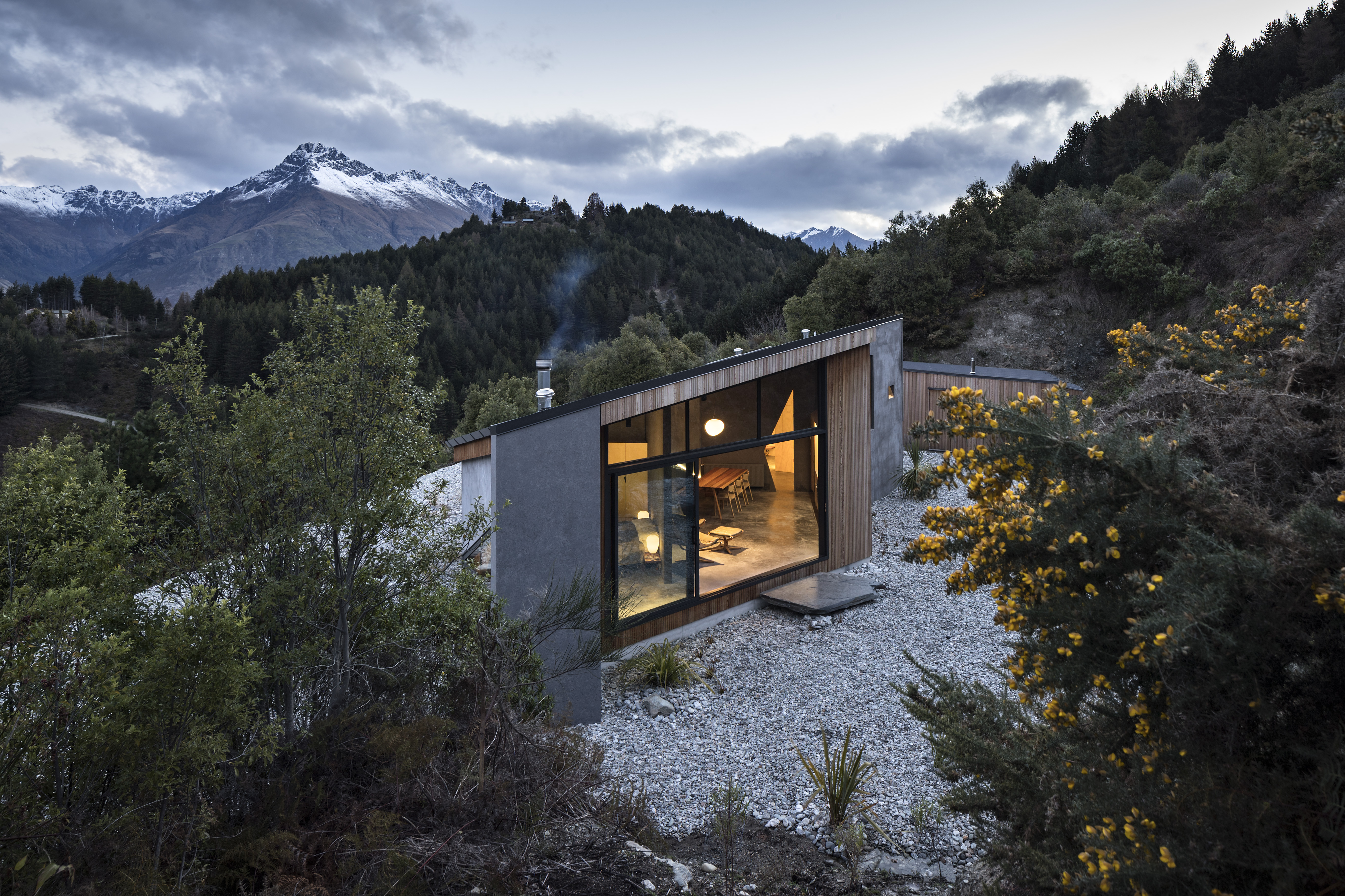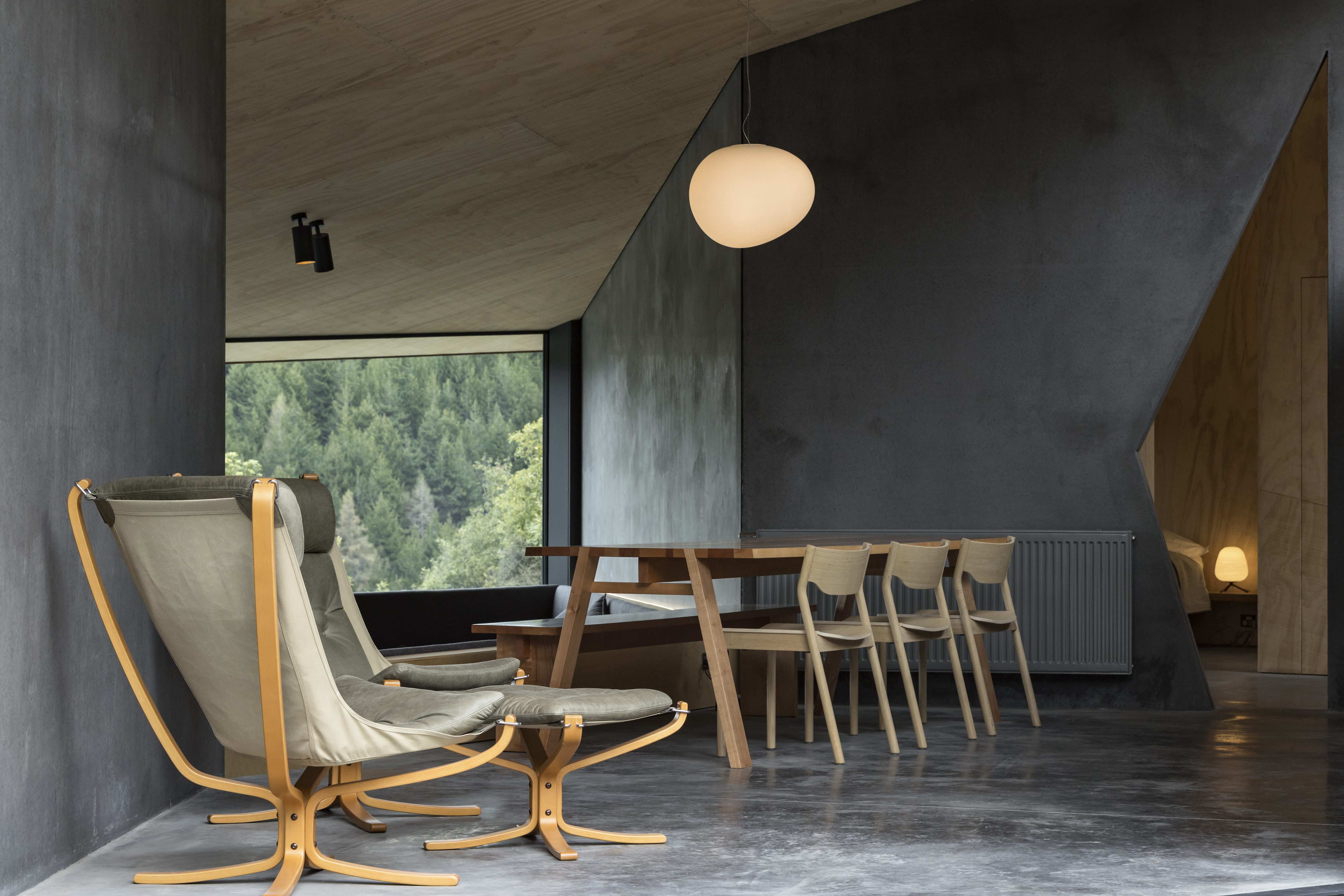 This compact dwelling follows the line of the hillside, bravely and unconventionally sloping down towards the view. The stepped plan stretches the view of the mountains long and low, just like a rock outcrop would. The interior is crafted with a charm that is addictive – slots between volumes and fissures in the concrete walls allow you to move effortlessly between spaces; the shower is a literal waterfall cascading from a great height down moss coloured walls into a deep pool.