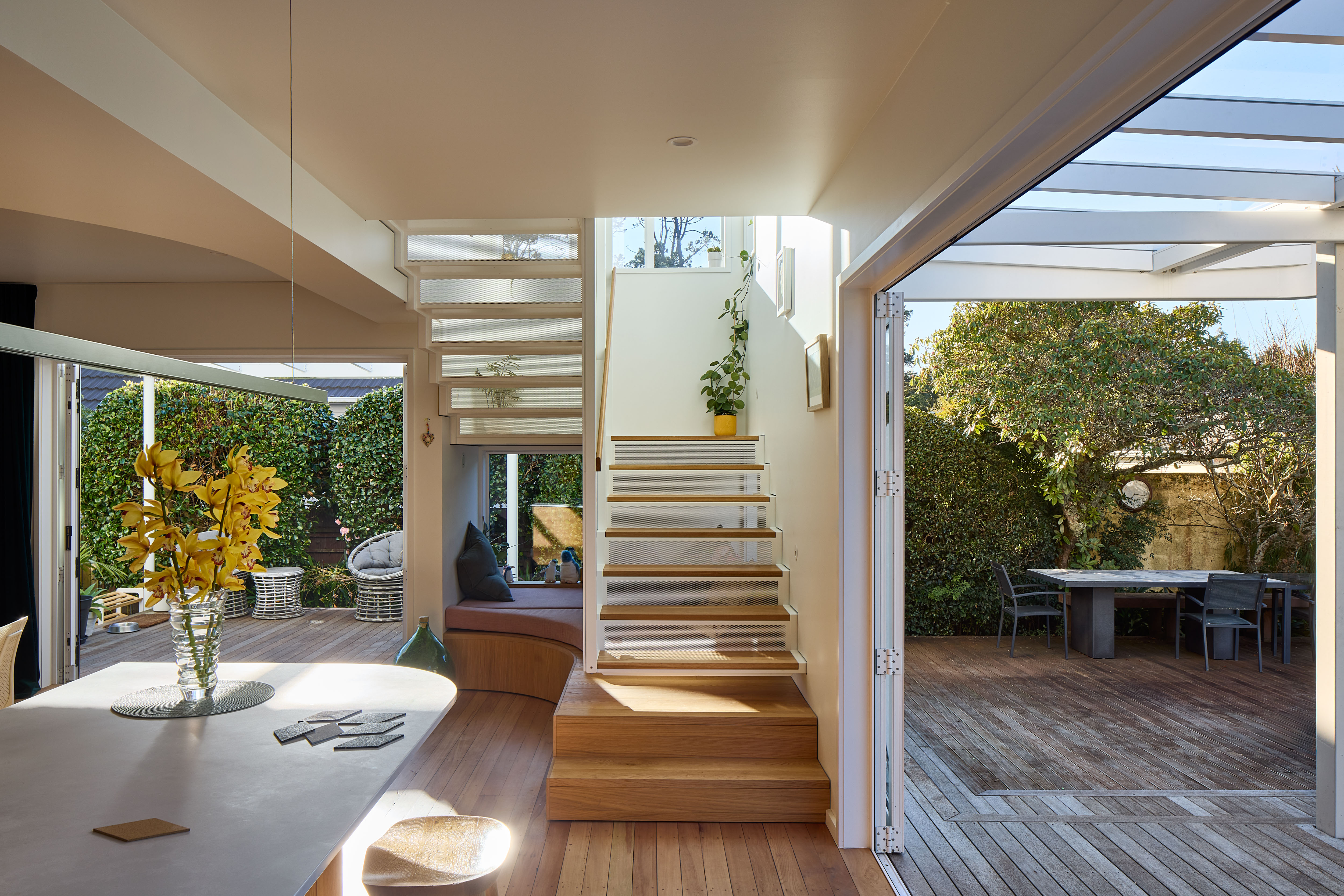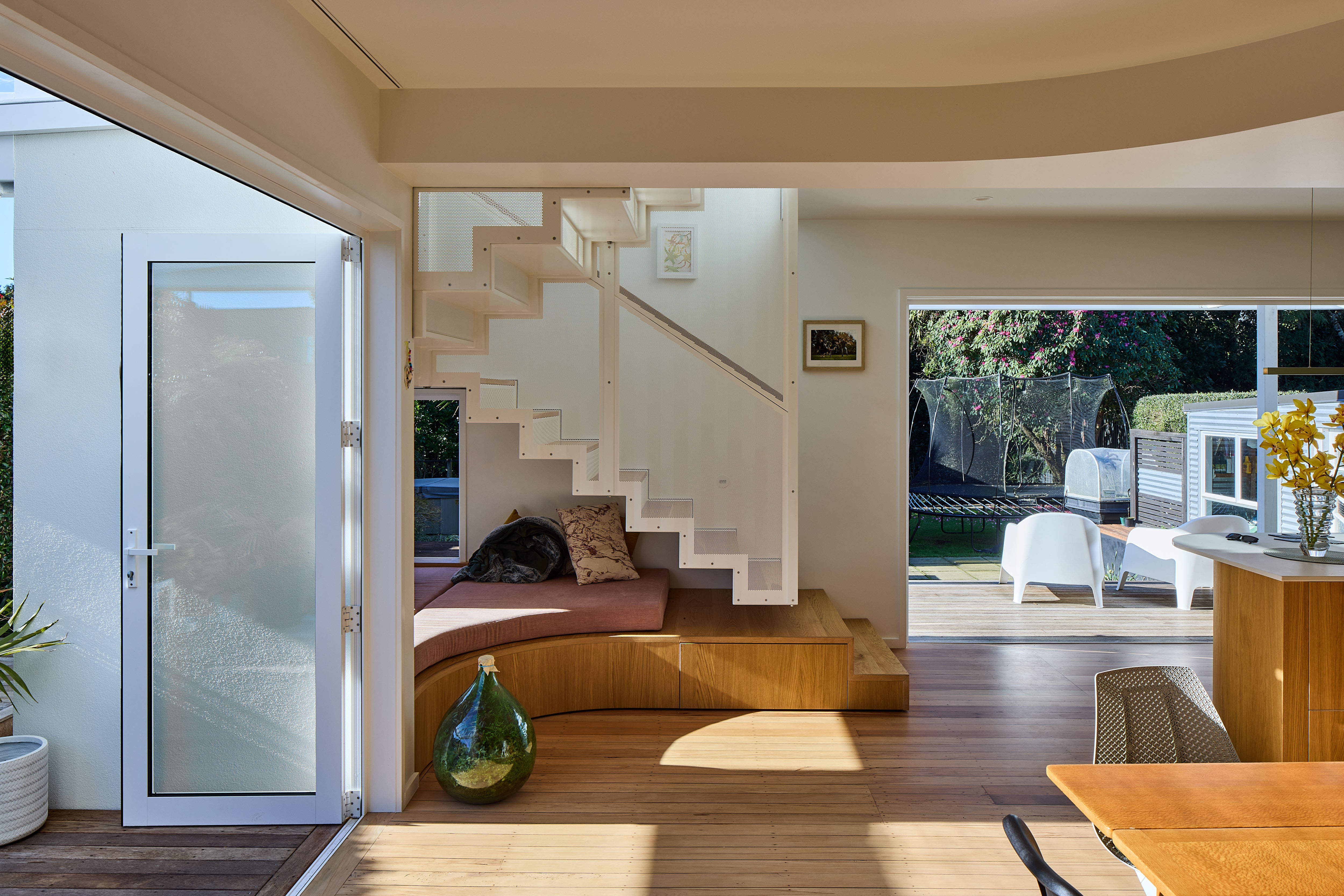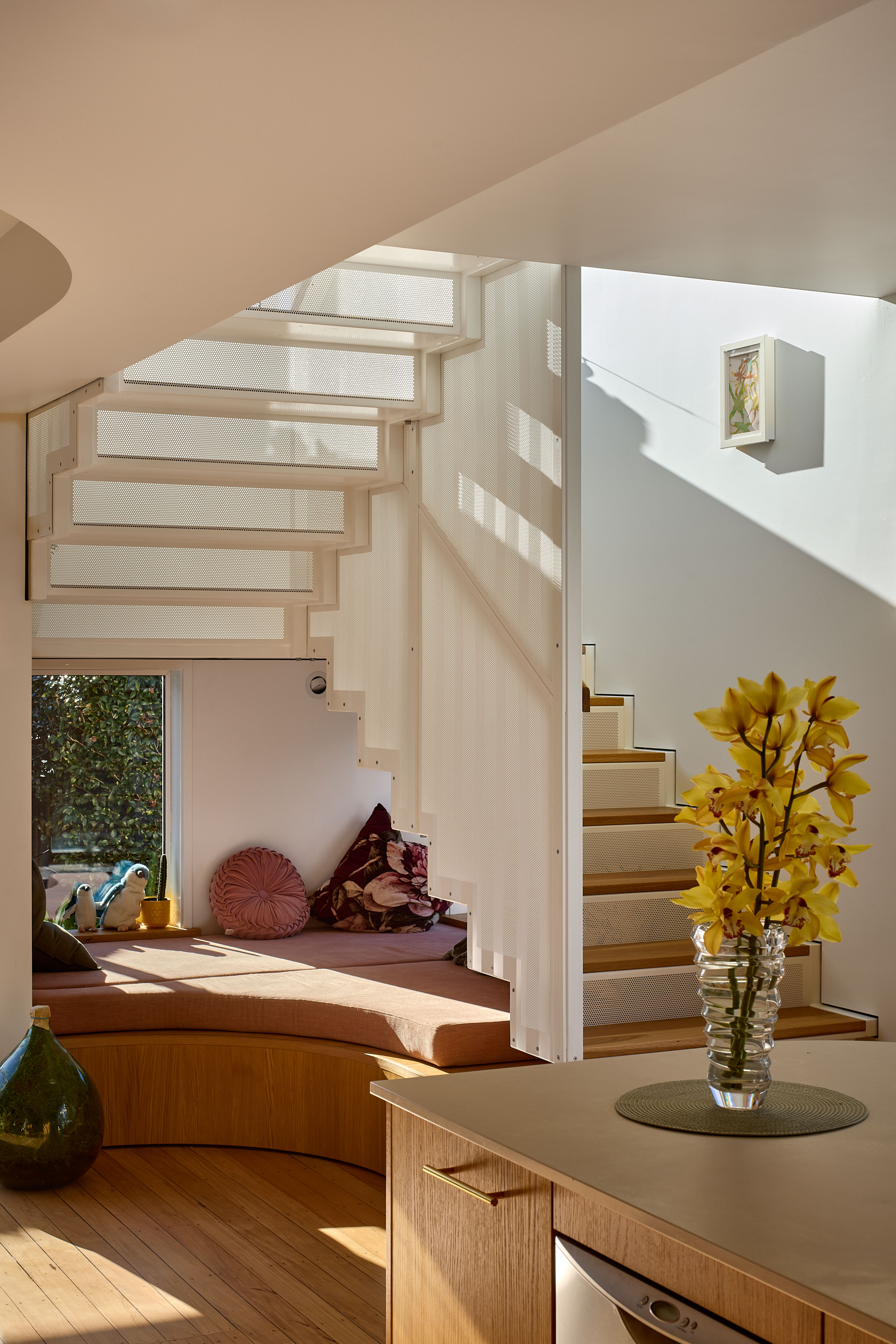 The project involved playfully transforming the communal spaces of a two-storey, 1940s Art Deco state house. The design emphasises outdoor connections and creates quiet, calming areas where the children can retreat while remaining close to family activities. Functional spaces are repositioned centrally, allowing the eastern and northern façades to open to park views and northern light, enhancing warmth and vibrancy within the home. A striking perforated steel hanging staircase located in a northeast lightwell channels filtered light into the kitchen and incorporates a protected reading nook underneath—a calming, sheltered space for the children that maintains their connection with the household. The client’s engineering background influenced key design features, such as the suspended staircase and exterior canopies, while material choices reflect the children’s needs—prioritising robust, tranquil finishes that offer a sense of durability and calmness