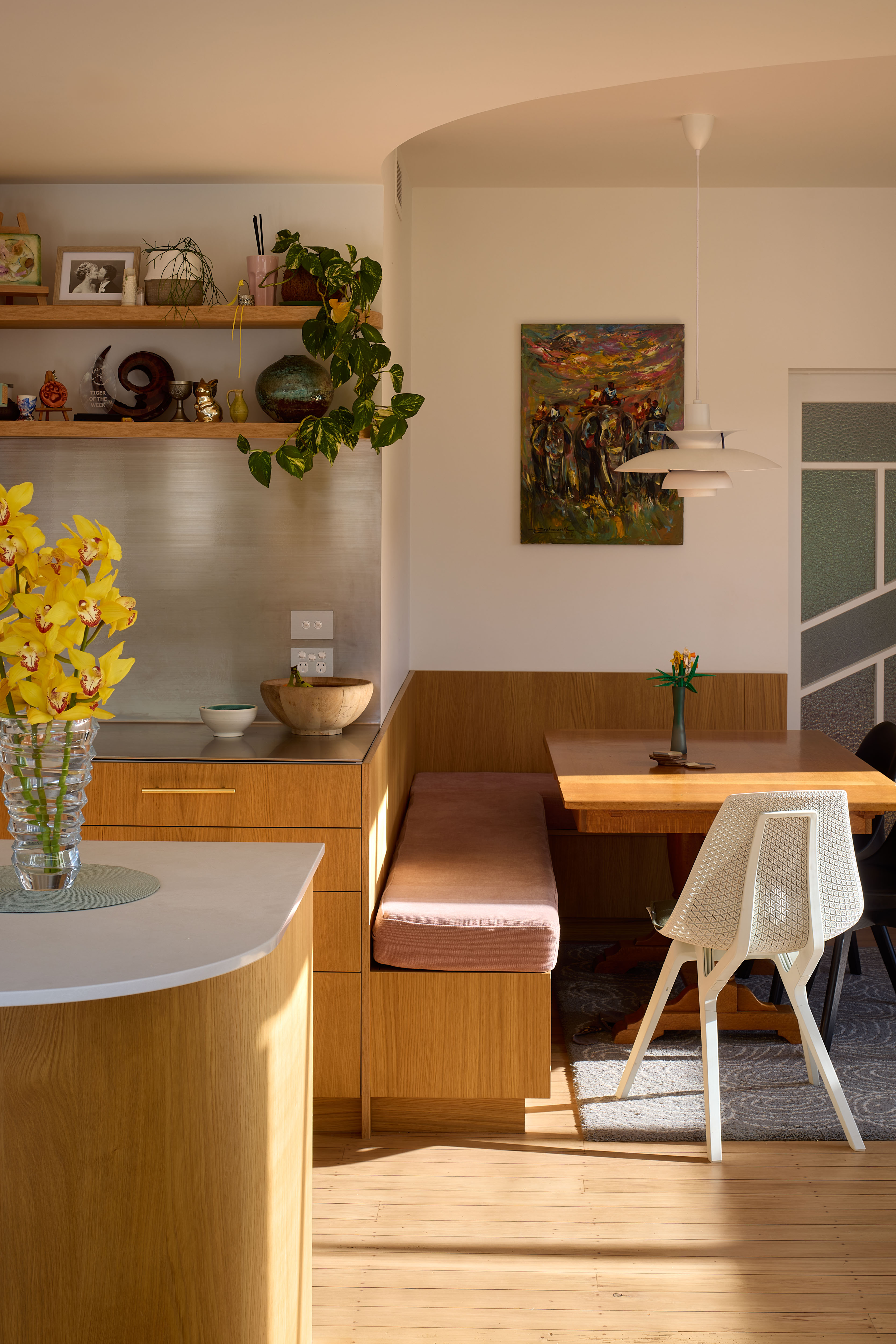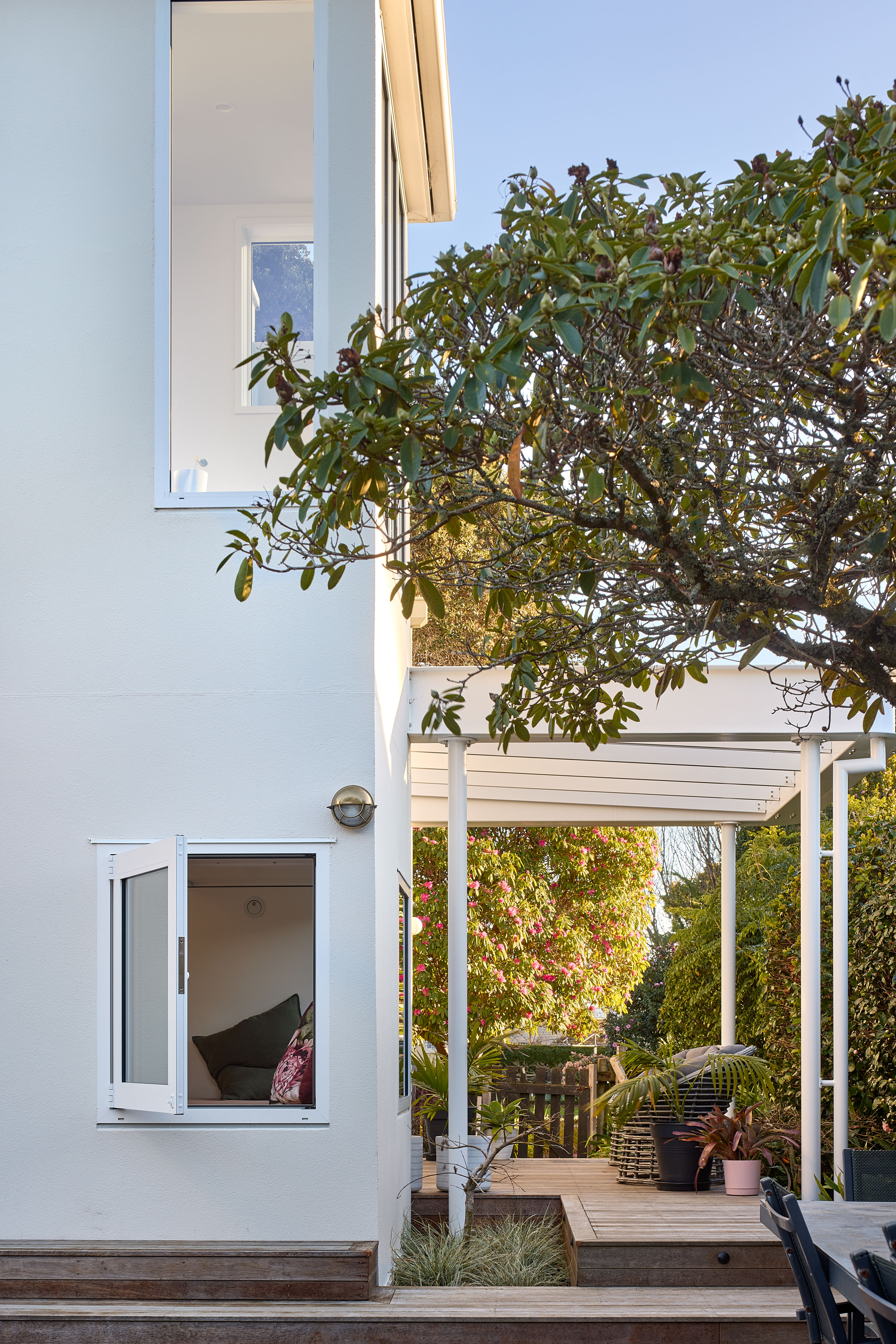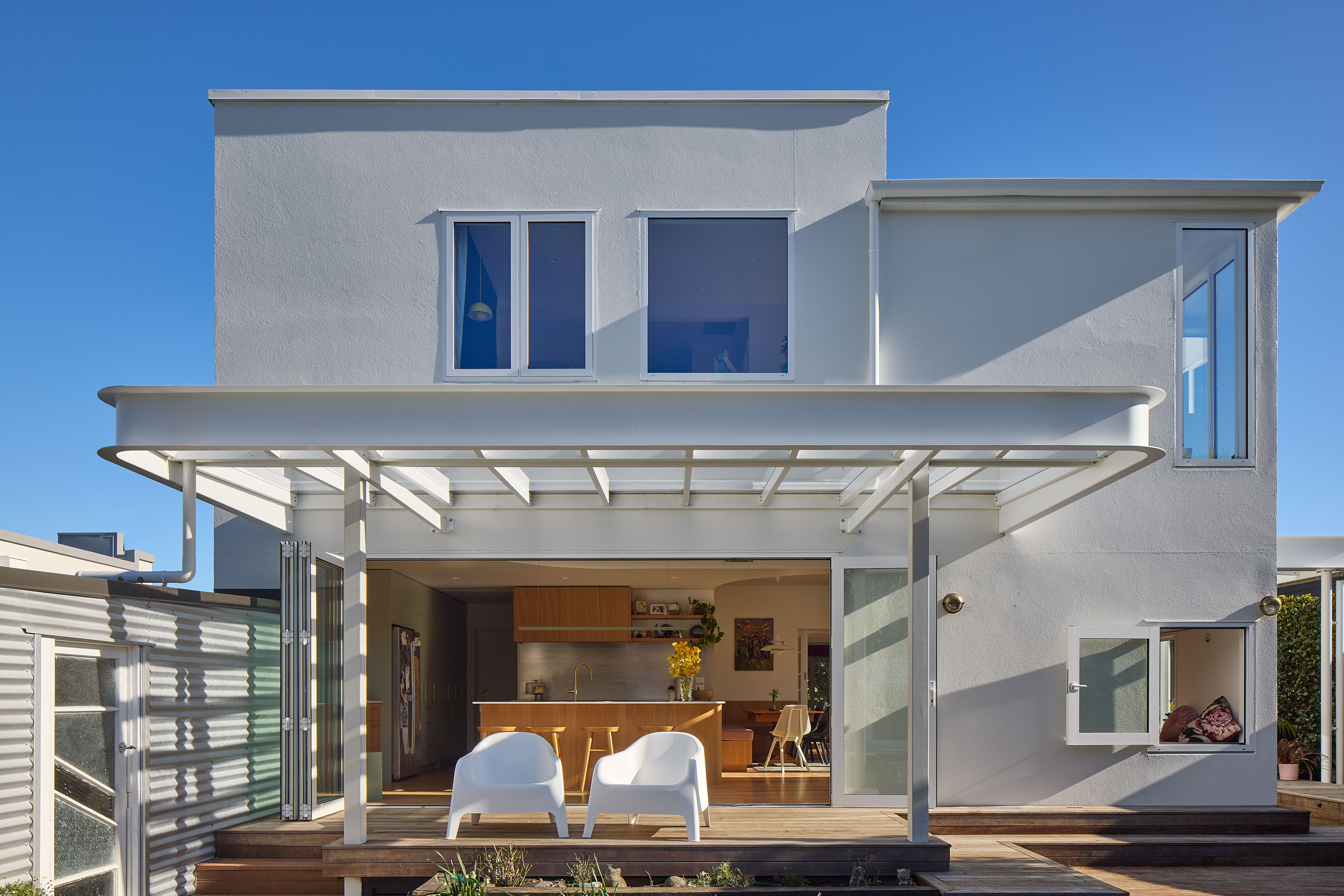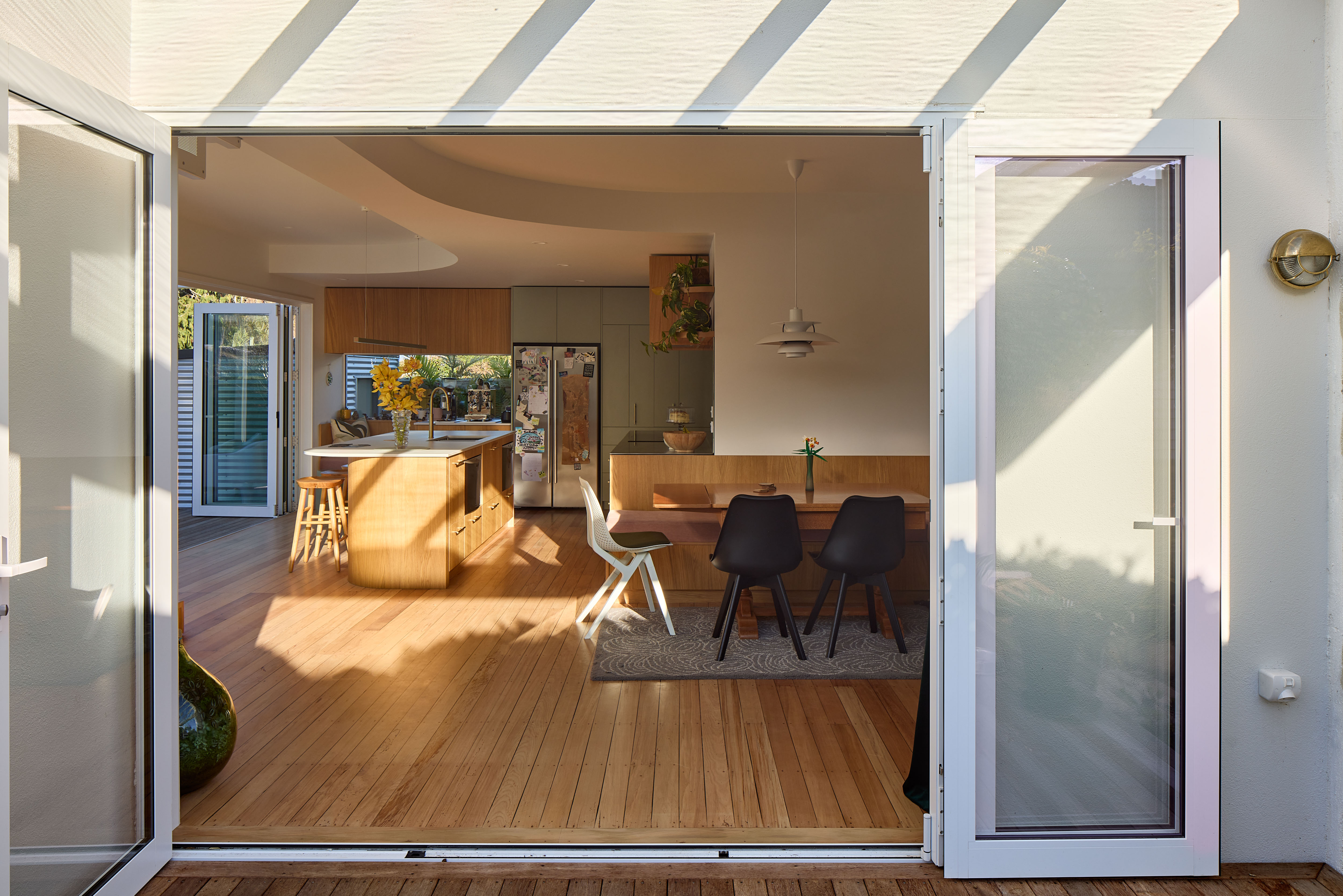 The project involved playfully transforming the communal spaces of a two-storey, 1940s Art Deco state house. The design emphasises outdoor connections and creates quiet, calming areas where the children can retreat while remaining close to family activities. Functional spaces are repositioned centrally, allowing the eastern and northern façades to open to park views and northern light, enhancing warmth and vibrancy within the home. A striking perforated steel hanging staircase located in a northeast lightwell channels filtered light into the kitchen and incorporates a protected reading nook underneath—a calming, sheltered space for the children that maintains their connection with the household. The client’s engineering background influenced key design features, such as the suspended staircase and exterior canopies, while material choices reflect the children’s needs—prioritising robust, tranquil finishes that offer a sense of durability and calmness