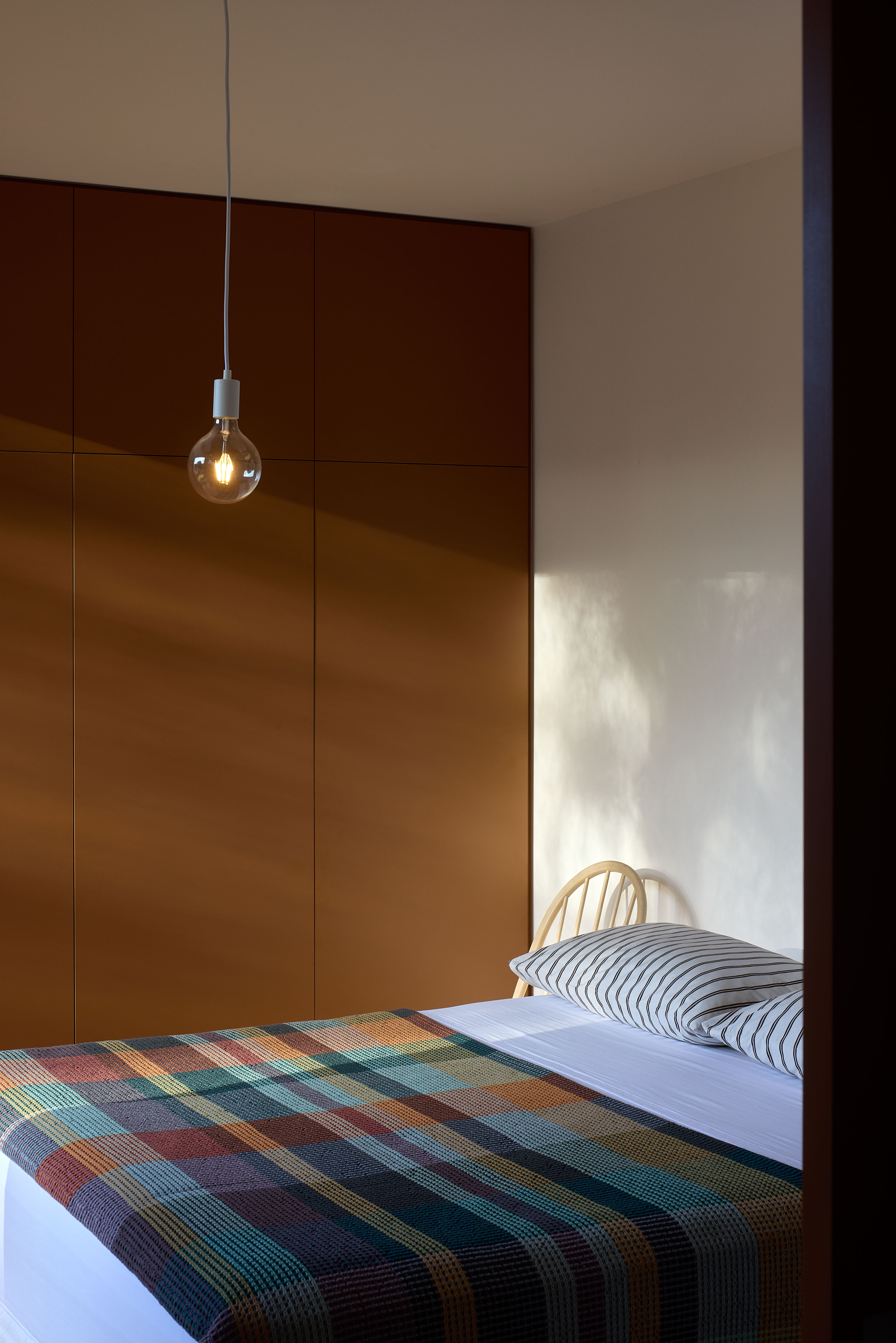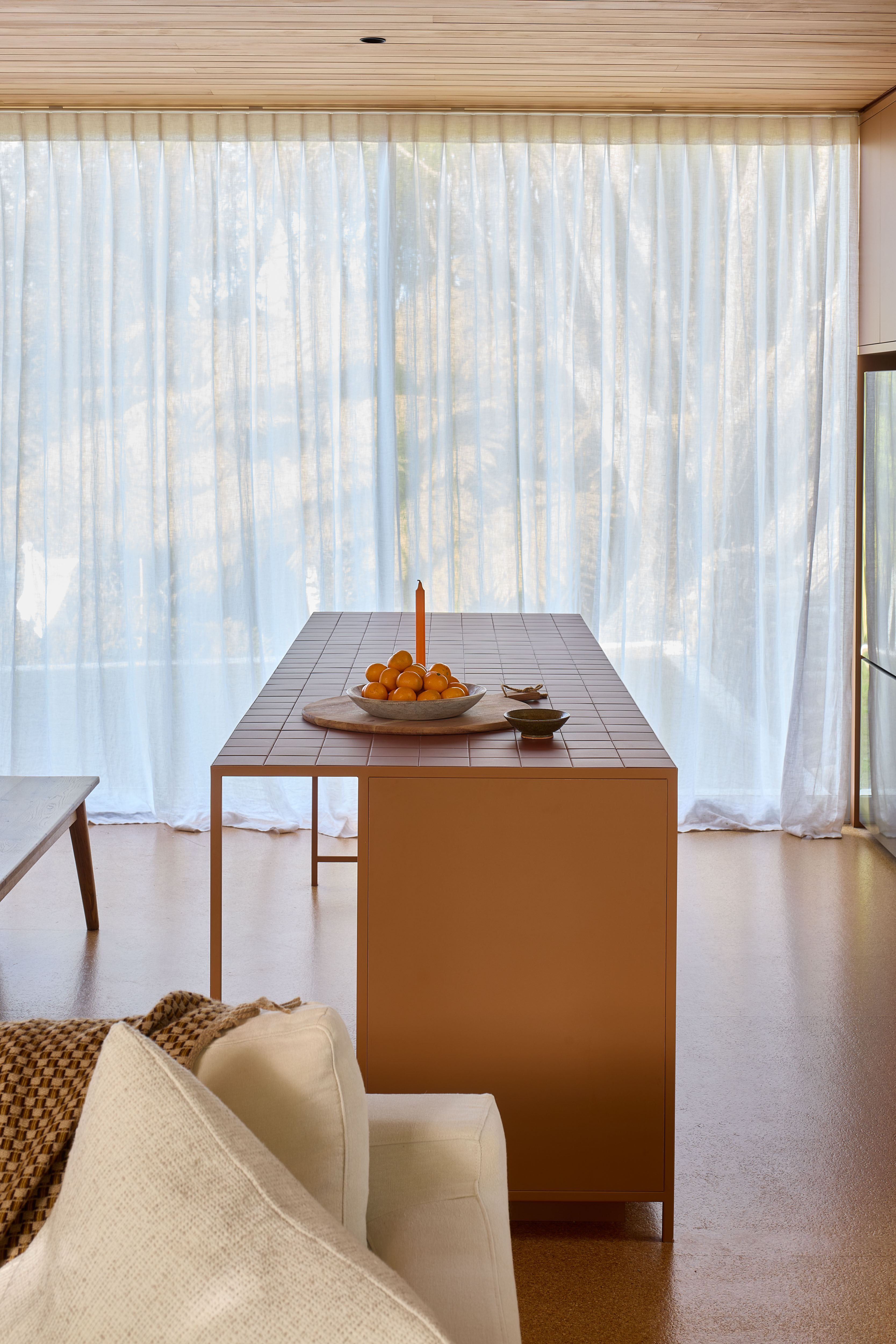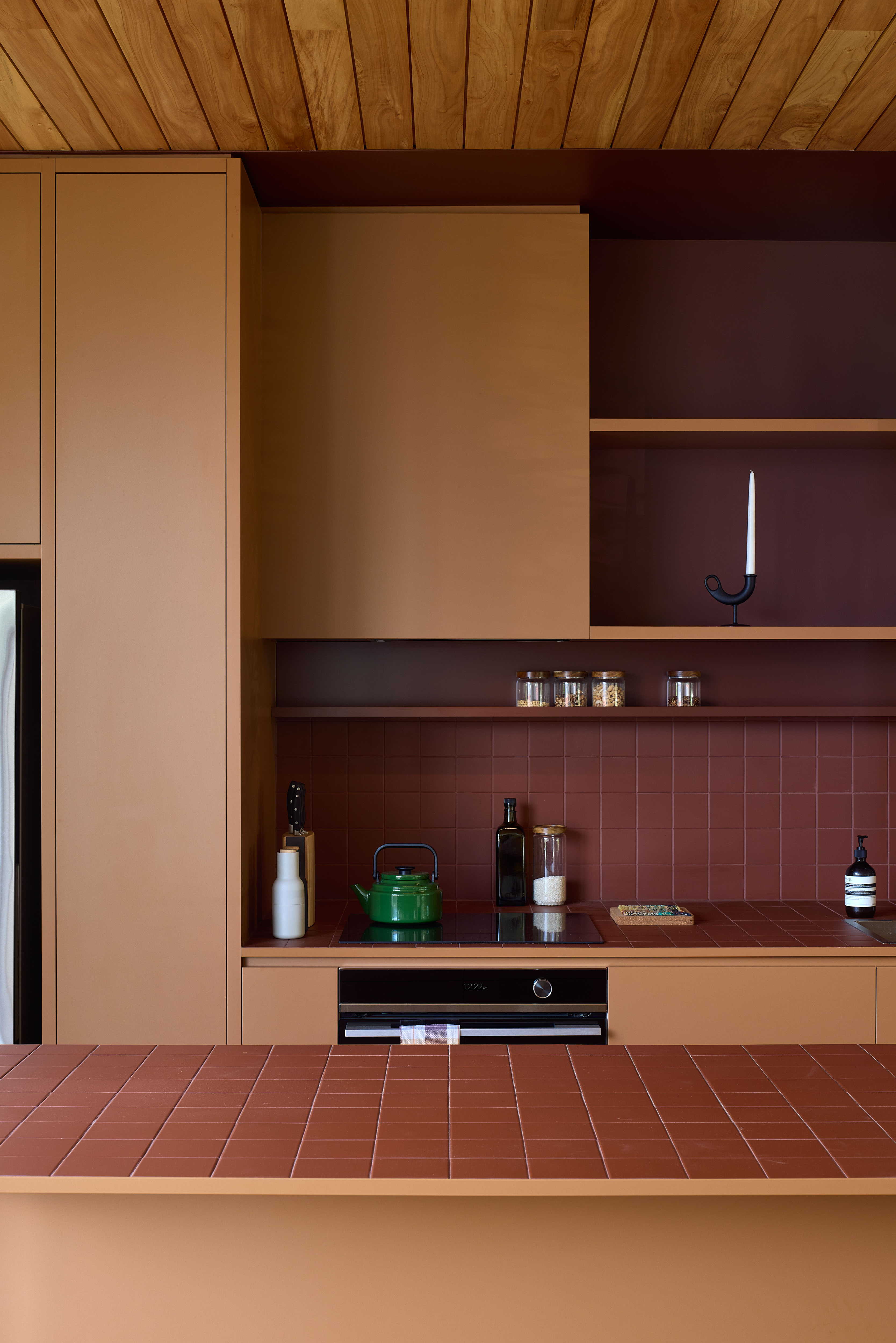 This modest home with its efficient rectangular plan floats above and reflects its bush-clad valley site. The architects’ inspired decision to exclude the car from the site means that the driveway is replaced with an entry bridge, a safe place to ride a bike and have a morning coffee. The garage becomes a 'bus stop' part way along the bridge, a storage space for bins and bikes. The use of full-height glazing extends the interior spaces out into the tree canopy. A square hallway fully bathed in natural light is a clever tool used to create a sense of generosity. Strong, earthy colours and simple materials such as cork and macrocarpa add richness and texture.