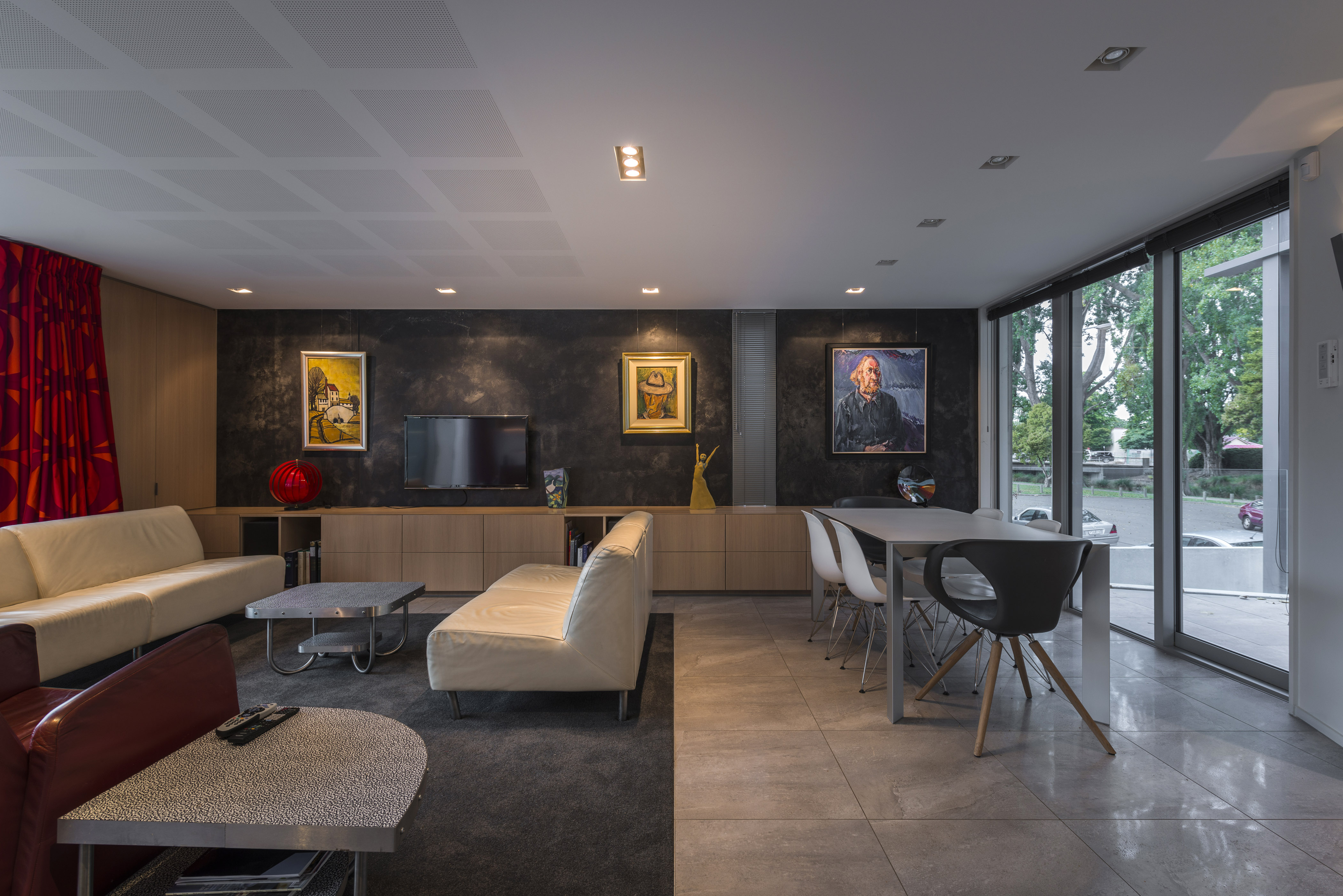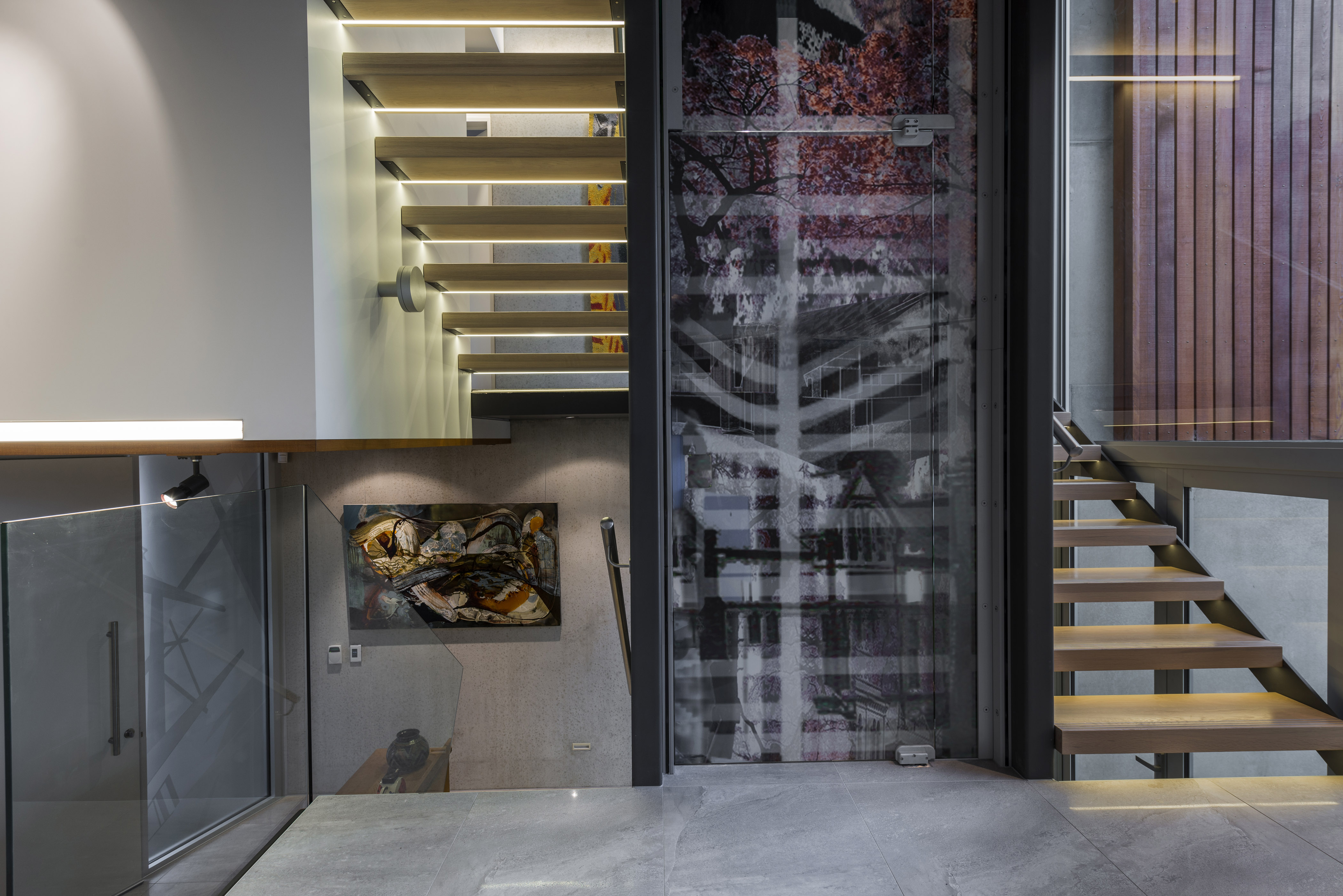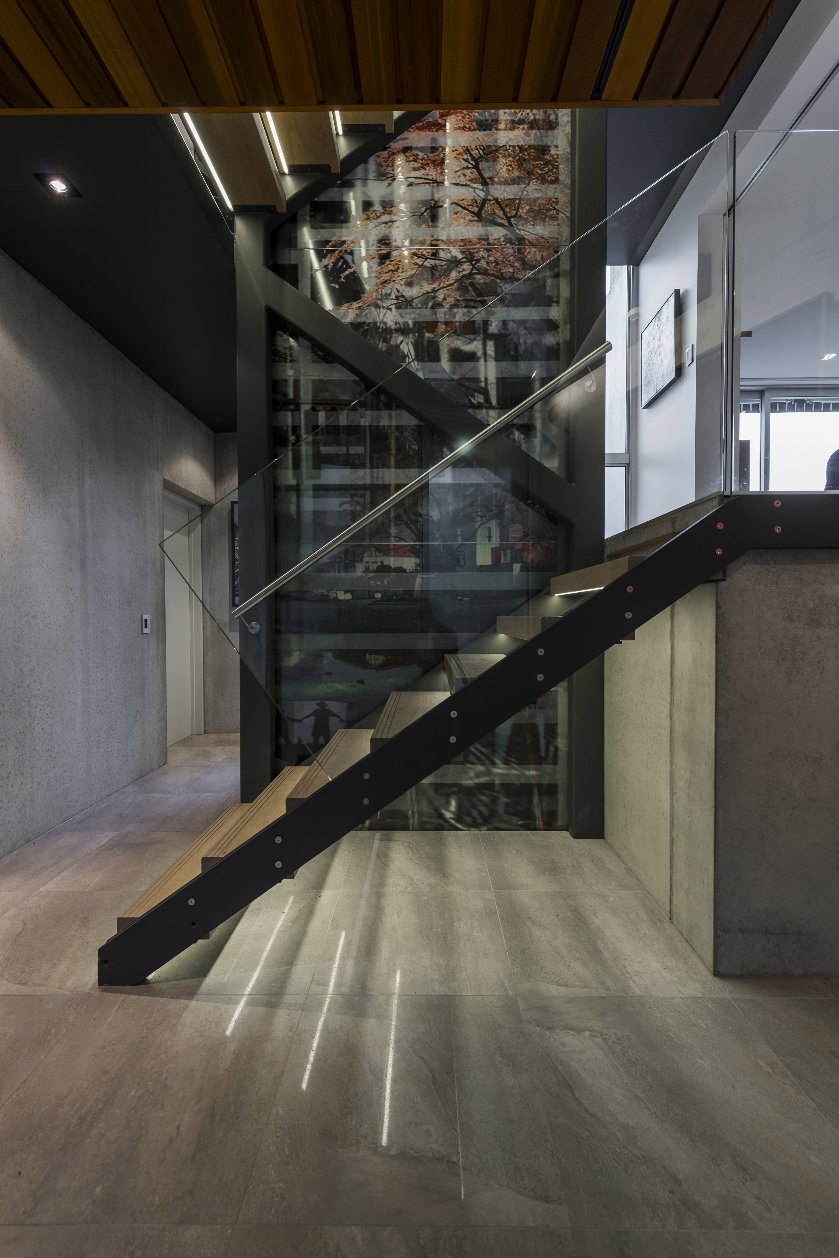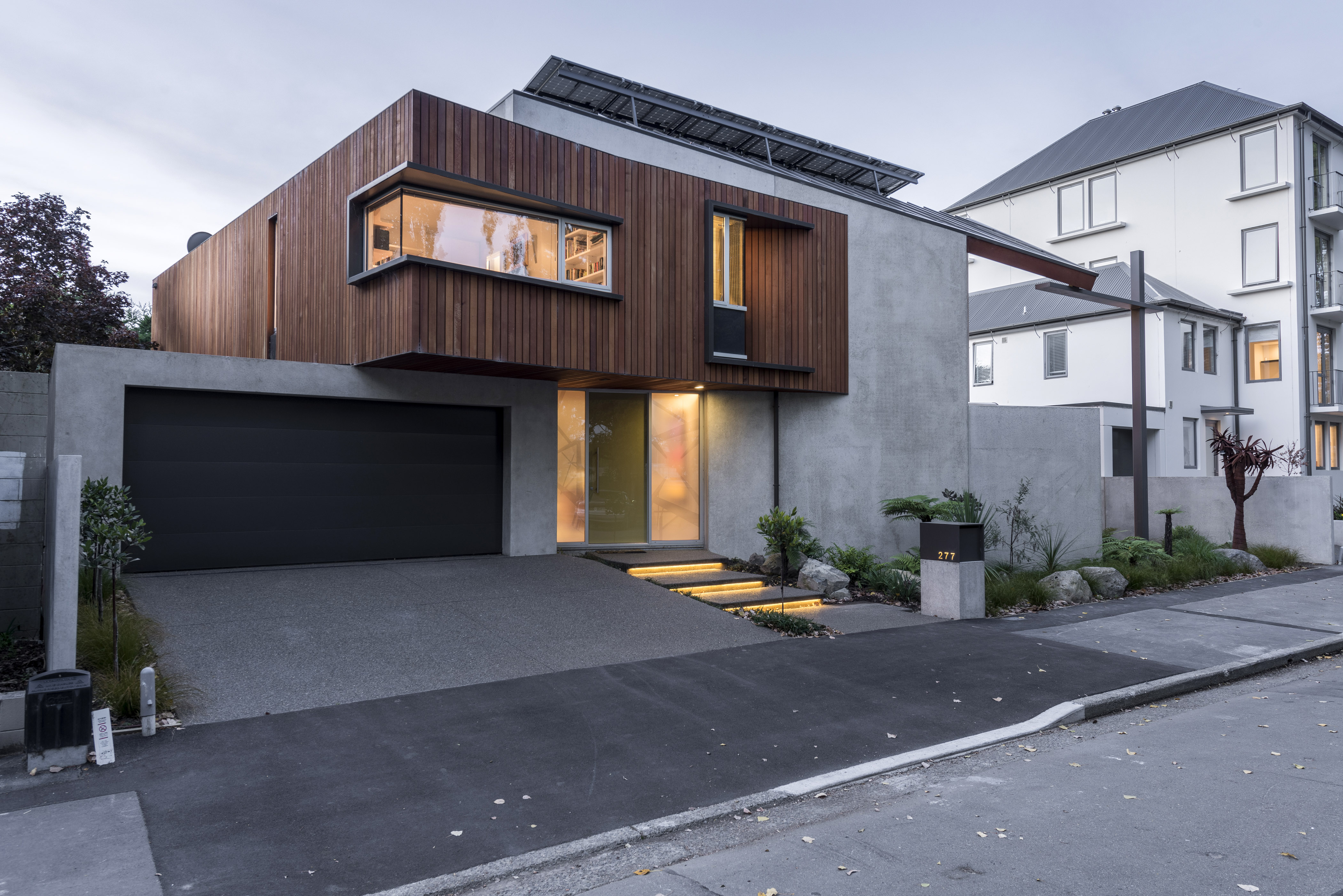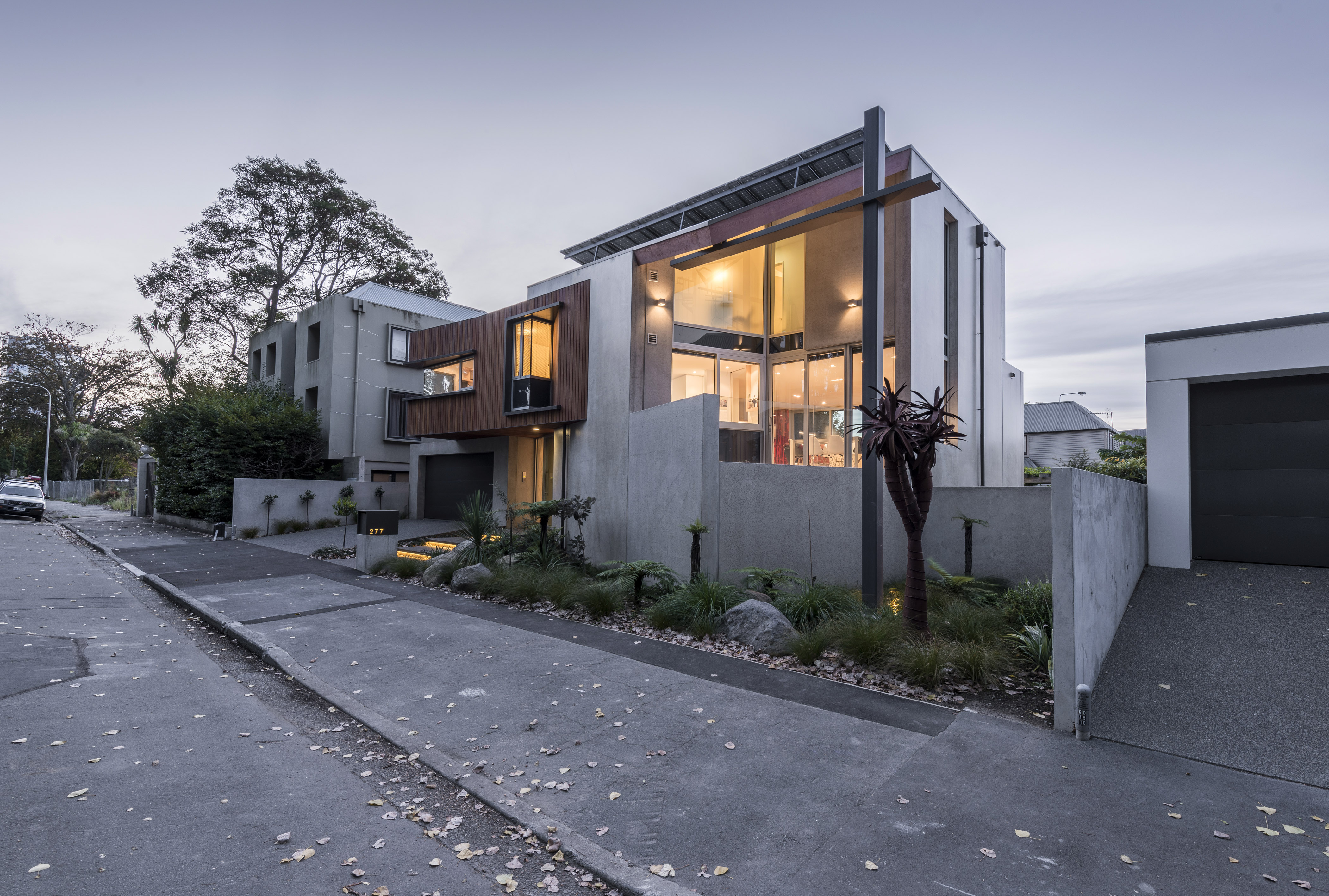 This house in the central city presents a strong sculptural form to the street and combines the client’s love of concrete with the warmth of timber cladding. At the rear, the house opens to a beautiful secluded garden. The smaller interior spaces, with their carefully considered openings to maintain privacy, are pleasant alternatives to the usual large open-plan spaces. A secret play space for the grandchildren and a serene family bathroom with steeply sloping ceiling and beautiful diffuse light are highlights. A ground-source heat recovery system and solar panels ensure that the long-term costs of running the house will be kept to a minimum. Rather than being hidden away, the solar panels are celebrated and contribute to the success of the street façade.