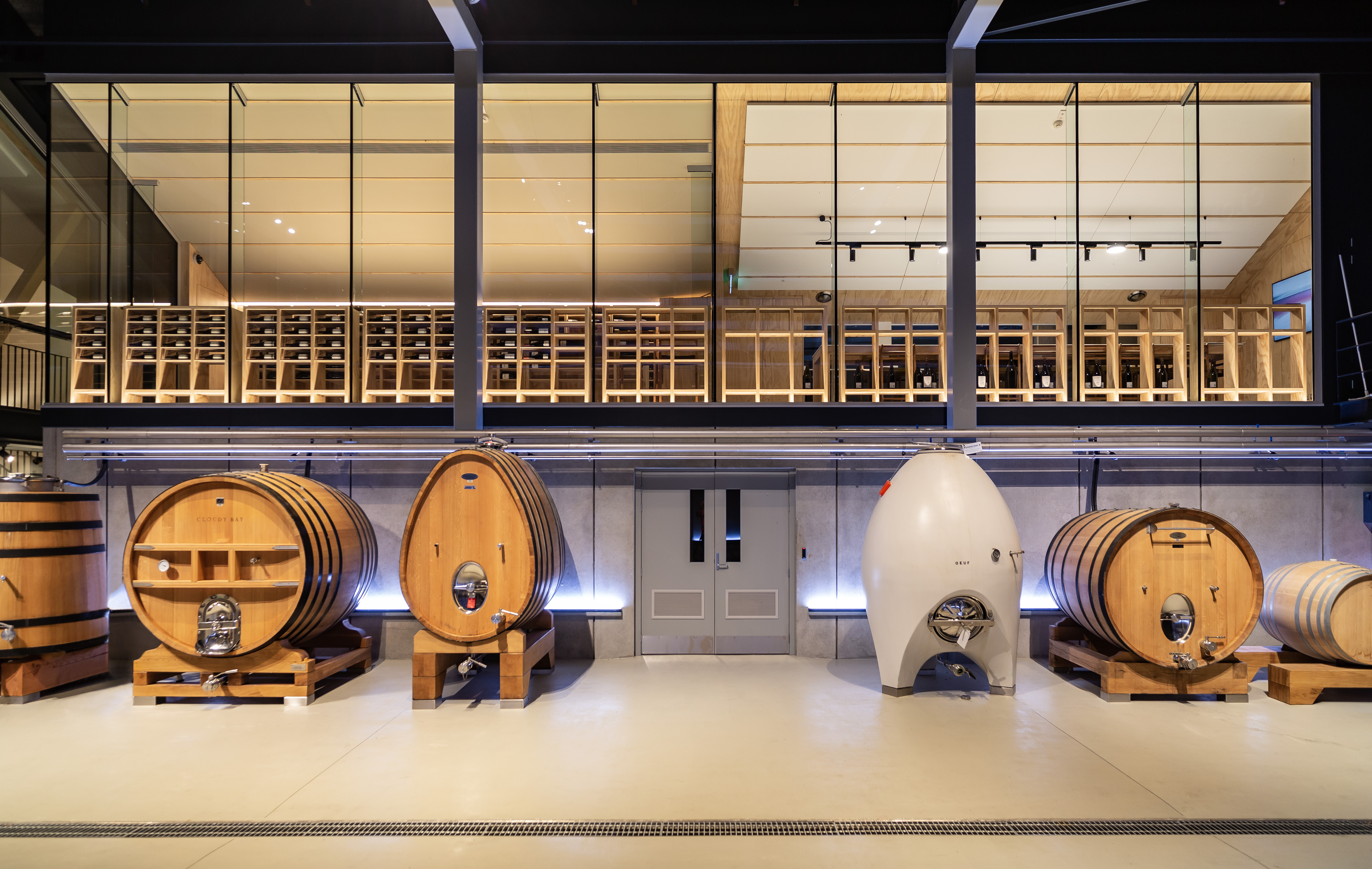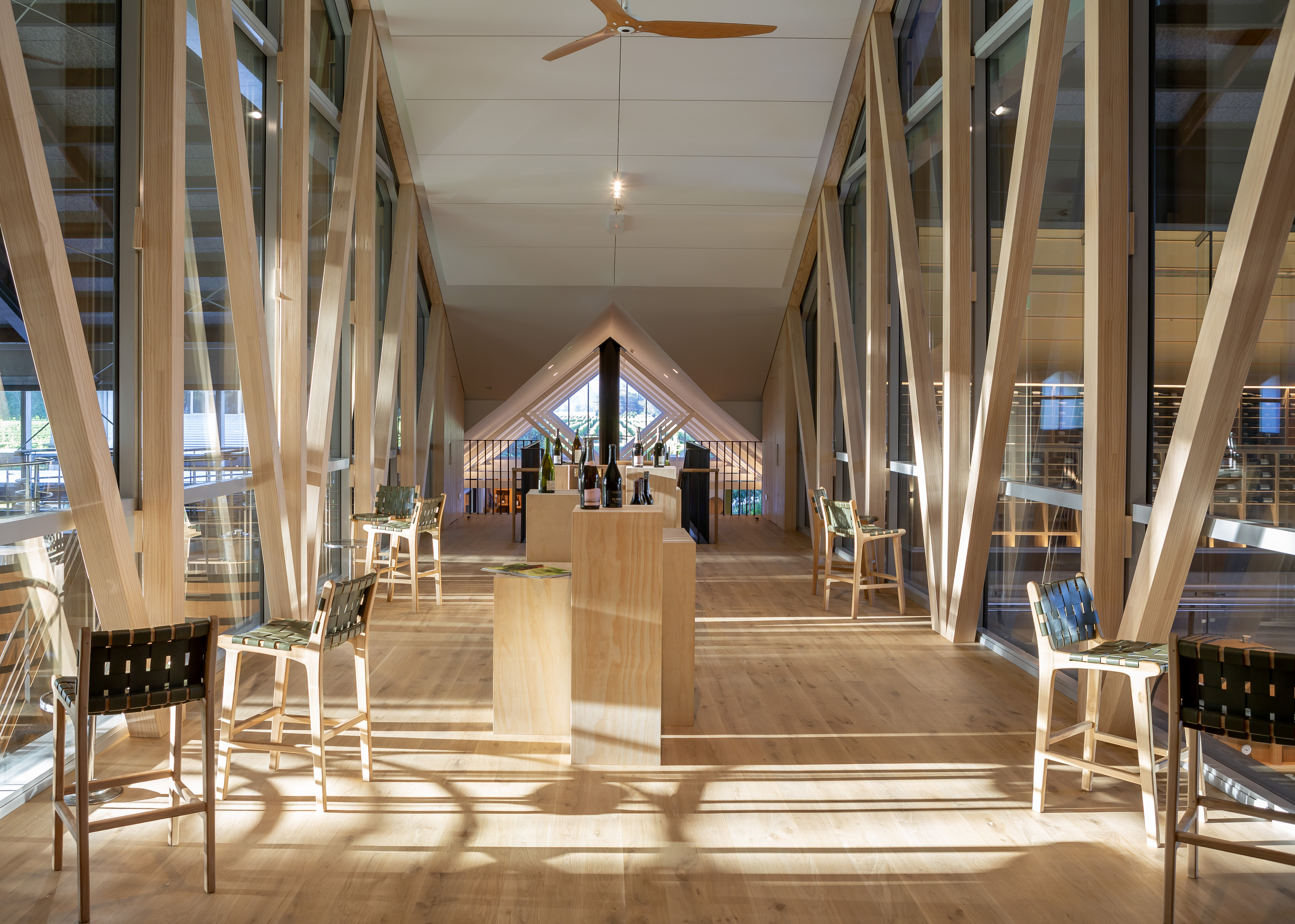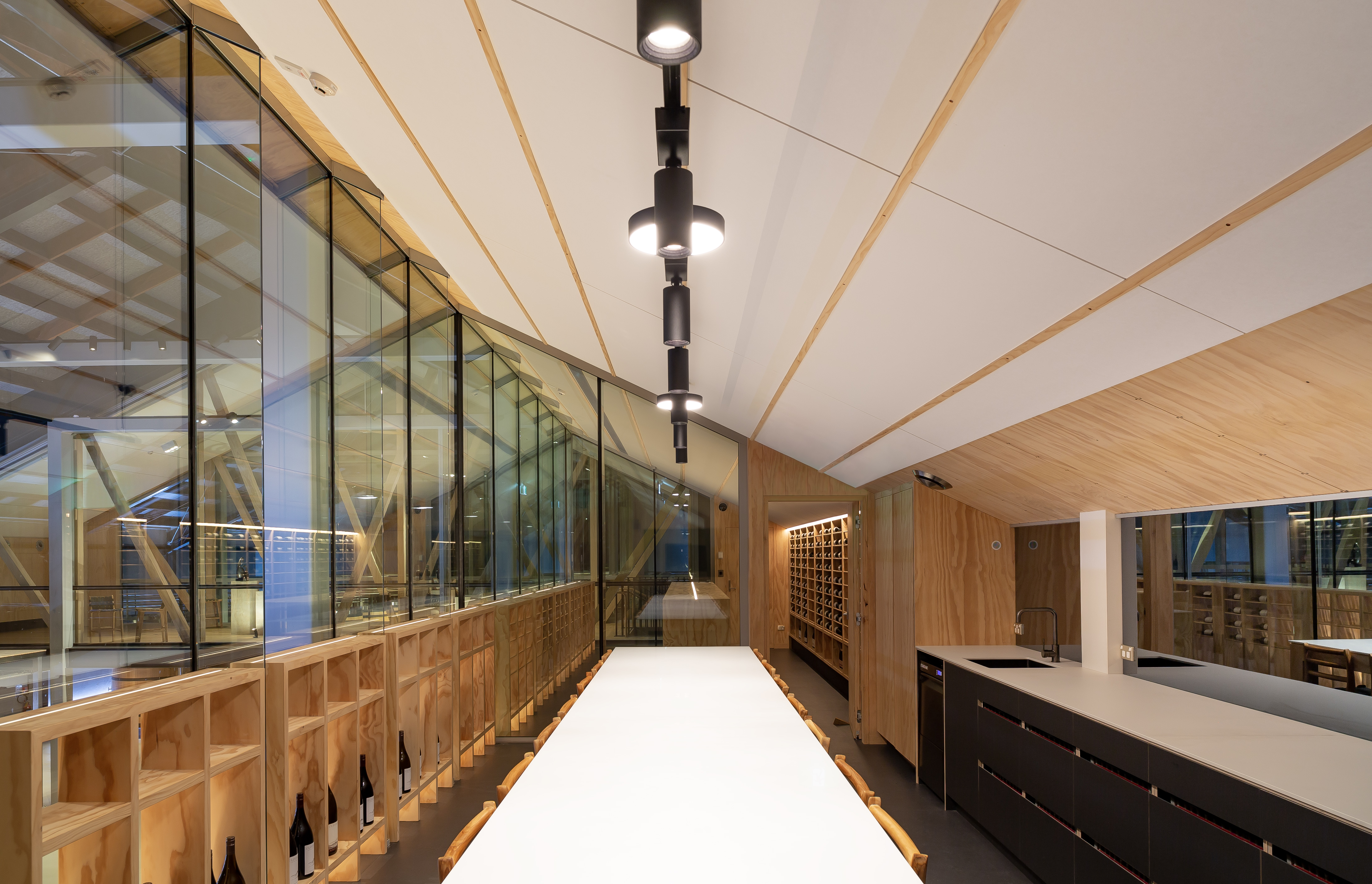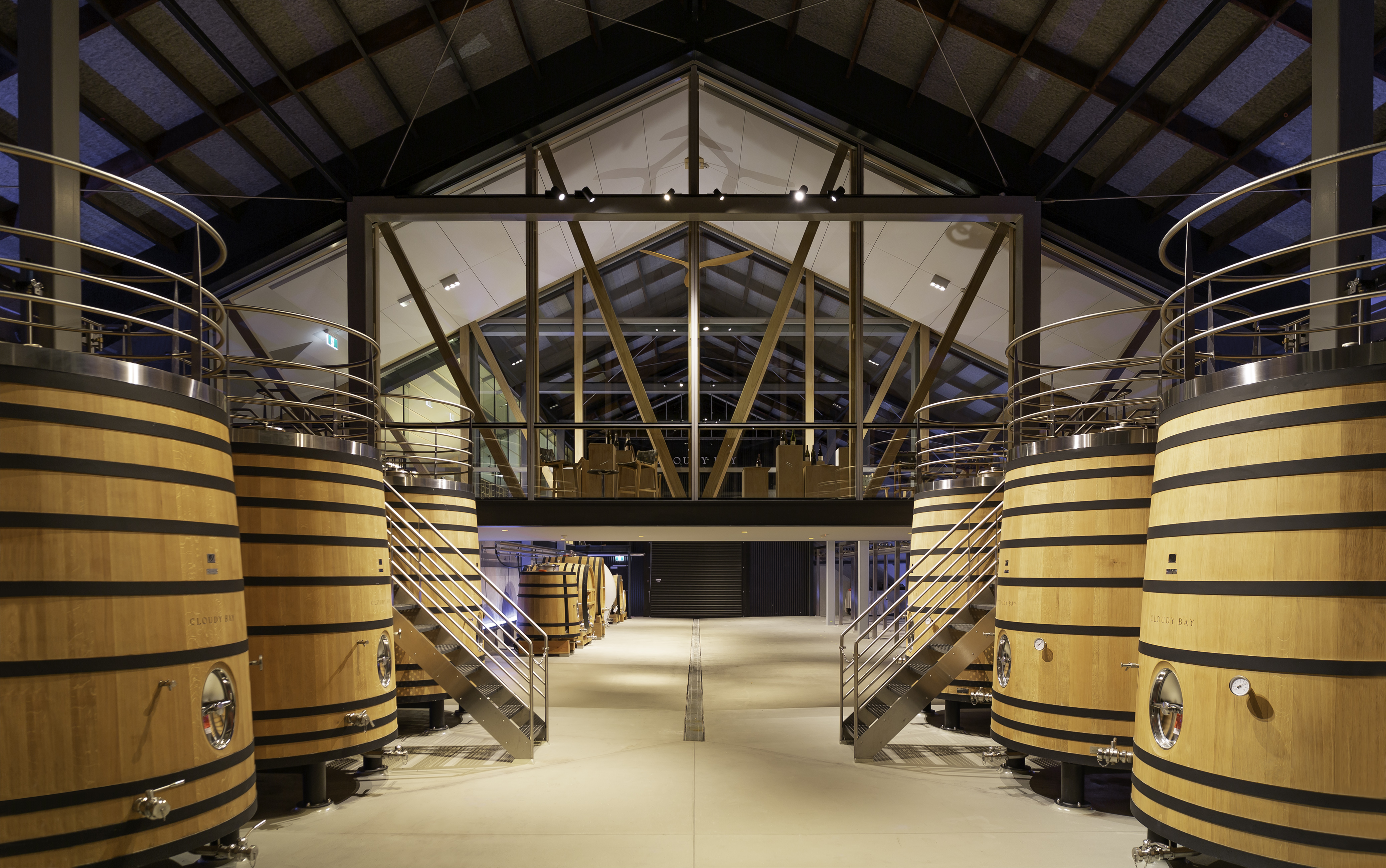 Cellar One represents a celebration of the winemaker's art, with process being evident as a design driver, giving insight into the nuances of wine production while expressing mechanics and equipment geometries. Teamwork between architect, engineer, contractor and winemaker is obvious in the clever insertion of the glass viewing pod suspended over the production hall in a re-purposed agricultural space. The adjacent tasting galleries are artfully crafted to display the finished product. Structural interventions are clearly expressed and give new life and light to an otherwise rigid concrete shell. Finely crafted timber joinery adds to the refined detailing.