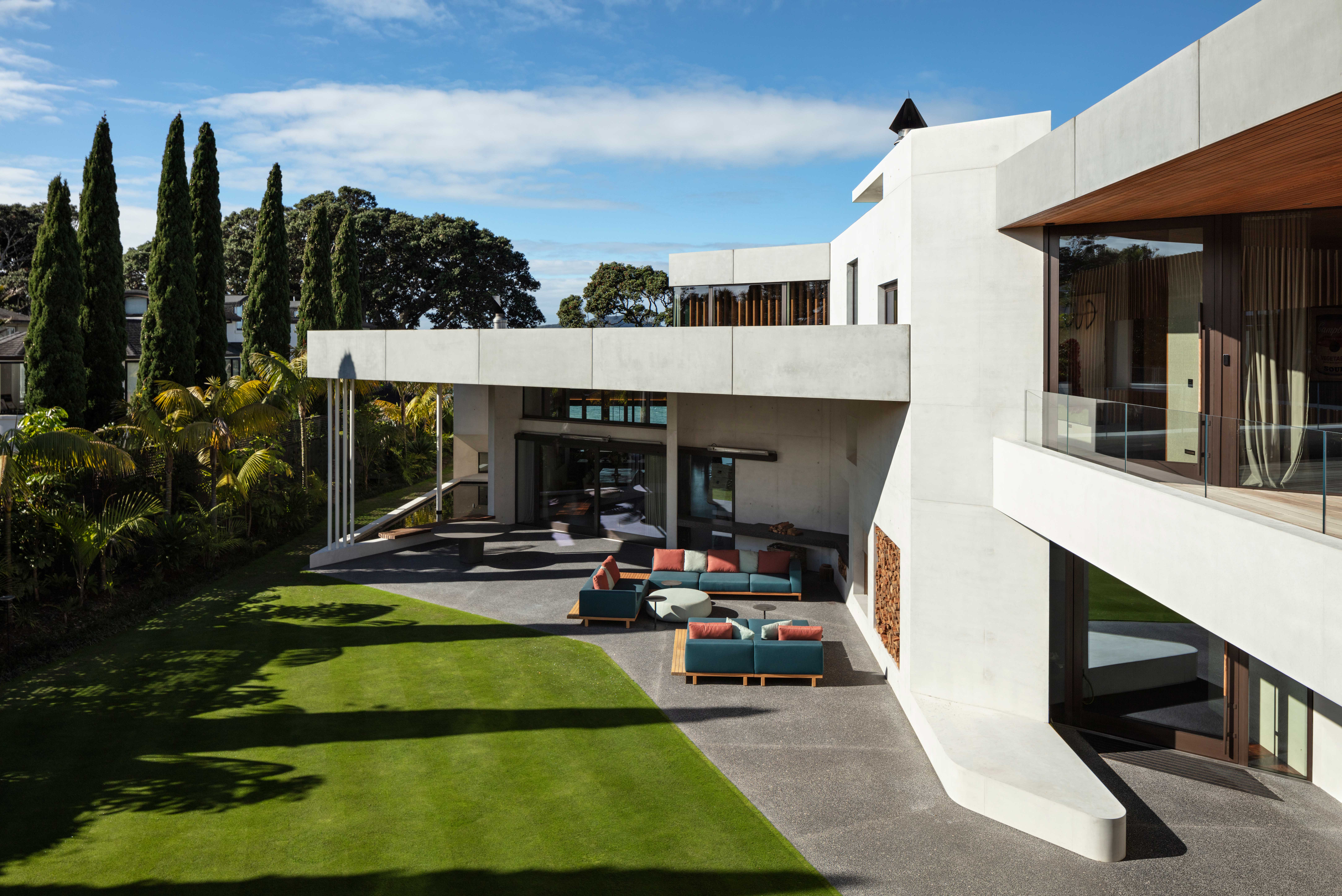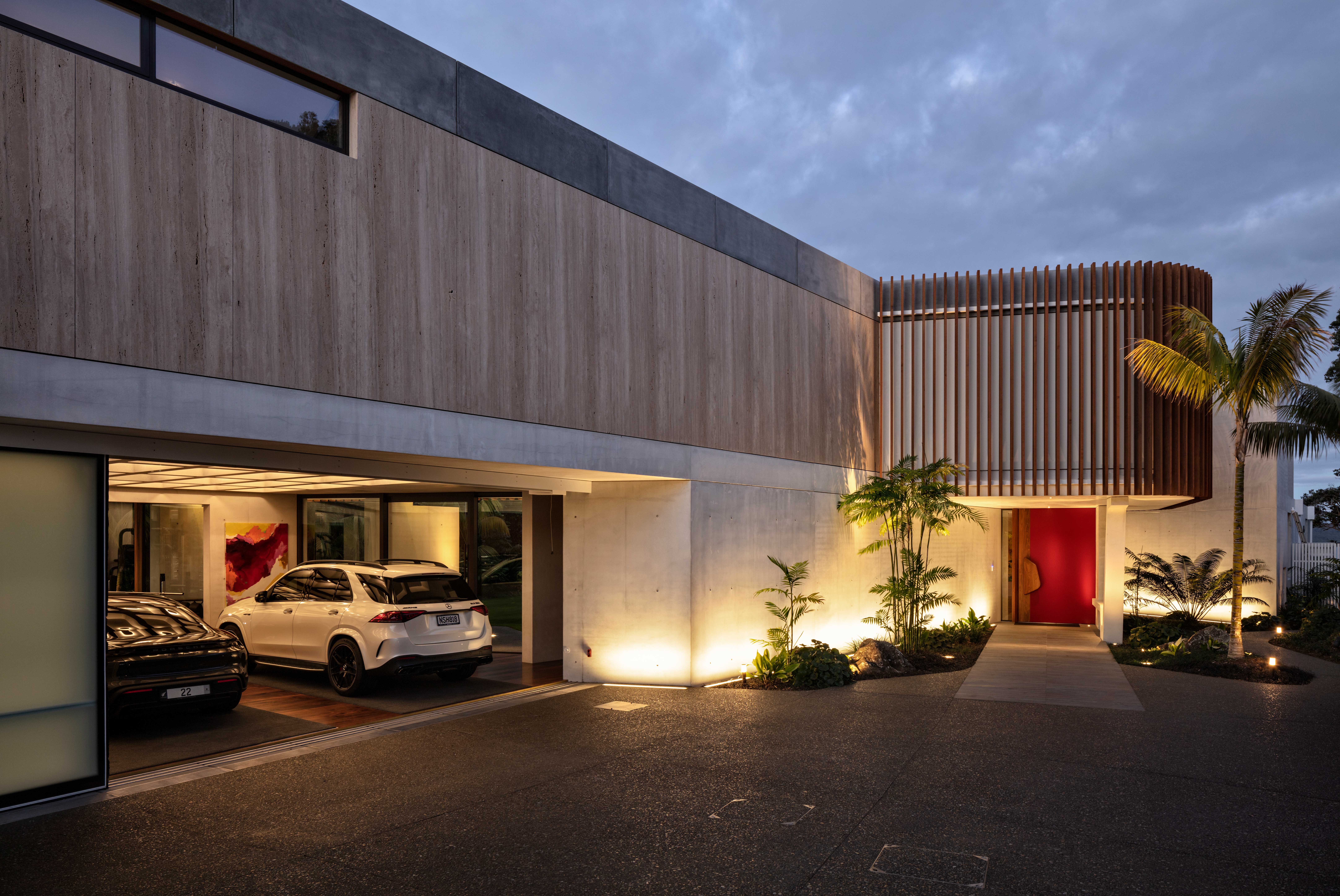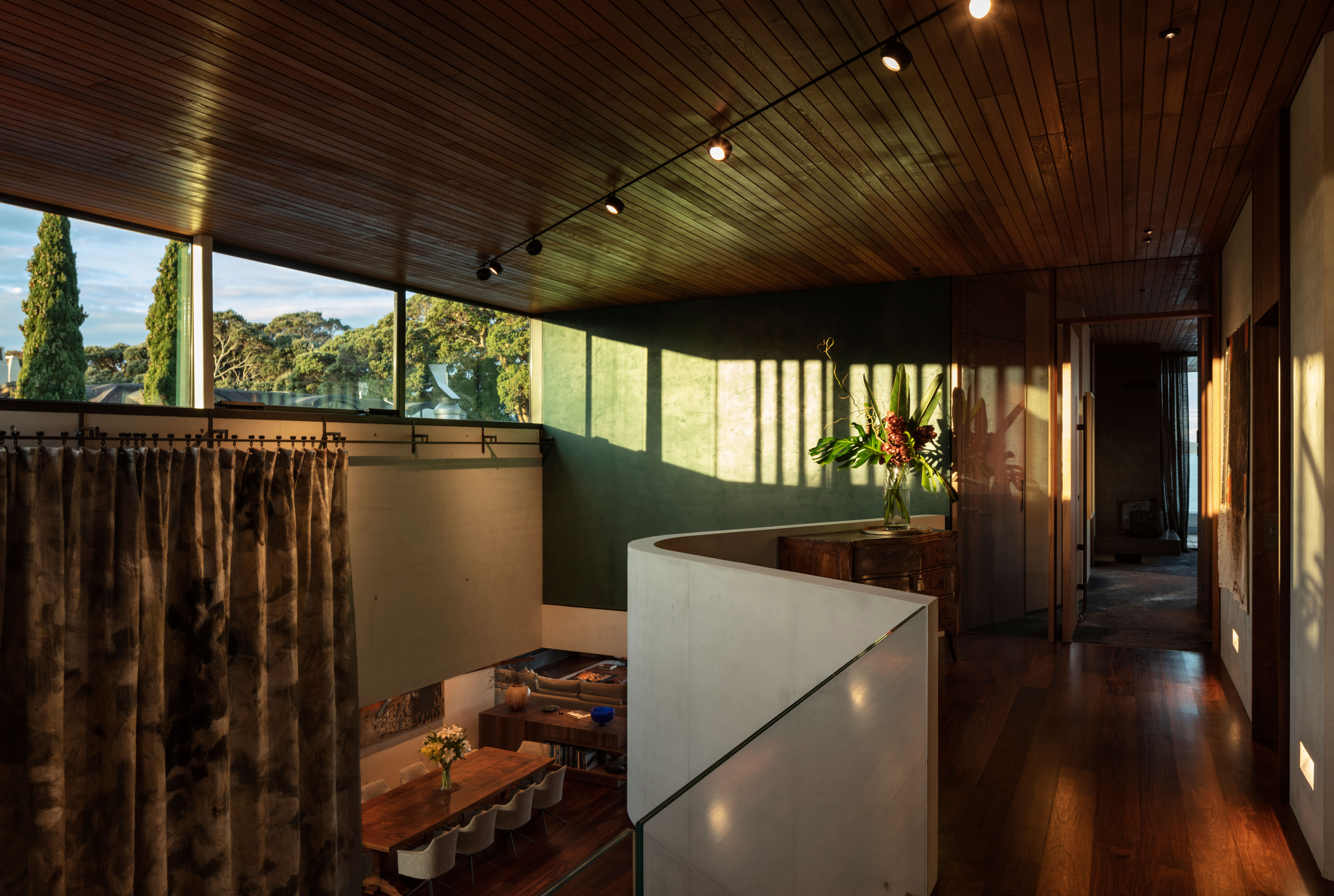 This generously proportioned home impressively combines the functions of an extended family dwelling and backdrop for the client’s significant body of art. Set into a coastal edge facing Rangitoto Island, the house is formed by two distinct wings with a large central garden allowing light into the space edging it. Timber screens weave their way around the house and through the spaces countering and softening its otherwise harder precast concrete forms. Despite the dramatic scale of many of its spaces and the richness of the geometries shaping them, the house nevertheless cleverly retains the feeling and possibilities of a family home.