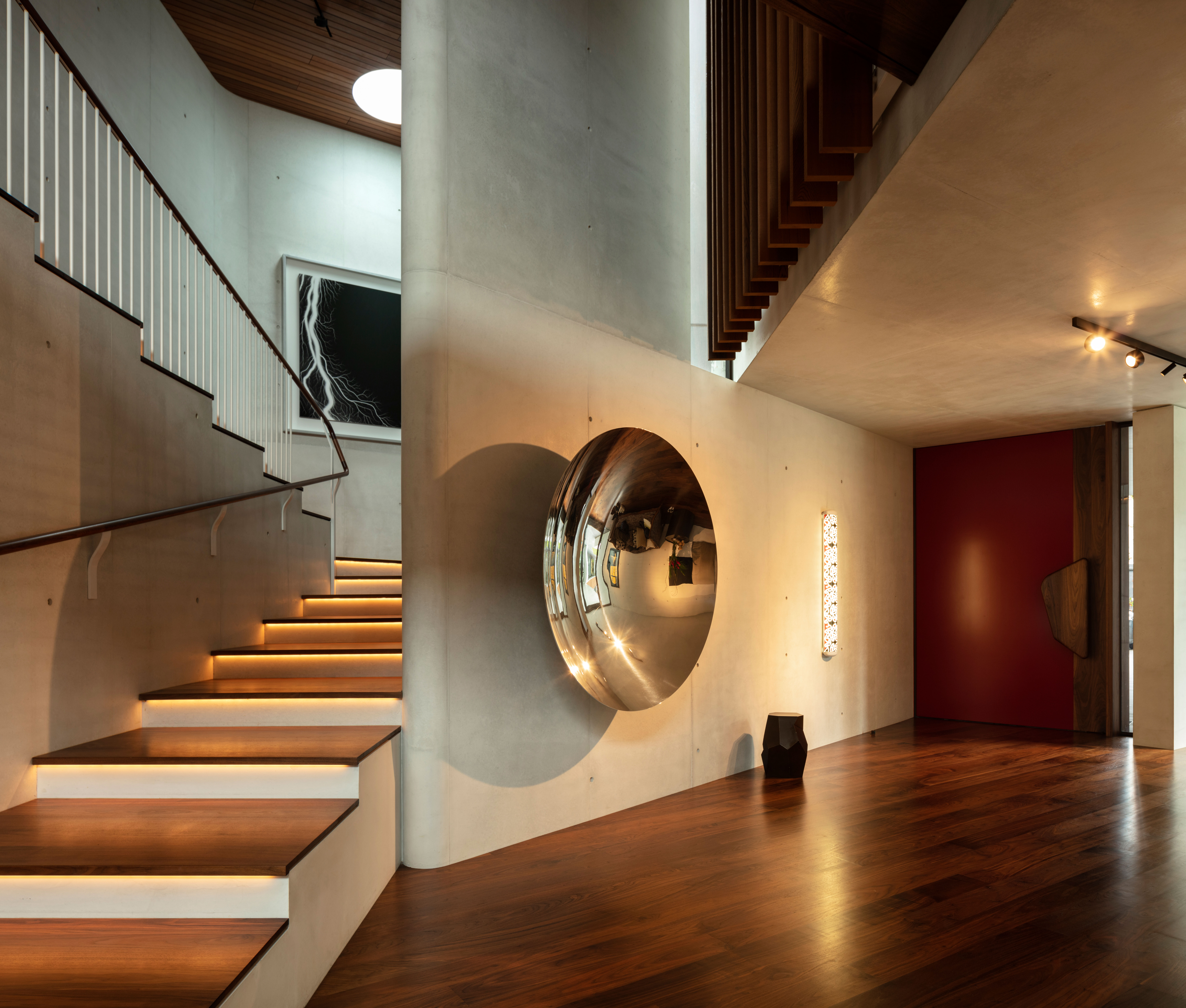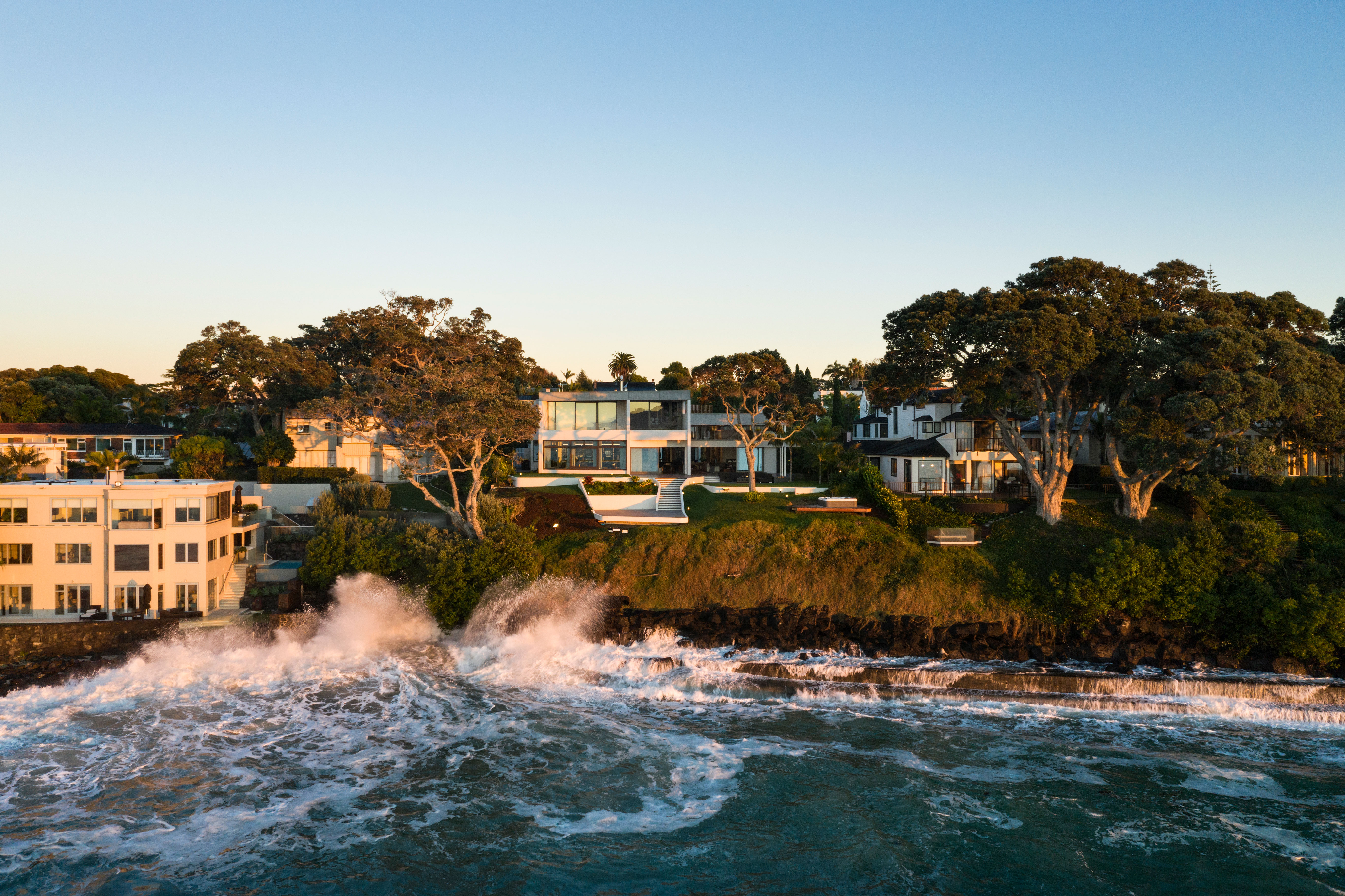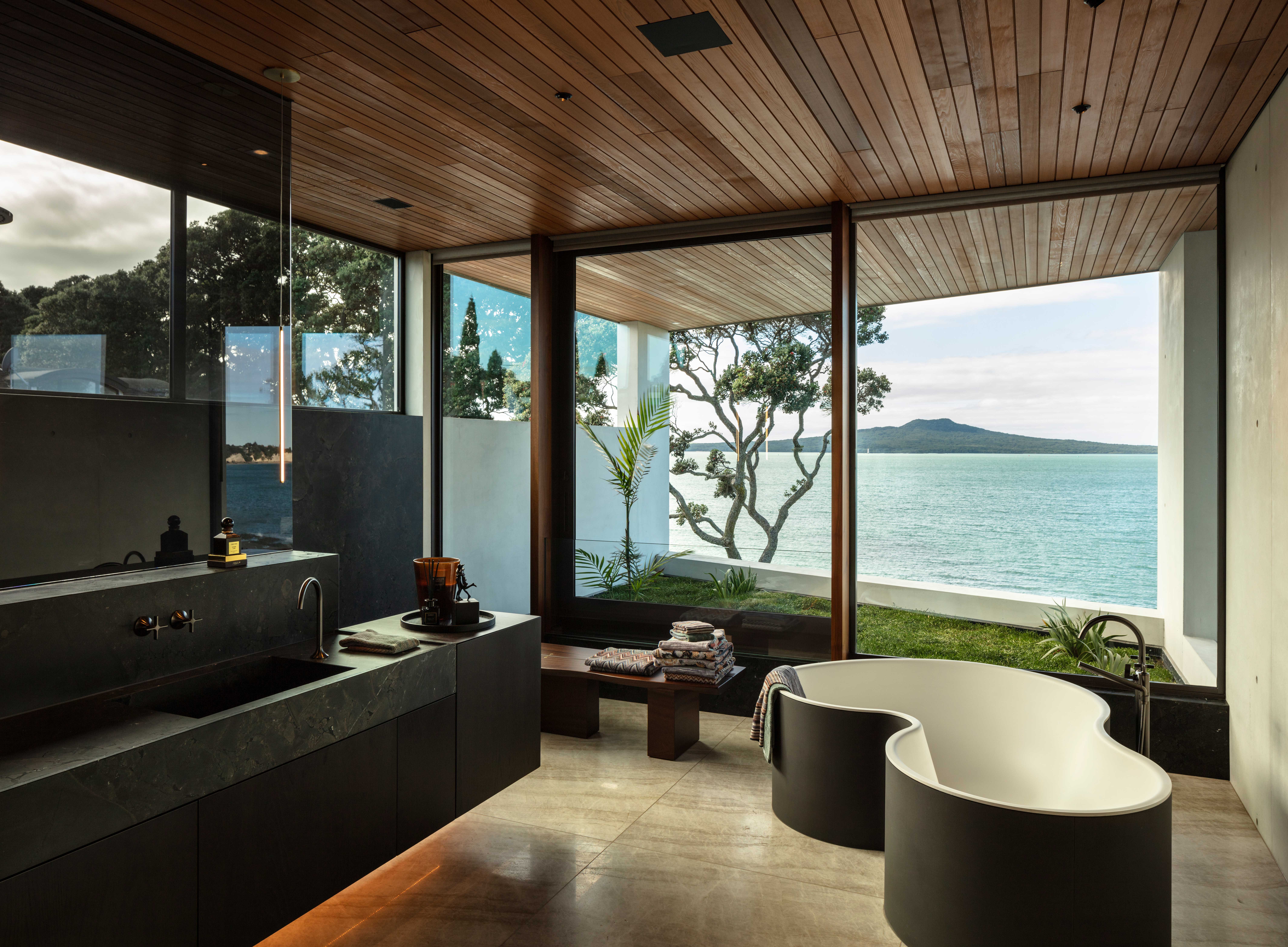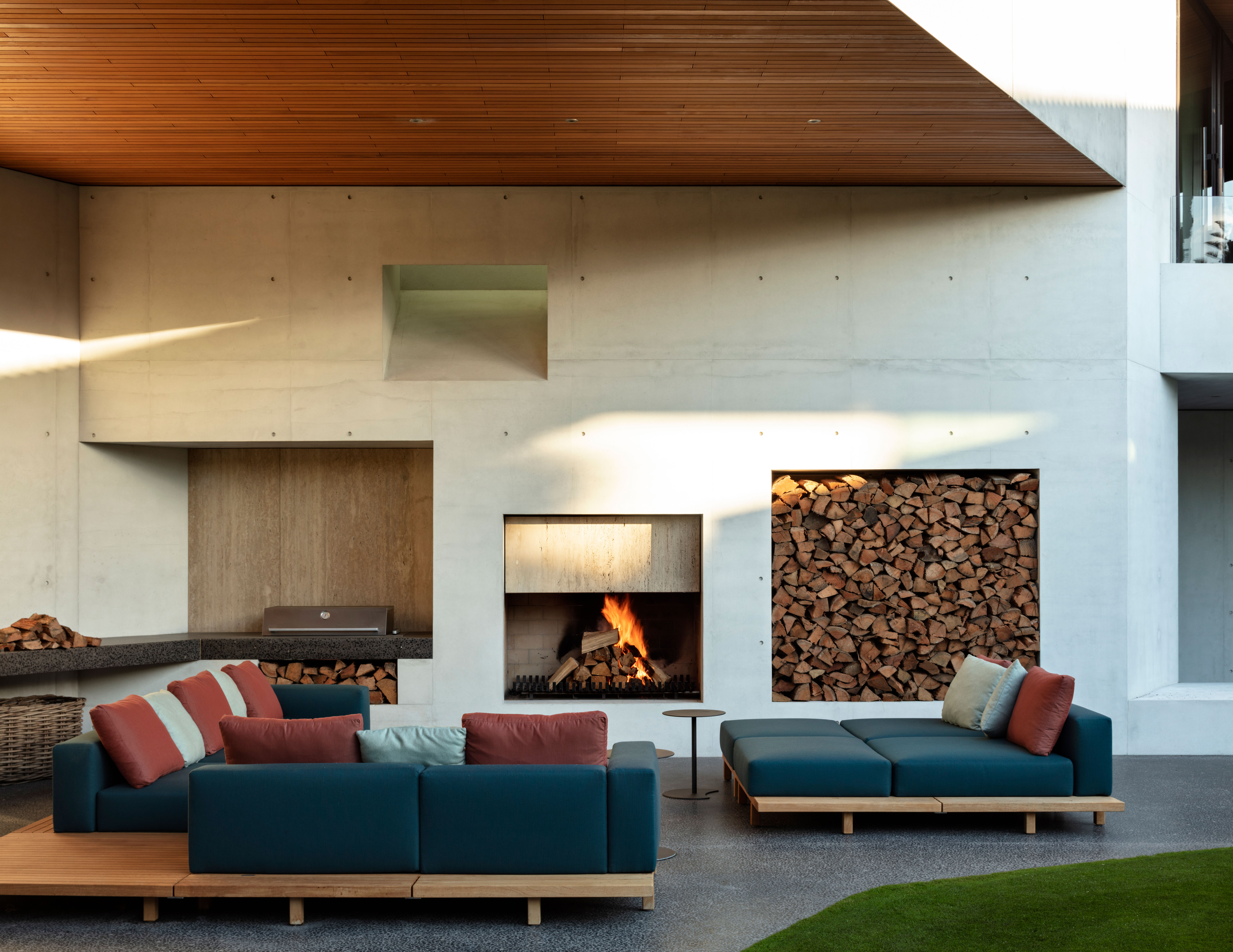 This generously proportioned home impressively combines the functions of an extended family dwelling and backdrop for the client’s significant body of art. Set into a coastal edge facing Rangitoto Island, the house is formed by two distinct wings with a large central garden allowing light into the space edging it. Timber screens weave their way around the house and through the spaces countering and softening its otherwise harder precast concrete forms. Despite the dramatic scale of many of its spaces and the richness of the geometries shaping them, the house nevertheless cleverly retains the feeling and possibilities of a family home.
