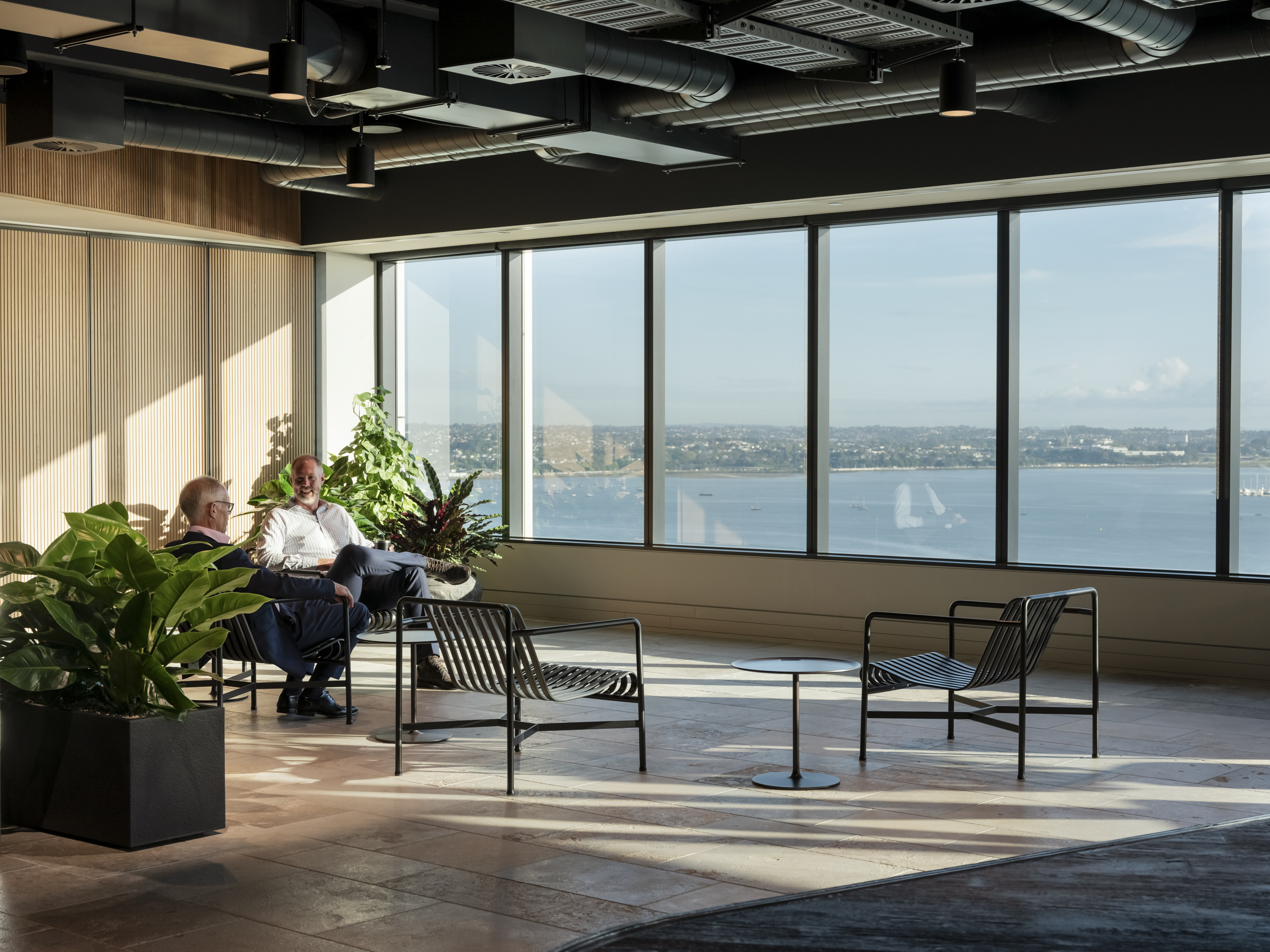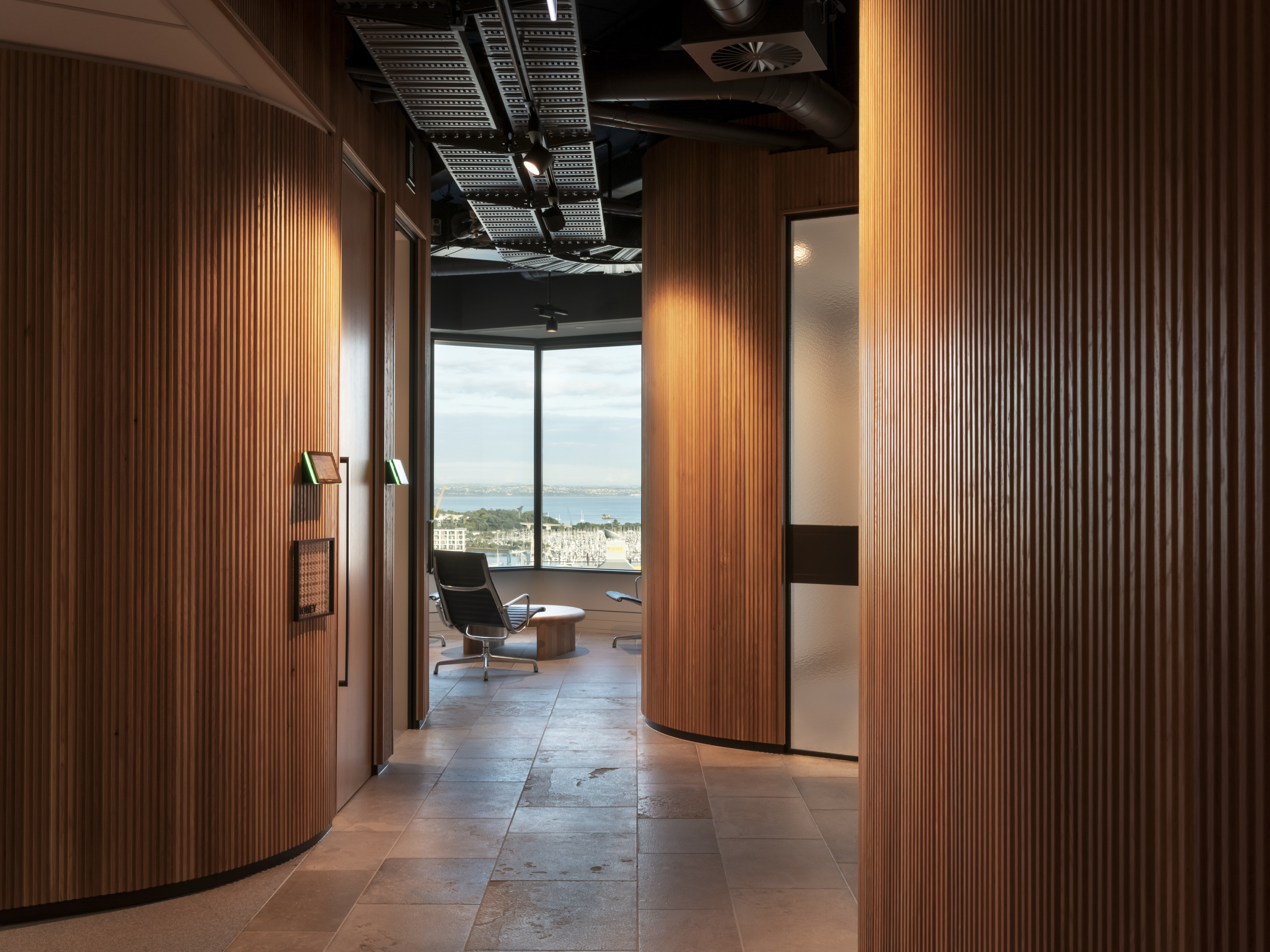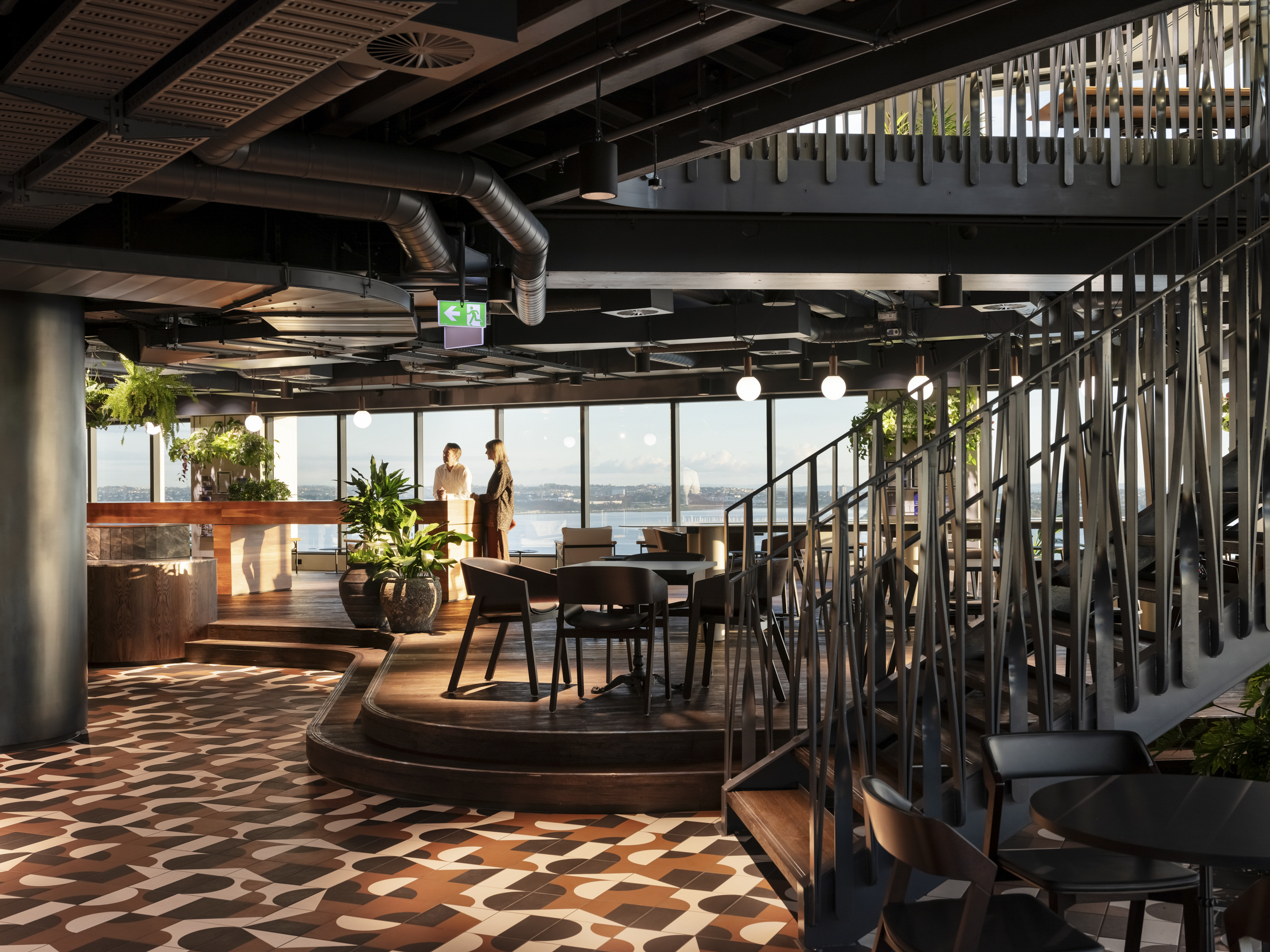 Entering this harbour edge, high-rise office fitout, a partially raised floor level and adjustable meeting spaces create a client hosting space, social hub and platform for multiple staff and industry events. A cleverly placed communal stair provides access to the level above, reinforcing a sense of volume. This spatial play produces a bespoke occupation countering the standard open plan commercial offices. It is a well-executed space-making concept that intensifies its relationship to the harbour edge. Supported by a palette of natural materials and earthy colours helps further dissolve the constraints of the office tower floor plate.