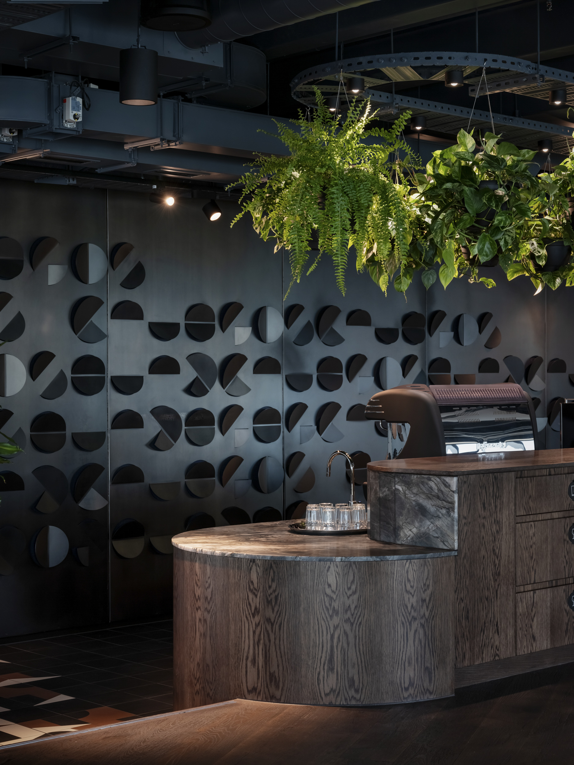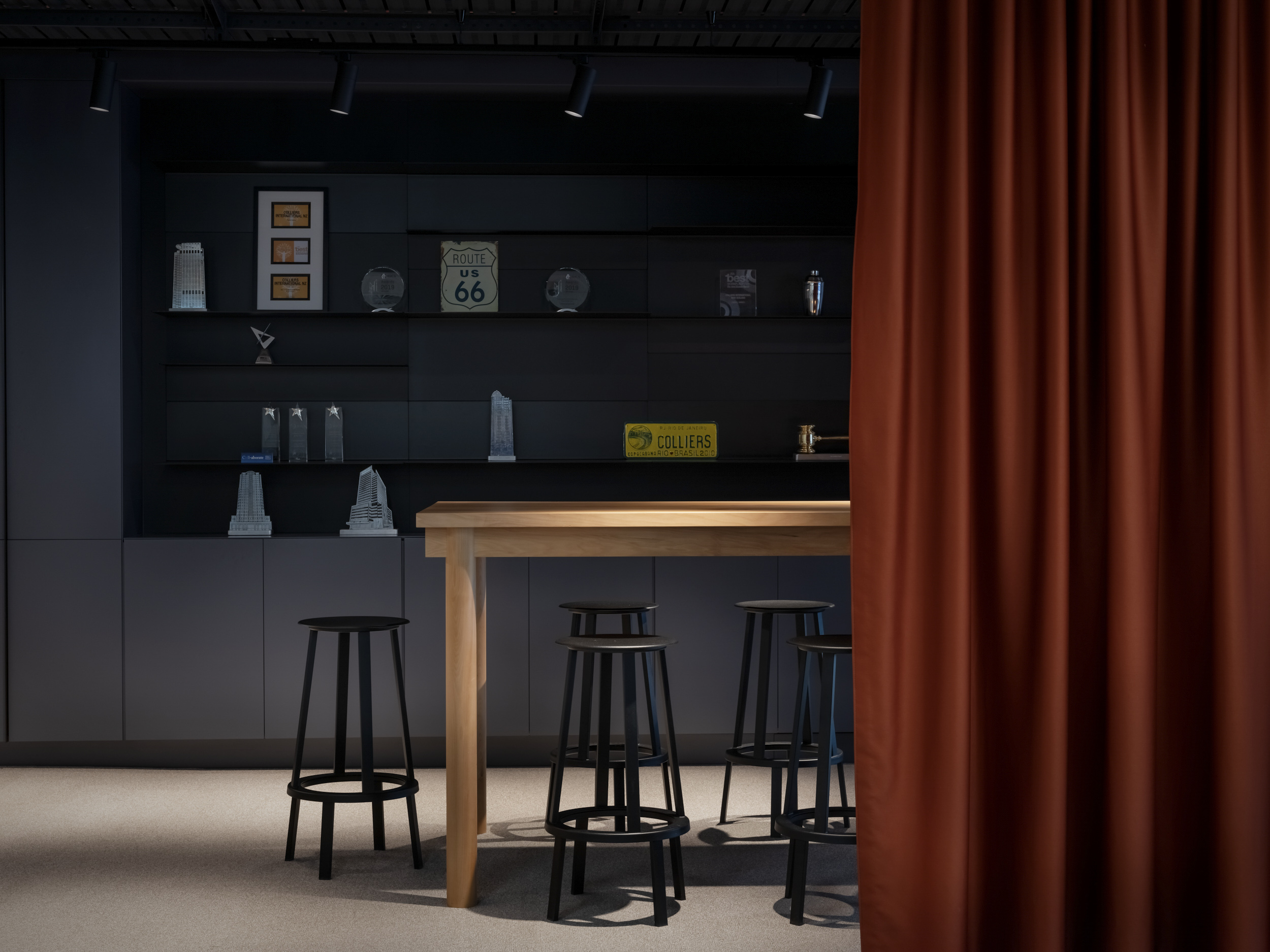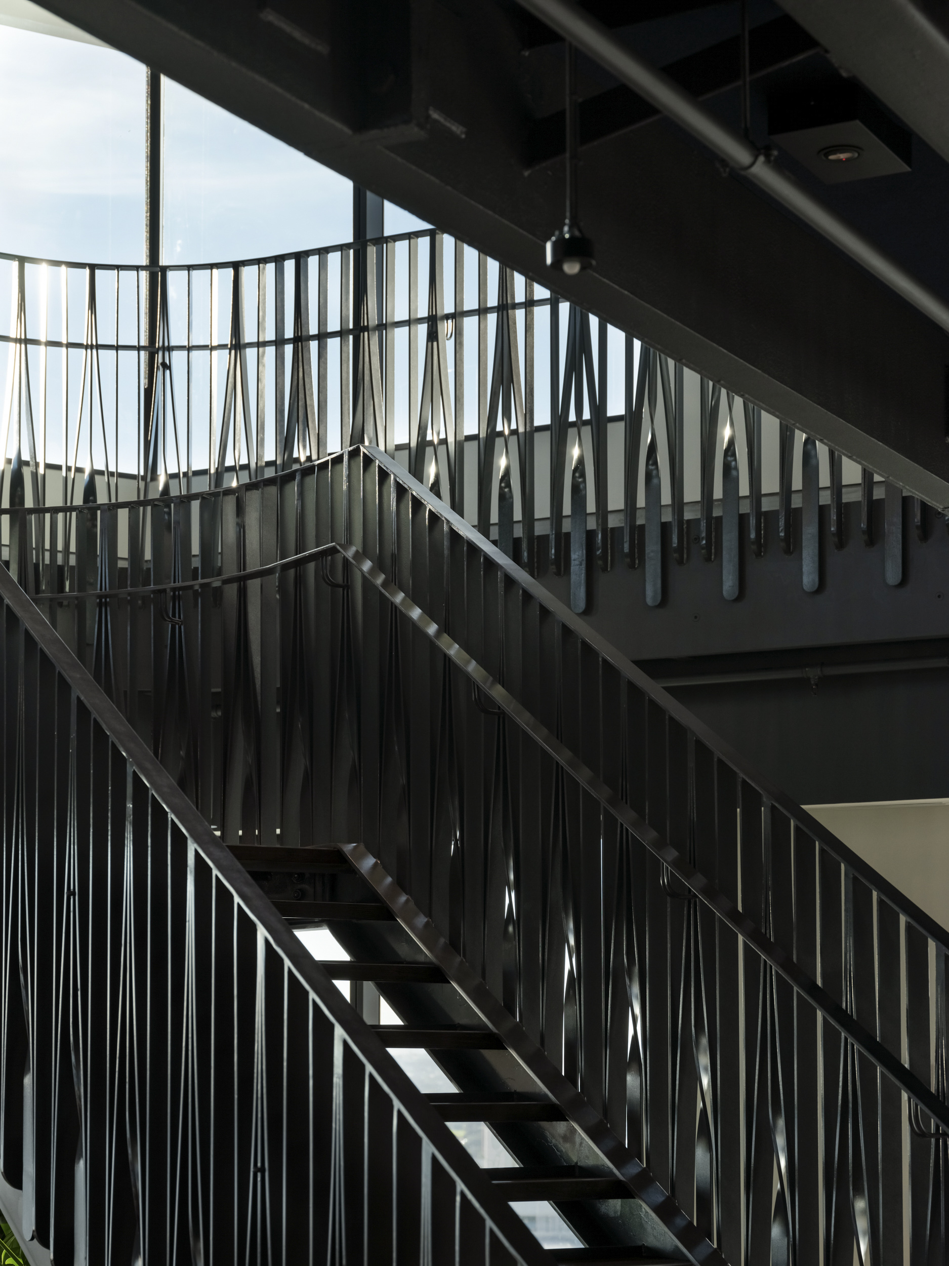 Entering this harbour edge, high-rise office fitout, a partially raised floor level and adjustable meeting spaces create a client hosting space, social hub and platform for multiple staff and industry events. A cleverly placed communal stair provides access to the level above, reinforcing a sense of volume. This spatial play produces a bespoke occupation countering the standard open plan commercial offices. It is a well-executed space-making concept that intensifies its relationship to the harbour edge. Supported by a palette of natural materials and earthy colours helps further dissolve the constraints of the office tower floor plate.