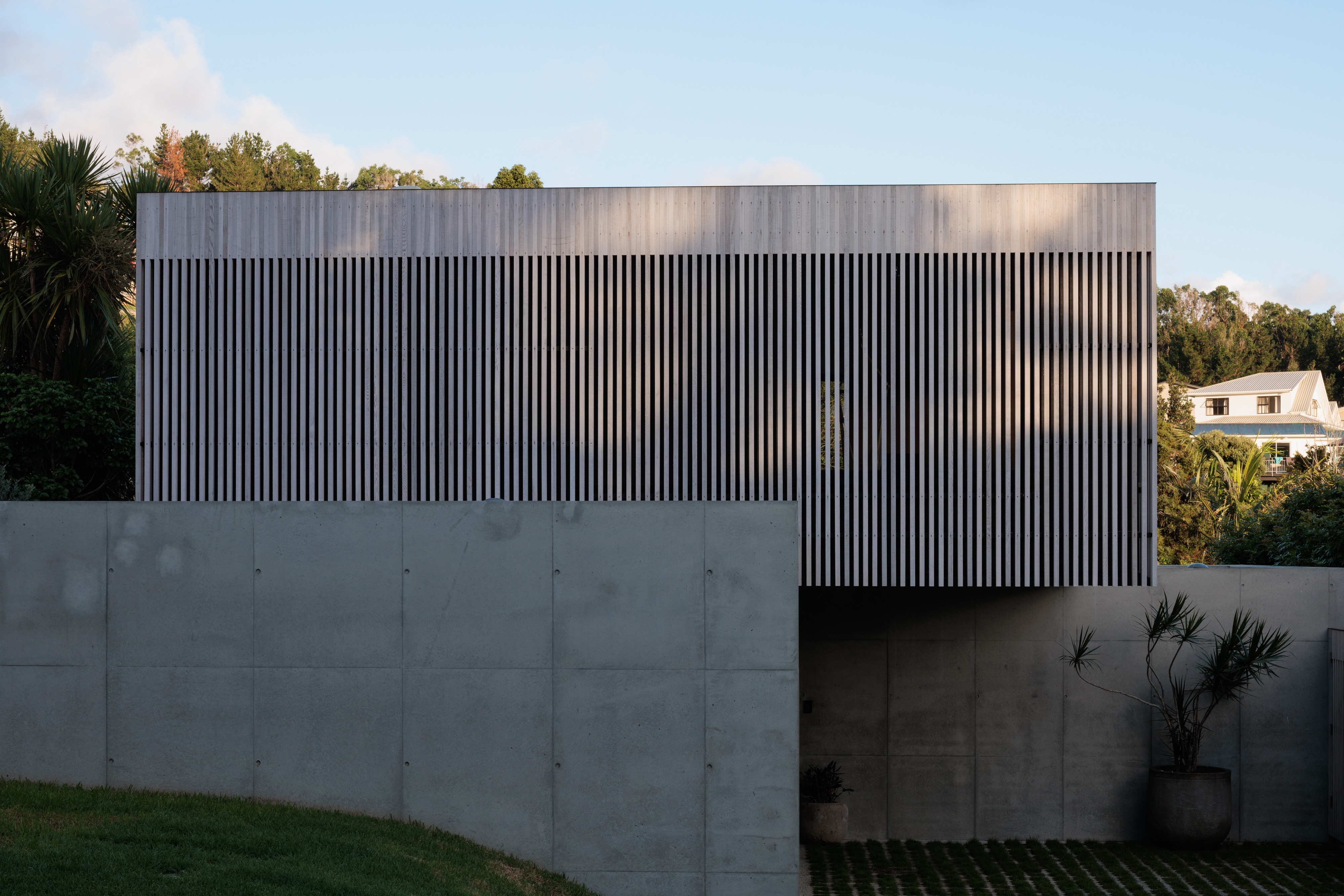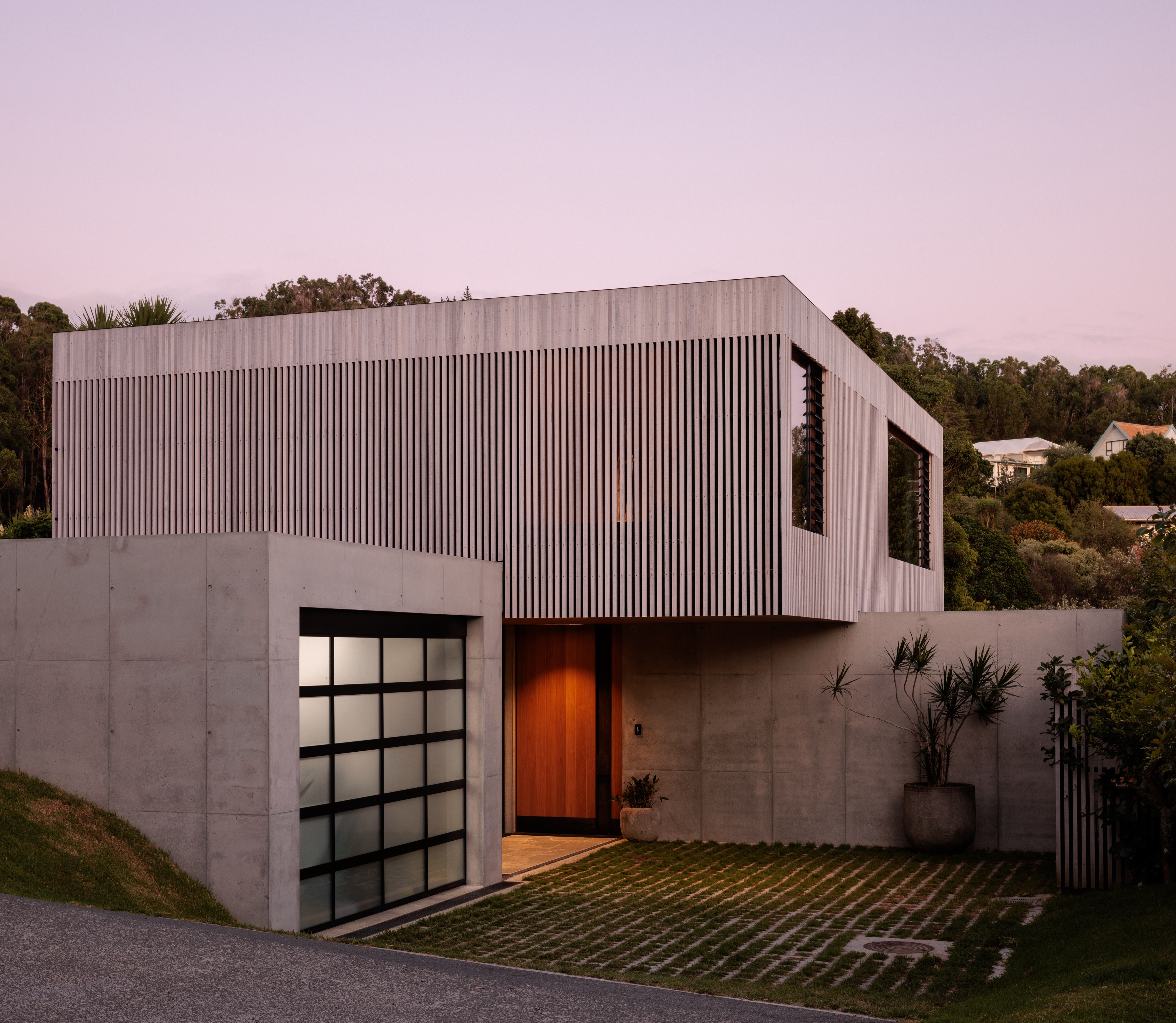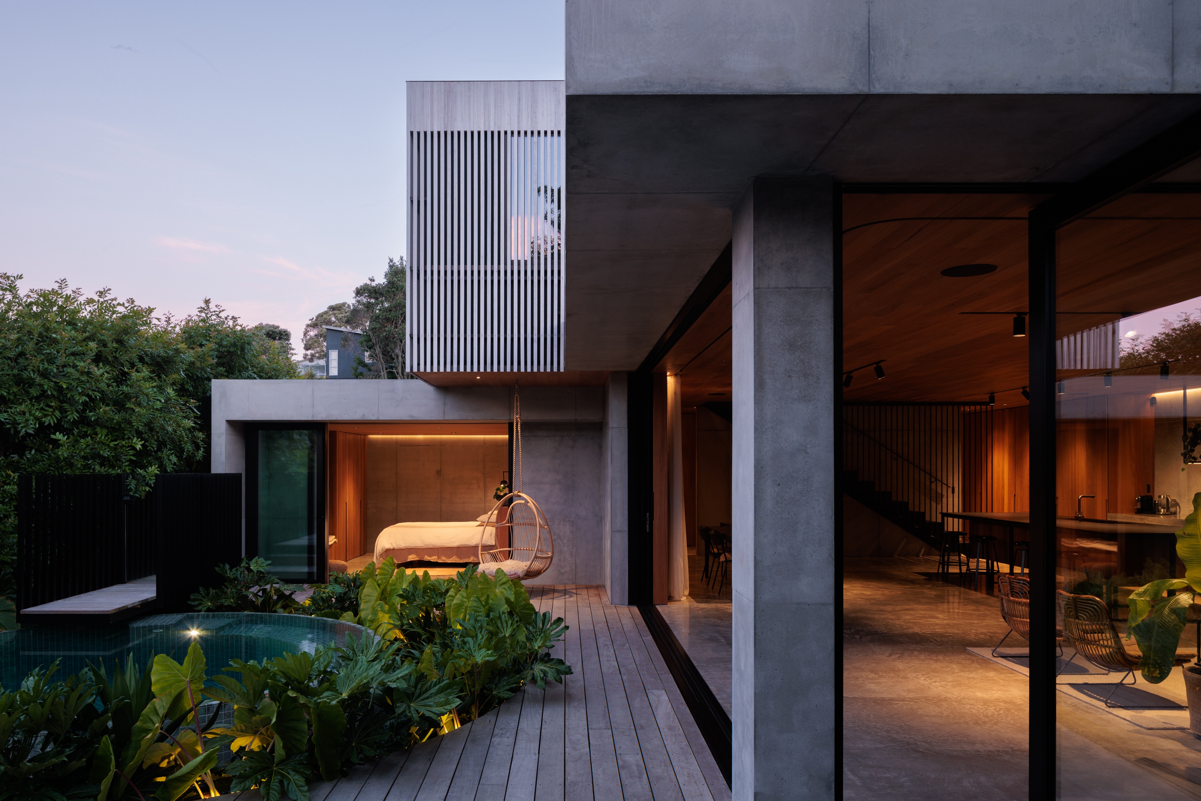 Originally conceived as a holiday home for its owner, this project evolved into a family’s permanent residence in the sleepy Coromandel township of Onemana. The design pushes the boundaries of site coverage and materiality, a modern concrete home inspired by the mood and aesthetic of Tadao Ando. Inside, the home feels modern and sophisticated, warm and inviting. Interior timber lining creates a welcoming, calming feeling. The courtyard and outdoor space create a tranquil oasis and sense of privacy, despite the proximity of neighbours. Light shafts, level changes and shadow plays create interest and privacy while maintaining views to the rolling hills and streetscape.