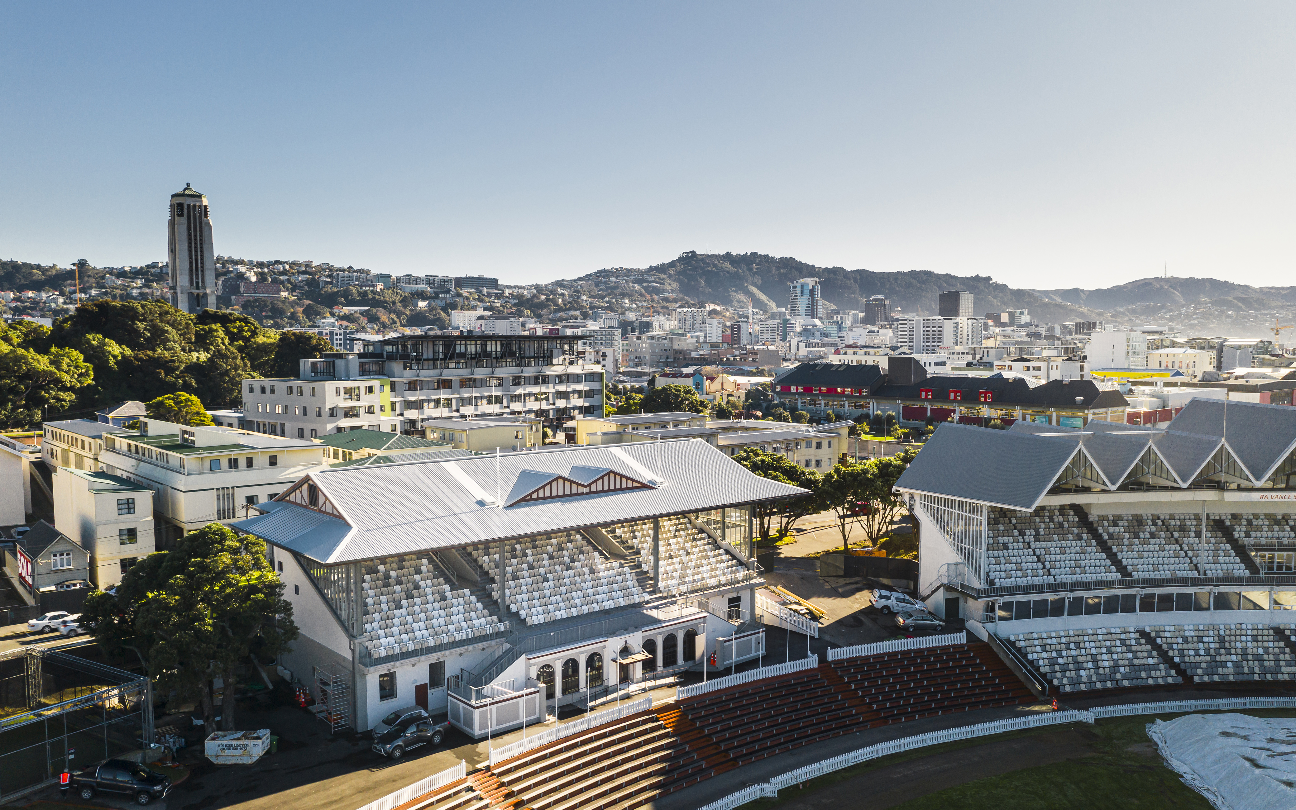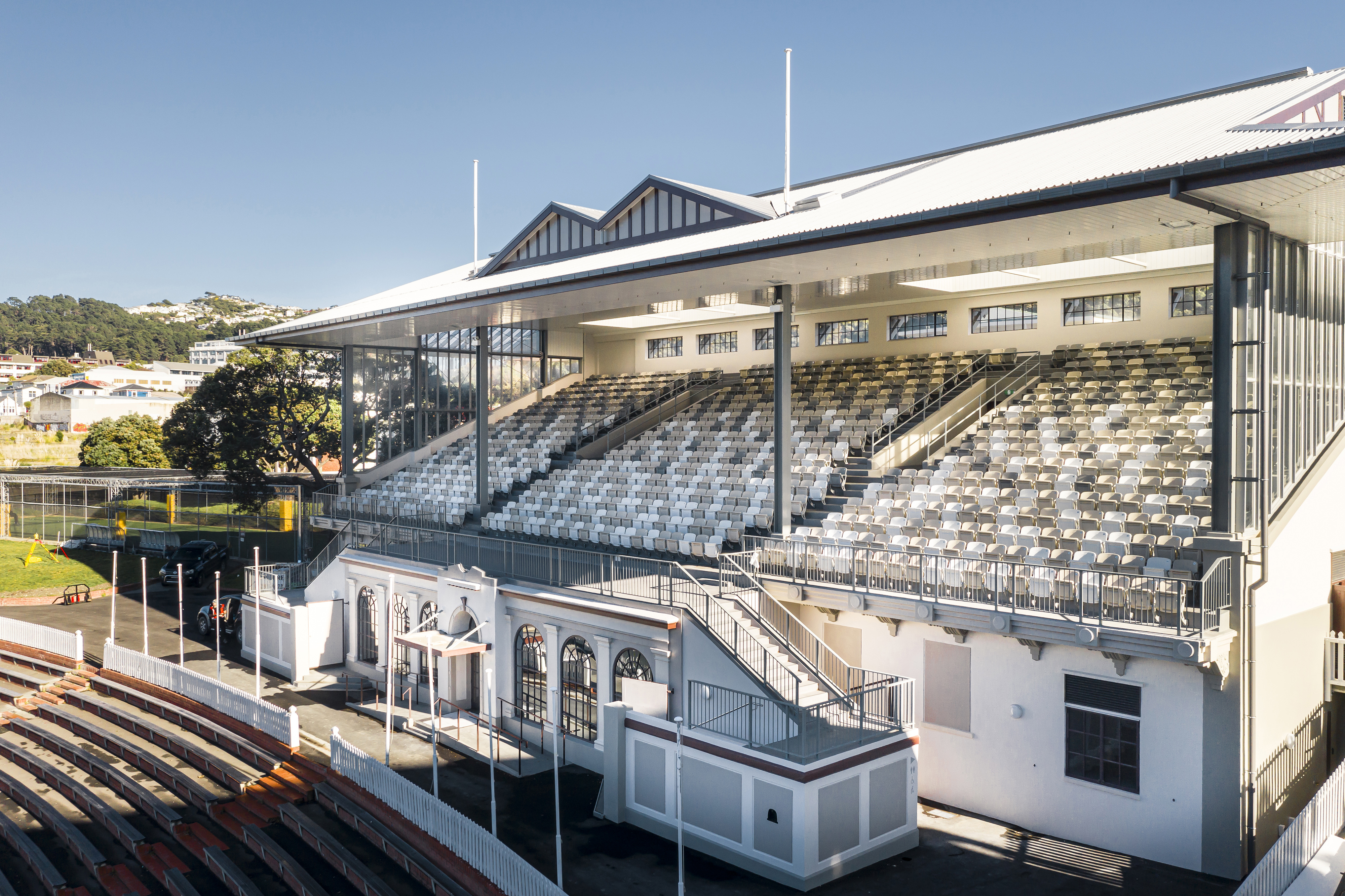 This Category 2 Heritage Listed building has been re-planned, strengthened and refurbished to suit its multiple uses including game day seating and amenities, Cricket Wellington offices and the New Zealand Cricket Museum. This has been achieved through not only enhancing the existing heritage character, but also exposing and reinstating original features previously hidden or removed. The new tiered seating has had its capacity increased and combines with new glass side walls and a predominantly white colour scheme to provide a contemporary, comfortable, and cheerful place to watch cricket.