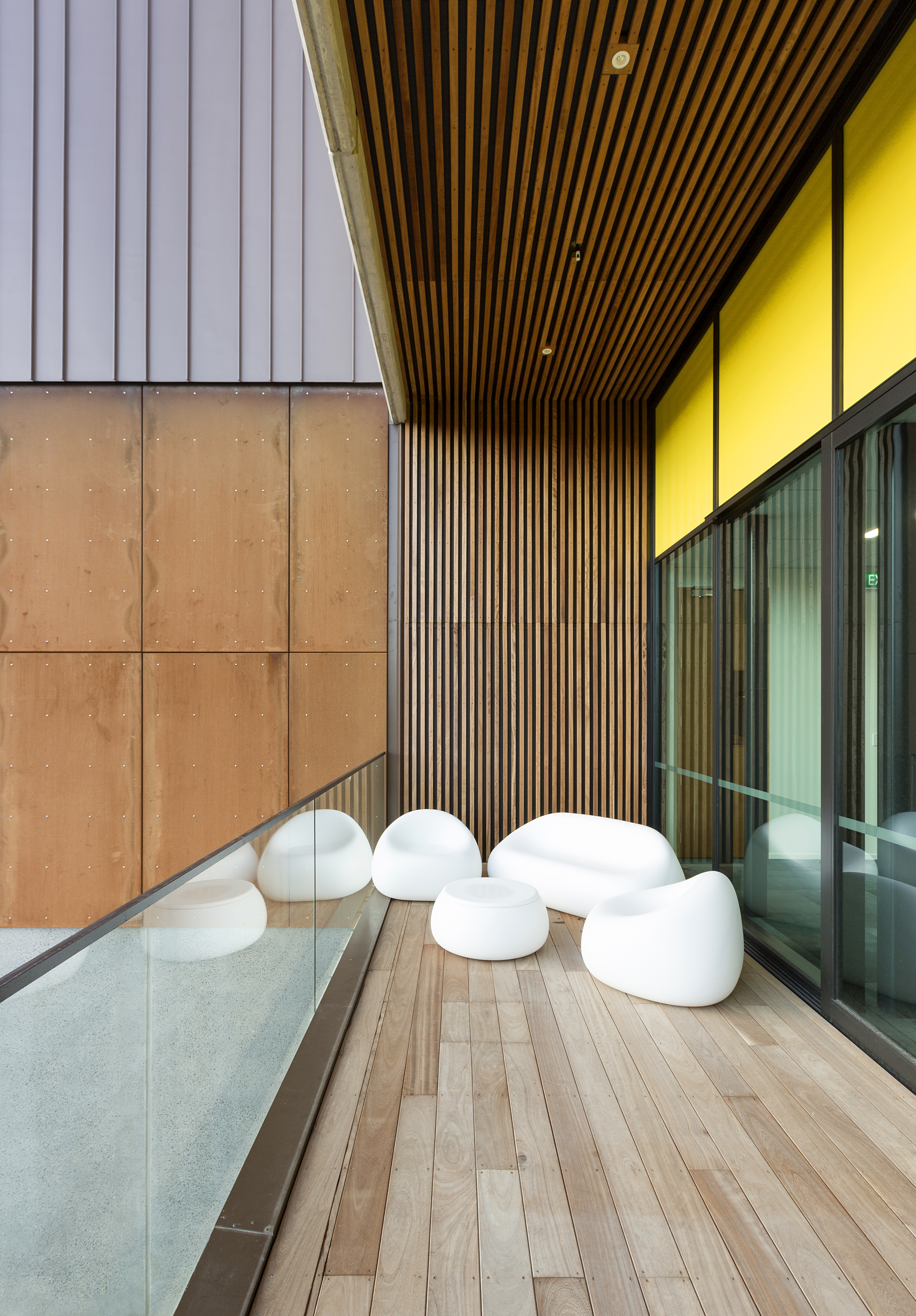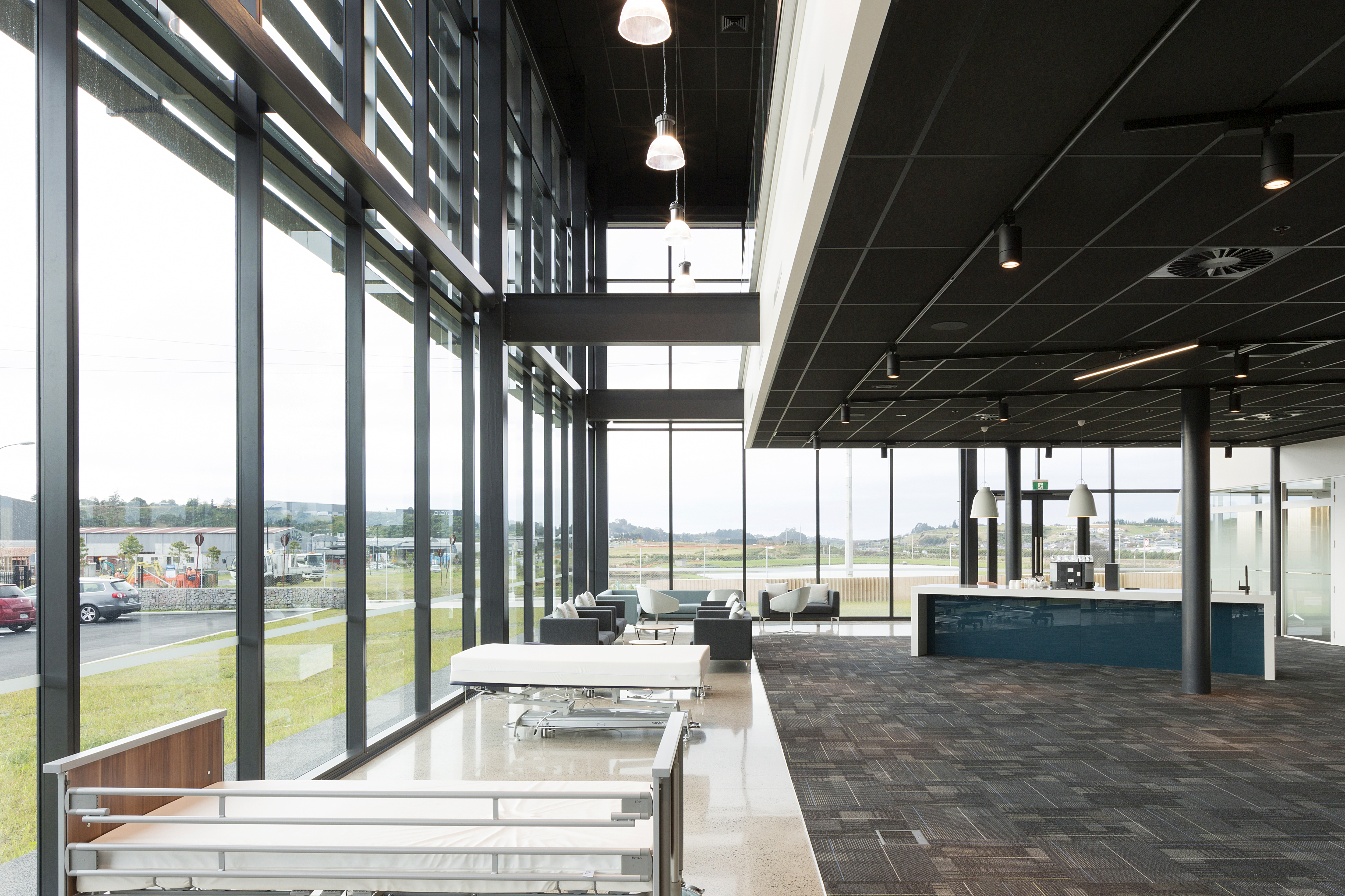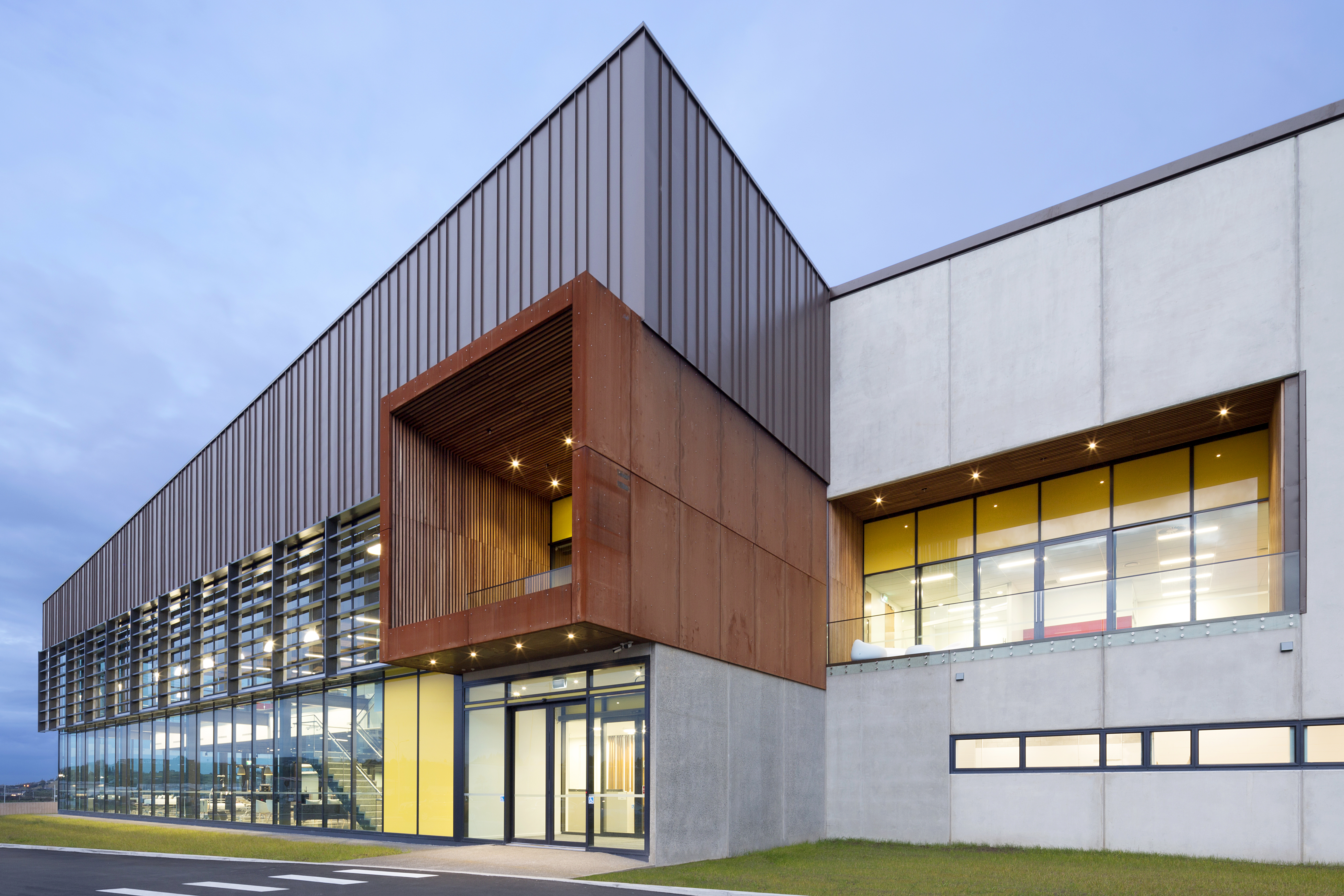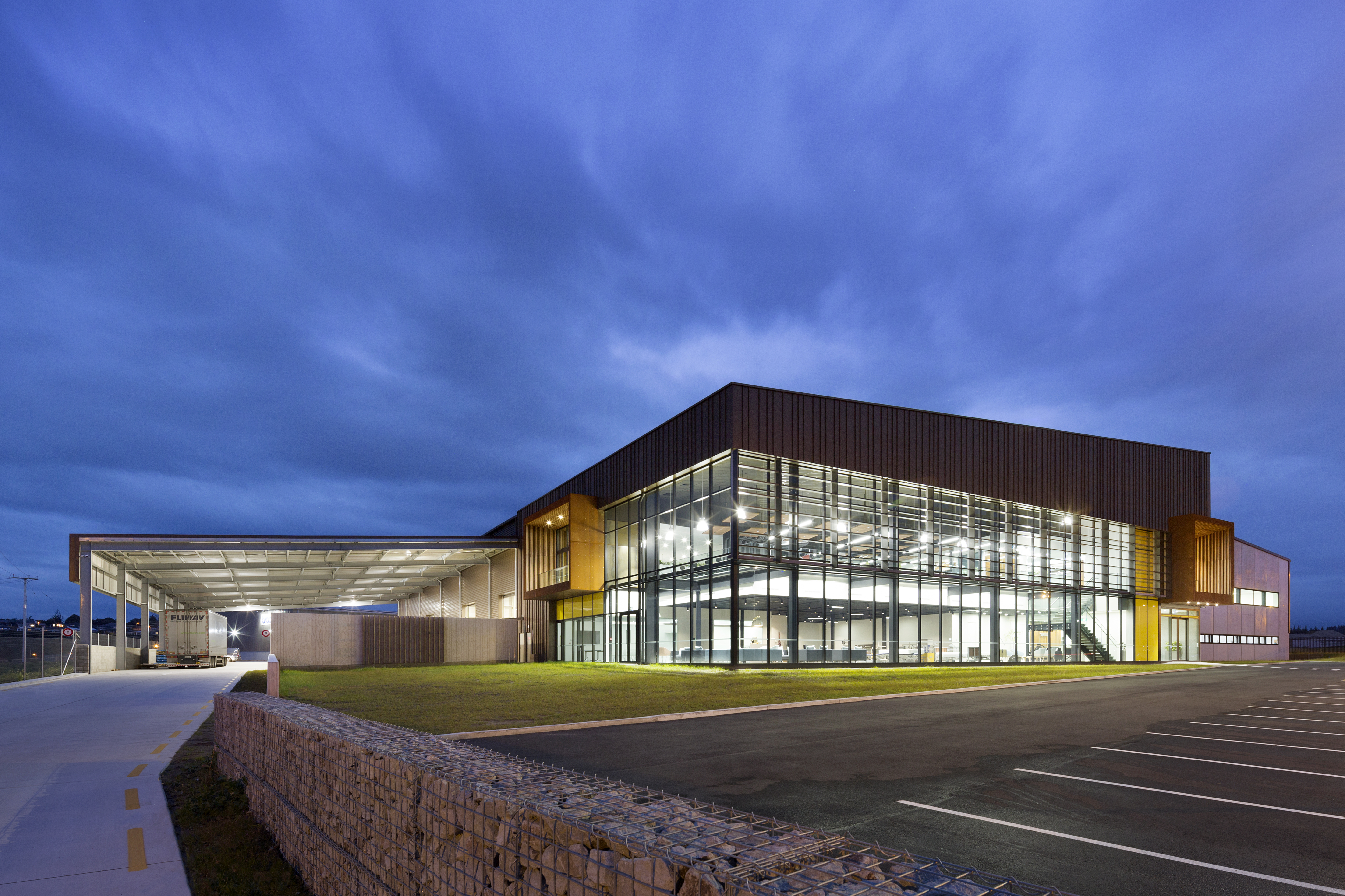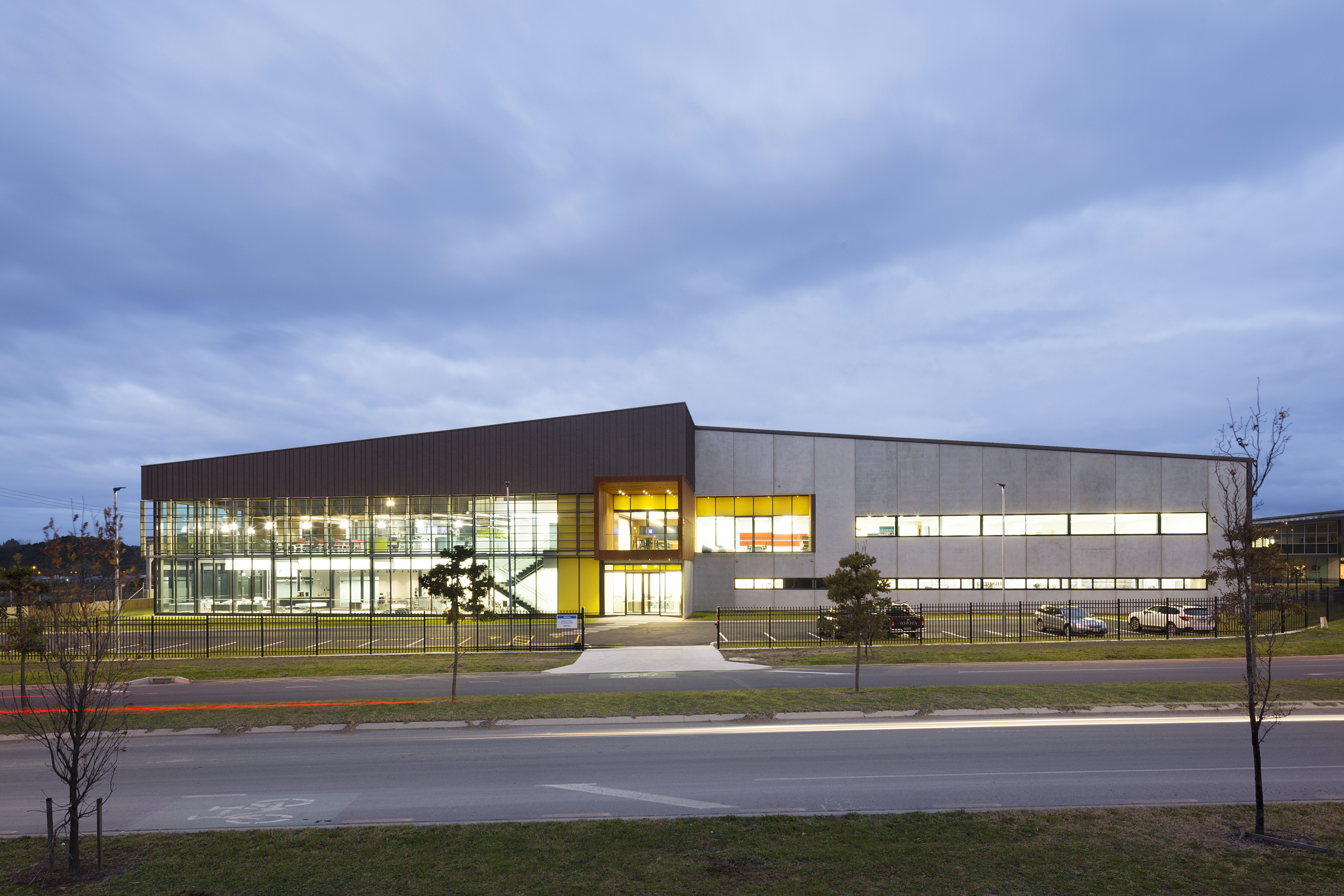 This manufacturing, showroom and office centre has become a flagship for client/contractor and architect collaboration. The rich quality of the interior spaces belies the simple logic to interior planning. The use of high-quality materials, balanced with architectural restraint, has resulted in a strong and successfully composed façade that will age gracefully on a prominent site.