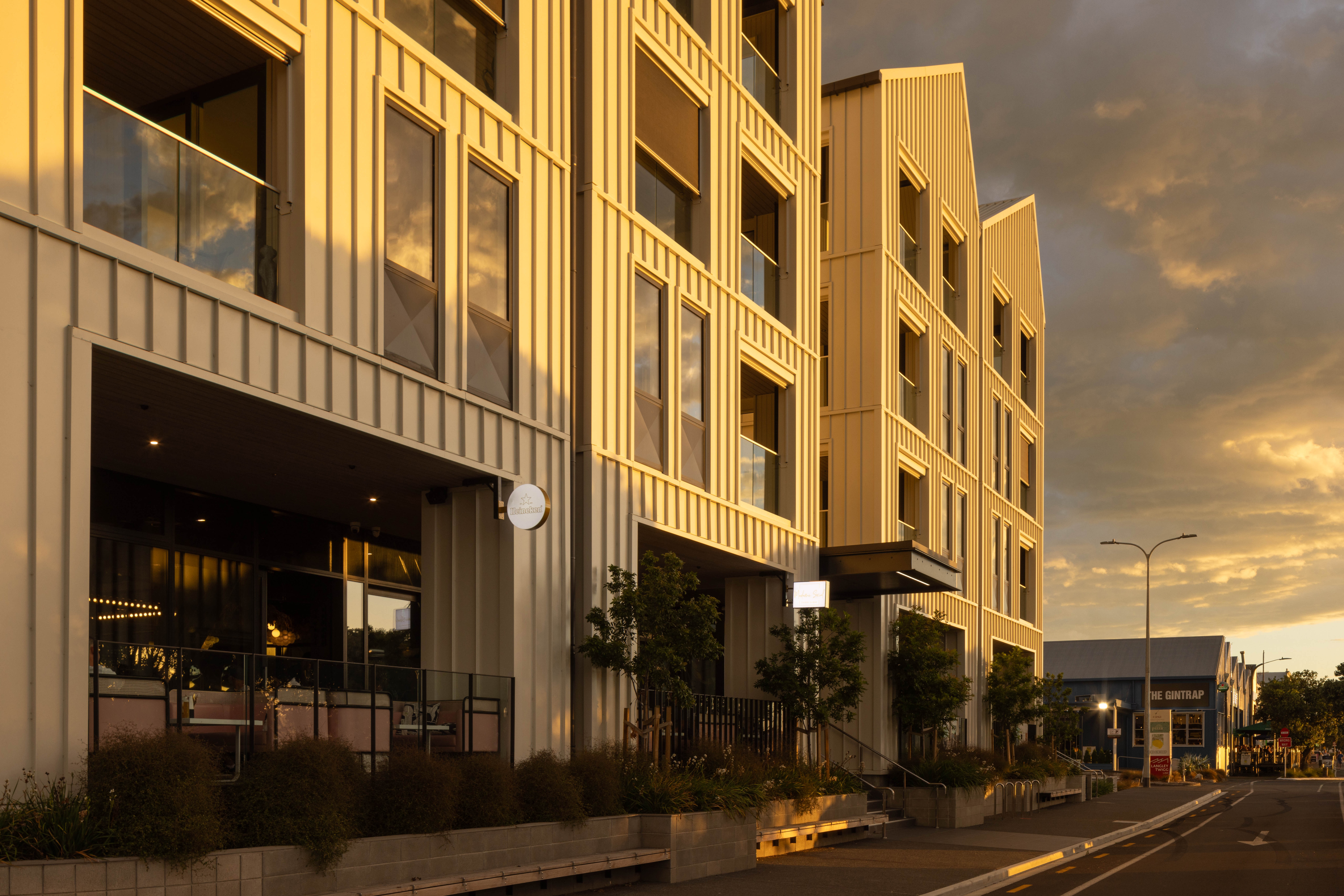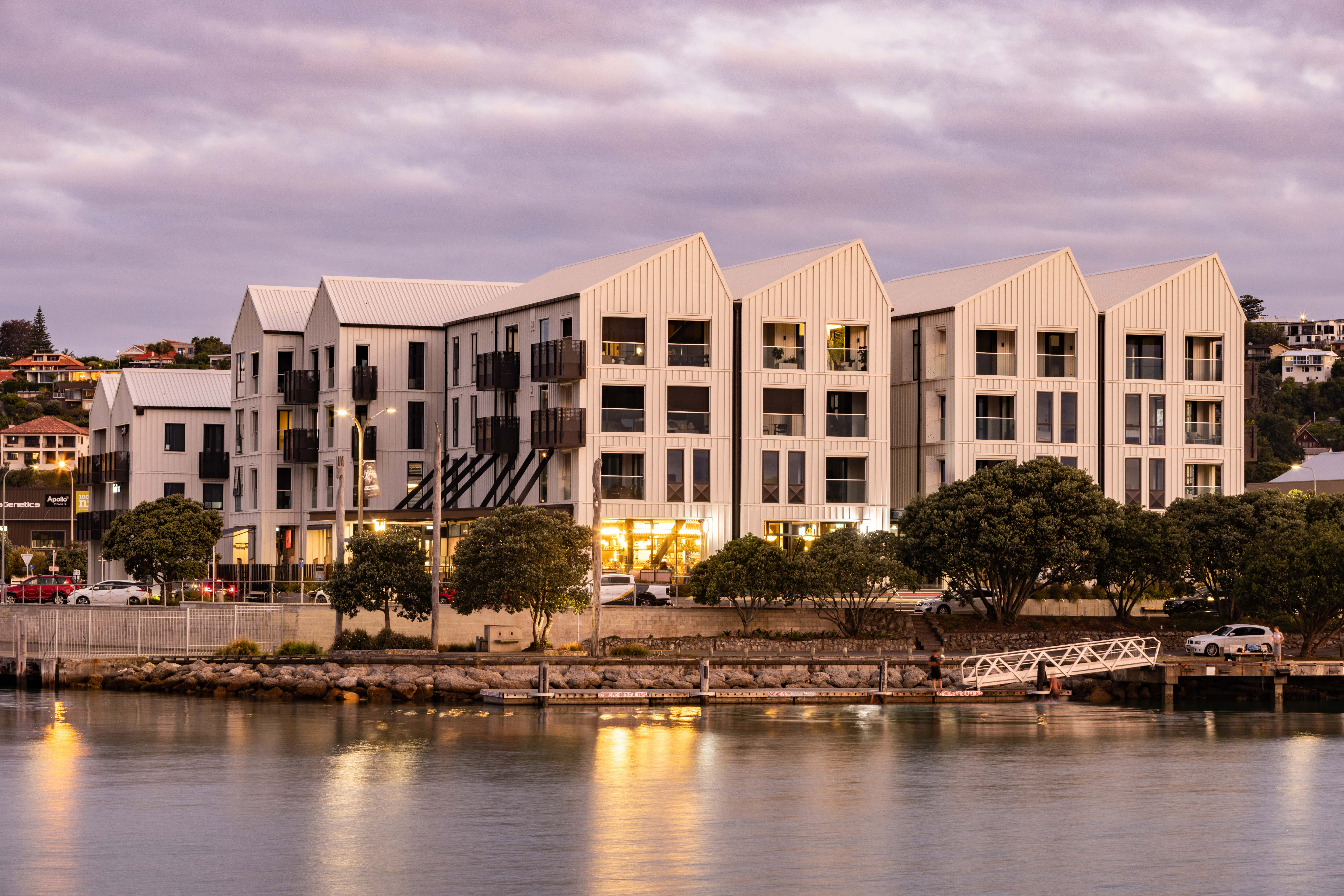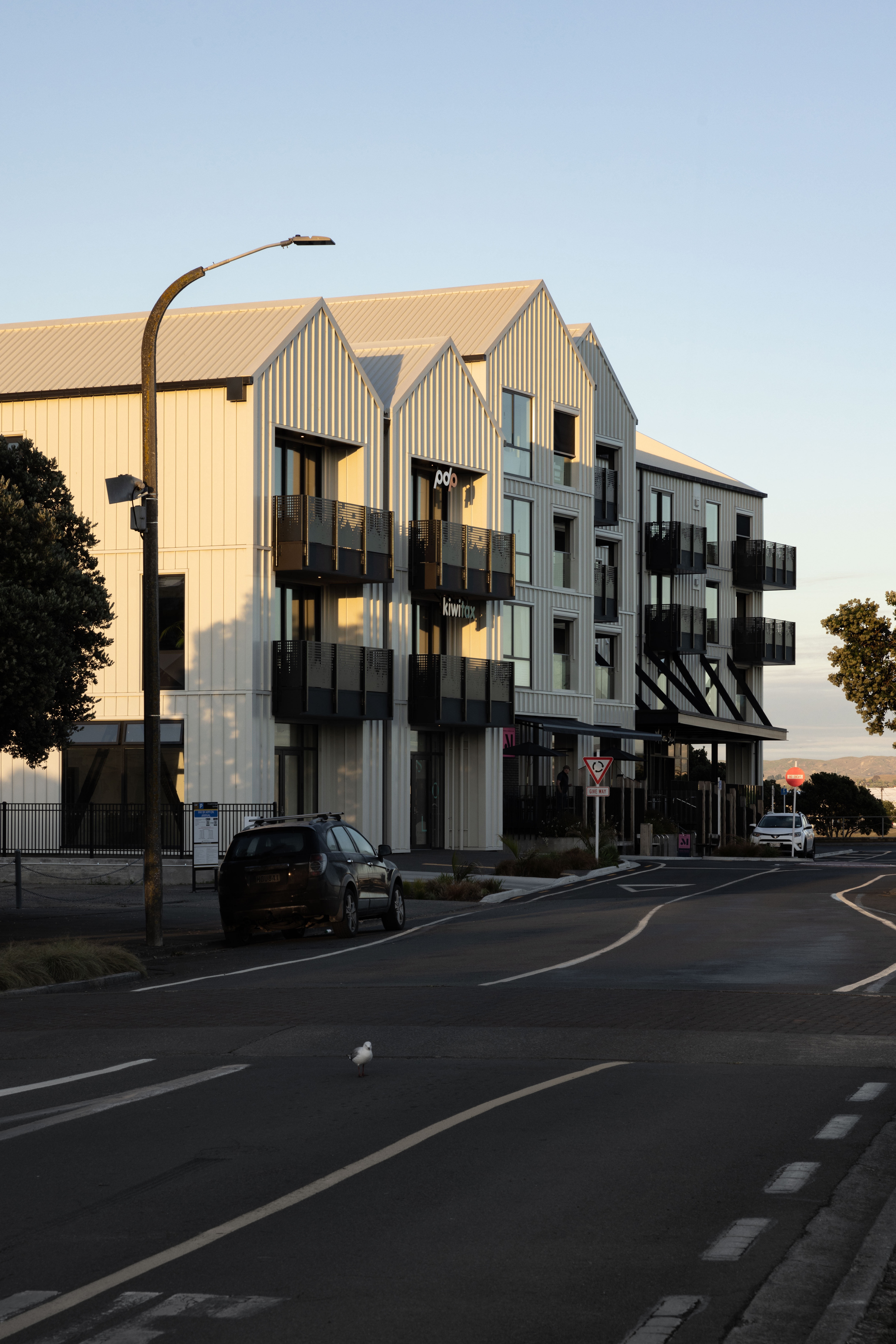 Customs Quay delivers a compelling urban experience through its seamless integration of public space and strong connections to the surrounding Ahuriri context. A network of internal and external laneways lined with retail and hospitality businesses creates a vibrant, permeable ground floor that extends the waterfront’s public realm. Apartments feature dual aspects, spacious layouts and recessed decks, offering privacy and comfort for year-round living.The building’s thoughtfully composed forms reflect the rhythm and scale of the surrounding heritage woolsheds, while its varied height creates a distinctive navigational marker visible from multiple vantage points across Ahuriri. Crafted from simple, durable materials, Customs Quay is both timeless and resilient — a new landmark at the gateway to Te Whanganui a Orotū that enhances waterfront living and sets a benchmark for future development.