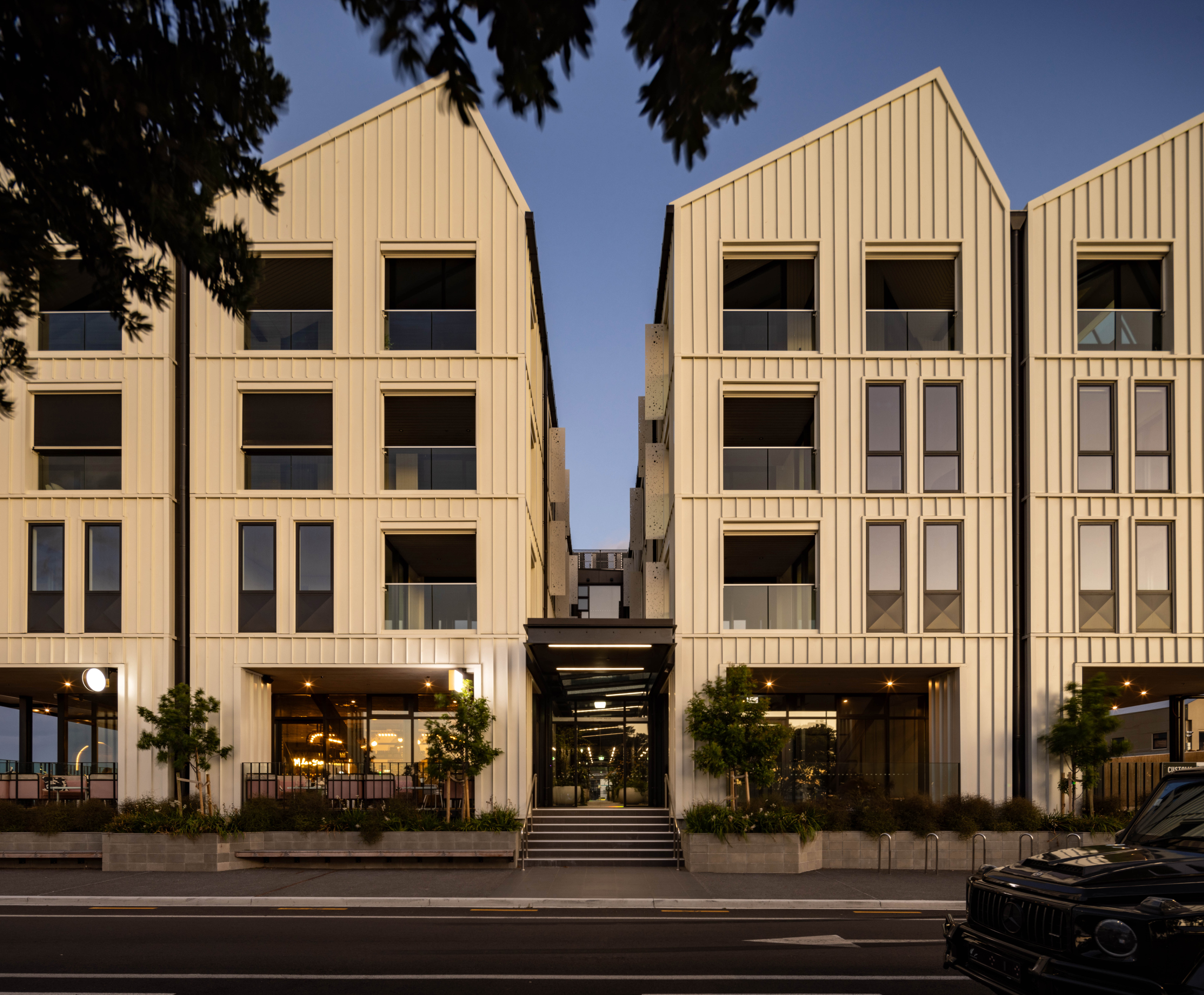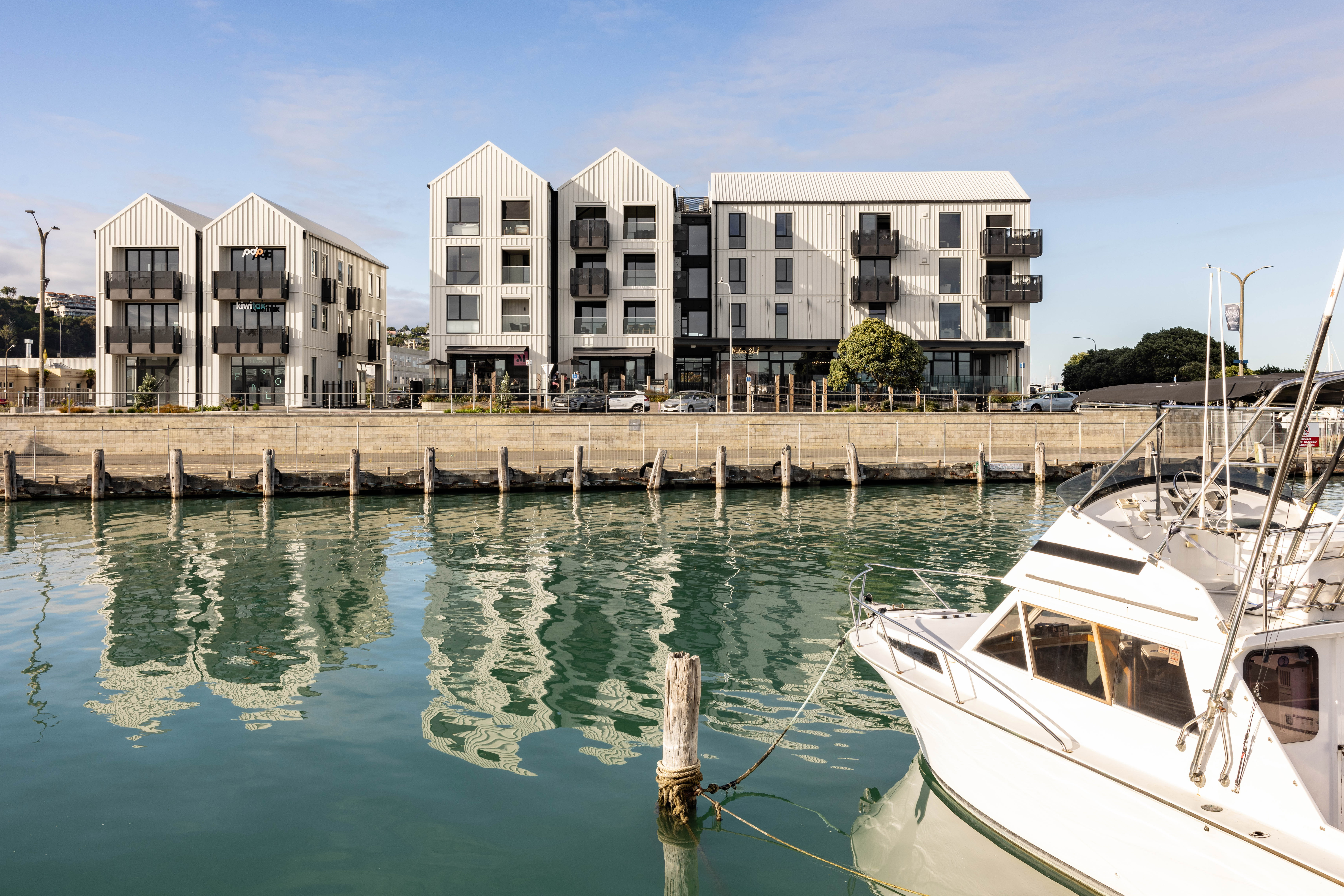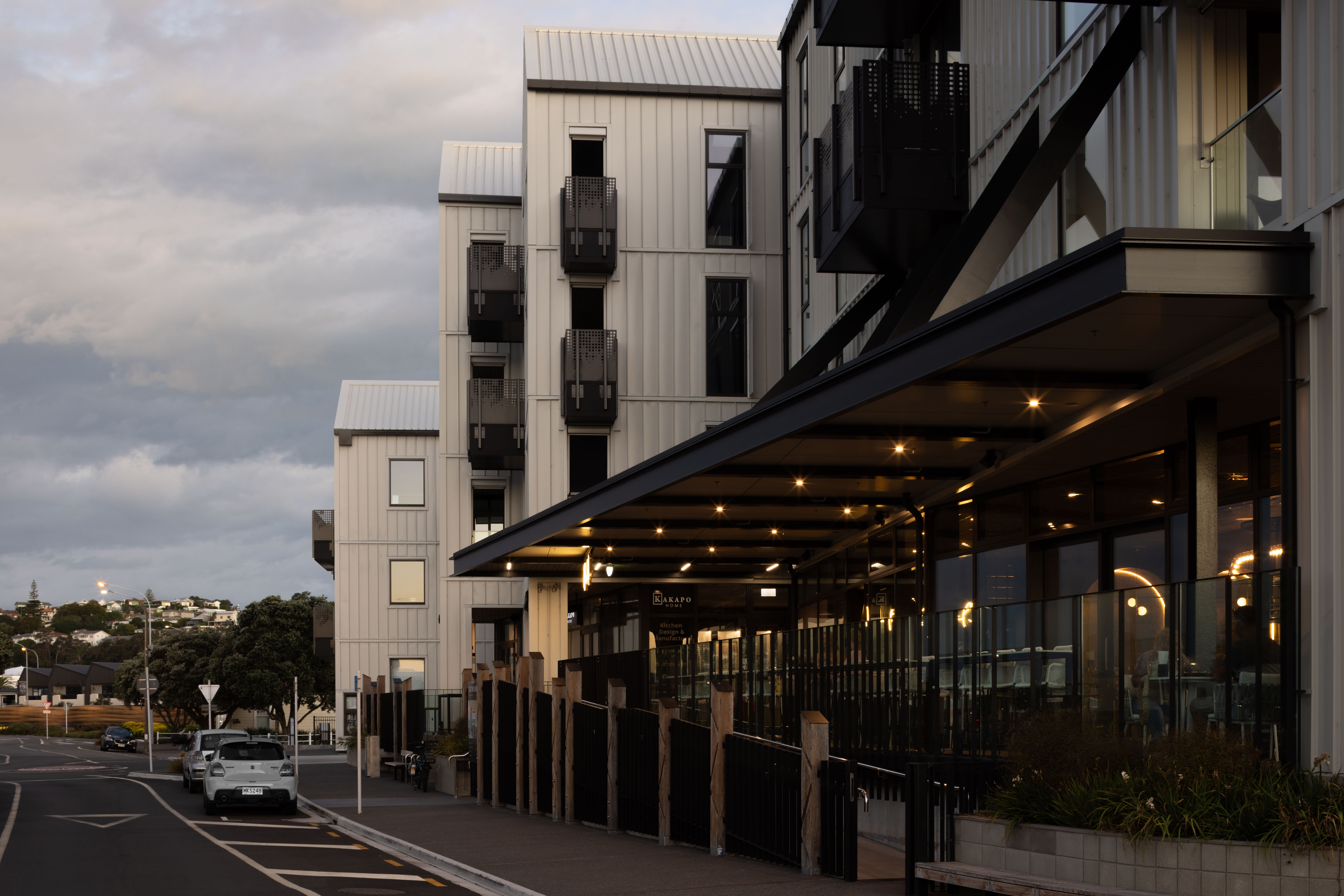 Customs Quay delivers a compelling urban experience through its seamless integration of public space and strong connections to the surrounding Ahuriri context. A network of internal and external laneways lined with retail and hospitality businesses creates a vibrant, permeable ground floor that extends the waterfront’s public realm. Apartments feature dual aspects, spacious layouts and recessed decks, offering privacy and comfort for year-round living.The building’s thoughtfully composed forms reflect the rhythm and scale of the surrounding heritage woolsheds, while its varied height creates a distinctive navigational marker visible from multiple vantage points across Ahuriri. Crafted from simple, durable materials, Customs Quay is both timeless and resilient — a new landmark at the gateway to Te Whanganui a Orotū that enhances waterfront living and sets a benchmark for future development.