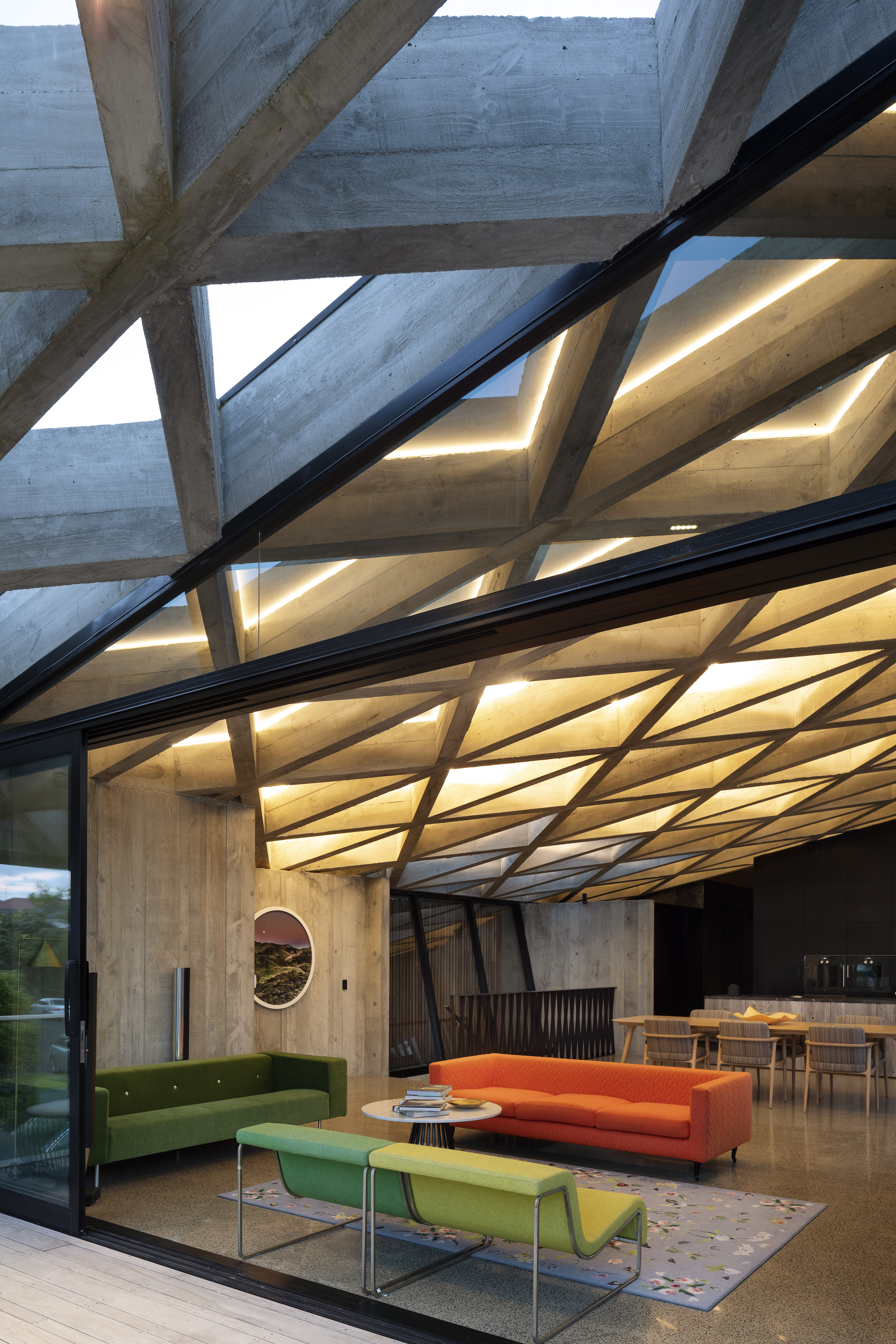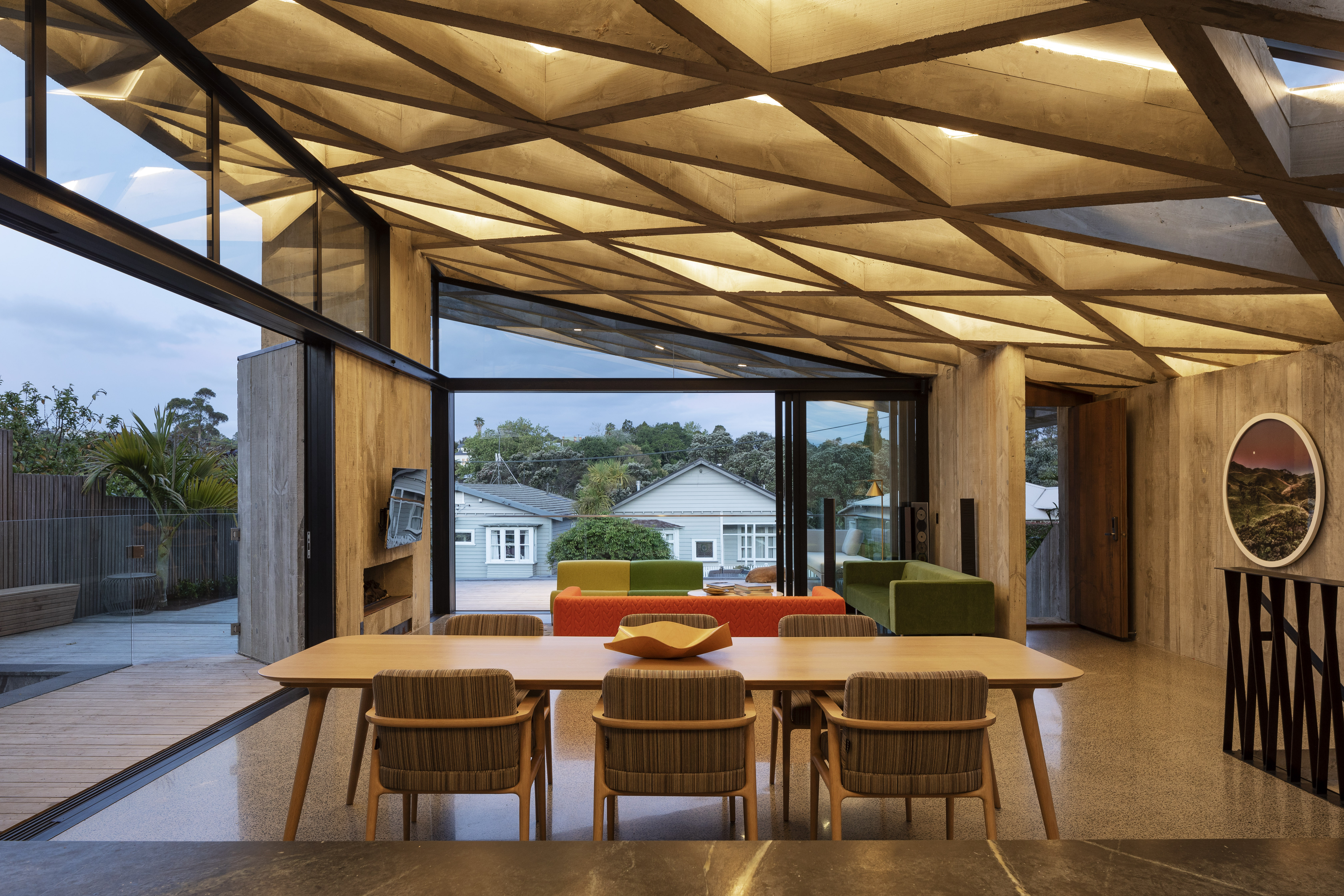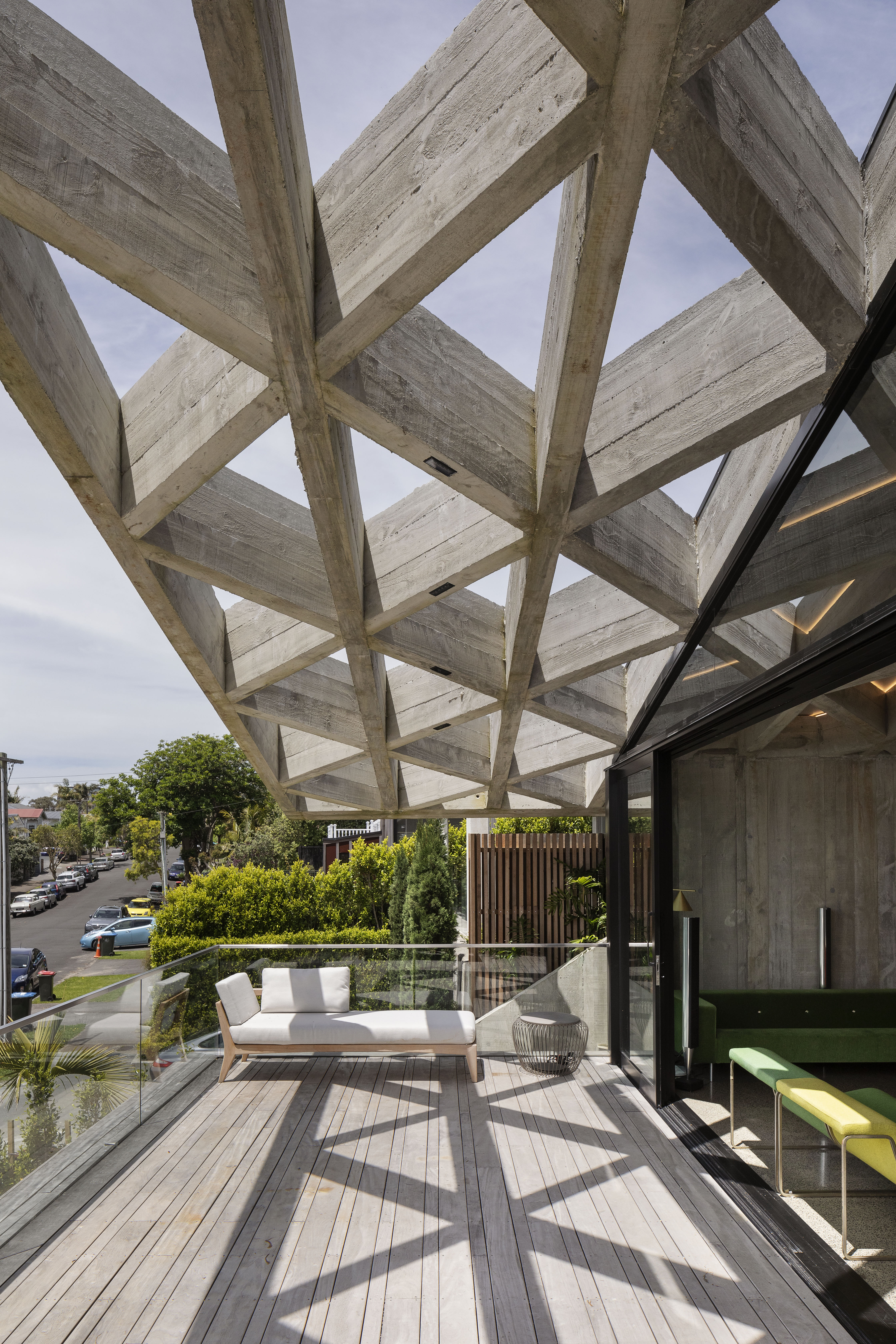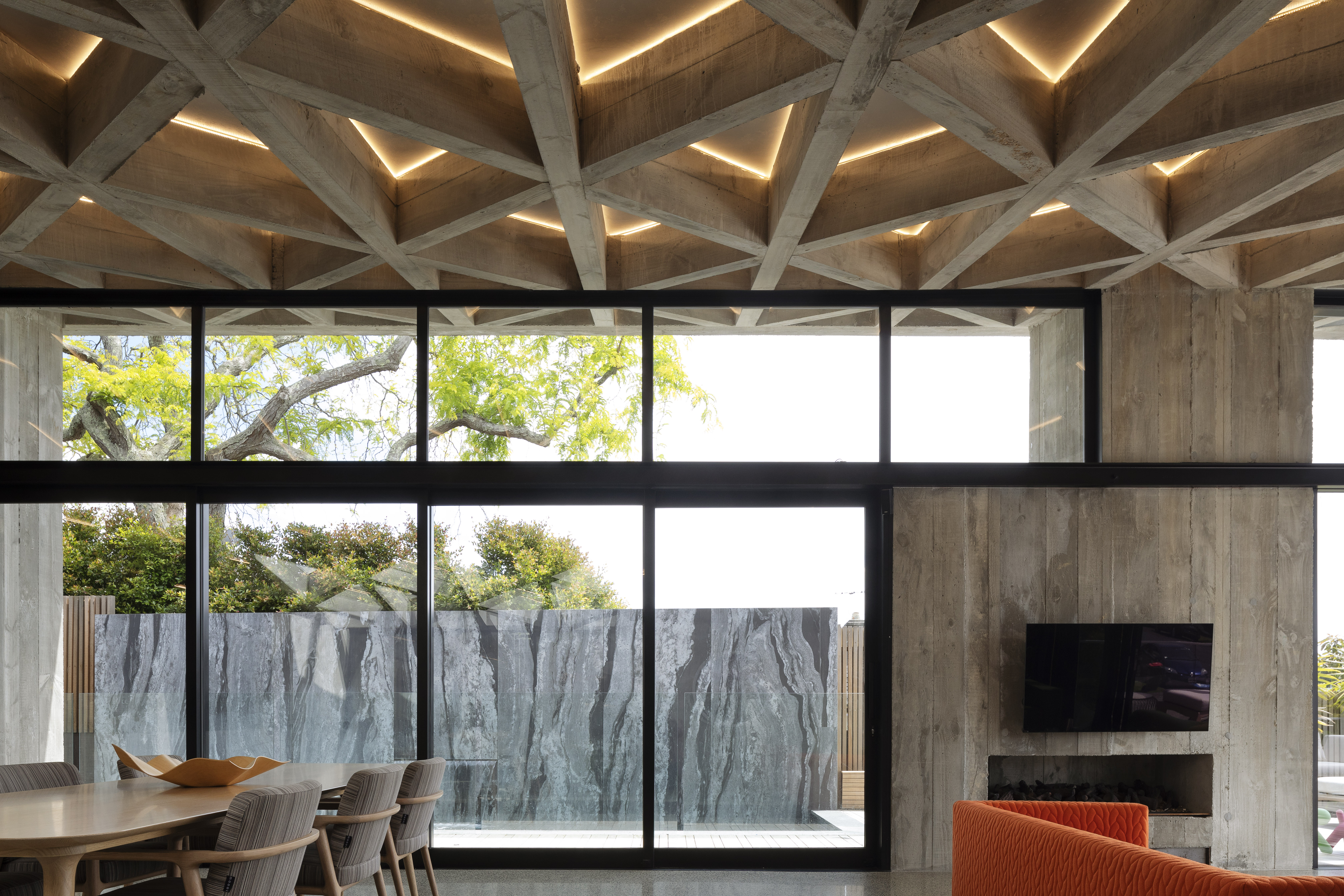 “Primitive but poetic” is how Jack McKinney describes the house he designed for a builder friend who wanted to do things with concrete. That barely starts to cover it. The Diagrid House is dominated, in every sense, by a 56-tonne concrete roof, formed as a grid of diagonals – a diagrid – in which the weight of the structure belies a thousand ever-changing possibilities, by day and by night, for the play and patterning of light. The main room opens to an expansive deck at front, with dark brooding kitchen at rear. The house itself is sunk back into the hillside, so that you walk back into it down a long, dark, gleaming corridor, with a staircase glimpsed at the furthest end. The bathrooms boast granite walls and the kids’ bedrooms have mezzanine sleeping platforms – one accessed only by a climbing wall. Upstairs, a master bedroom with a view over the nearby park reveals a glorious command of light, space and geometry. It is, like the rest of the house, at once serene and triumphant. This is truly unique, next-level domestic architecture.