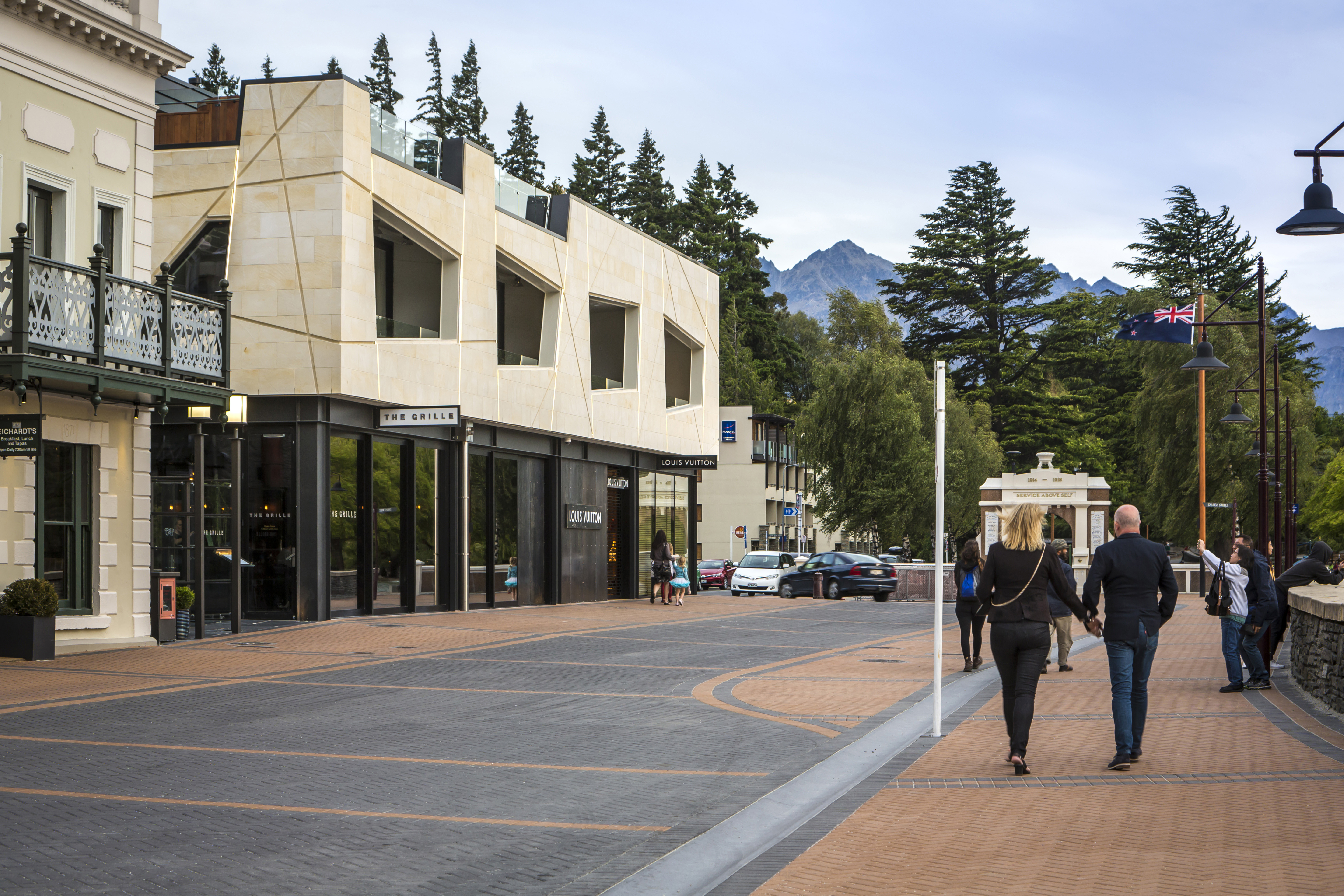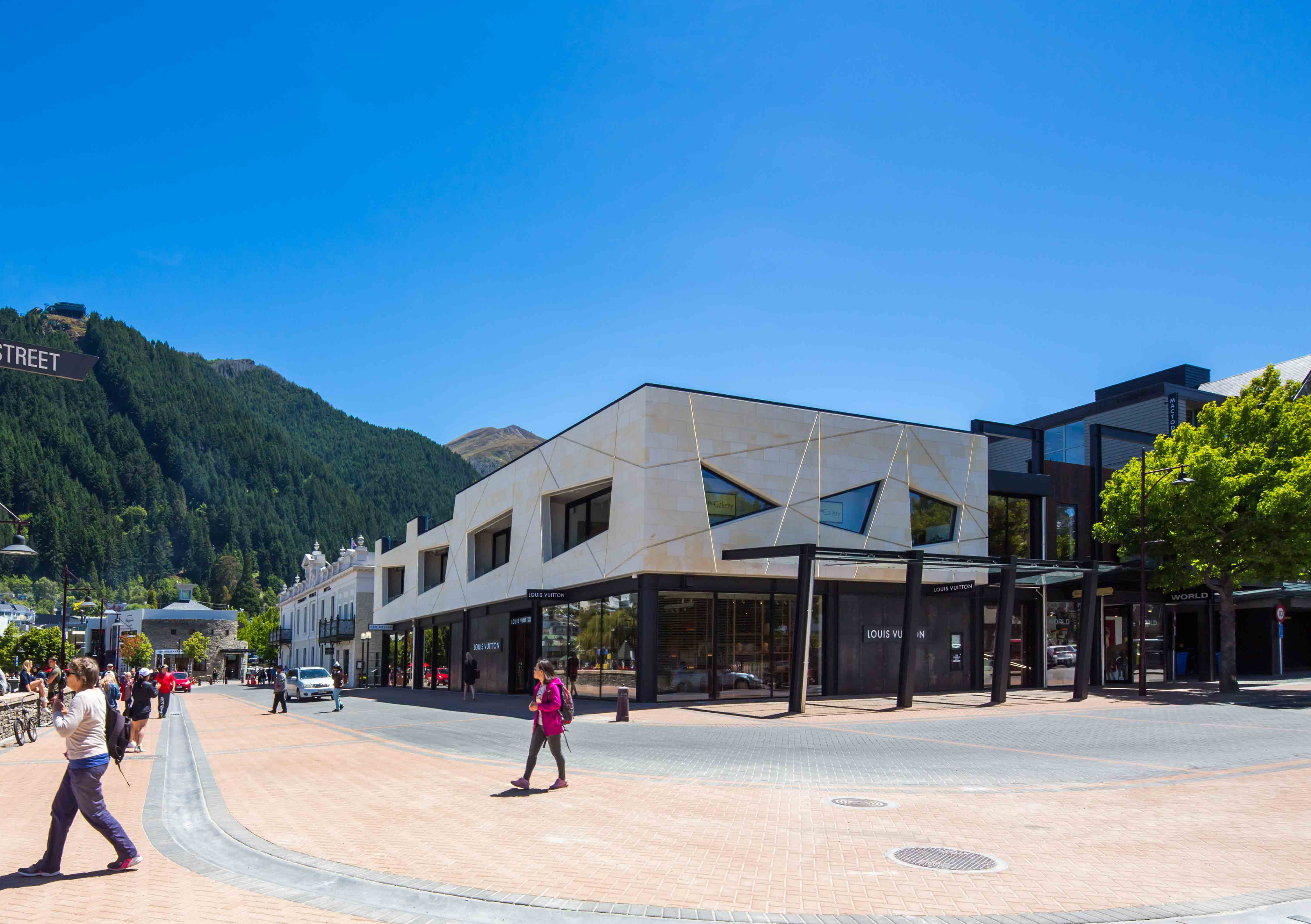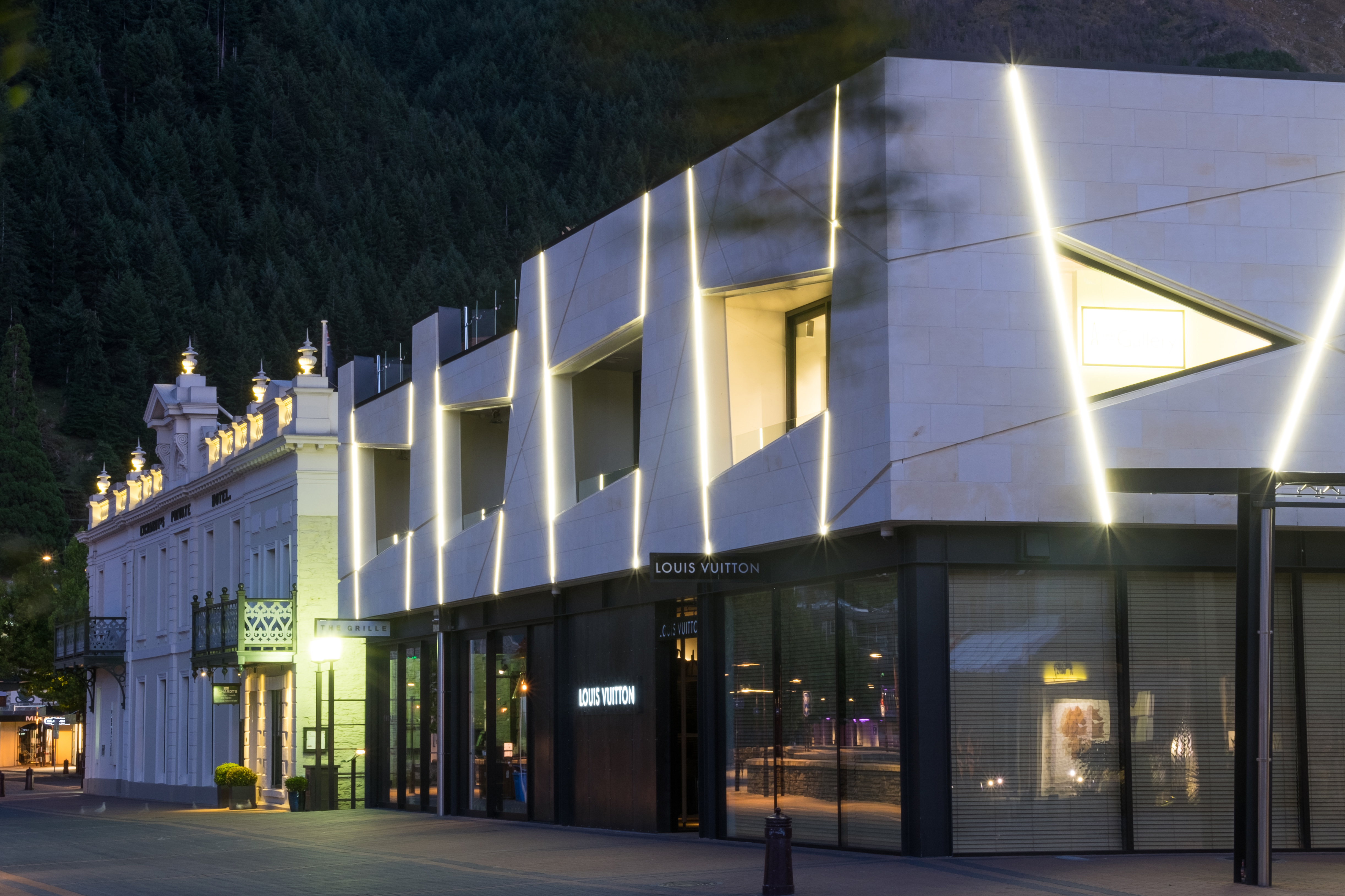 Designing a building to stand alongside a nineteenth-century heritage landmark on the edge of Lake Wakatipu is no mean feat. The success of this building lies in the reinterpretation of the adjacent heritage building, an understanding of mass, and the ‘shattered’ angles of the façade – a modern take on the ‘punched apertures’ of the older building. The architect has occupied the site to the limit of the boundaries and introduced a mass of white-stone – in honour of heritage – that appears to hover above the more recessive black-steel and glass shop frontages that present to the street below. This refreshing approach is a contemporary salute to a cornerstone of local heritage.