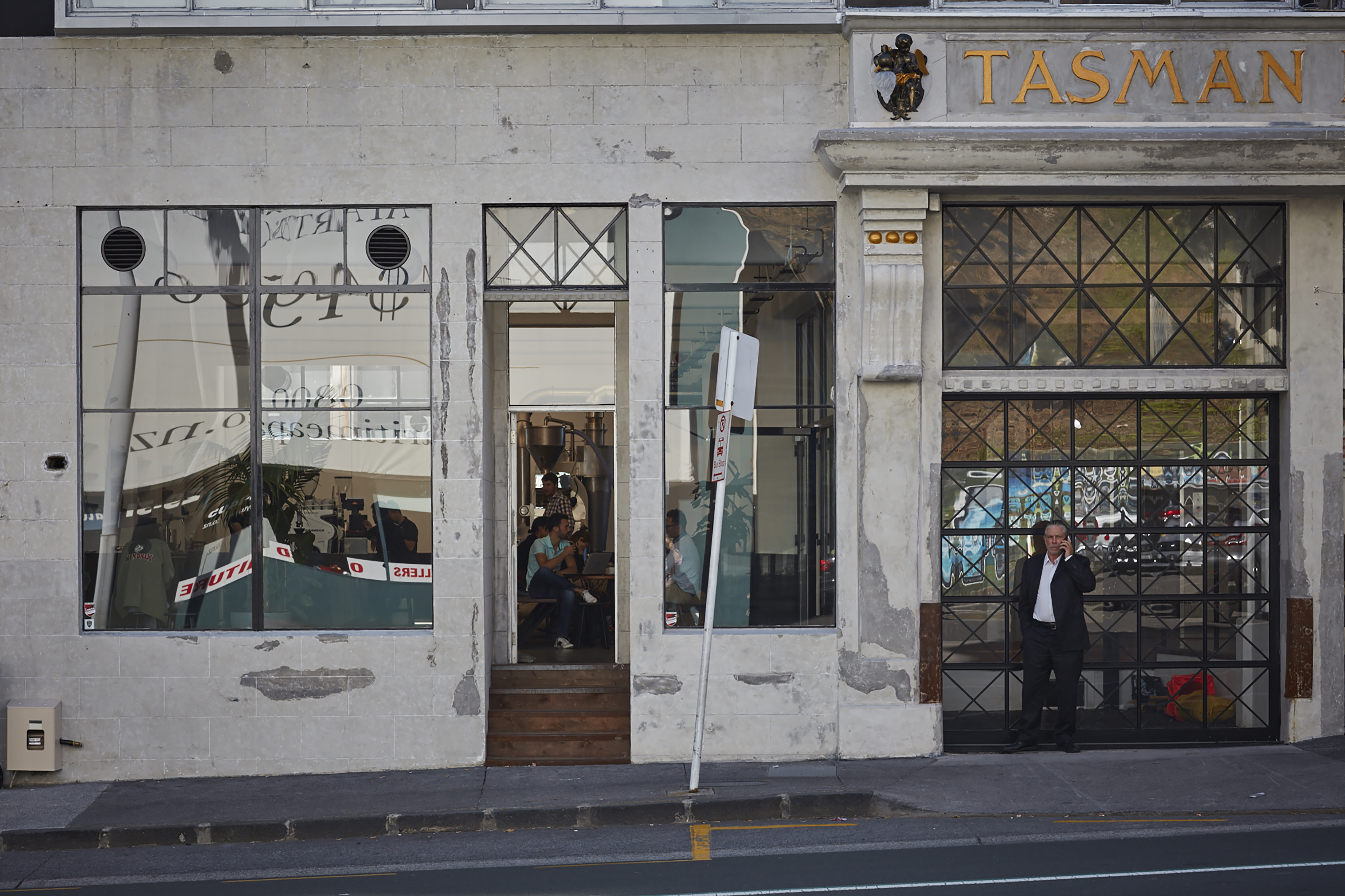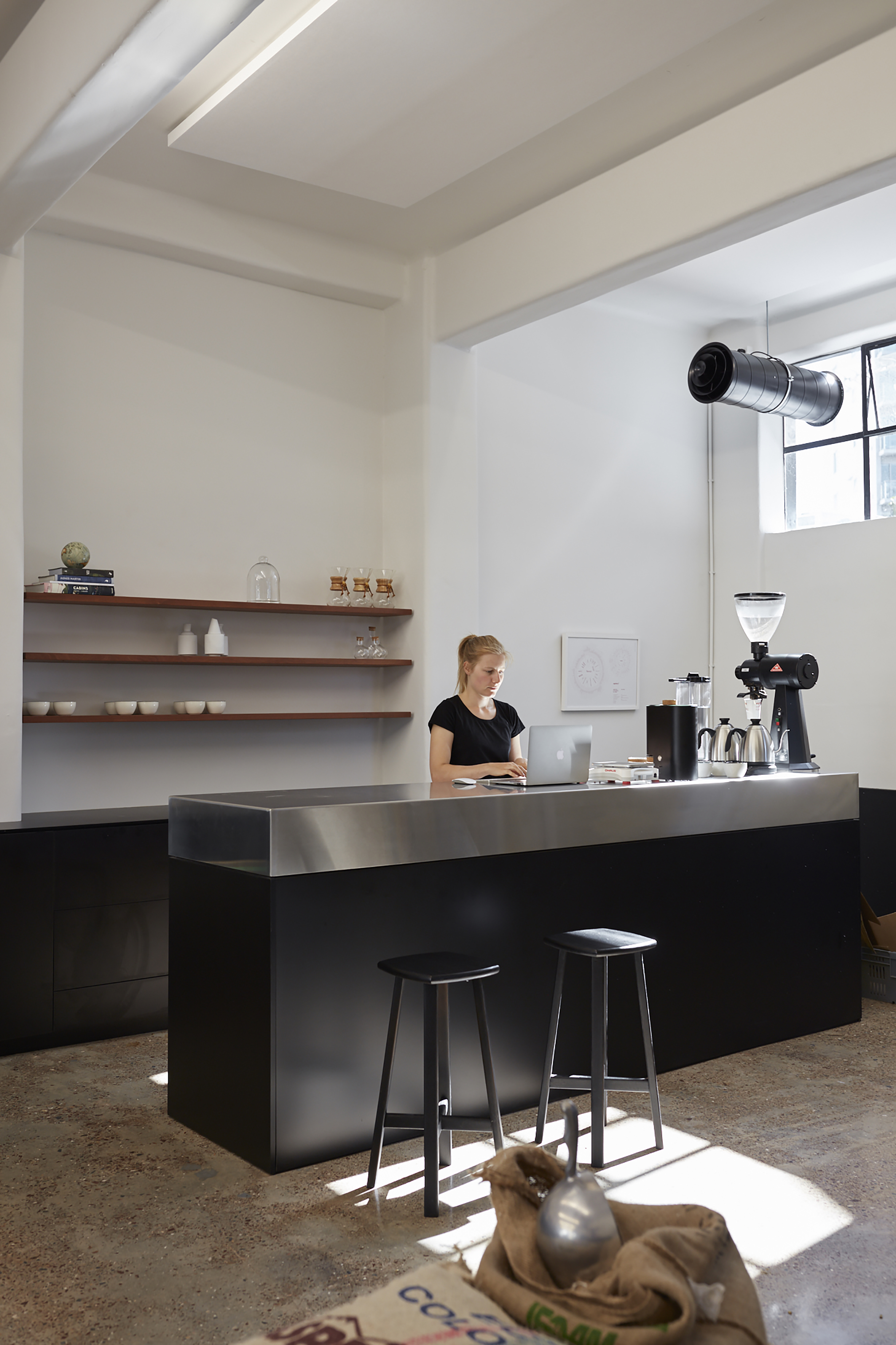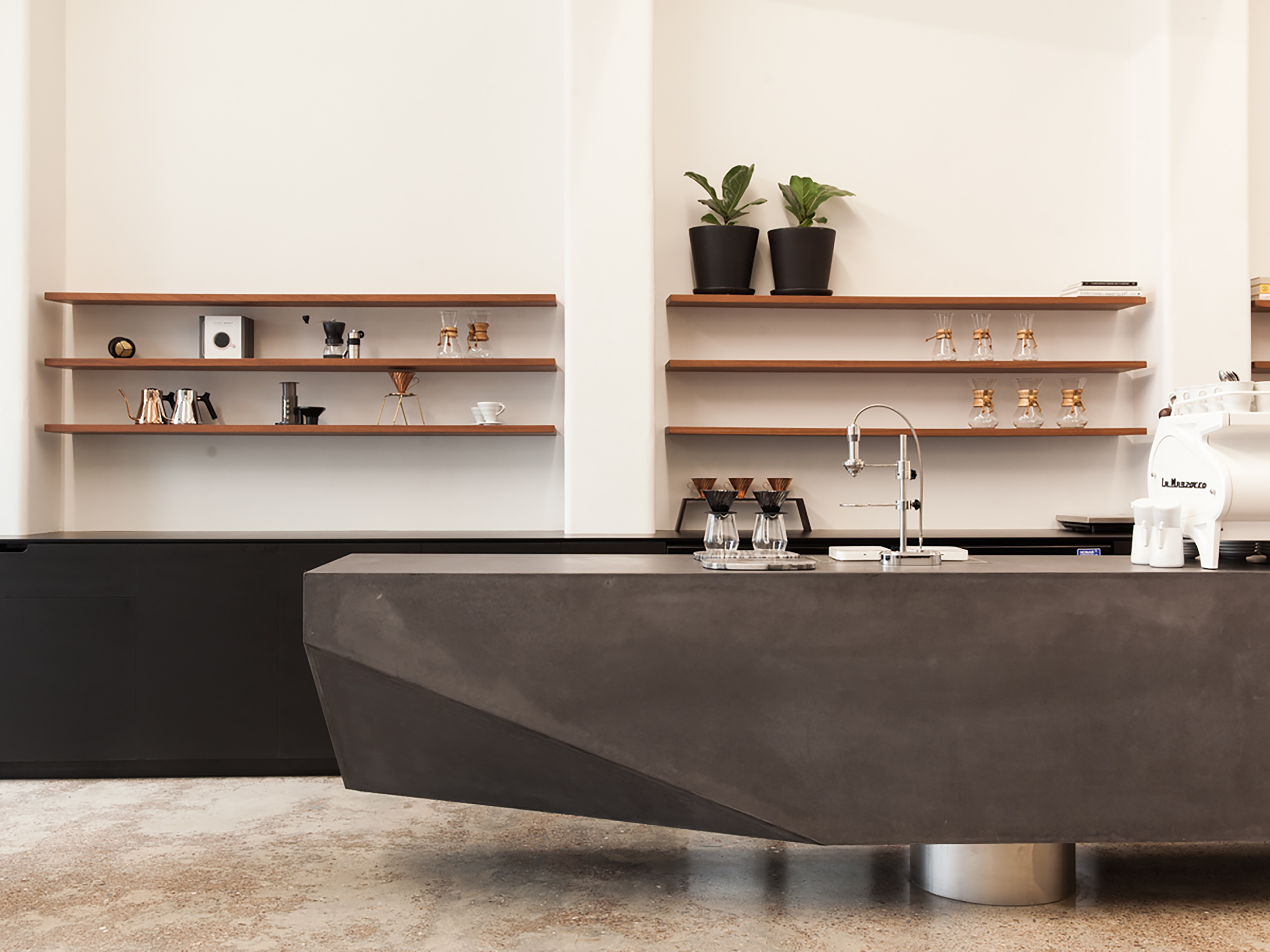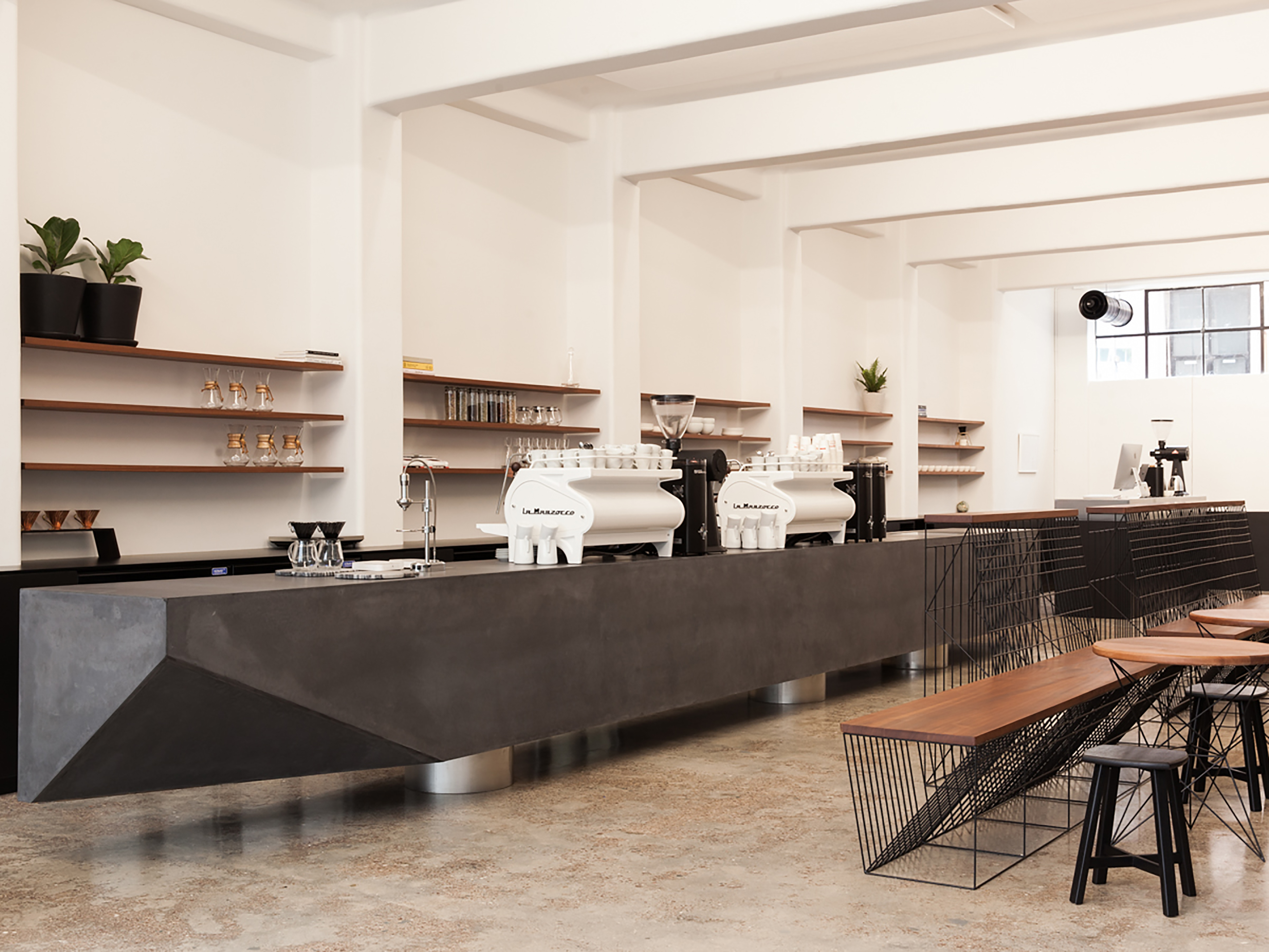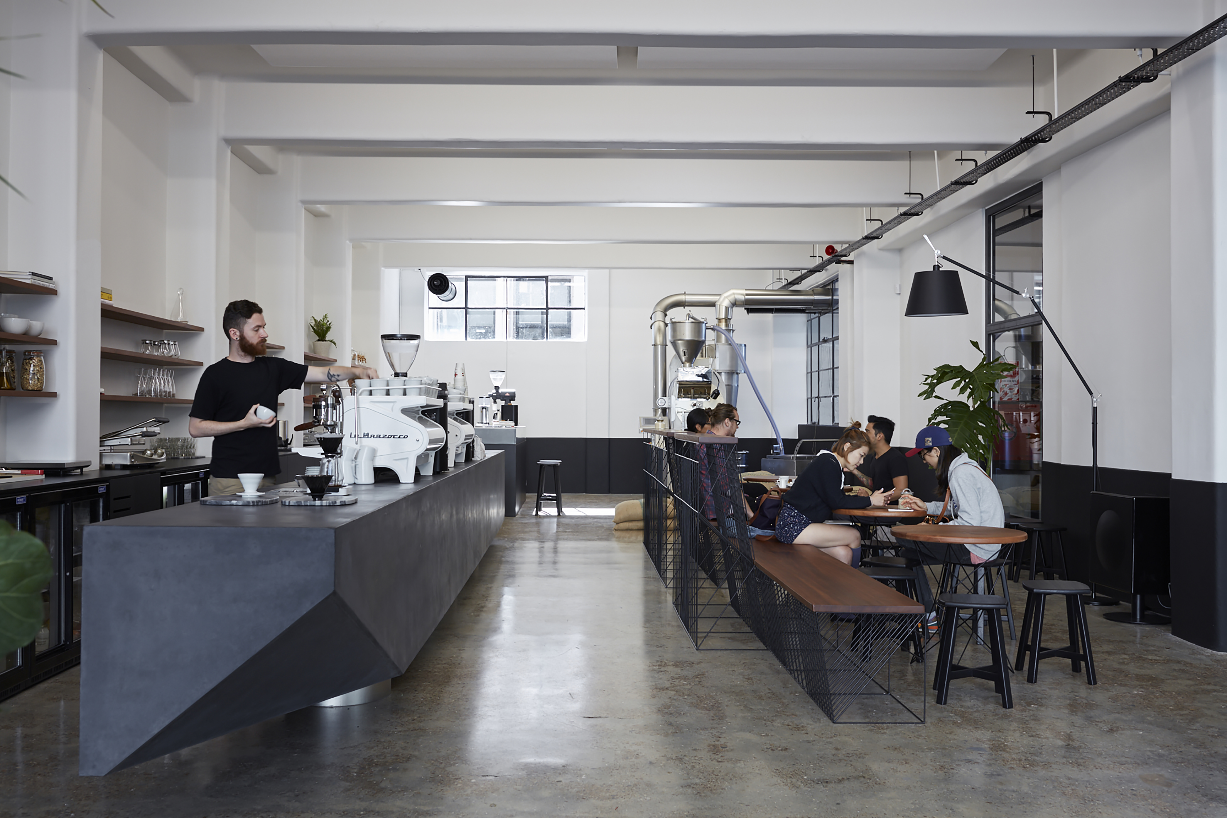 It’s harder than it looks to fit out an empty space with minimalist design, but with the Eight Thirty Roastery on Anzac Ave, Glamuzina offer a deeply satisfying little masterclass in how to go about it. The deep rectangular shape in an old warehouse building has been cleaned up, painted a creamy near-white above the line and dark near-black below, with the original and much-trammelled concrete floor polished back into service. An enormous new GRC counter with a trapezoidal near end runs most of the length of the space, floating above the floor on cylindrical feet. It boasts two beautiful coffee machines, complete with custom-made wooden handles and lids. The roasting operation takes place in full view at the rear, while towards the front custom-made cafe furniture features intriguing wire latticework. It’s all immensely pleasing to the eye, relaxing to be in, and quietly humming with the sense of good work underway. The smell of the roast helps, of course, but it’s the architecture that truly satisfies.