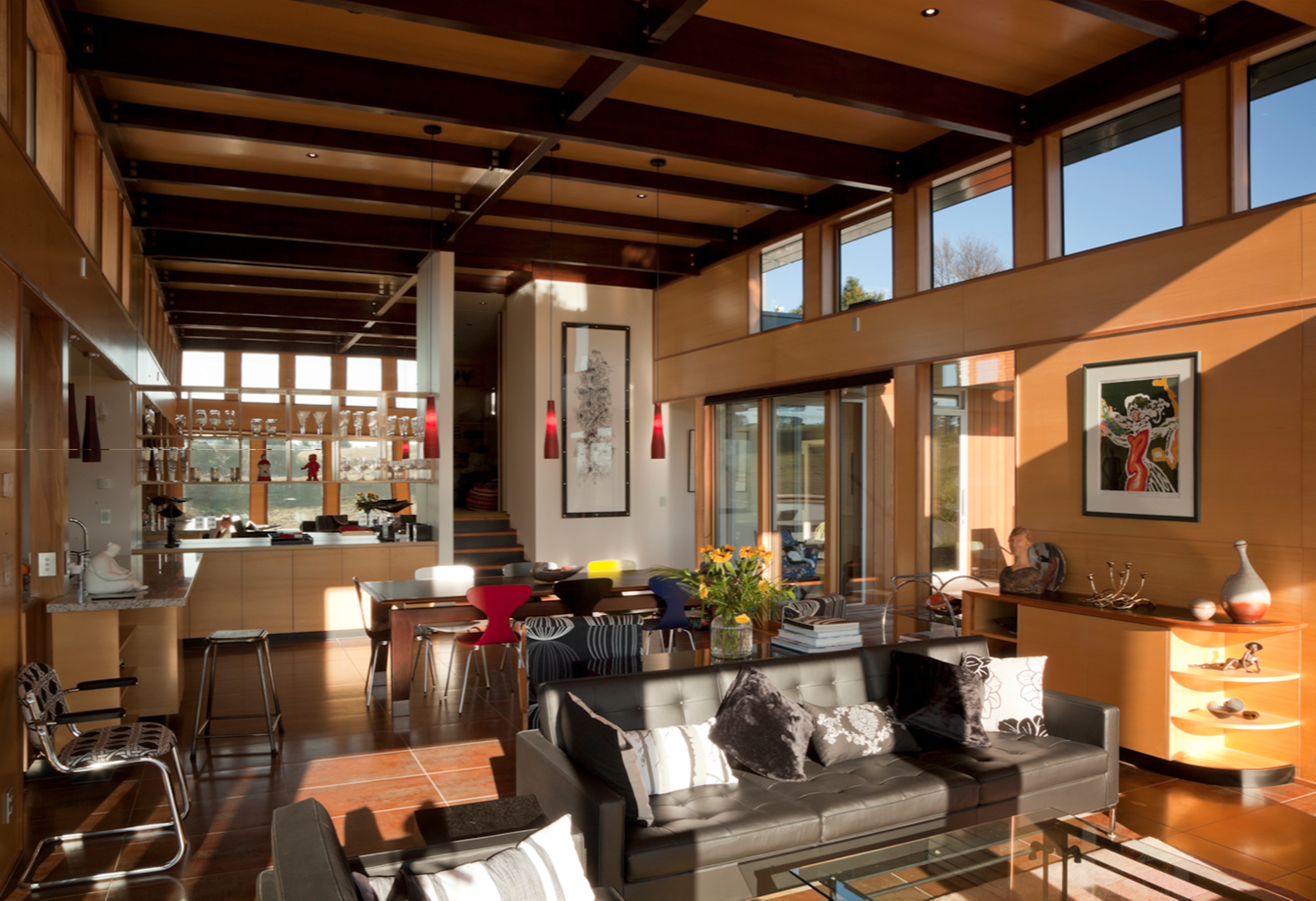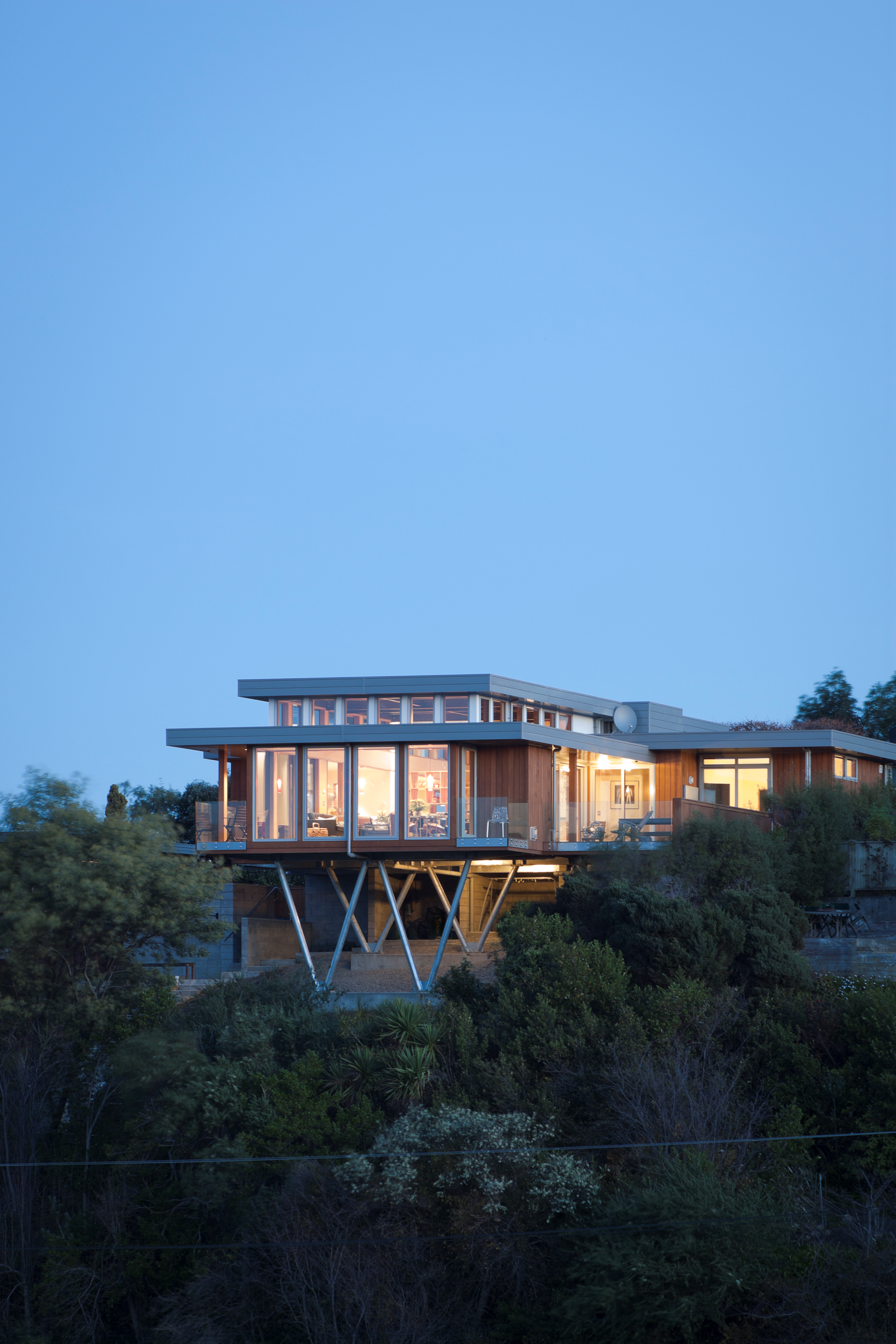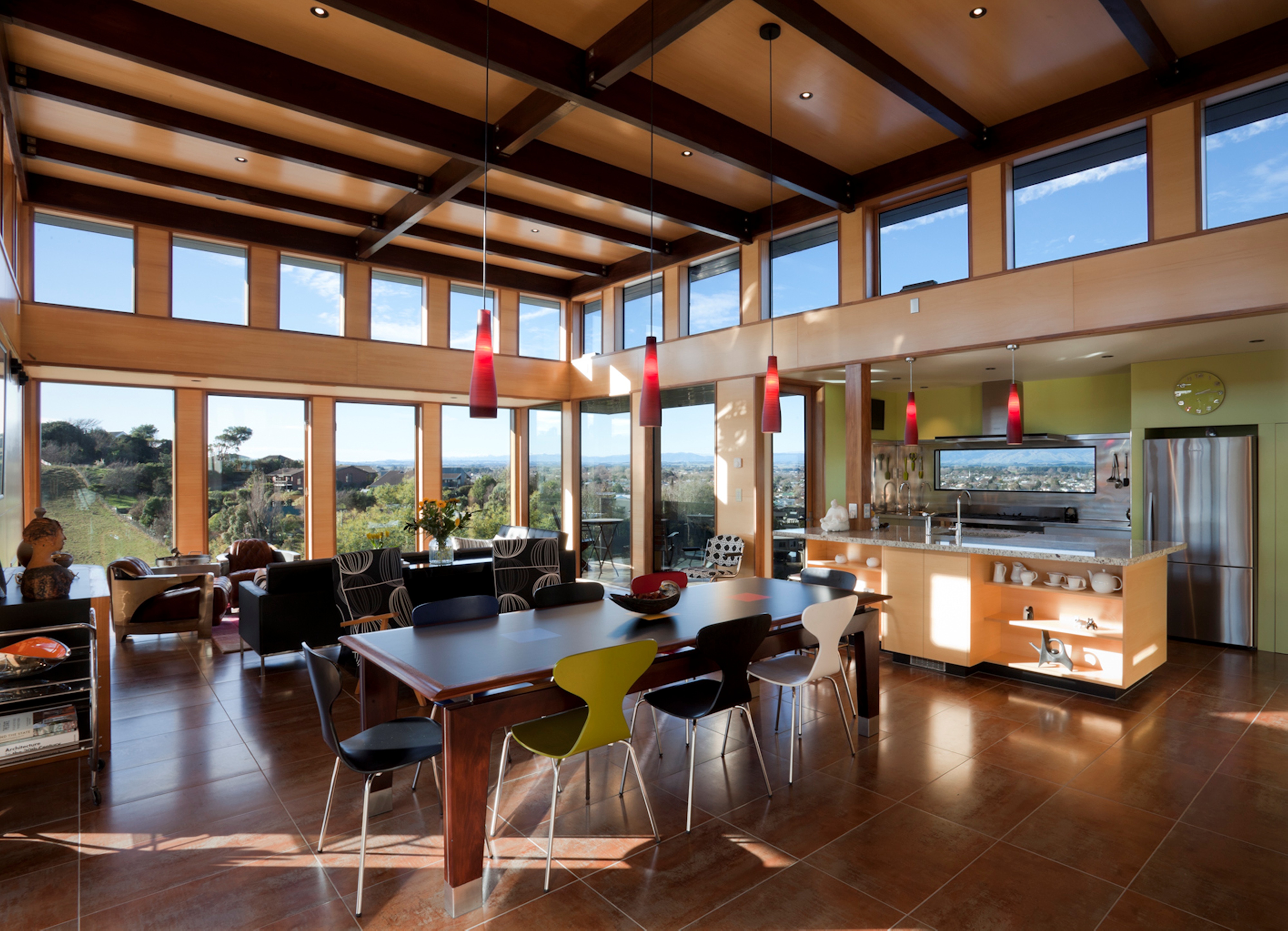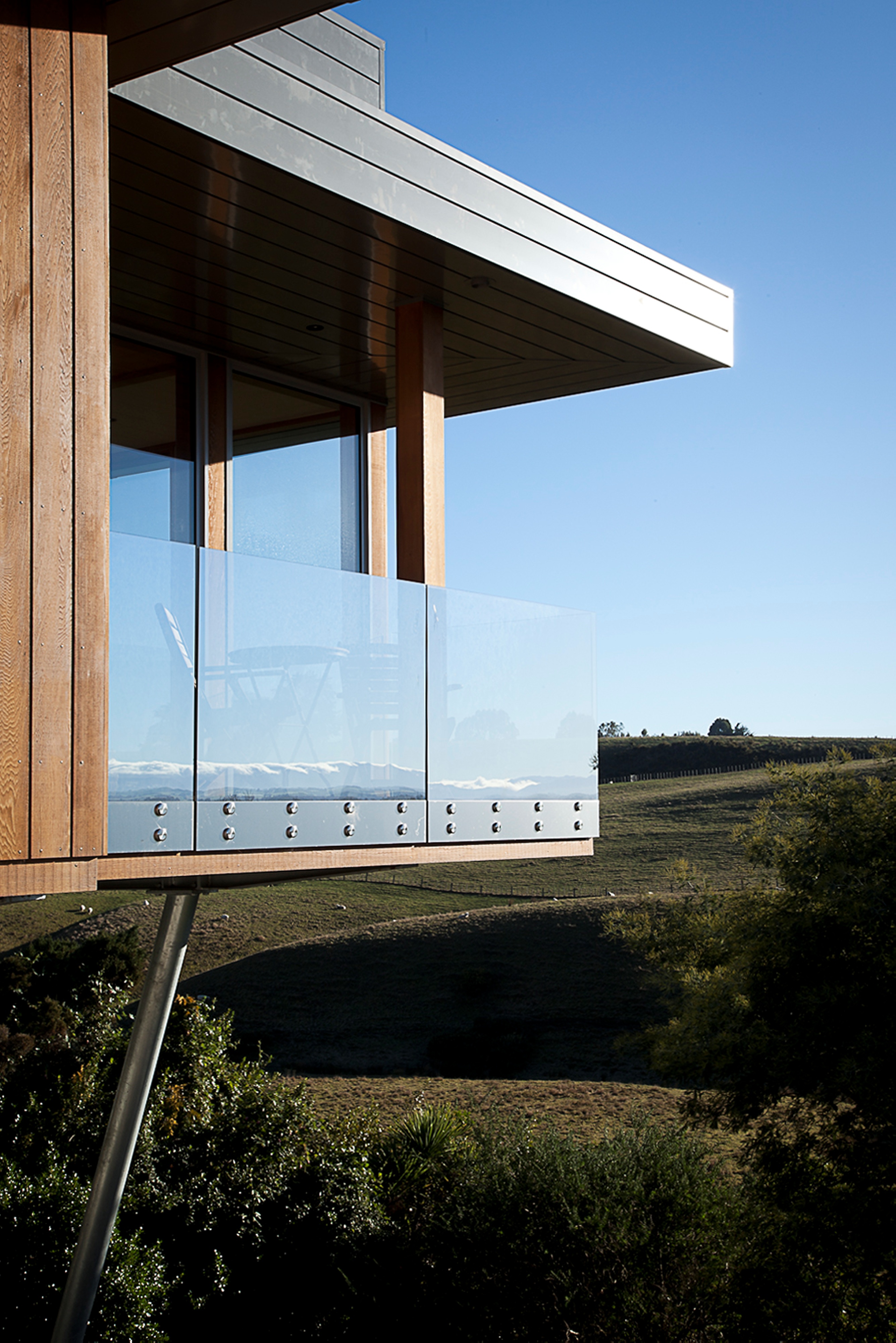 Mondrian-inspired cladding is a subtle hint at the dégustation of art awaiting inside the entrance of this house, which hunkers down into the top of a steep slope. Delving further inside, the floor drops away and the volume opens into living areas with views to the Manawatu plains and Ruahine Ranges on the horizon. Outdoor ‘rooms’ to the east and west provide a perfect setting for entertaining and strengthen the connections to the rural landscape beyond.