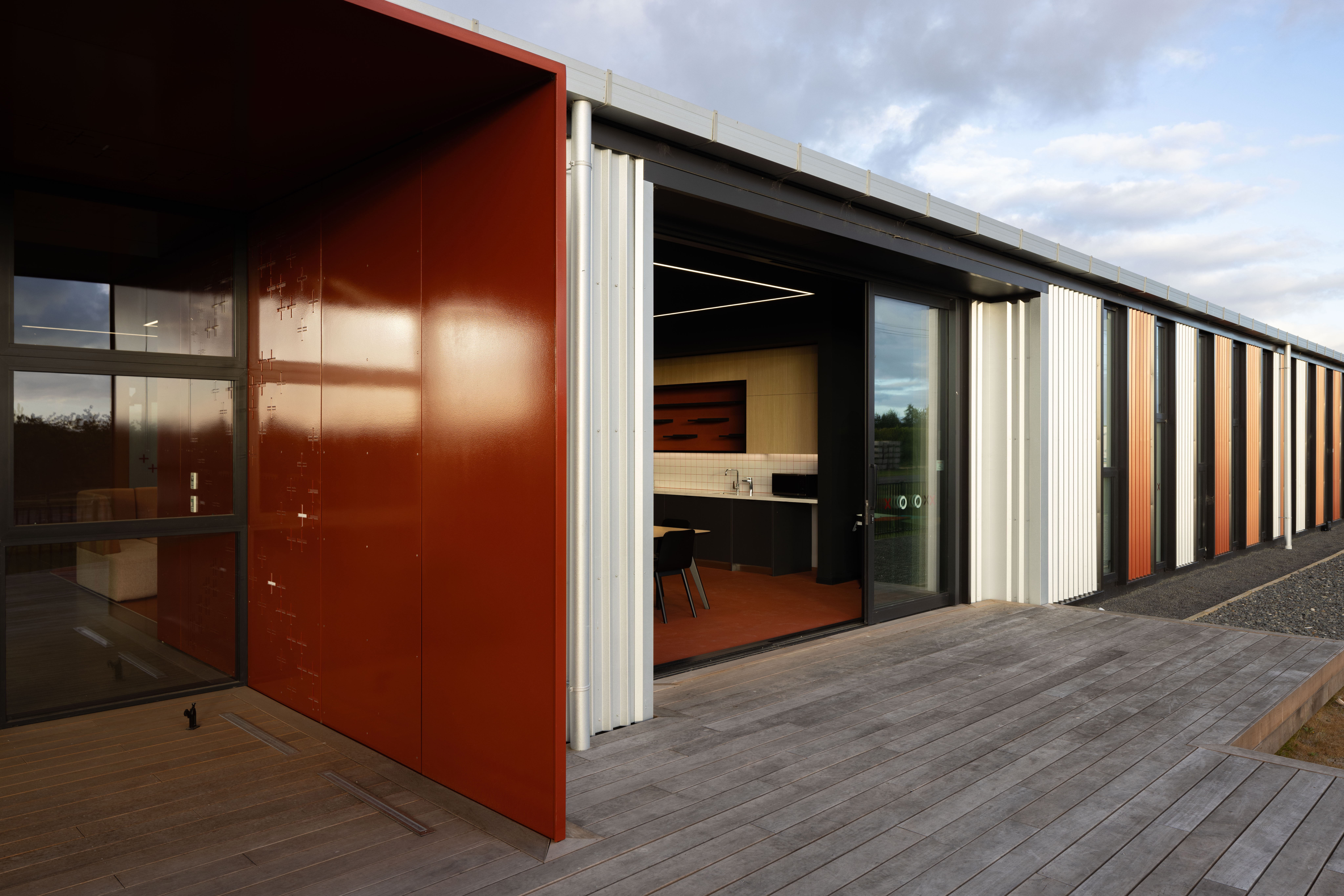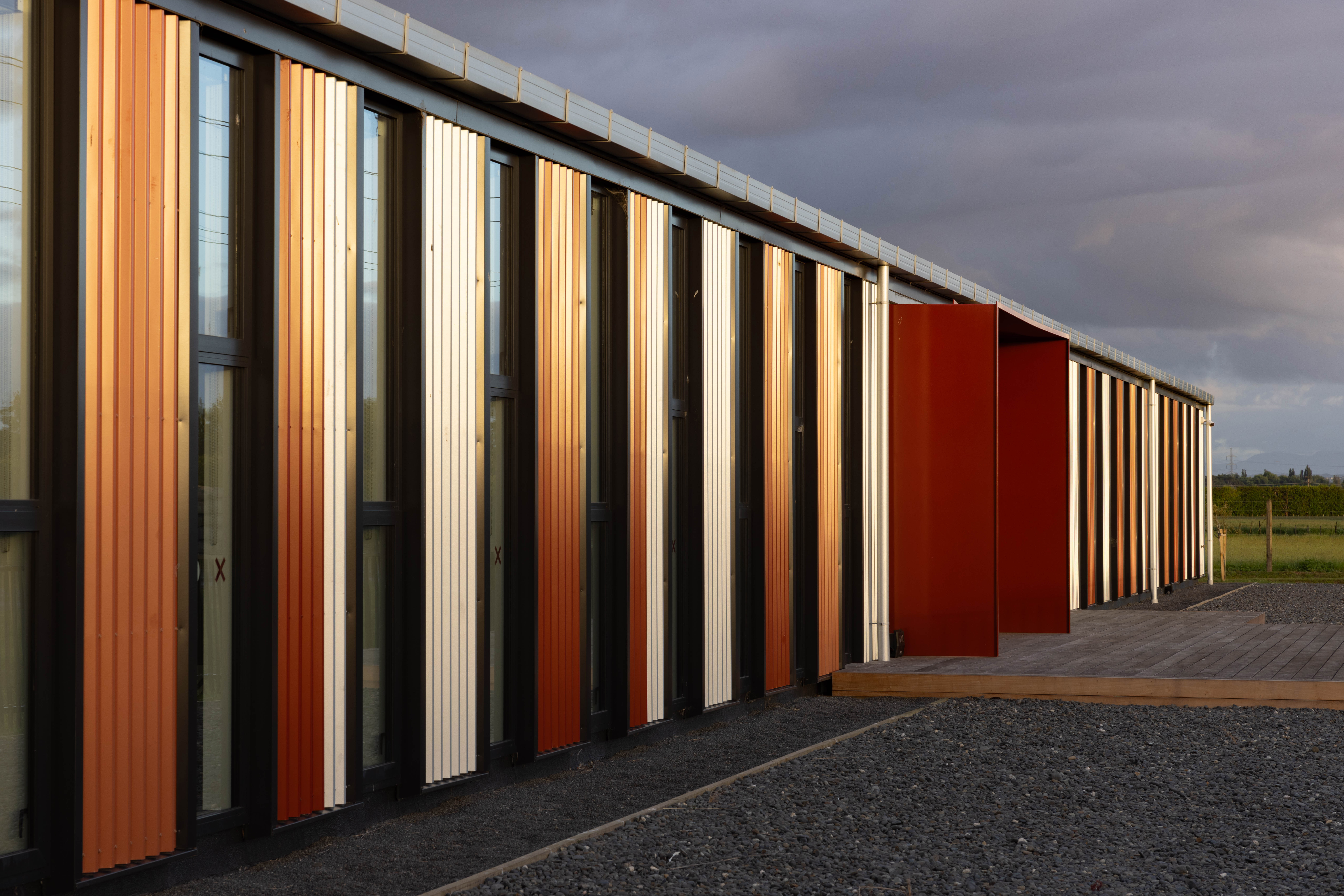 Foodeast – Haumako is a nationally significant food innovation hub that brings together industry, community, and culture in the heart of Heretaunga Hastings. Developed through a public-private partnership with regional and government support, Foodeast provides a future-focused base for Aotearoa’s agri-food sector. Named Haumako, meaning fertility or richness, the project honours a narrative gifted by local hapū elder Ngahiwi Tomoana woven through the design’s colour palette. The architecture of Foodeast – Haumako is both infrastructure and a landmark of innovation, enabling the sharing of knowledge and collaboration.The project comprises two gabled buildings referencing the rural shed vernacular: one for flexible office tenancies and shared conferencing facilities; the other, a set of adaptable industrial tenancies. Durable materials, cost-effective construction, and a simple structural approach ensure longevity and adaptability.
