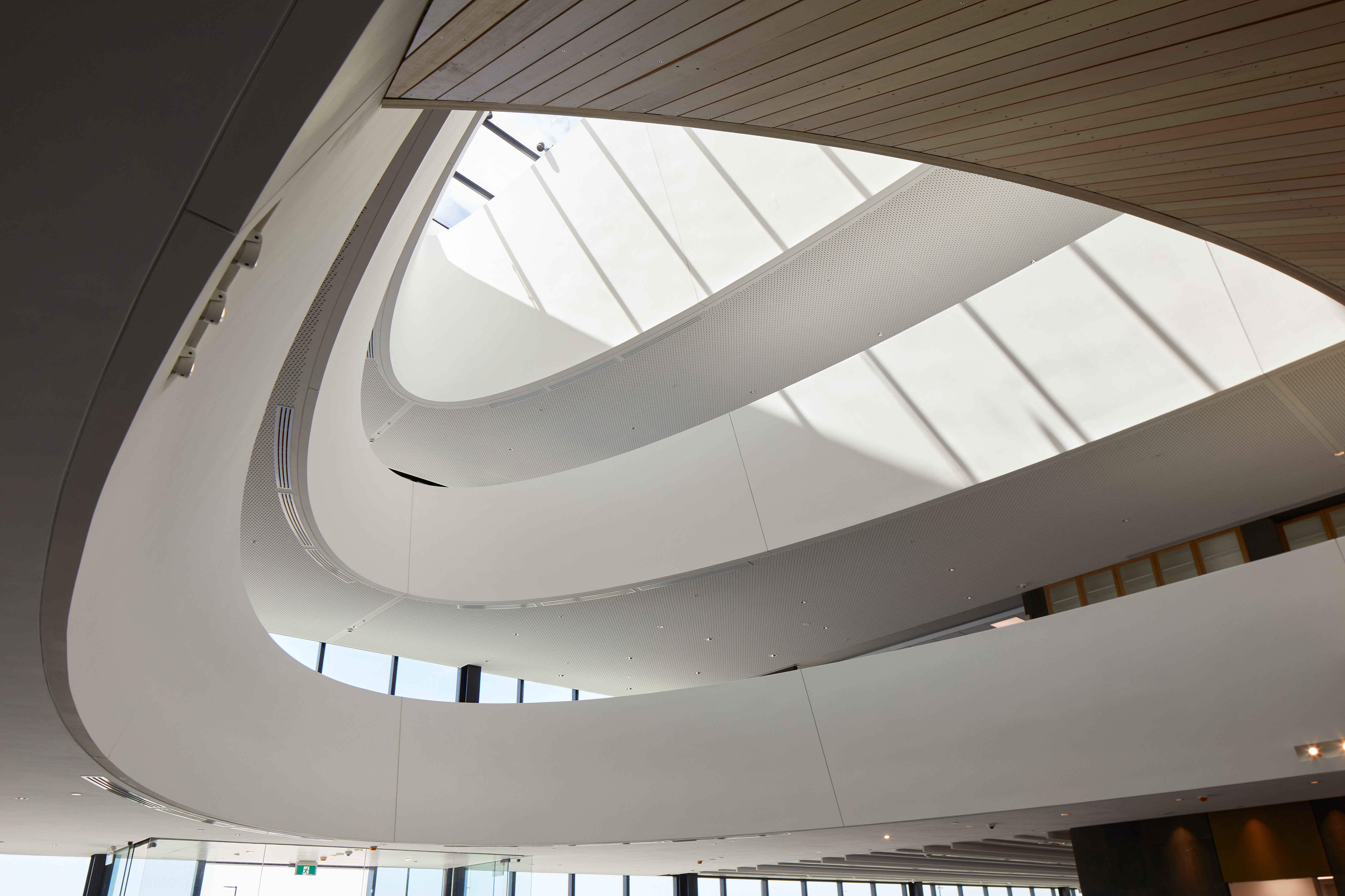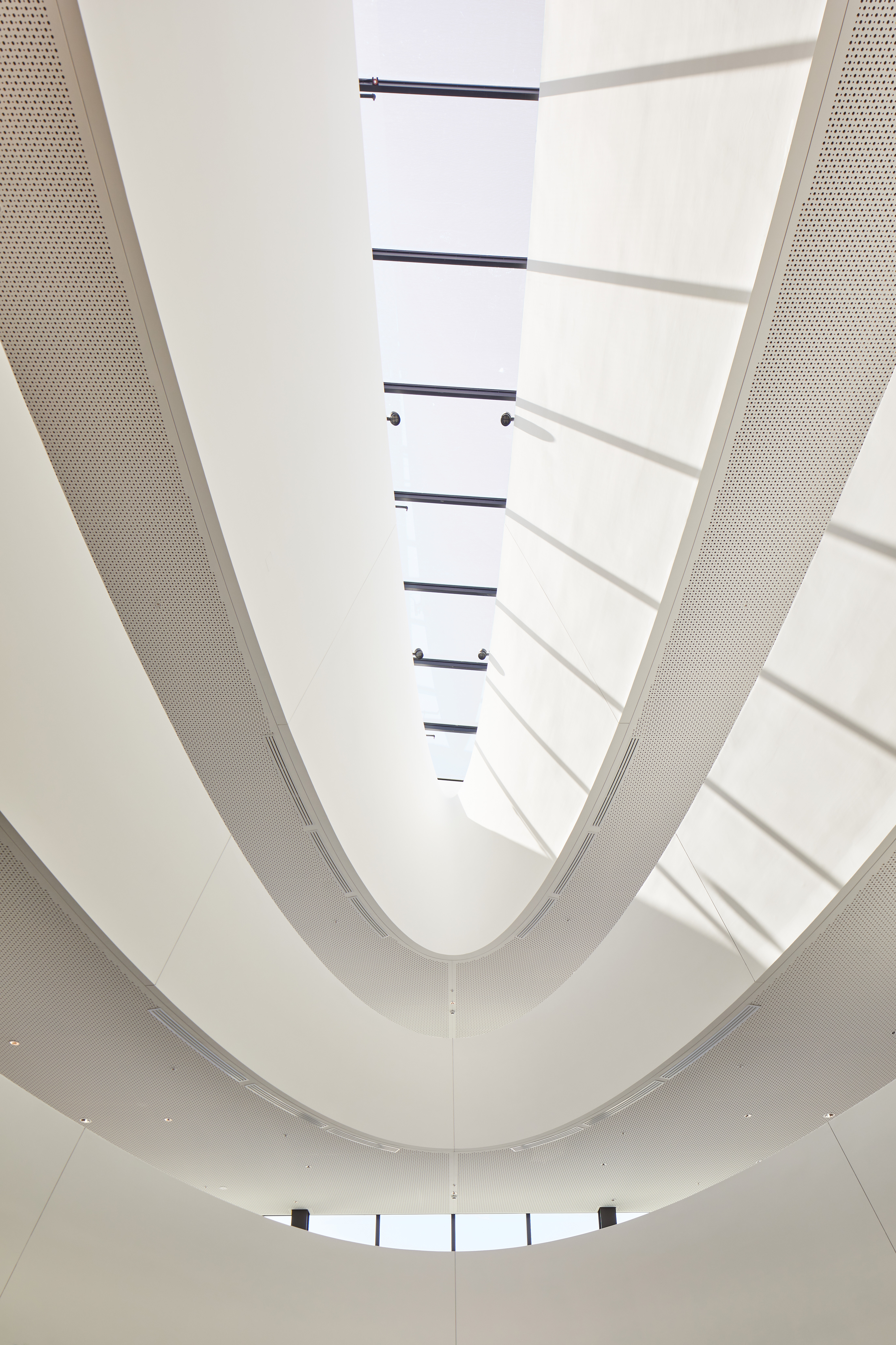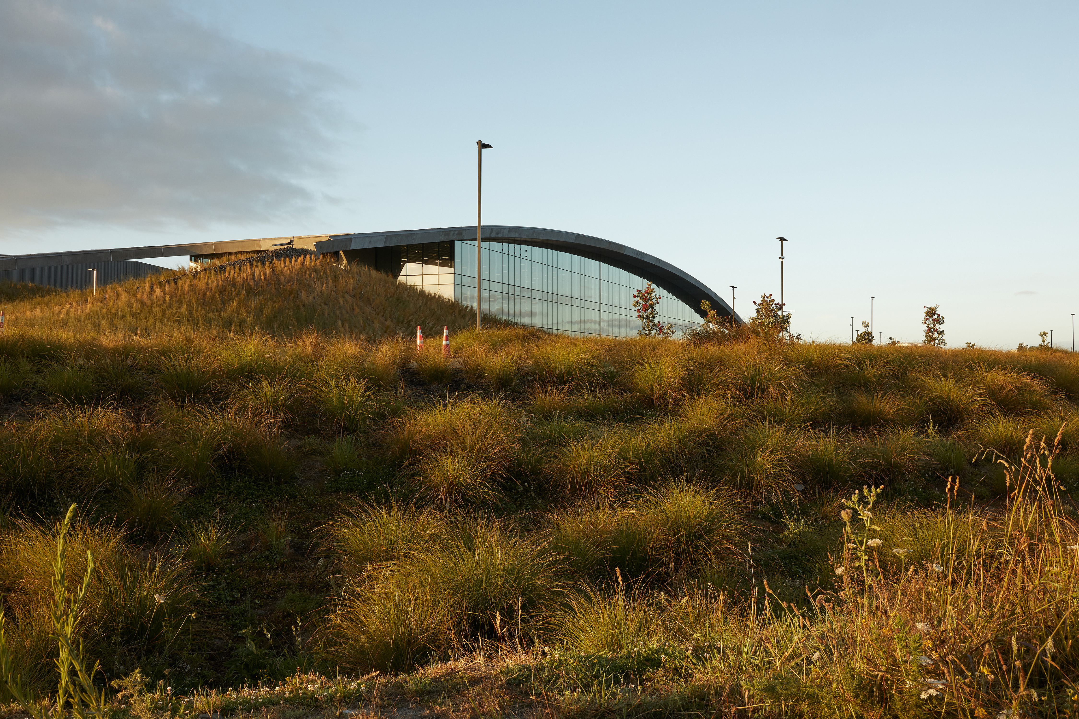 Monk MacKenzie has designed a heroic and sculptural office building that rises from the earth like a giant piece of land art. The architects have transformed a flat site and generic programme into an ethereal and other-worldly project through an impressive dedication to symmetry. A decision to use the landscape to tie the building down and soften its bulk is inspired, and the dramatic, parabolic forms used in a top-lit atrium add air and light. The beautiful organic form combined with polished detailing in earth, stone, GRC and concrete is full-on architectural drama on an epic scale.