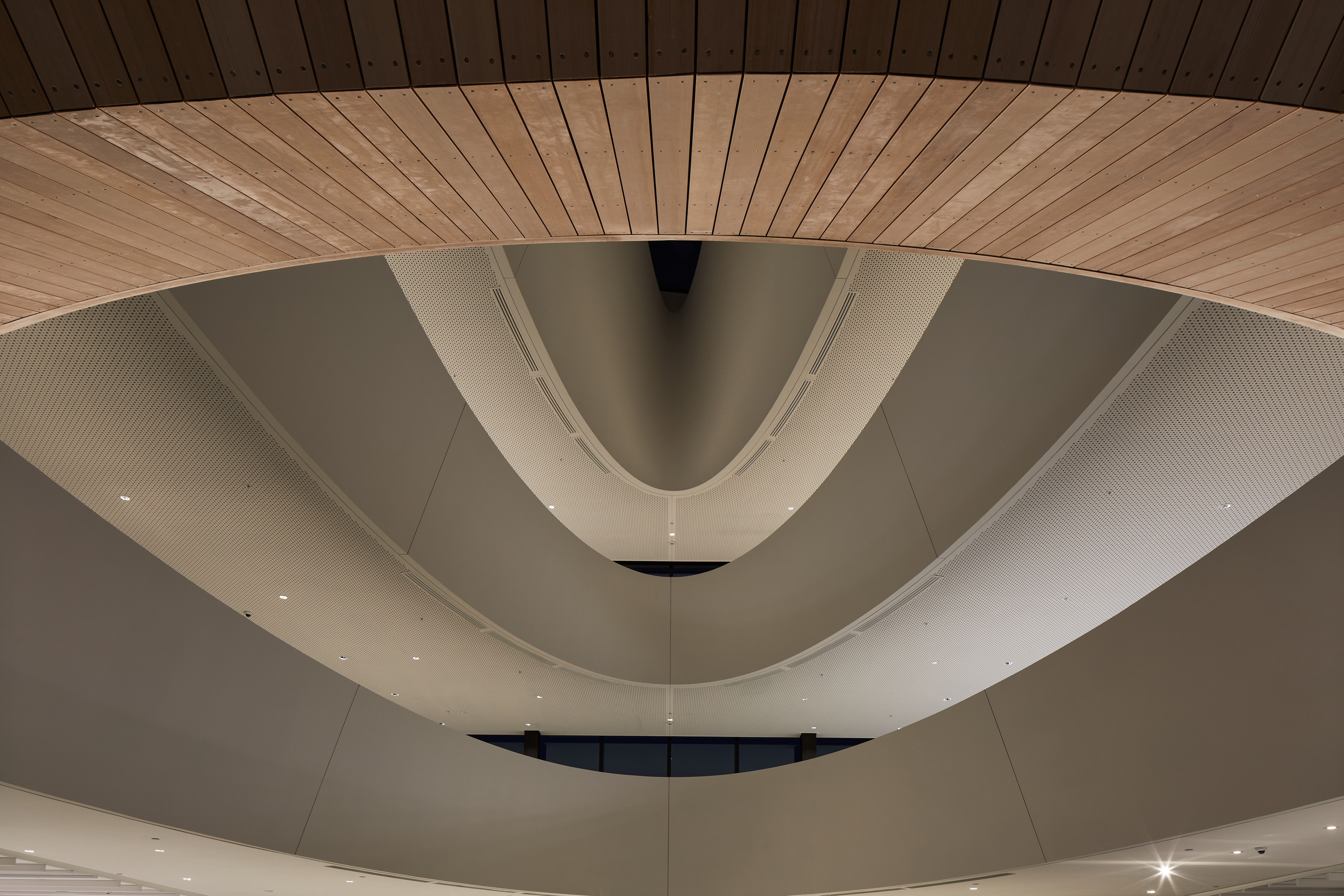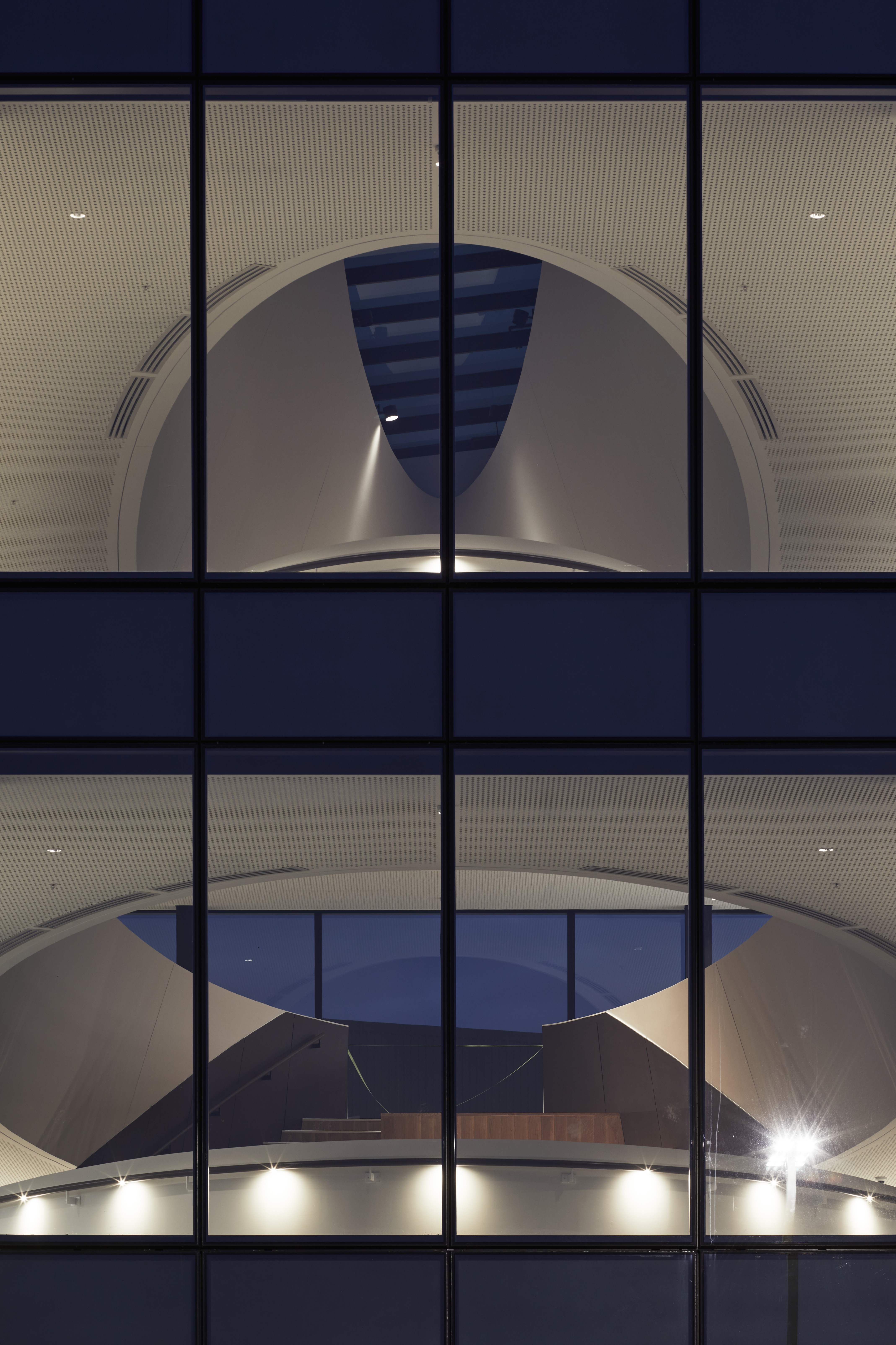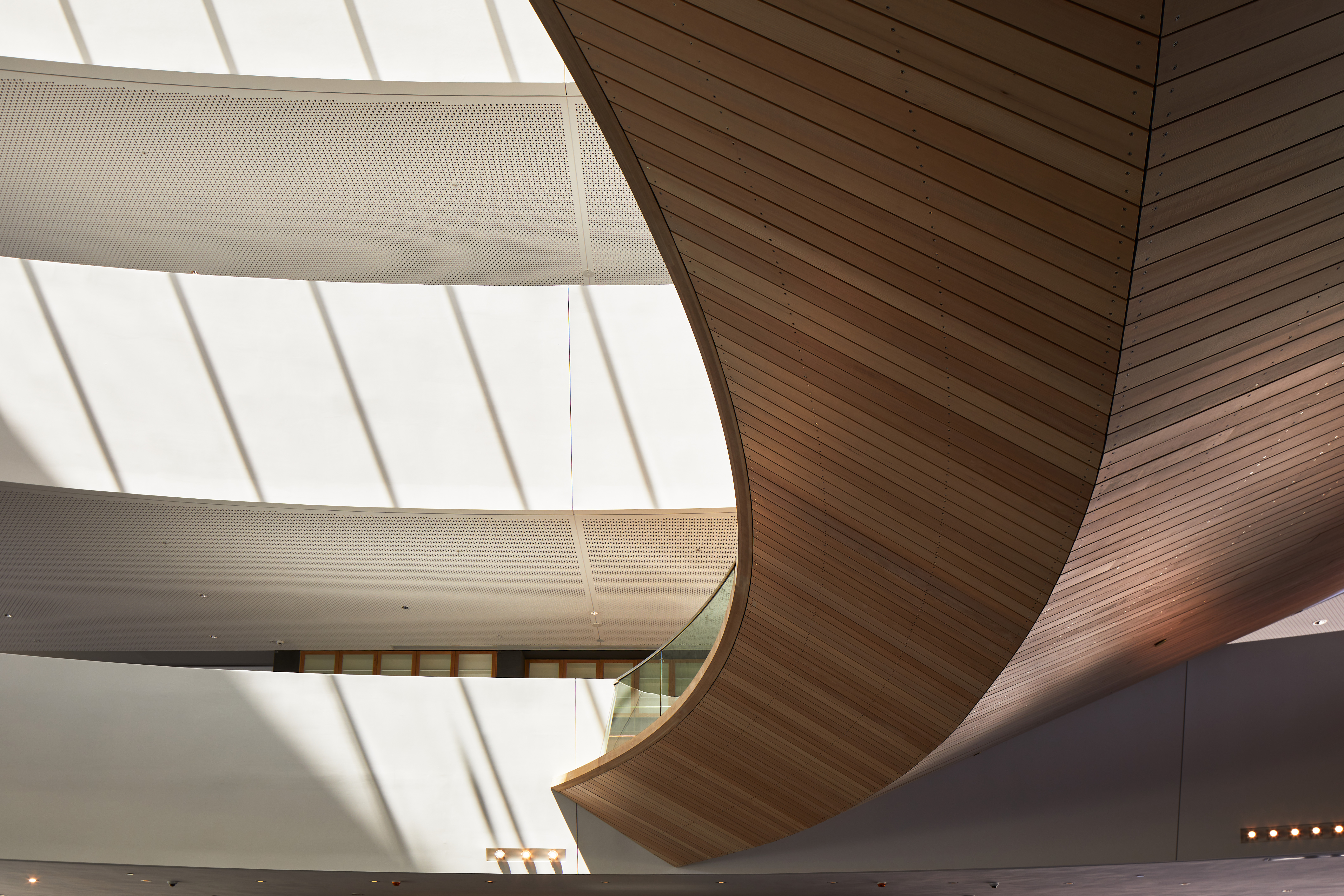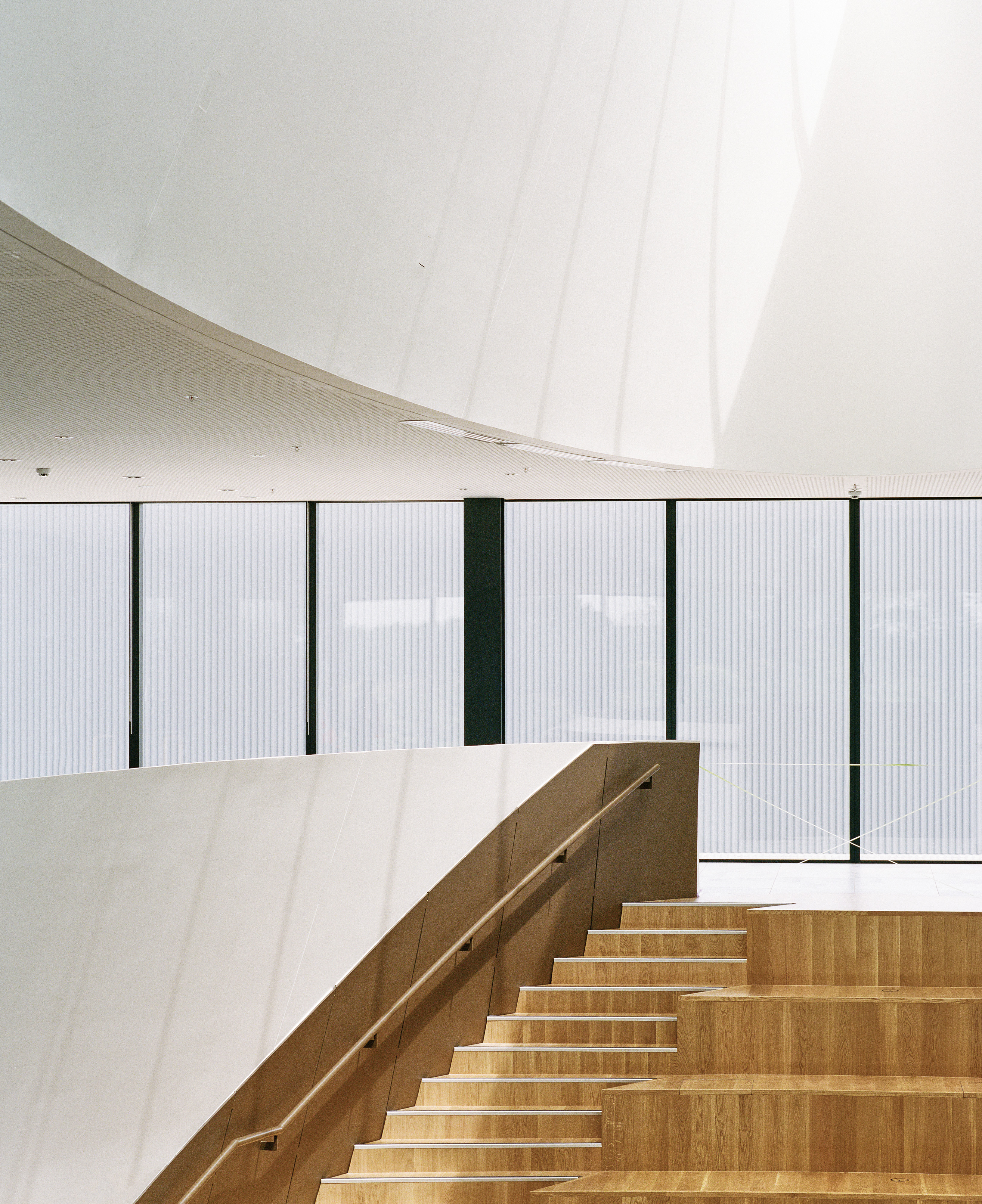 Monk MacKenzie has designed a heroic and sculptural office building that rises from the earth like a giant piece of land art. The architects have transformed a flat site and generic programme into an ethereal and other-worldly project through an impressive dedication to symmetry. A decision to use the landscape to tie the building down and soften its bulk is inspired, and the dramatic, parabolic forms used in a top-lit atrium add air and light. The beautiful organic form combined with polished detailing in earth, stone, GRC and concrete is full-on architectural drama on an epic scale.