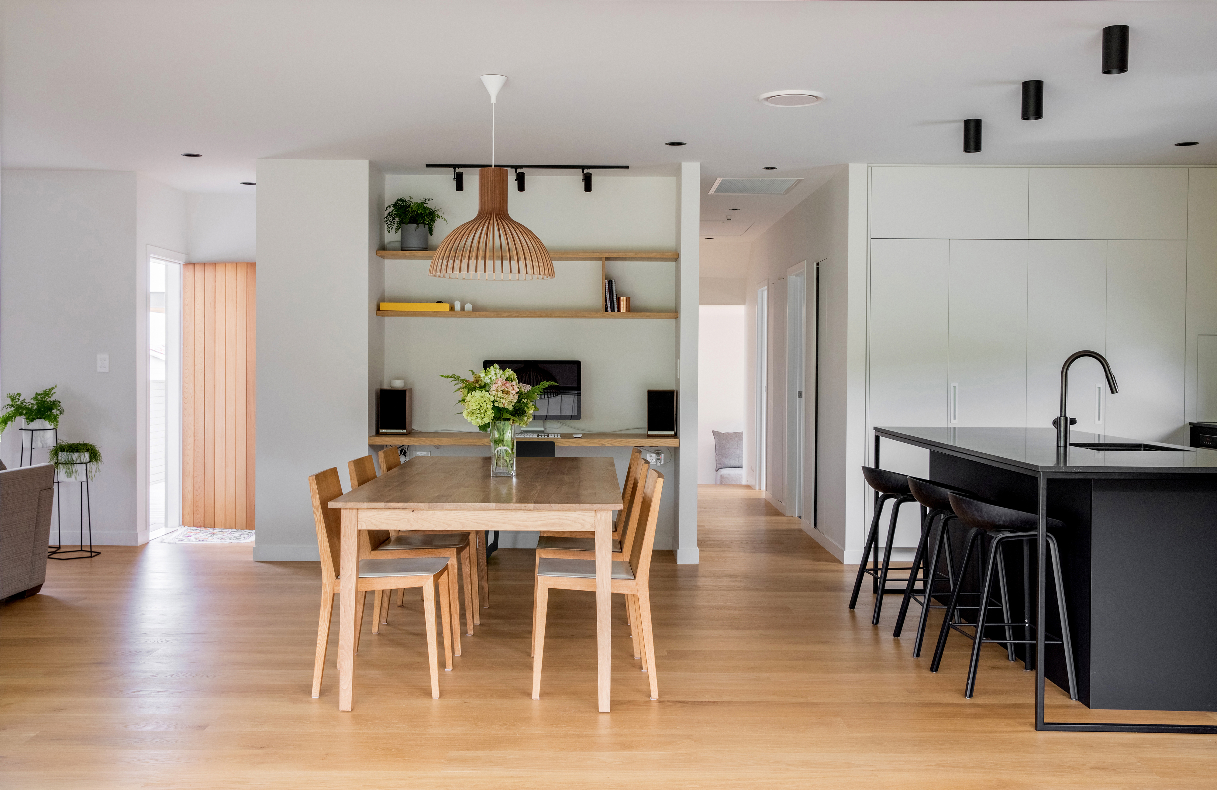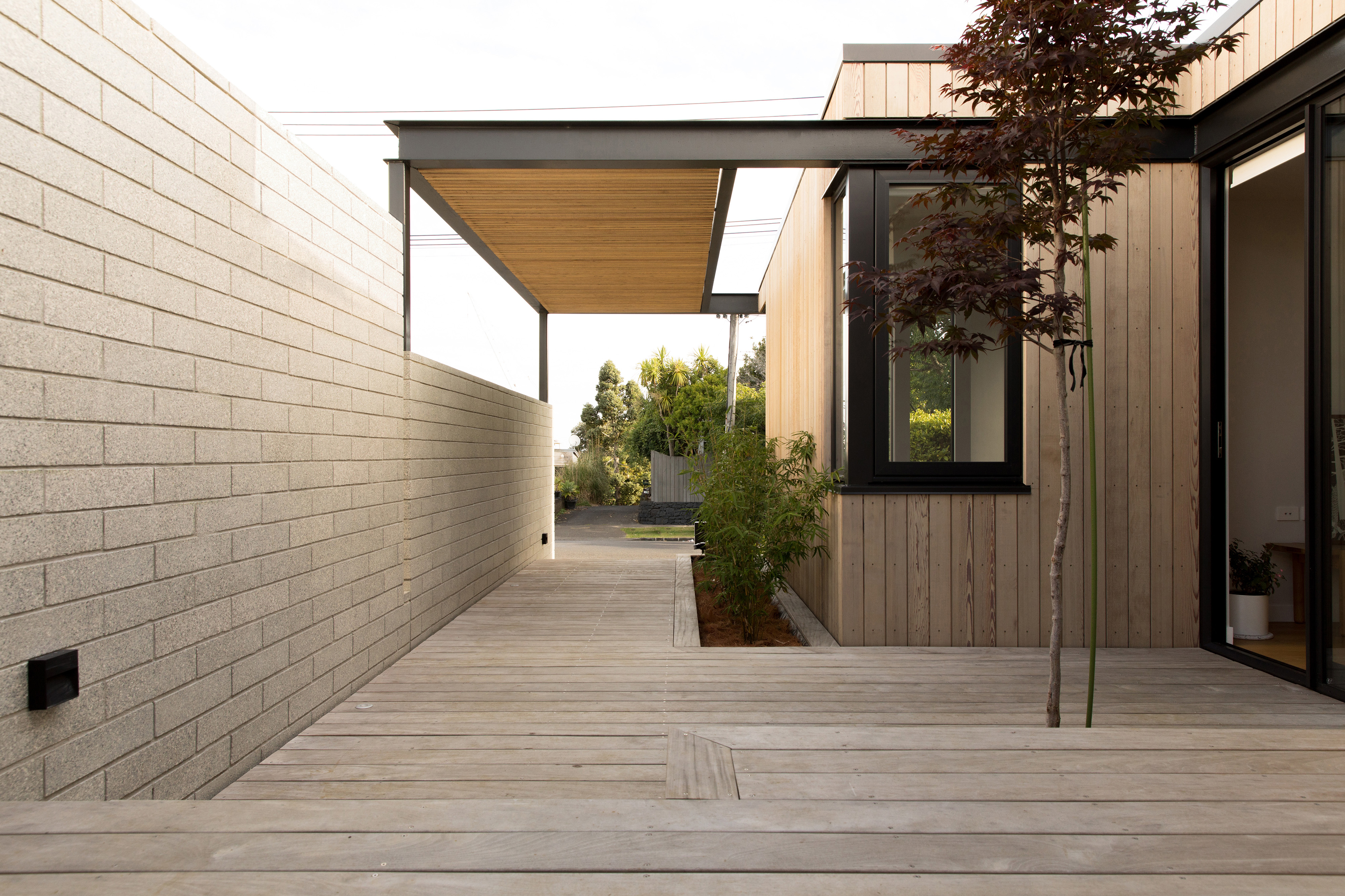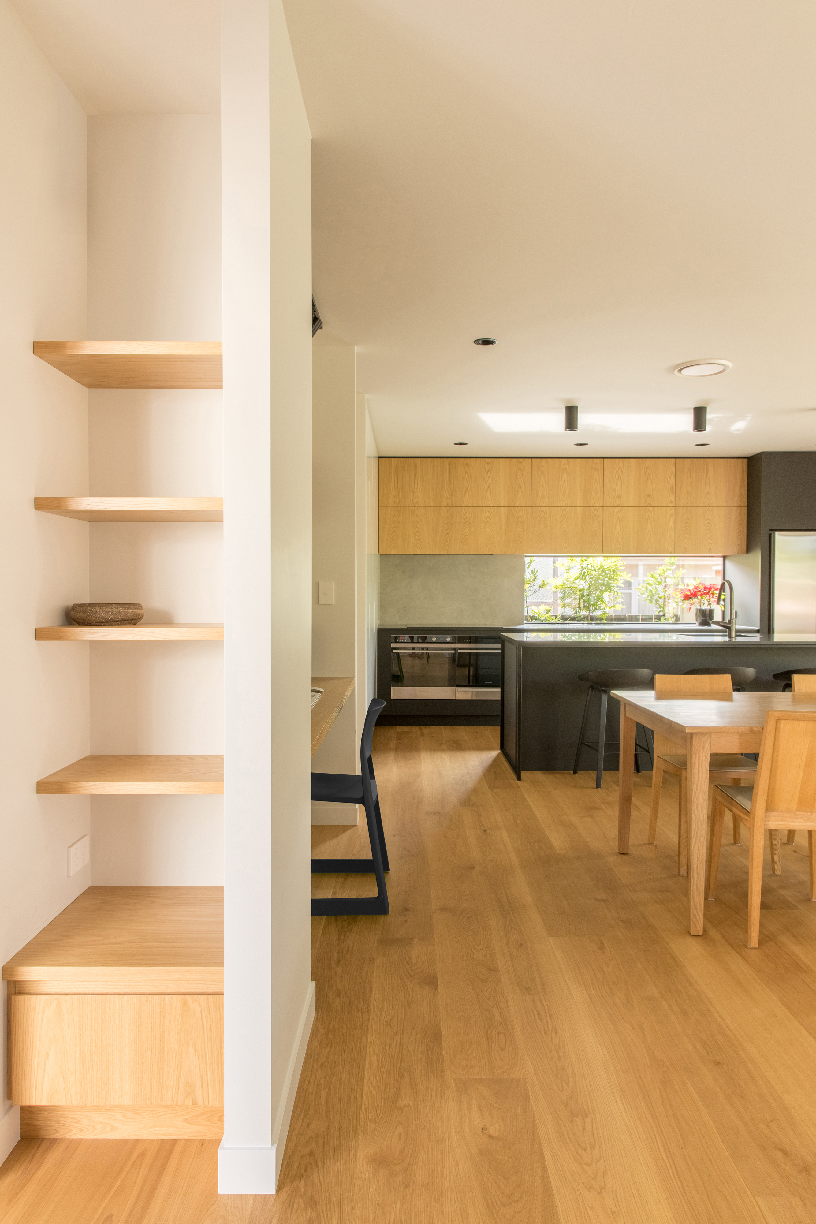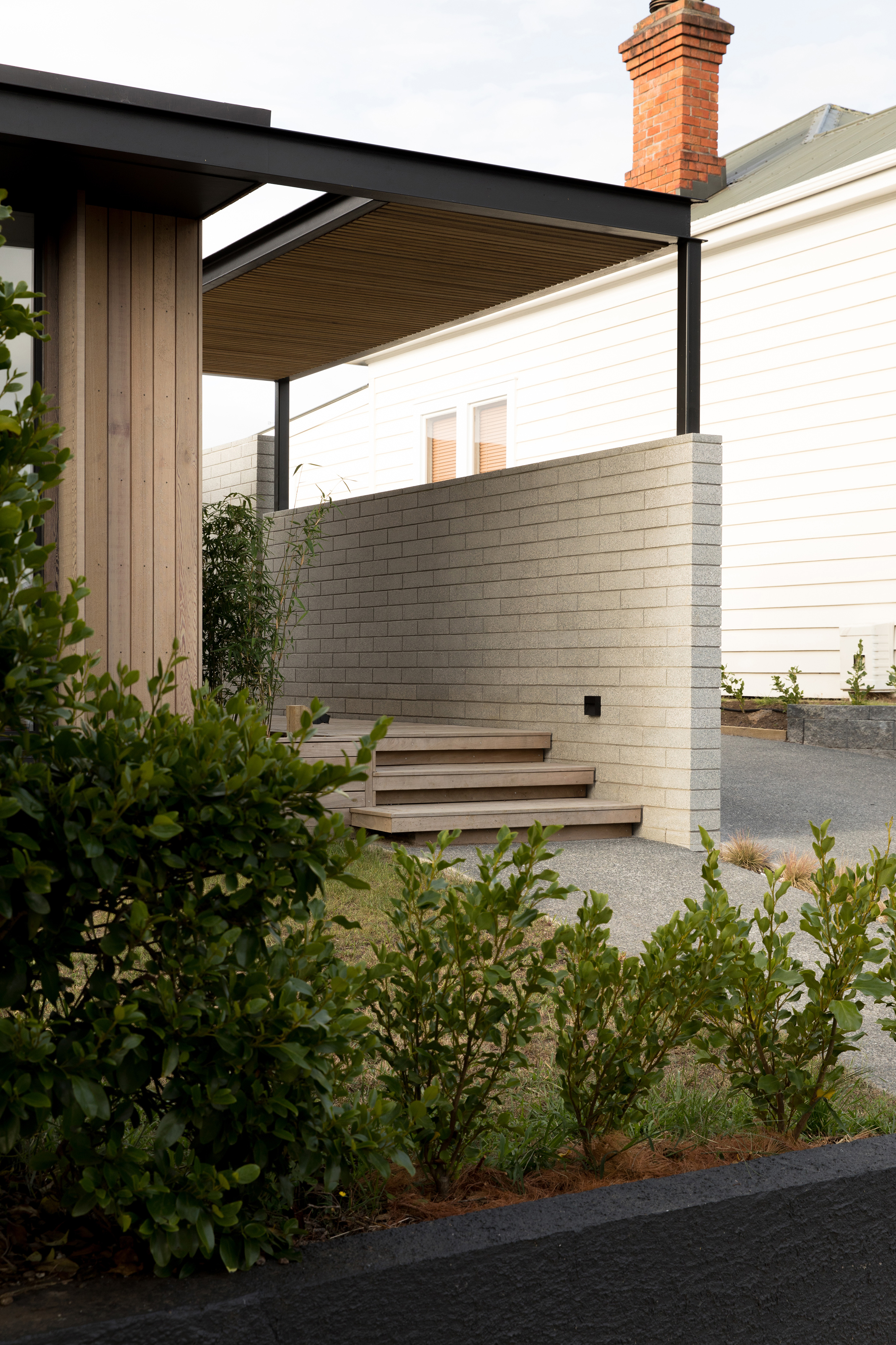 What a splendid example of a house designed for the changing needs of a family over time. With new zoning in place, Alignworks advised their clients of the potential to subdivide the property, should they wish to at some future date. They extended to the front, rather than the rear, so as not to compromise that possibility. They added a new driveway to serve front and back, screening it with a concrete block wall that also defines the signature entrance feature of the house: a generous stoop. Cedar weatherboards keep everything soft and elegant, and give a lift to the older form. The new frontage contains children’s bedrooms and a communal area with its own entrance that serves as a home study now, will become a children’s area as they get older, and one day may revert to home office. That’s work-at-home potential, thoughtfully incorporated, and it’s surprisingly rare. At the back there’s a big new living area and glazed rear wall that slides away to access a spacious deck with louvred shades and a large back garden. It’s one big space and many smaller ones, dedicated to the ebb and flow of family life and all its pleasures.