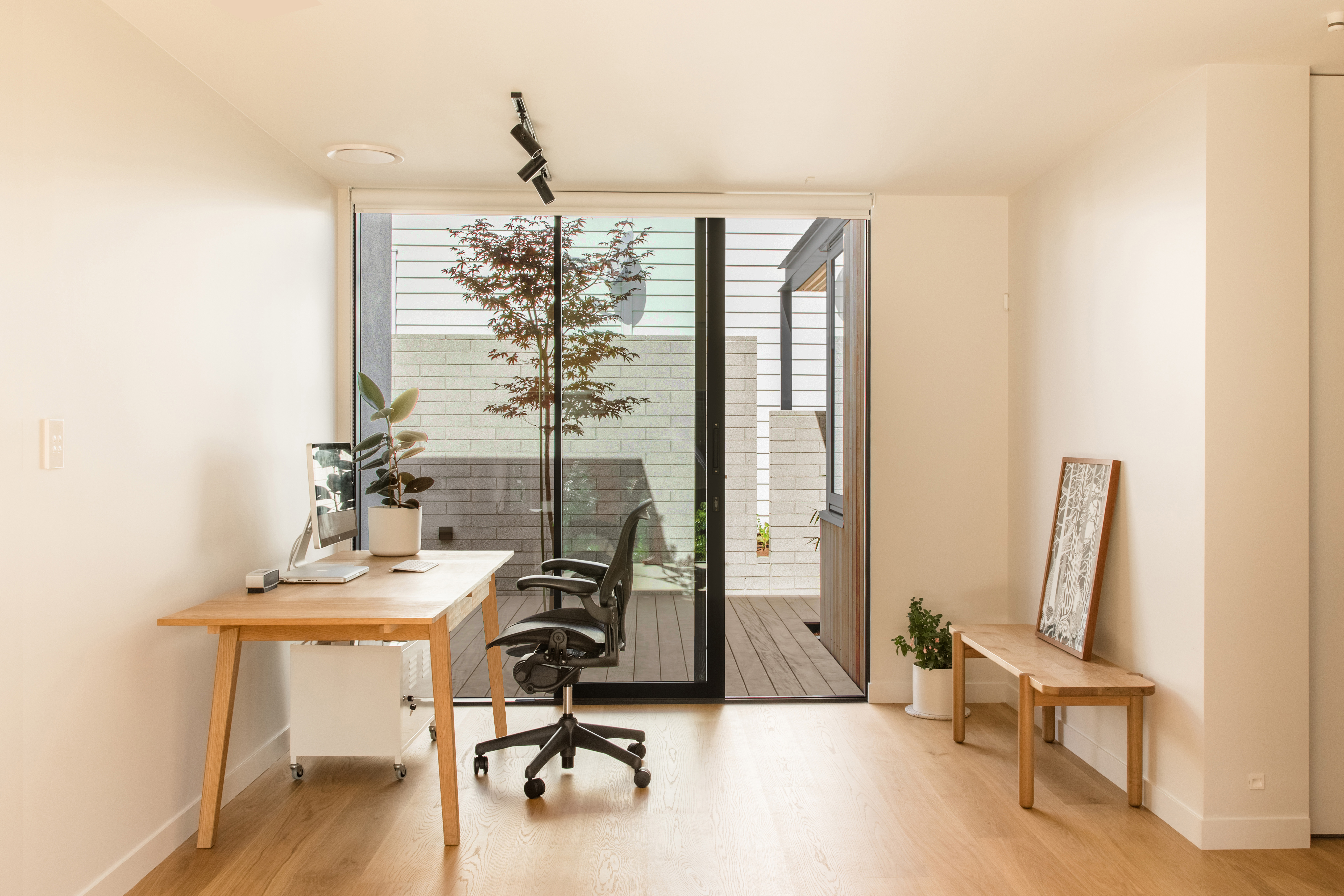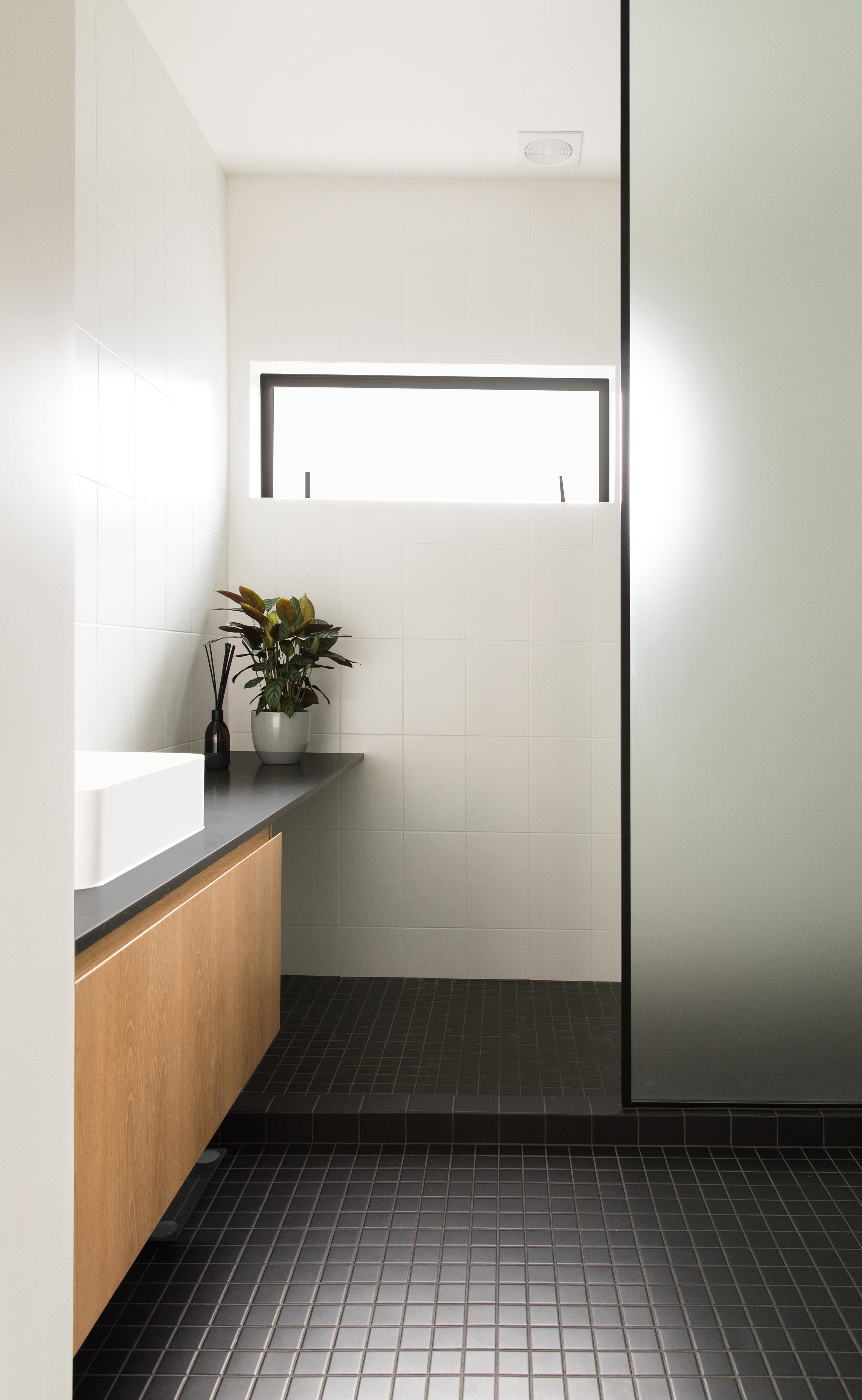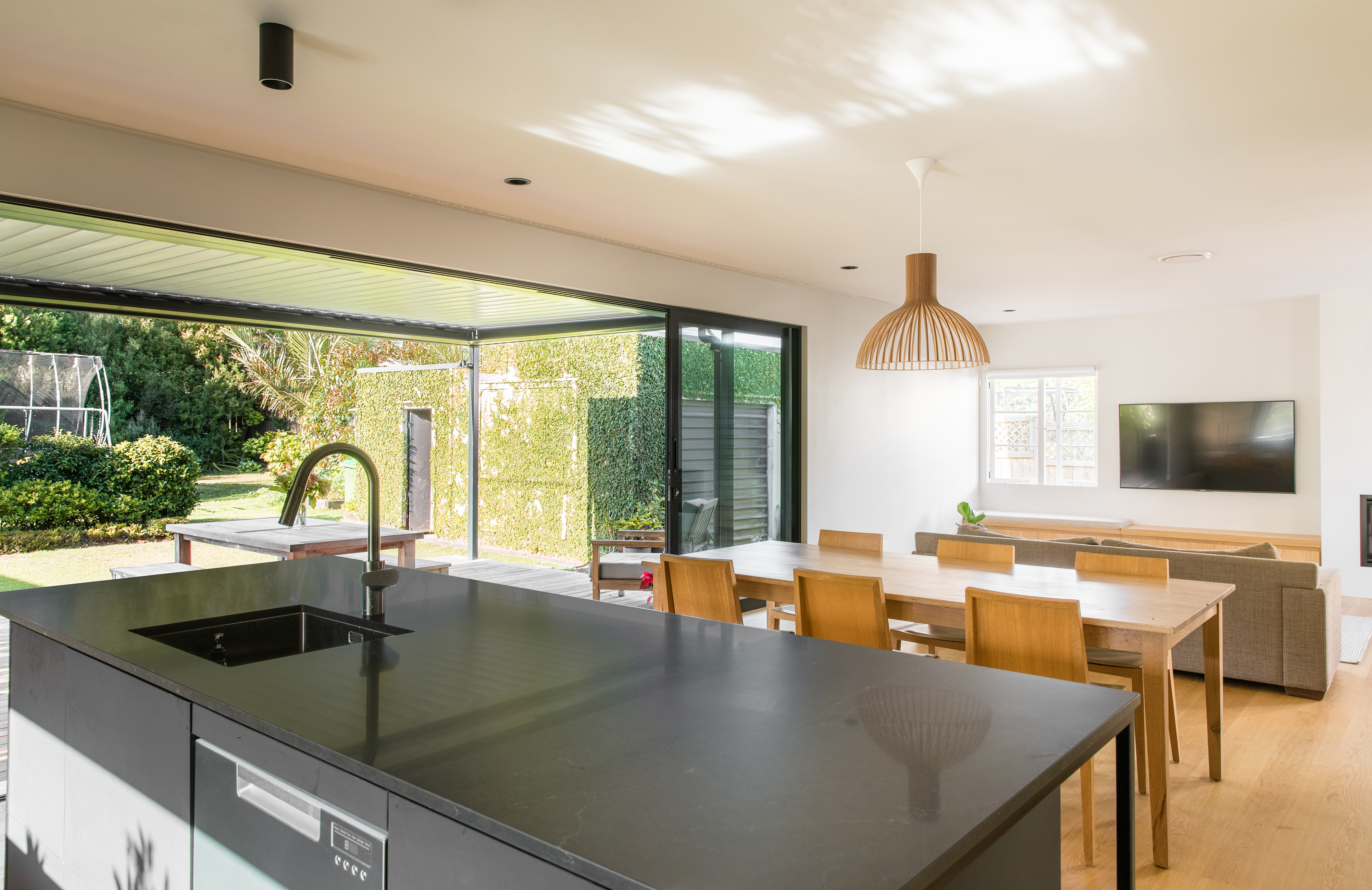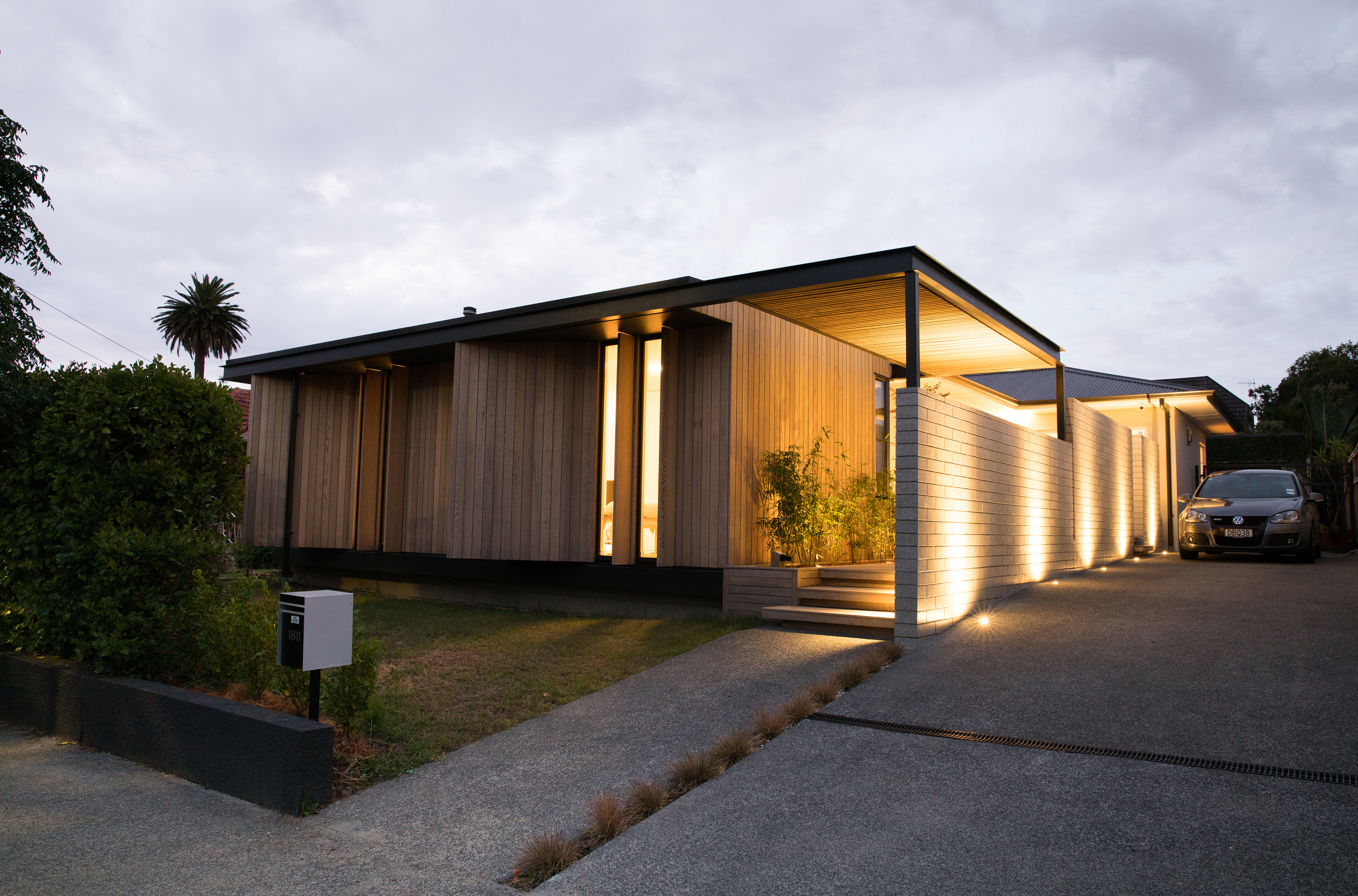 What a splendid example of a house designed for the changing needs of a family over time. With new zoning in place, Alignworks advised their clients of the potential to subdivide the property, should they wish to at some future date. They extended to the front, rather than the rear, so as not to compromise that possibility. They added a new driveway to serve front and back, screening it with a concrete block wall that also defines the signature entrance feature of the house: a generous stoop. Cedar weatherboards keep everything soft and elegant, and give a lift to the older form. The new frontage contains children’s bedrooms and a communal area with its own entrance that serves as a home study now, will become a children’s area as they get older, and one day may revert to home office. That’s work-at-home potential, thoughtfully incorporated, and it’s surprisingly rare. At the back there’s a big new living area and glazed rear wall that slides away to access a spacious deck with louvred shades and a large back garden. It’s one big space and many smaller ones, dedicated to the ebb and flow of family life and all its pleasures.