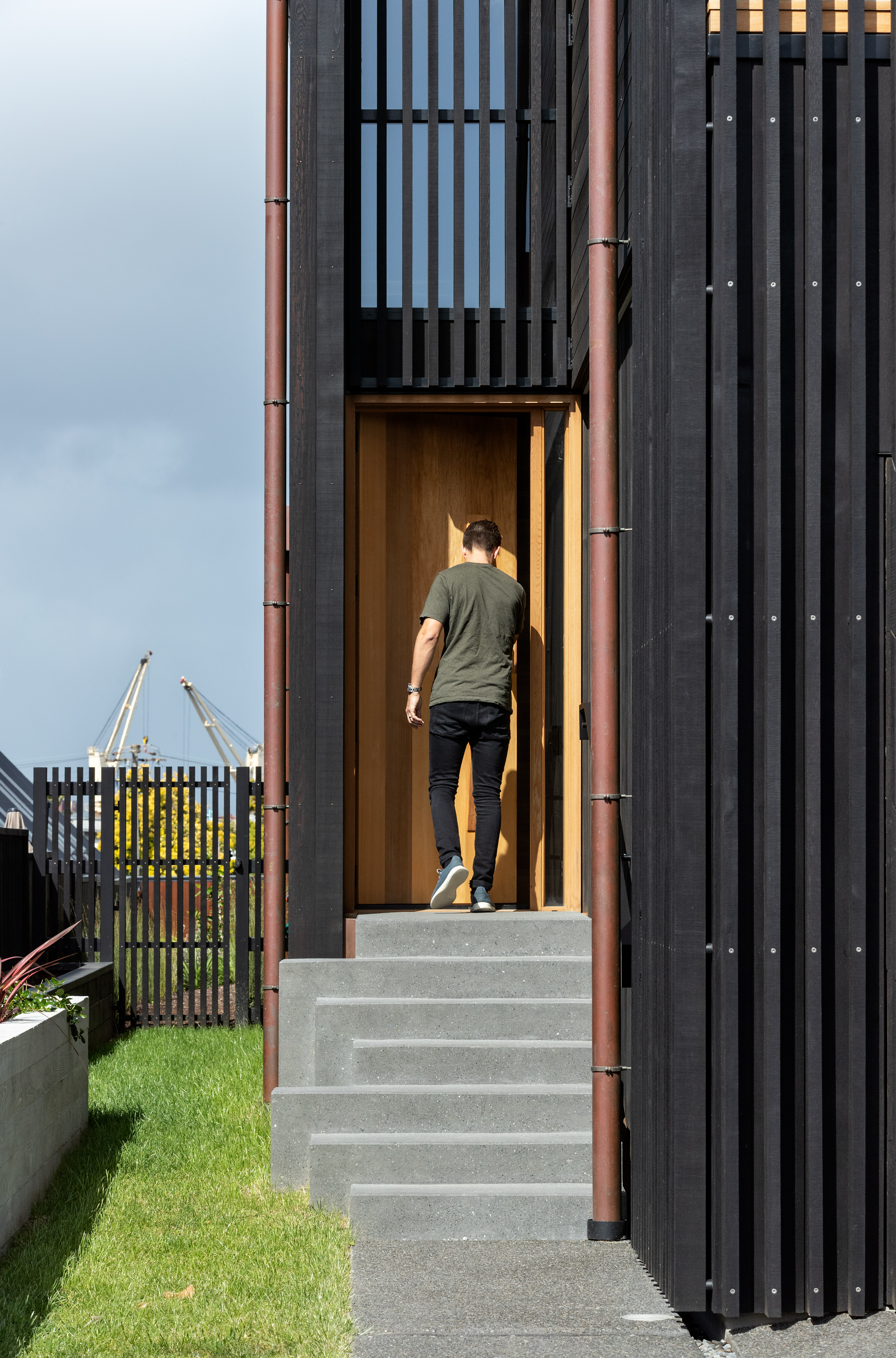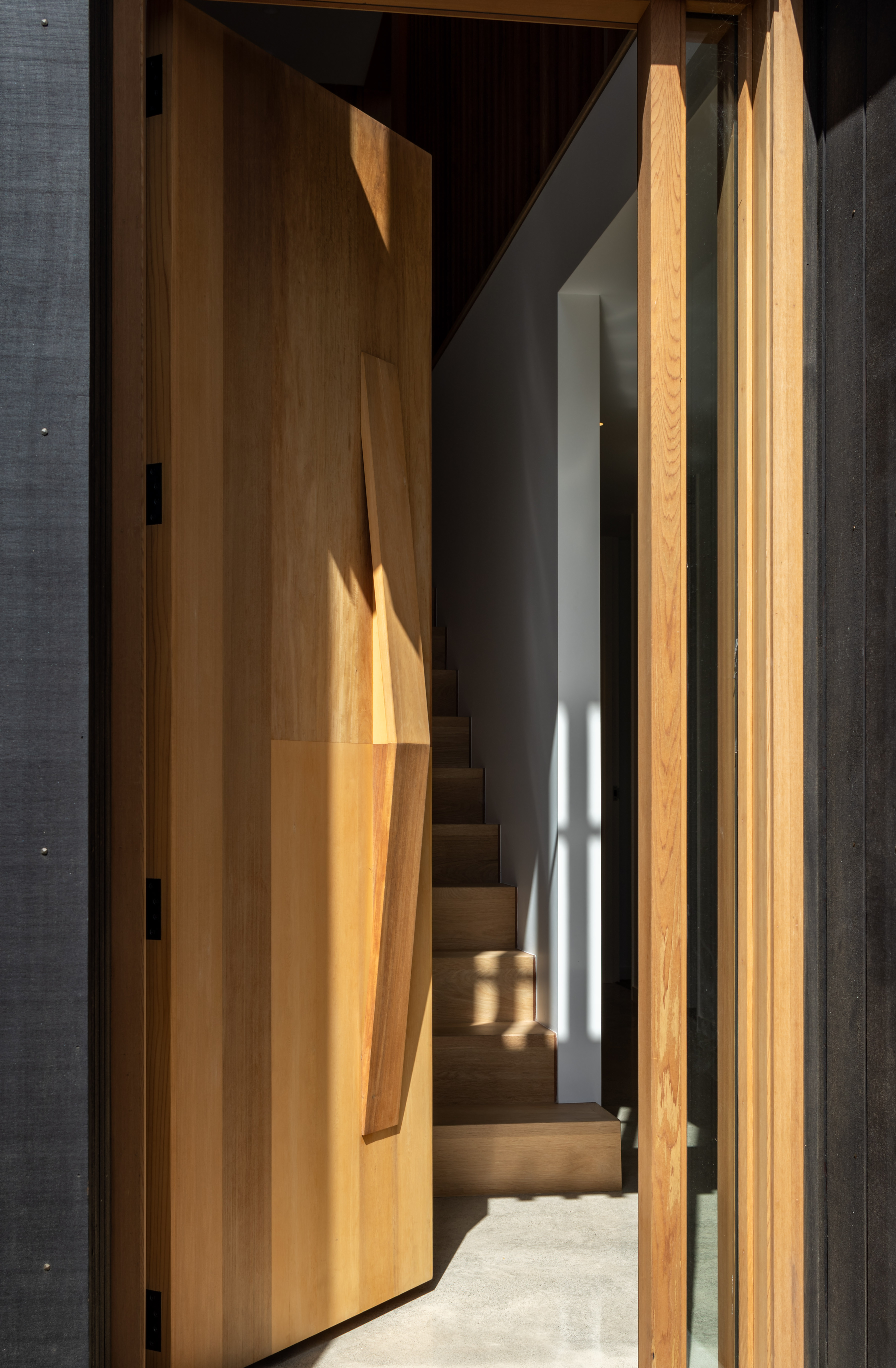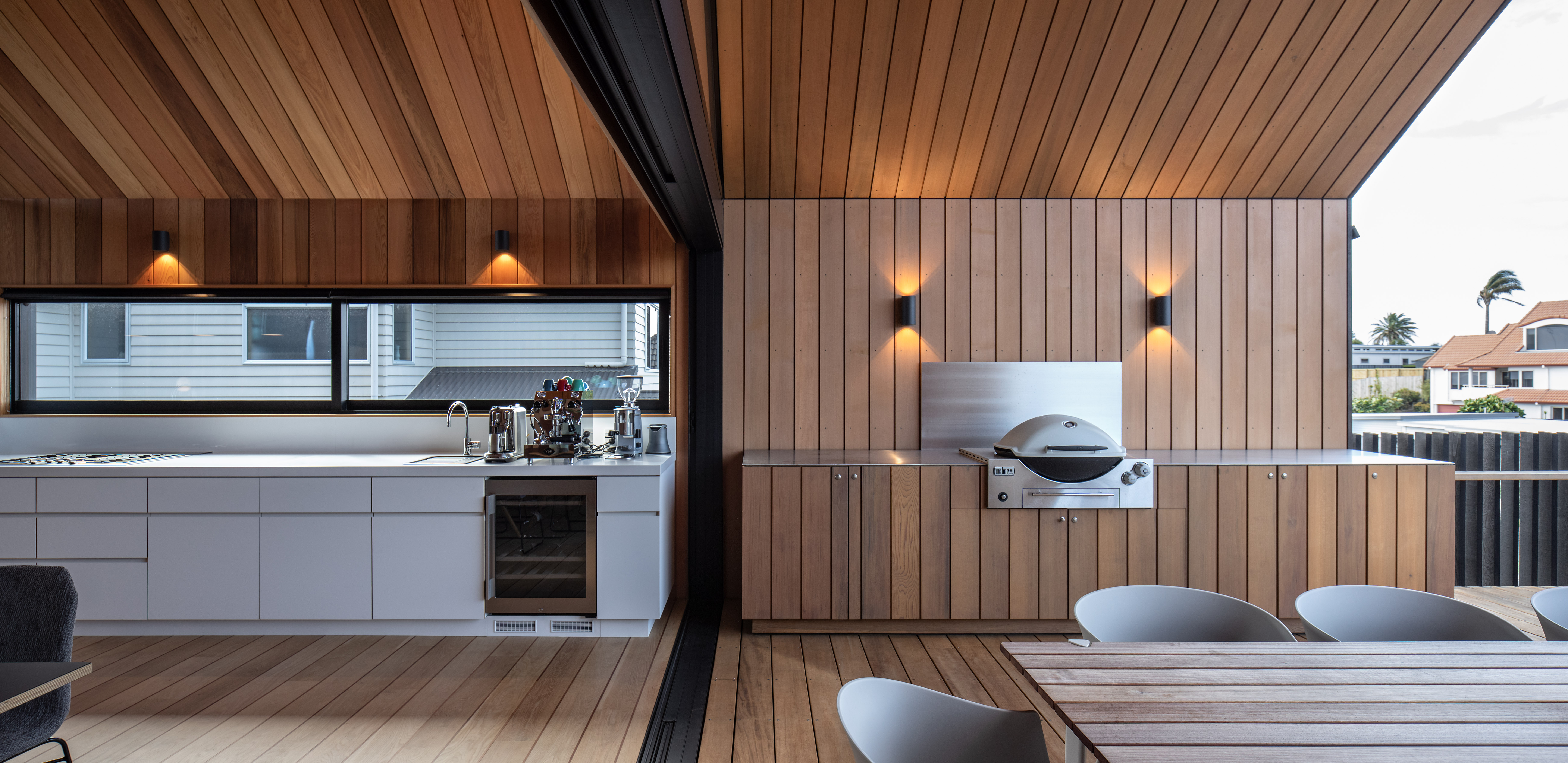 This tall gable form sits on a tight site in the densely packed suburb of Mount Maunganui. The living areas are on the upper floor forming a Great Room, with a cedar-lined ceiling and glazed ends to capture views. At night, the lit underside of this form becomes a beautiful golden lantern in the neighbourhood. This house, which utilises products from the client’s own timber business, is carefully detailed and has been skilfully realised.