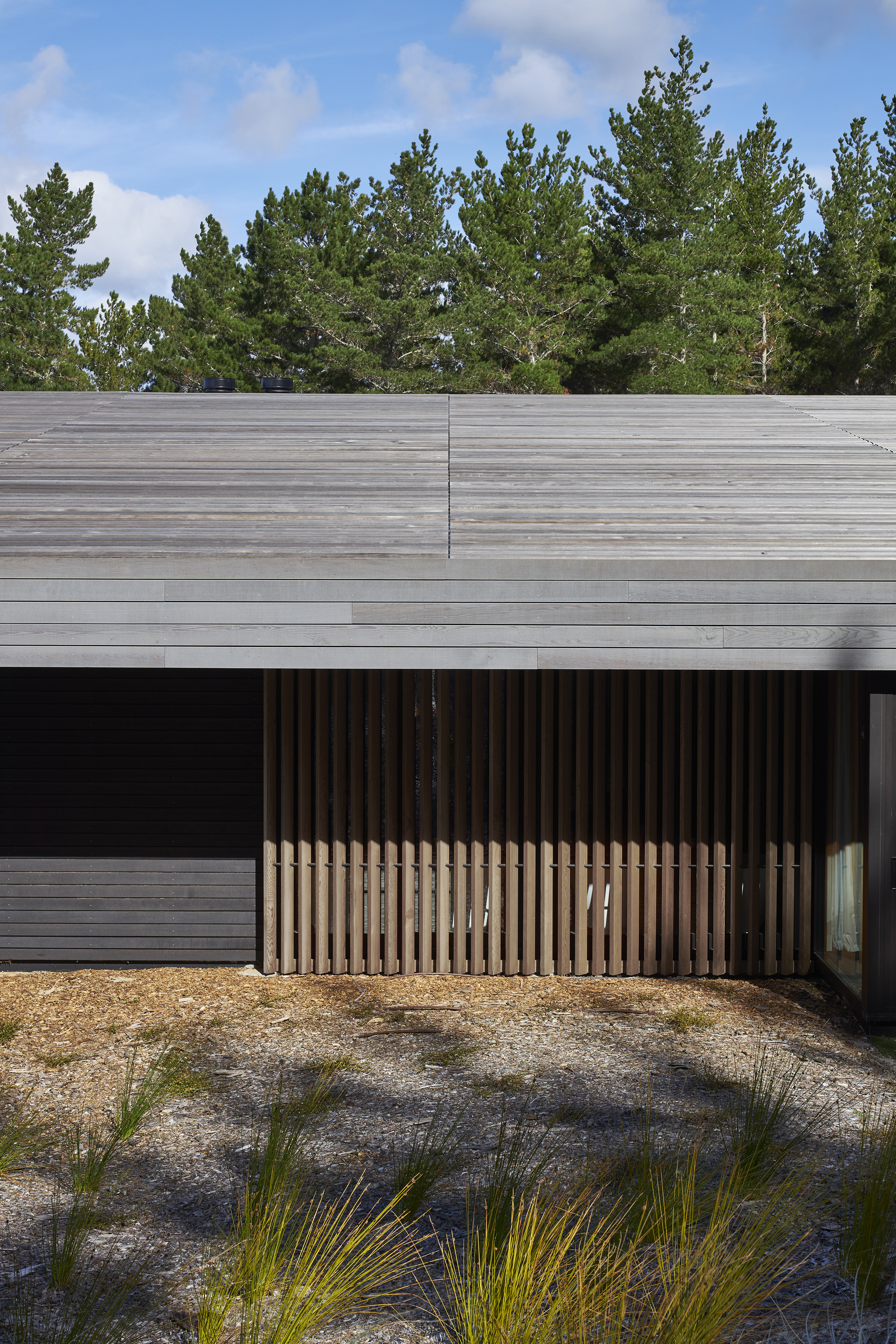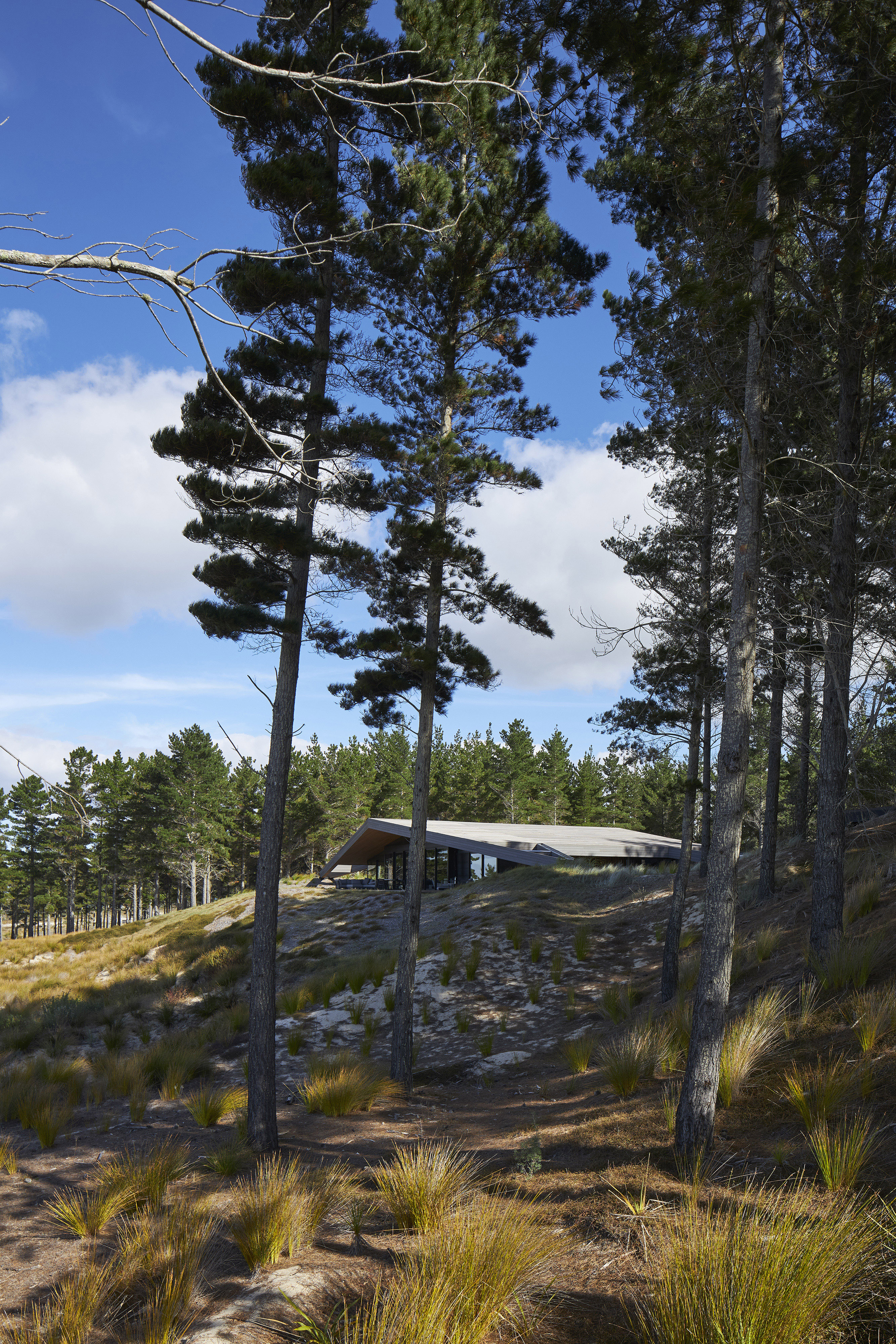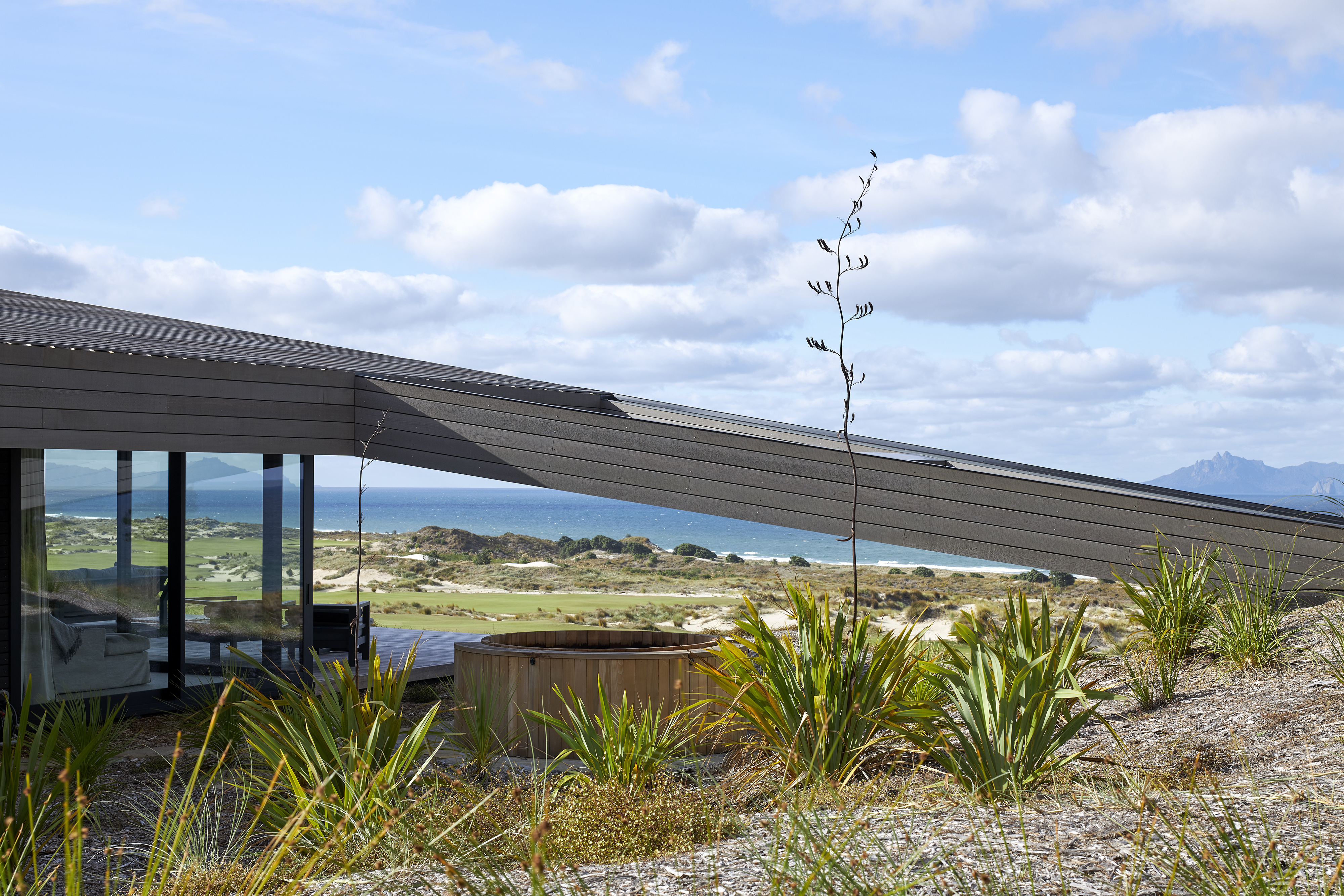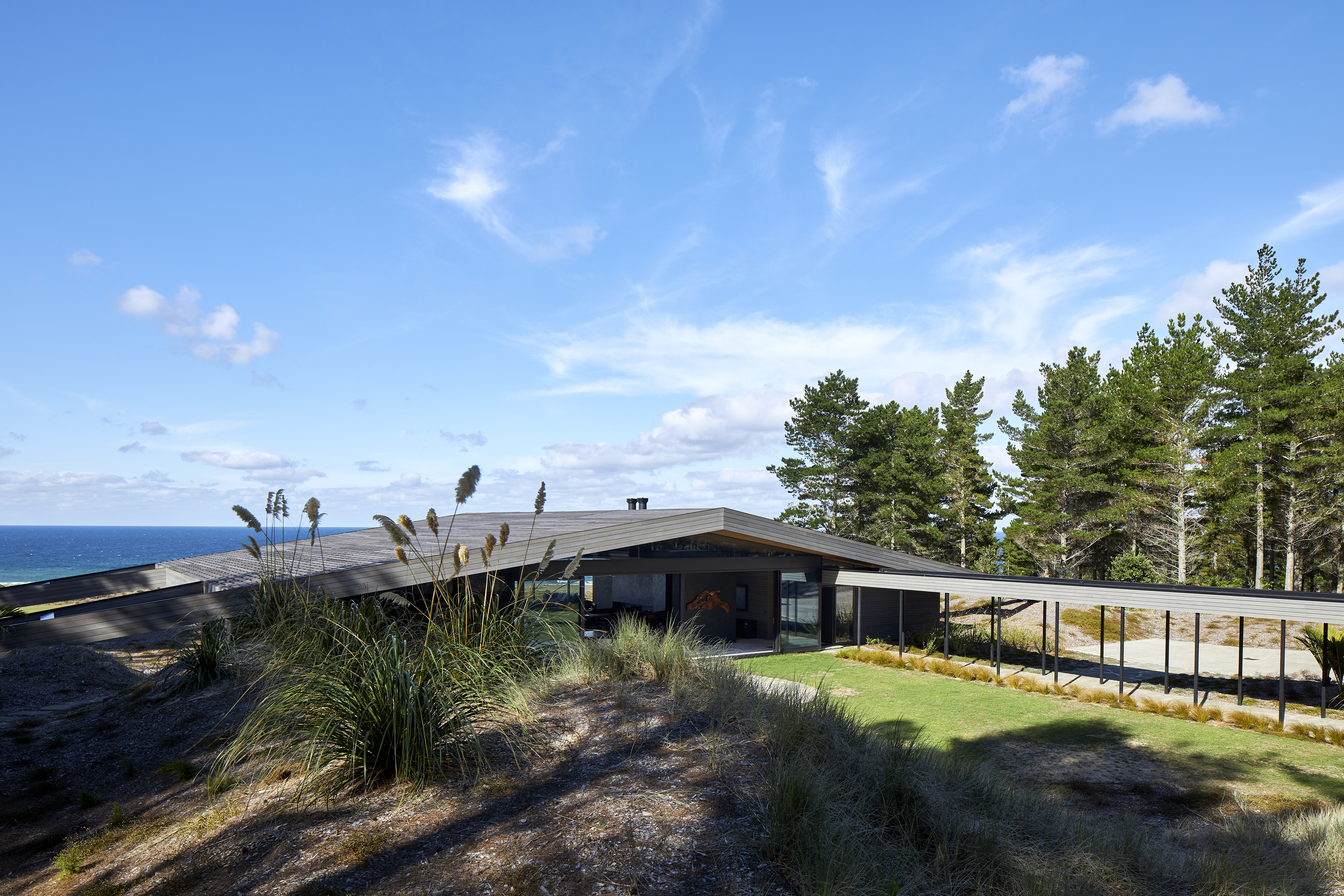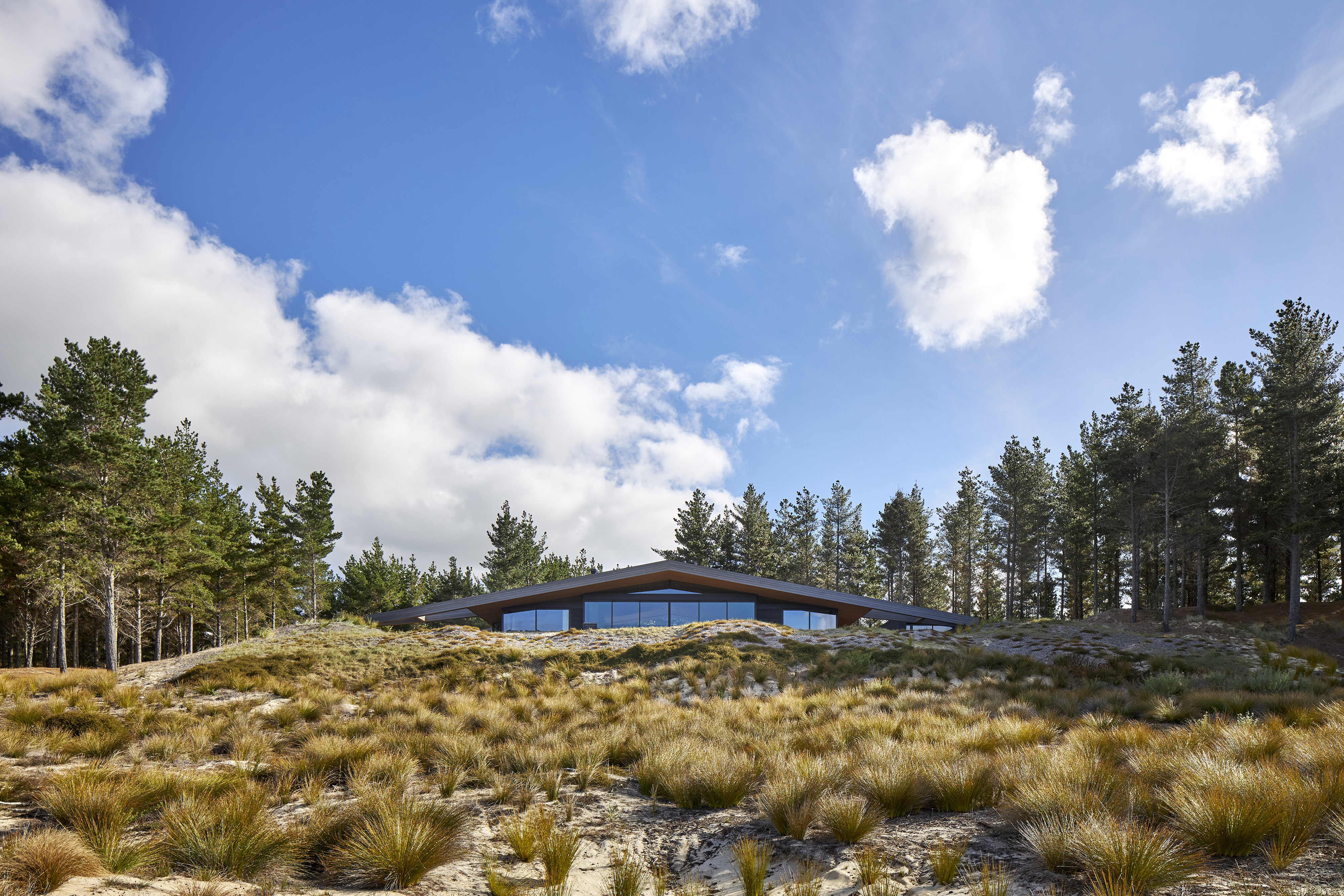 A reimagined A-frame house, the Glider defies its size by rescaling perspective. This simple form is splayed and anchored at four points in the sand dunes of Tara Iti Golf Club. A timber- clad roof deftly disguises a large skylight to the central living space and is peeled back from the sides to reveal a bedroom suite either side. Exquisite detailing combined with cleverly proportioned spaces ensures this house is handsome, expansive and confident, its serene tone achieved by the controlled use of limited materials. The sweeping form of the timber roof unites it all with technical adroitness.