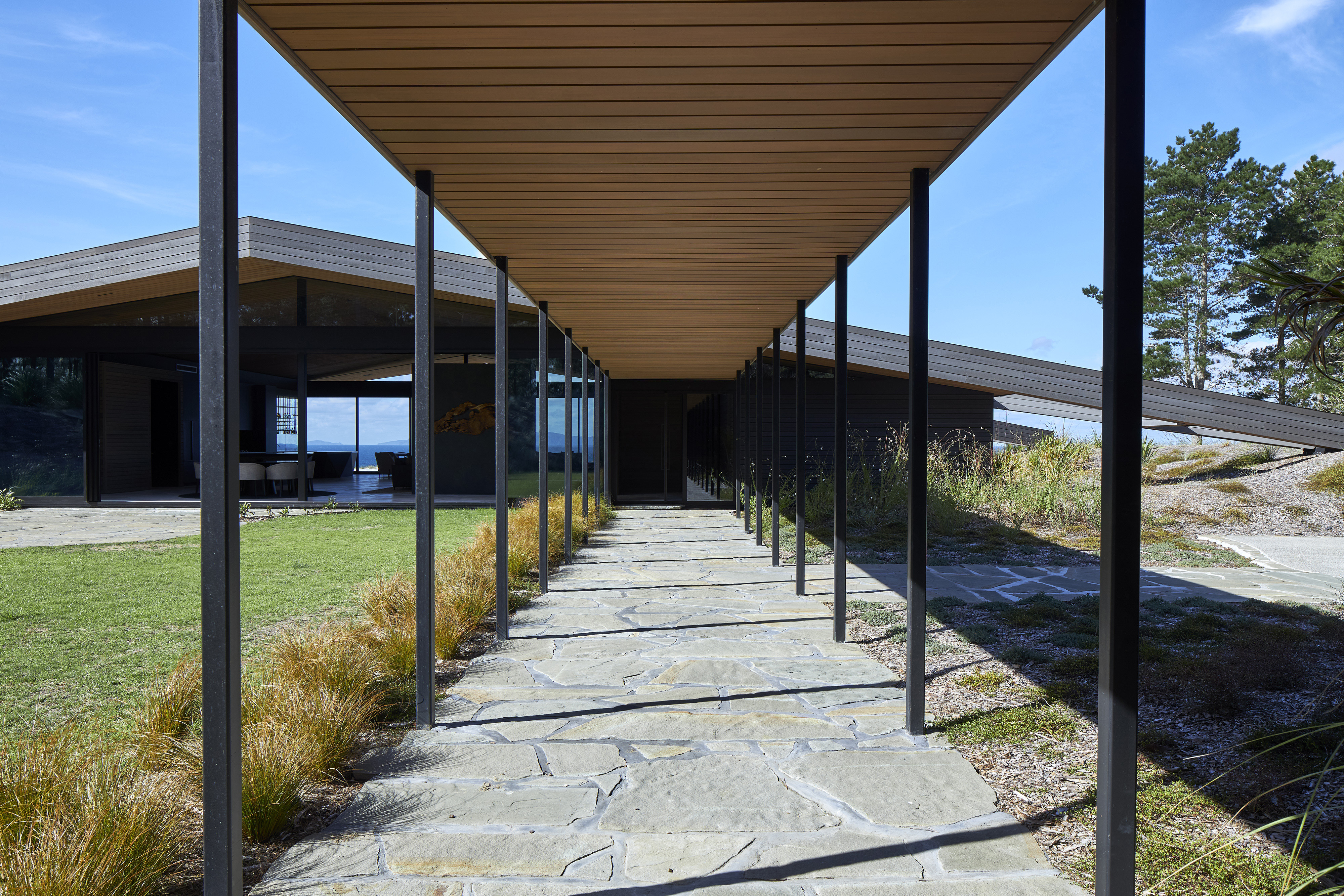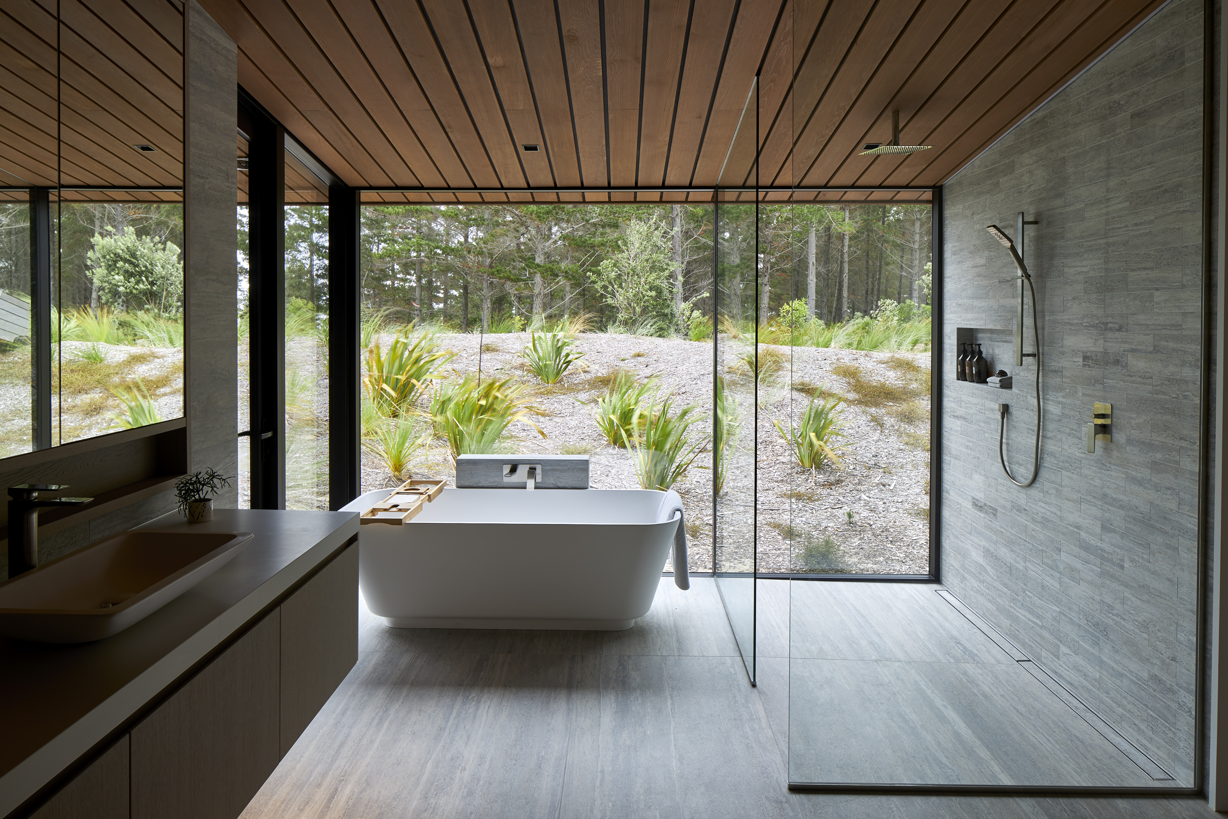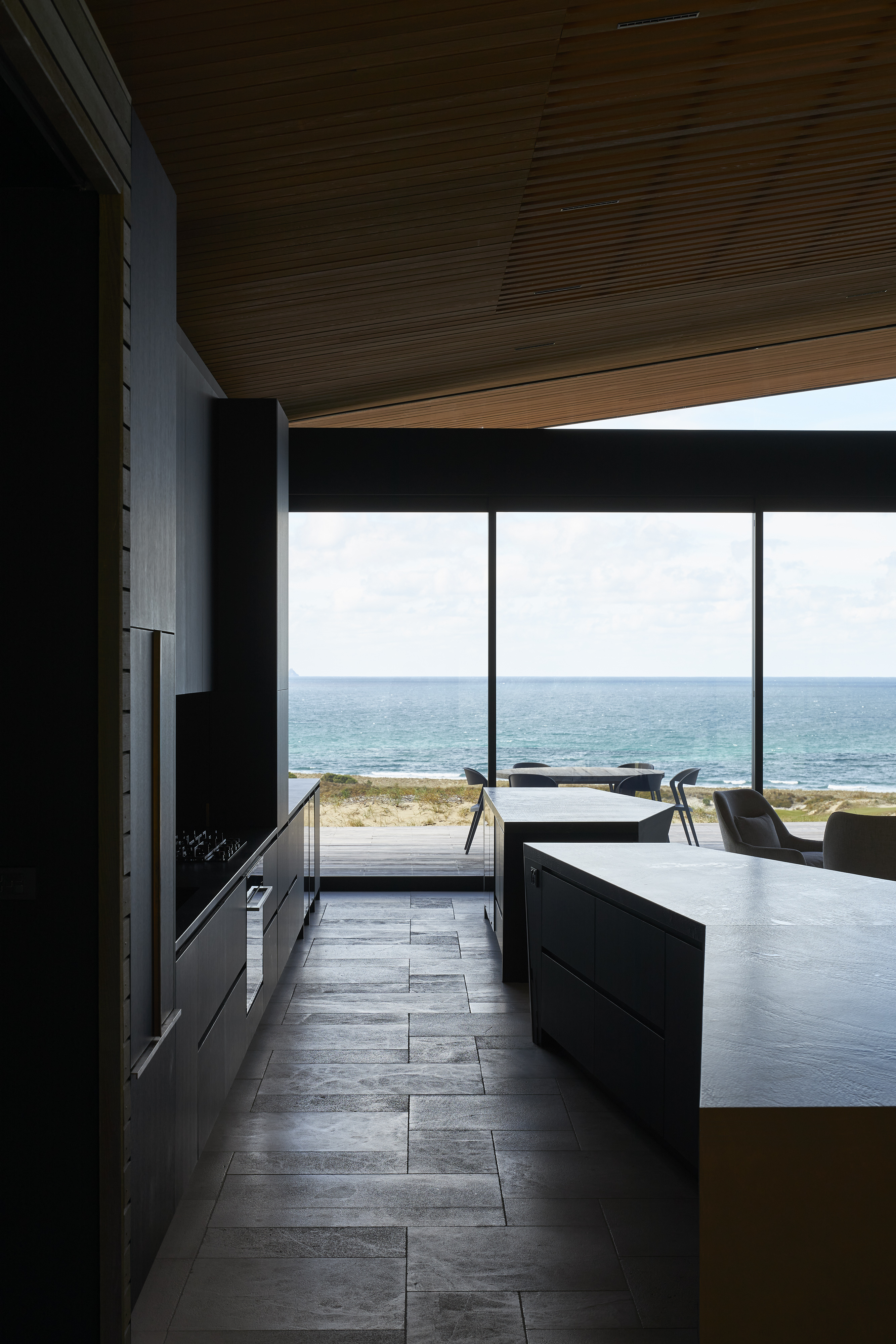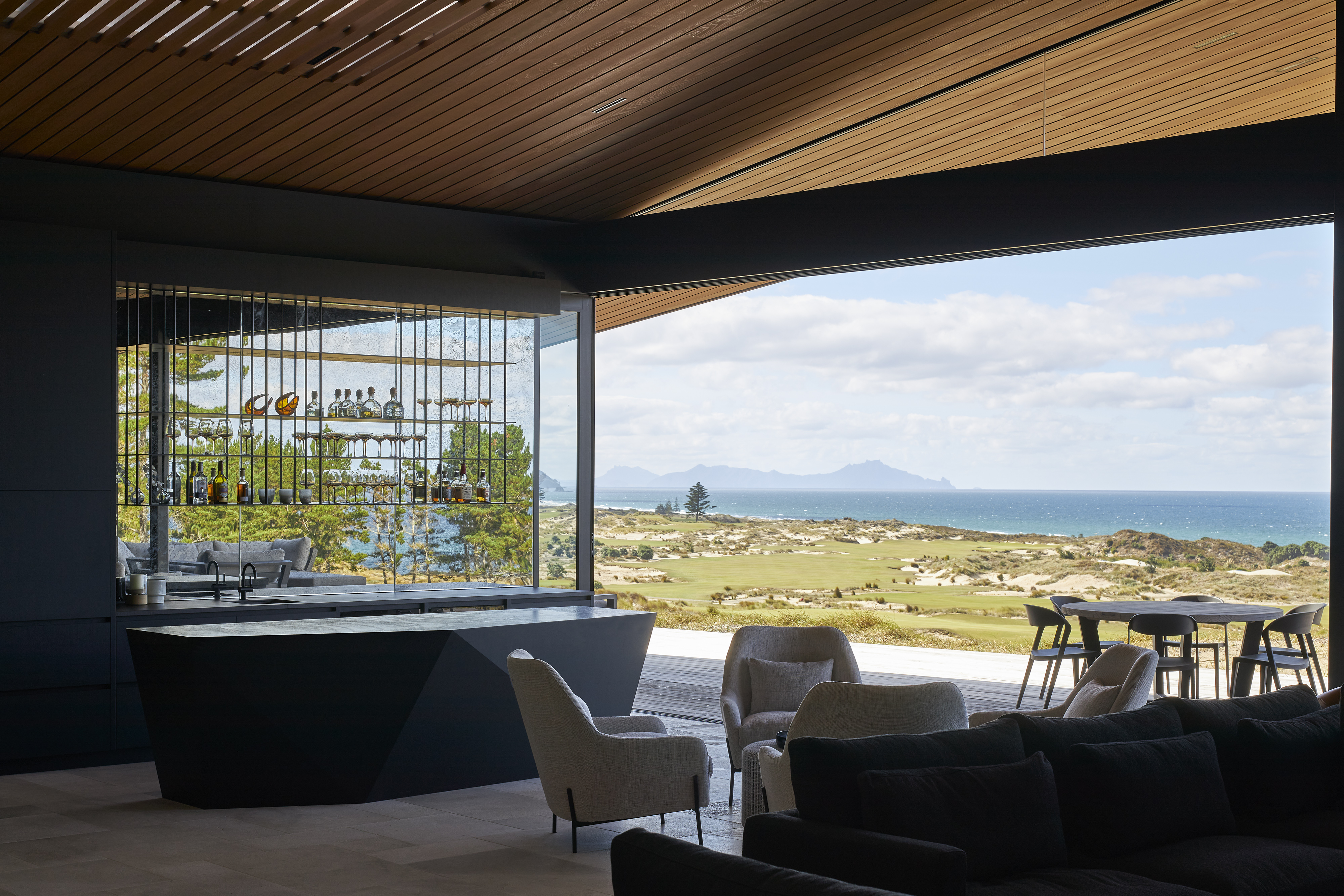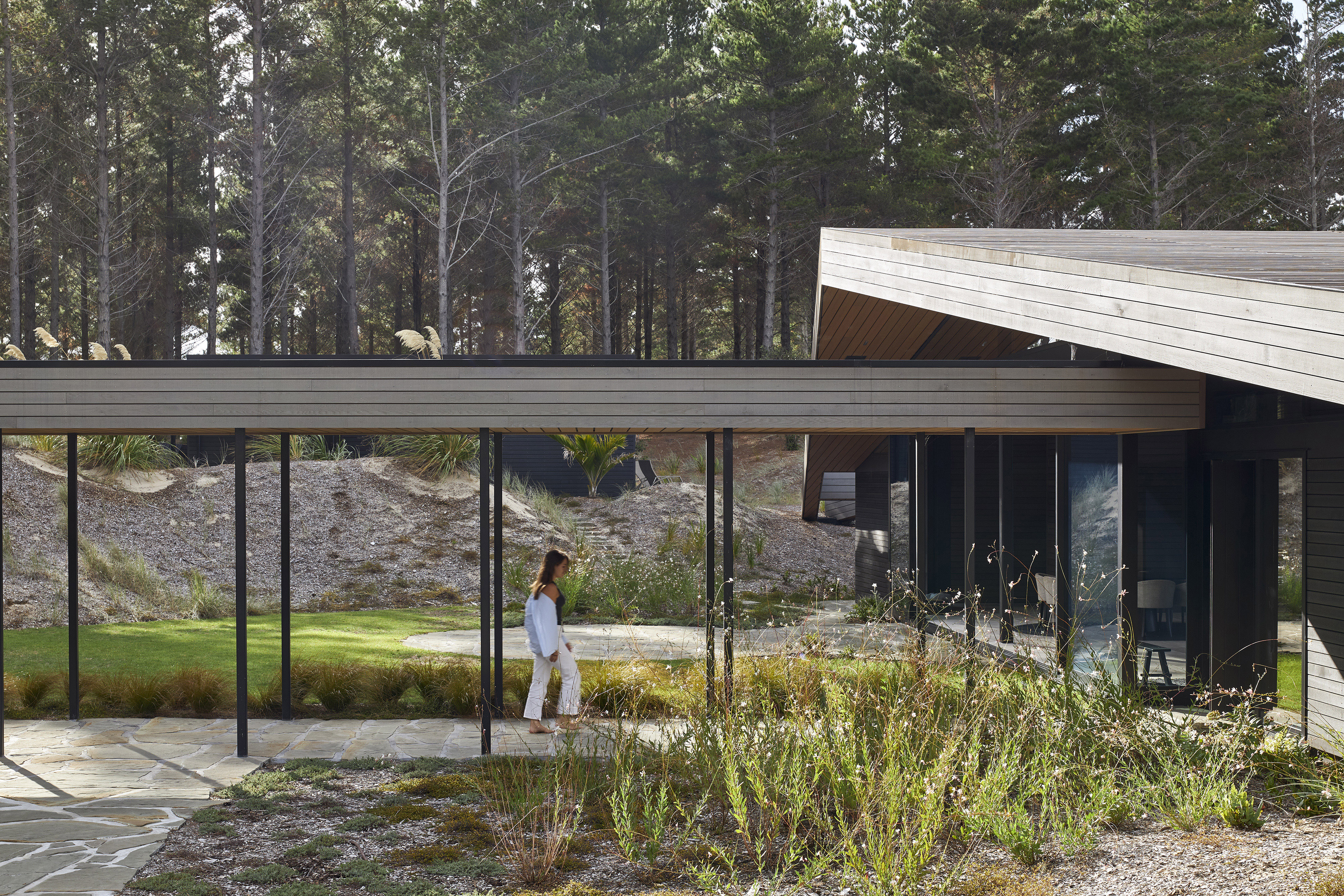 A reimagined A-frame house, the Glider defies its size by rescaling perspective. This simple form is splayed and anchored at four points in the sand dunes of Tara Iti Golf Club. A timber- clad roof deftly disguises a large skylight to the central living space and is peeled back from the sides to reveal a bedroom suite either side. Exquisite detailing combined with cleverly proportioned spaces ensures this house is handsome, expansive and confident, its serene tone achieved by the controlled use of limited materials. The sweeping form of the timber roof unites it all with technical adroitness.