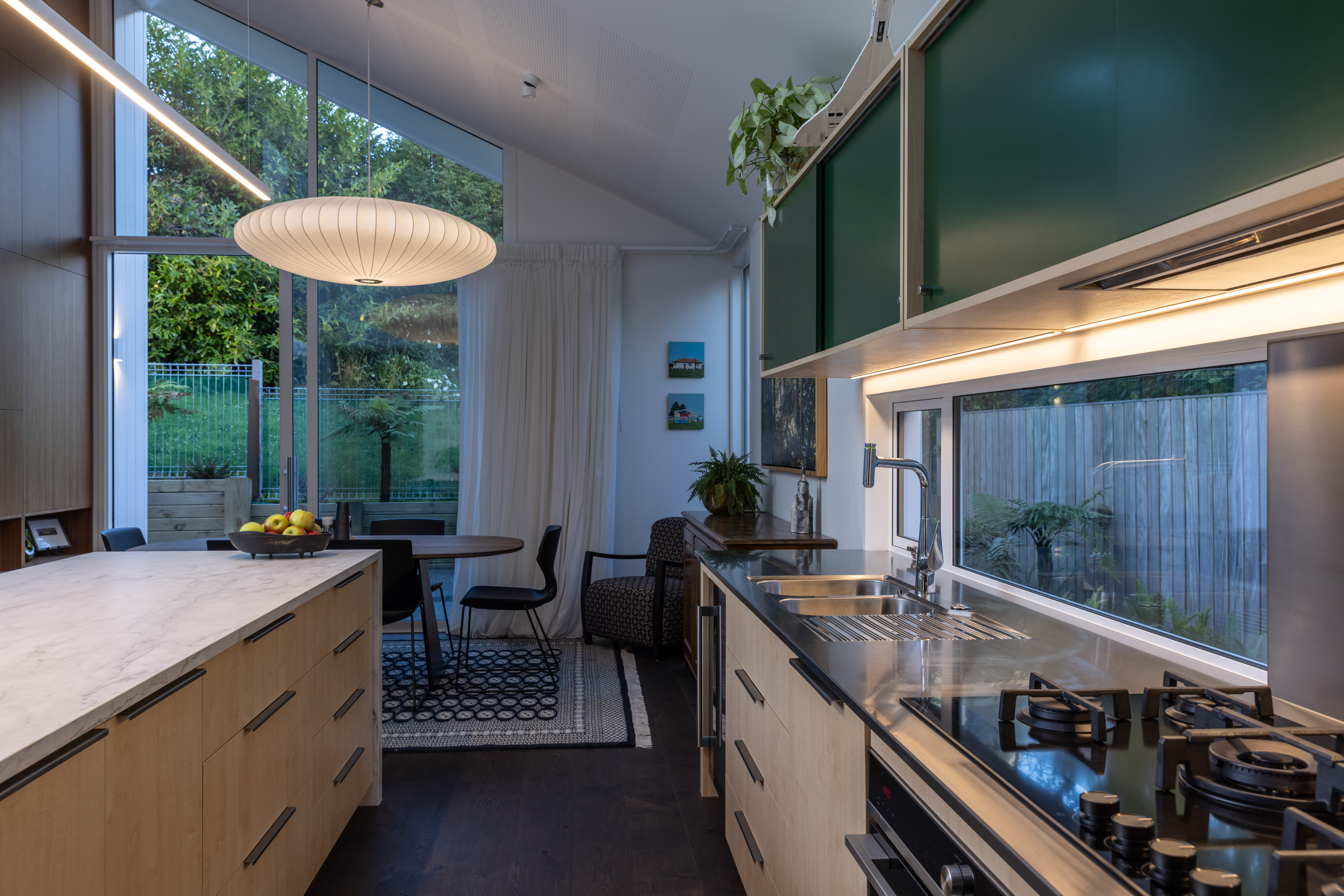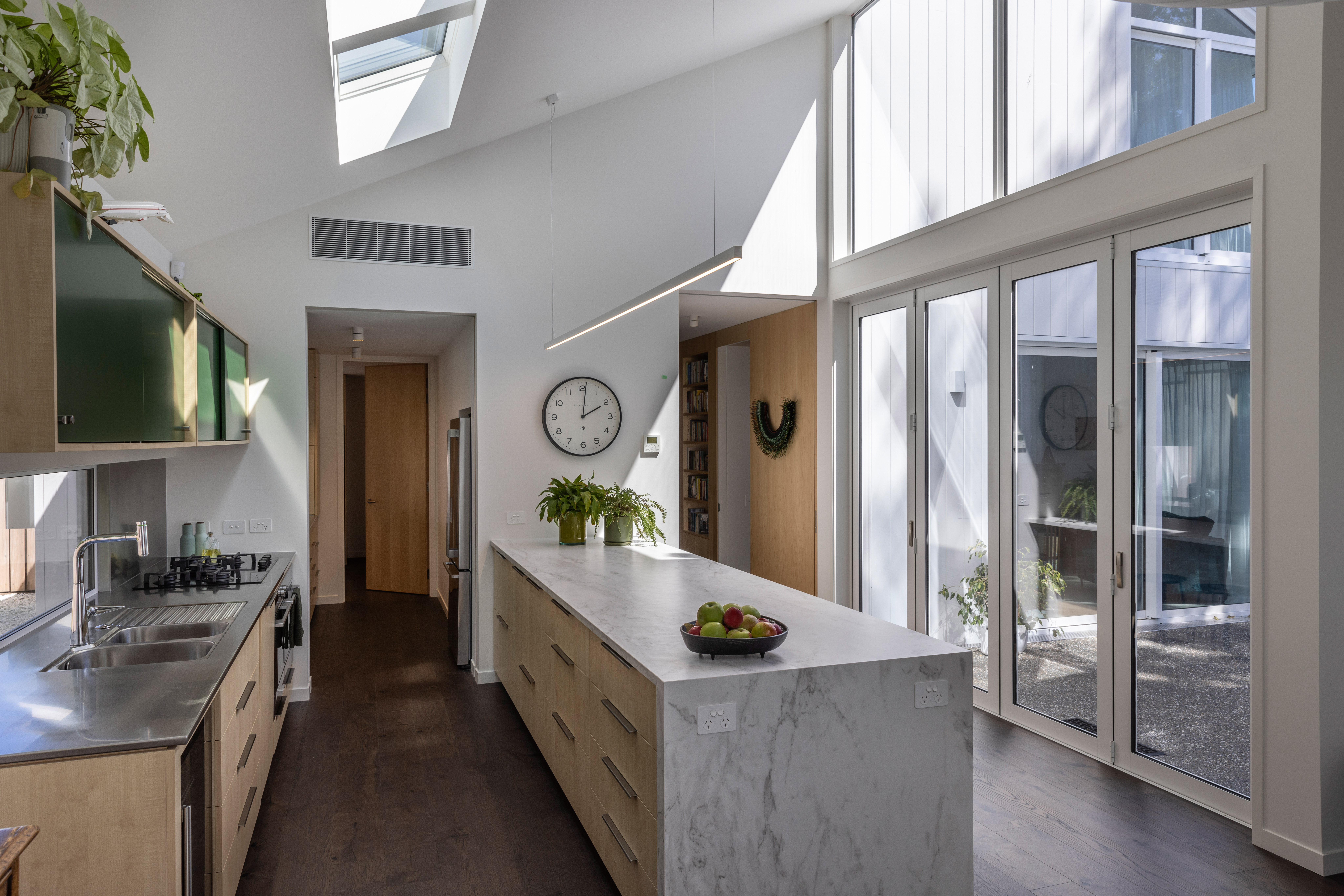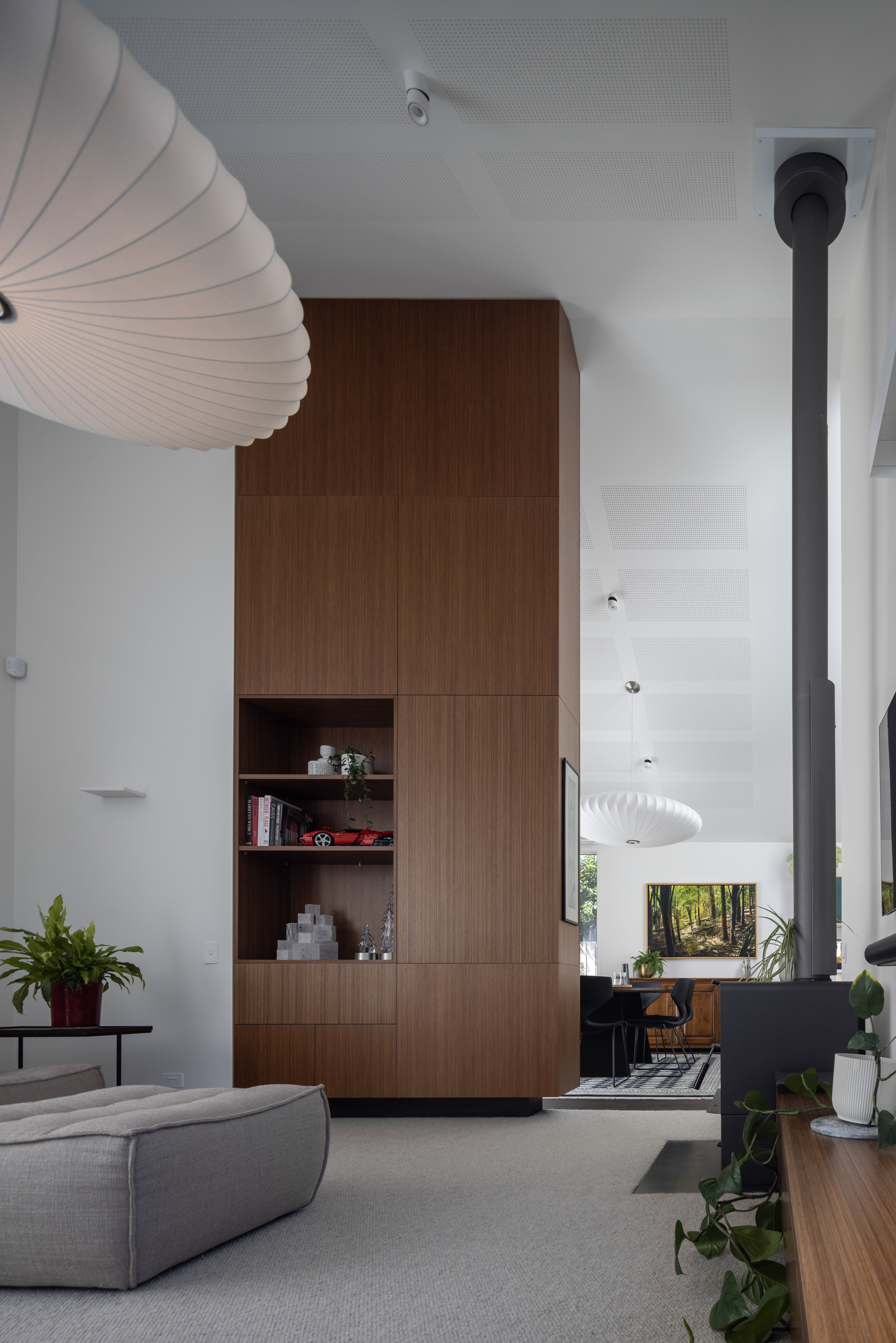 An exercise in white minimalism opens out to provide a series of delightful spaces dressed in a restrained colour palette. Privacy and transparency have been skilfully balanced. The plan makes great use of sunshine pouring into the rear of the site. And it is just the right size – not excessively large, nor uncomfortably small – catering perfectly to the client’s lifestyle. A beautiful canvas for their artwork.