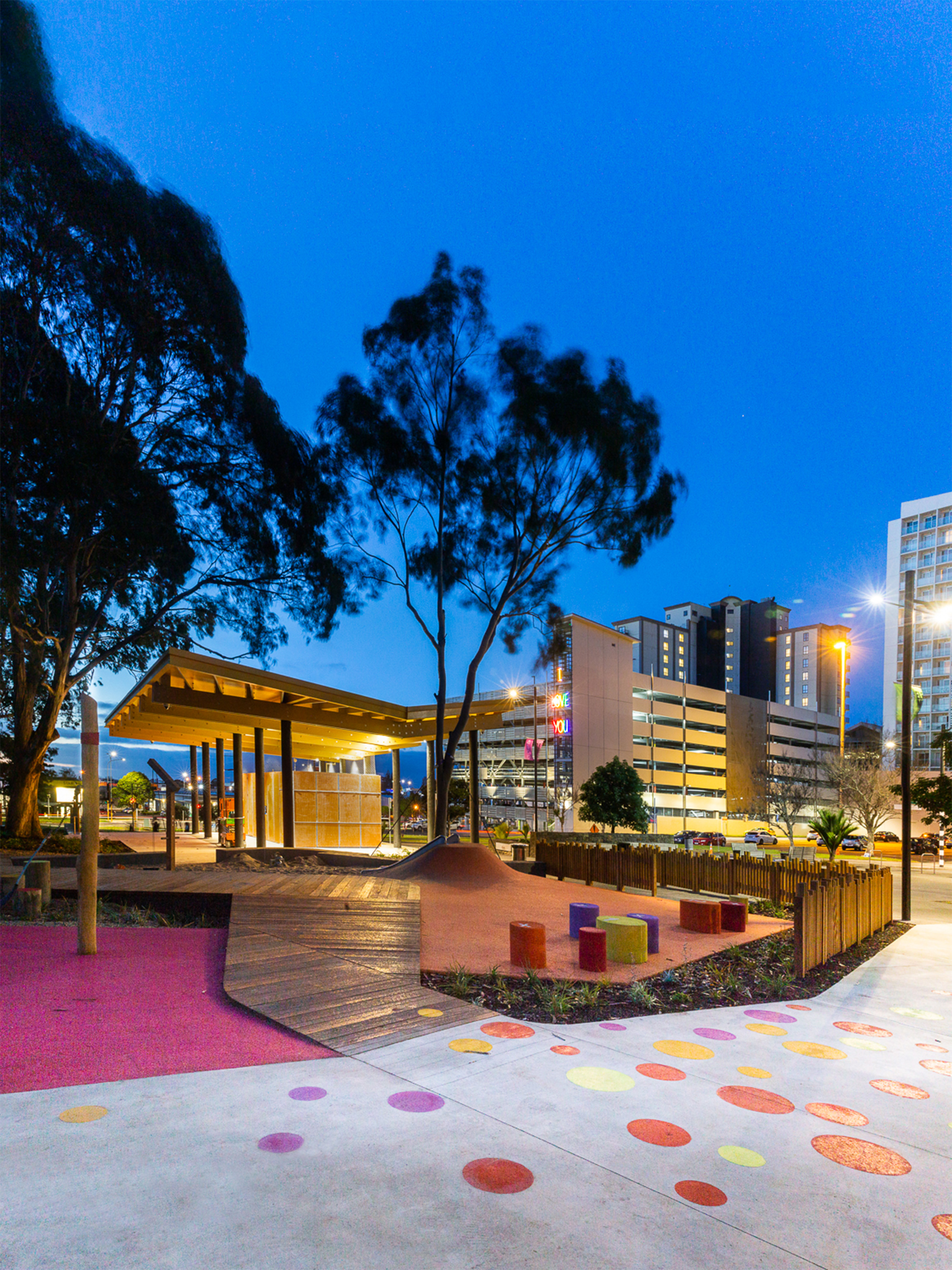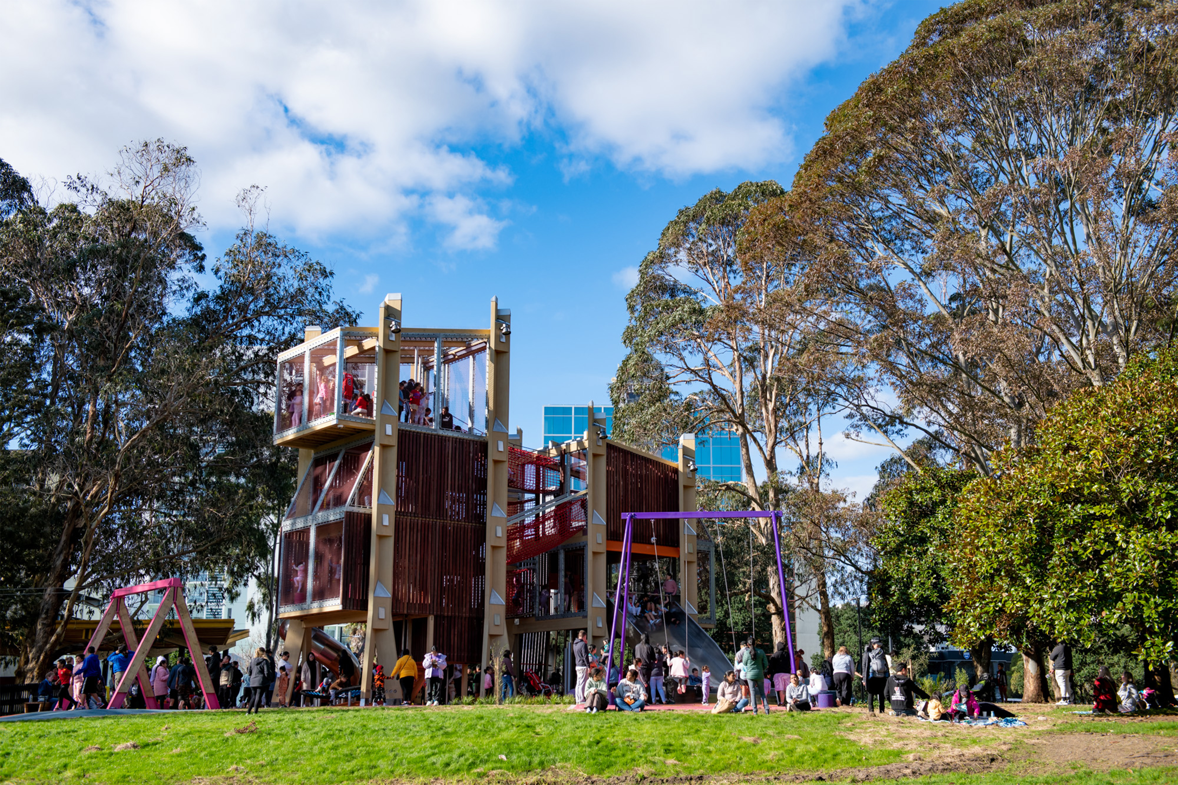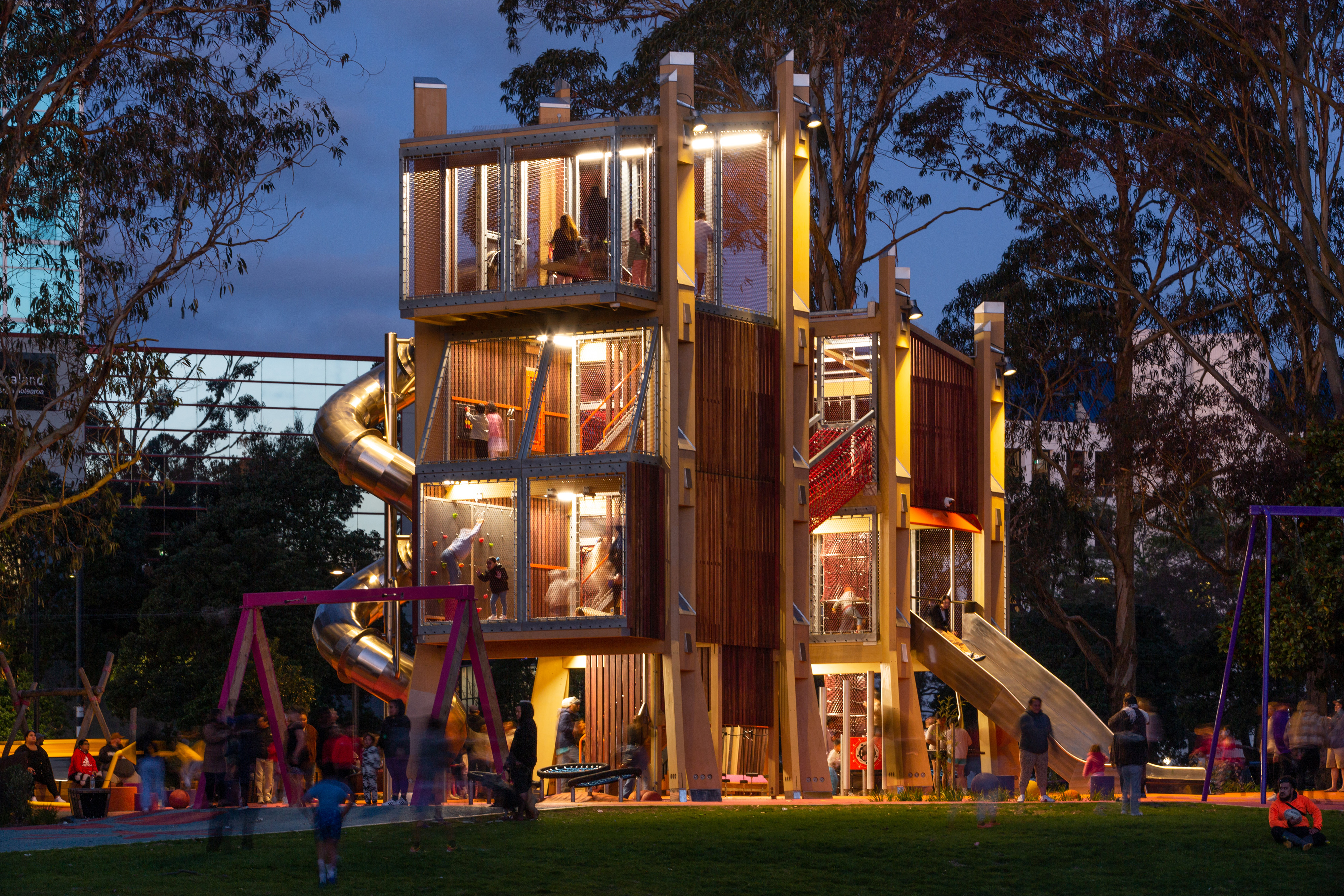 Acting as an urban marker that’s visible from the city centre, the vertical arrangement is striking and inherently playful. At any one time it resembles a tower, a castle or a tree house. The parents’ stair winding up through the centre doesn’t dominate and the sense of adventure and opportunities to climb up the levels or cross between towers have been cleverly integrated. Safety and adventure are counterbalanced. The mix of colourful, tactile materials and the diverse scale of play elements in the tower and adjacent landscape offer accessibility to all ages.