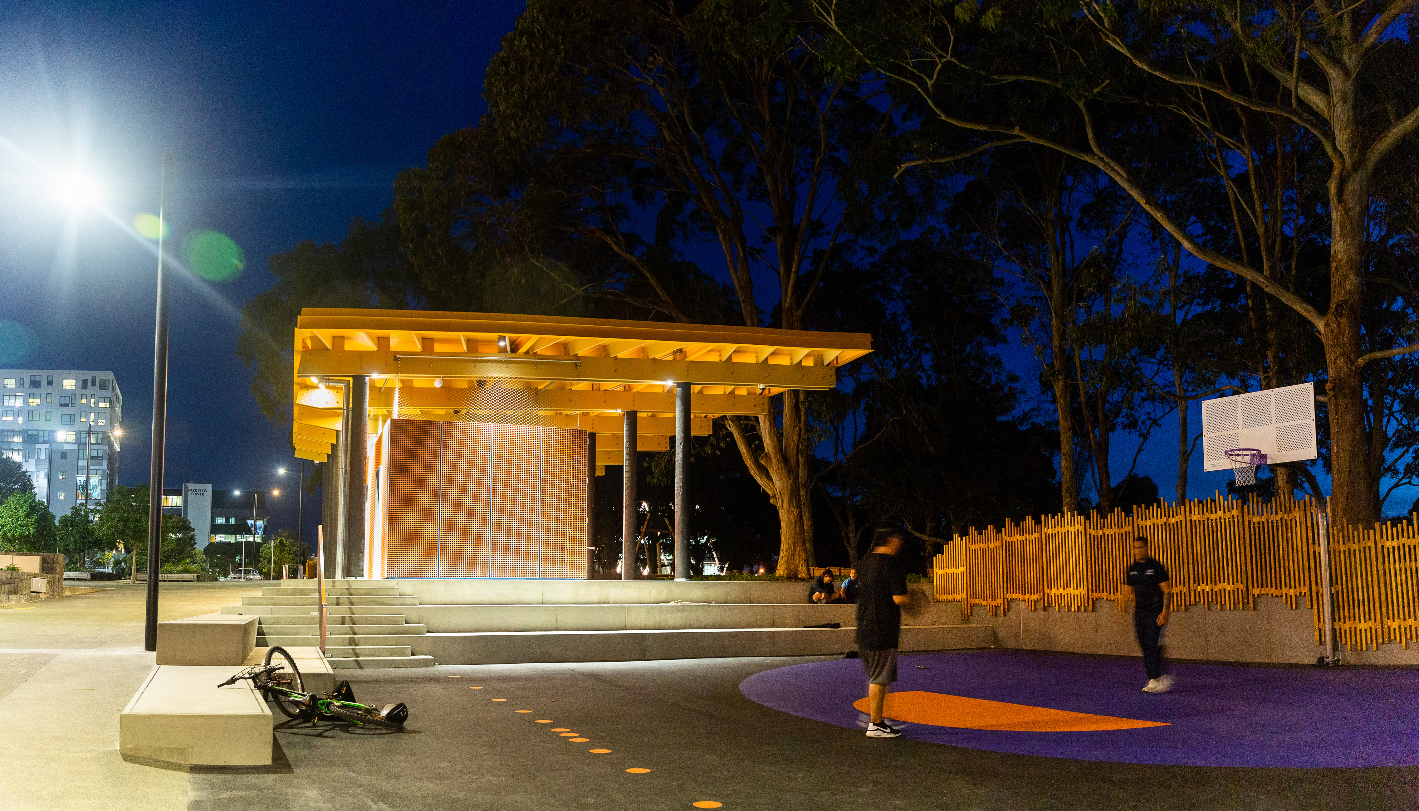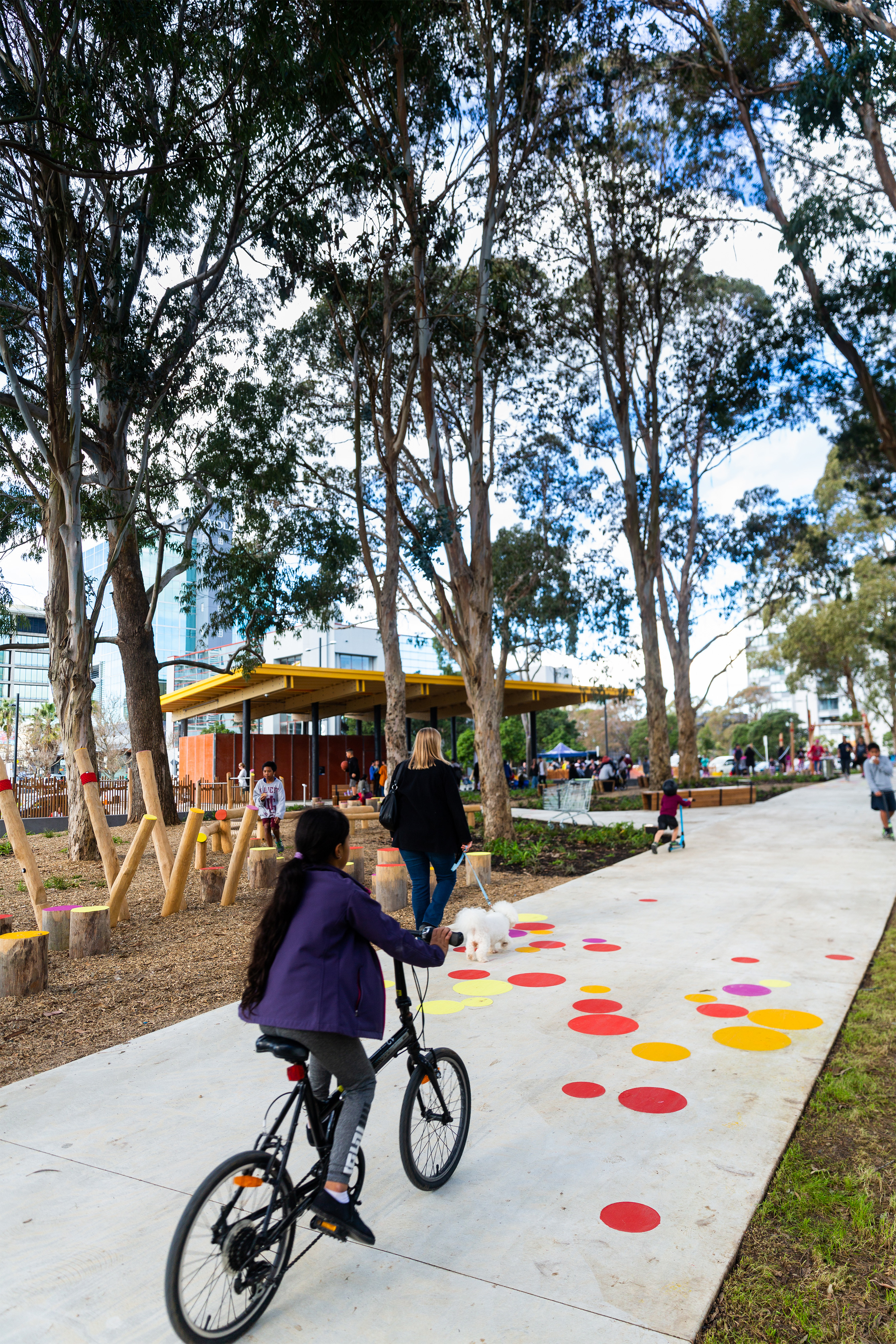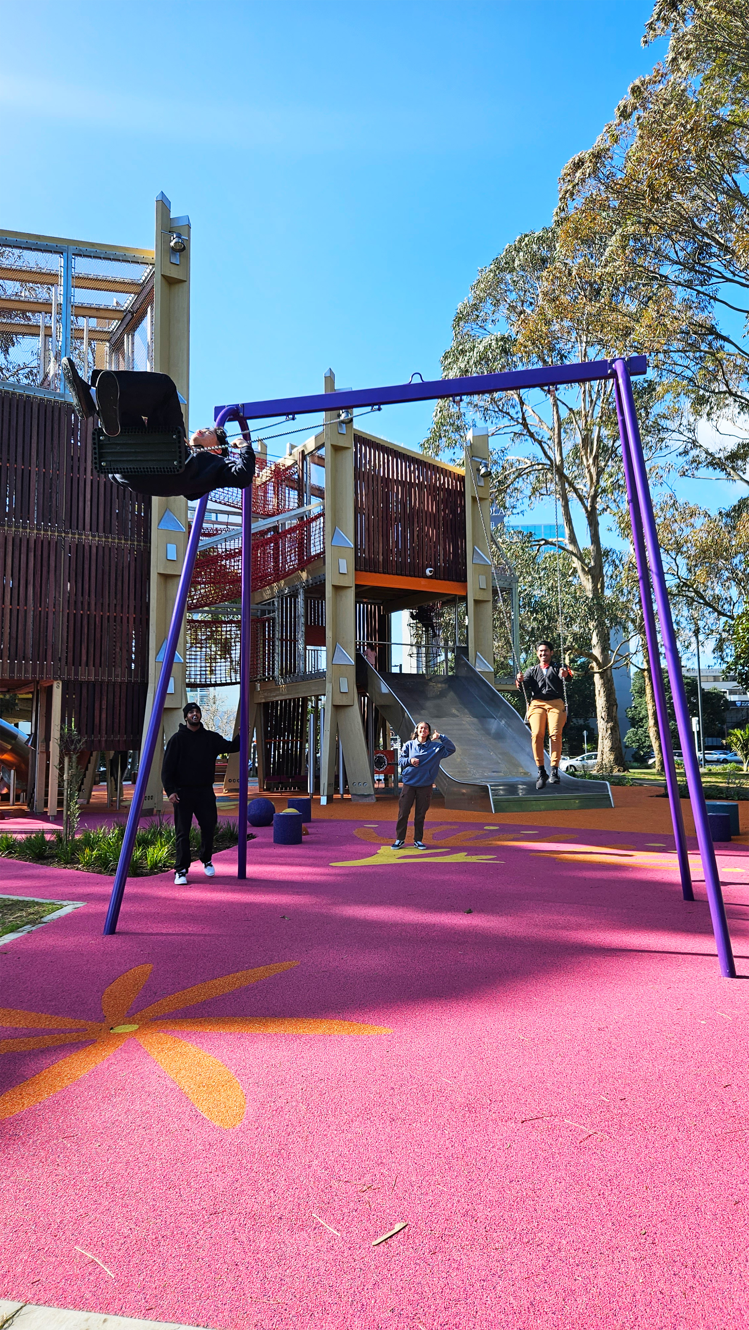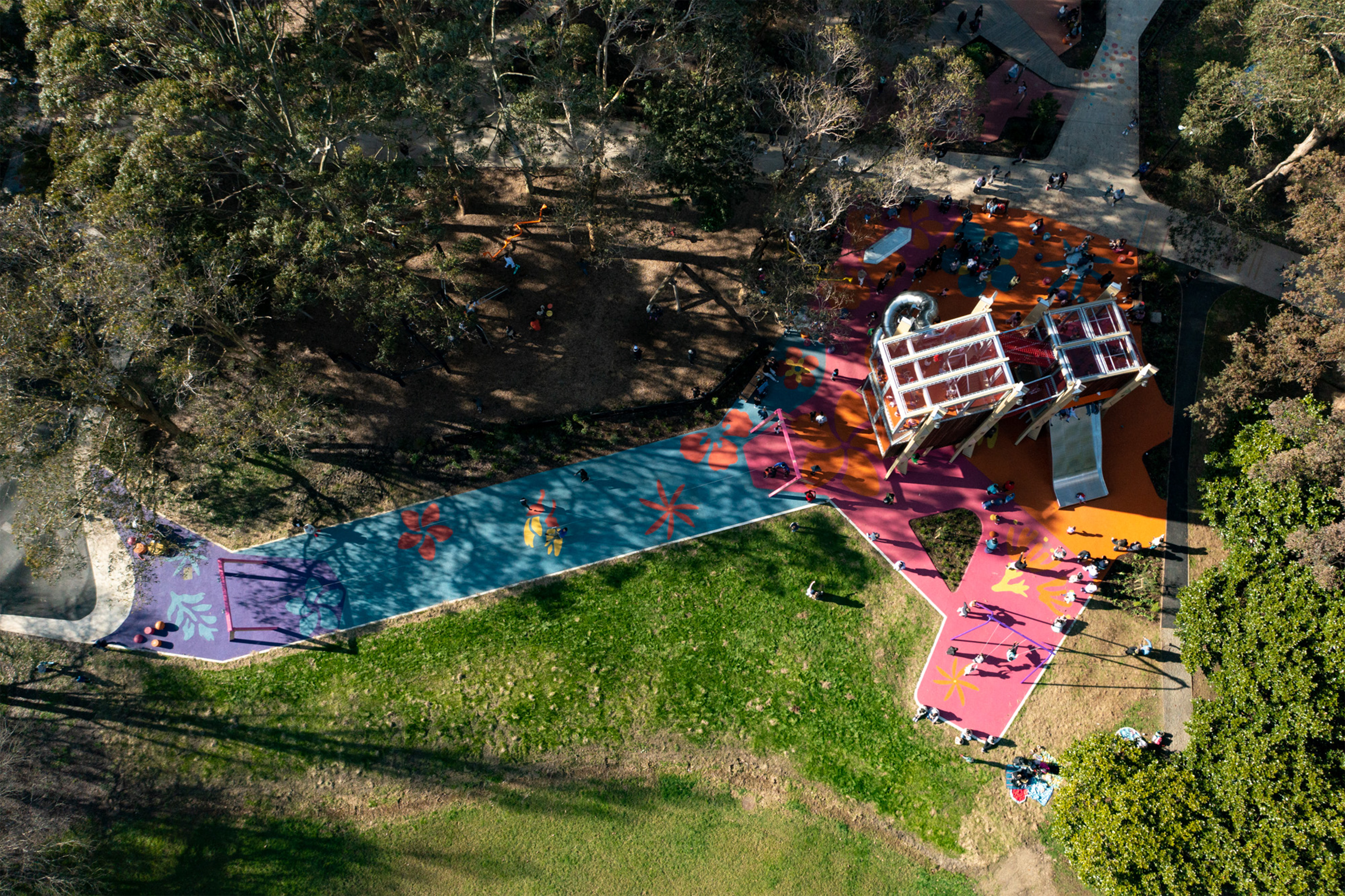 Acting as an urban marker that’s visible from the city centre, the vertical arrangement is striking and inherently playful. At any one time it resembles a tower, a castle or a tree house. The parents’ stair winding up through the centre doesn’t dominate and the sense of adventure and opportunities to climb up the levels or cross between towers have been cleverly integrated. Safety and adventure are counterbalanced. The mix of colourful, tactile materials and the diverse scale of play elements in the tower and adjacent landscape offer accessibility to all ages.