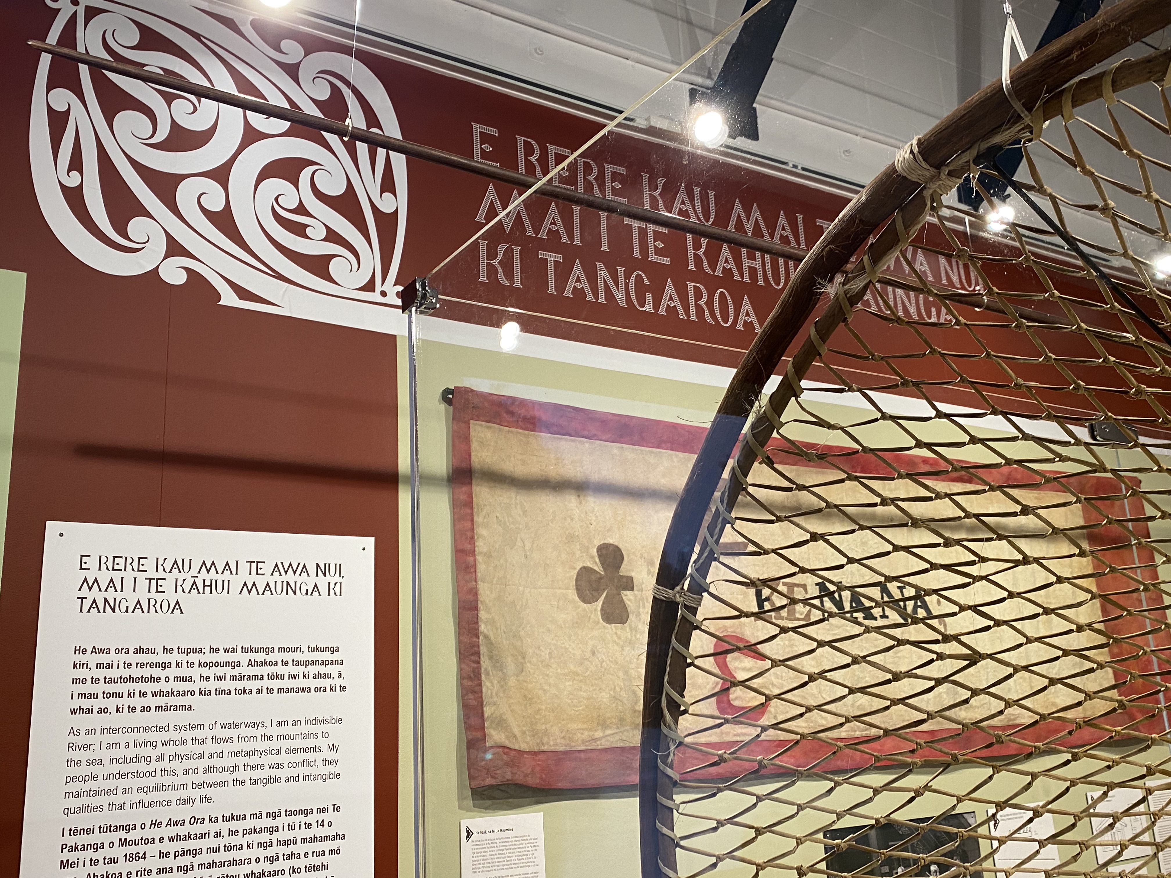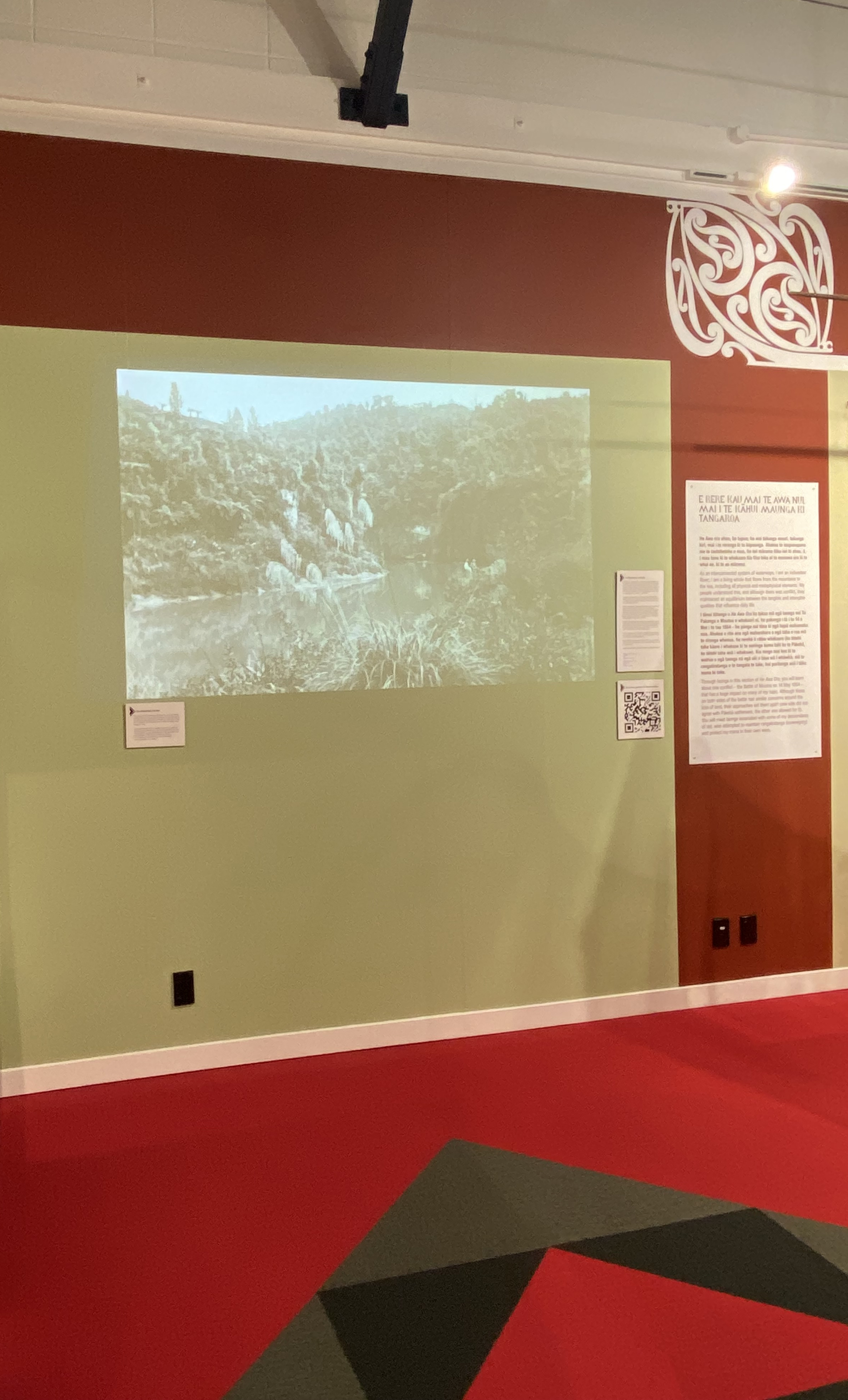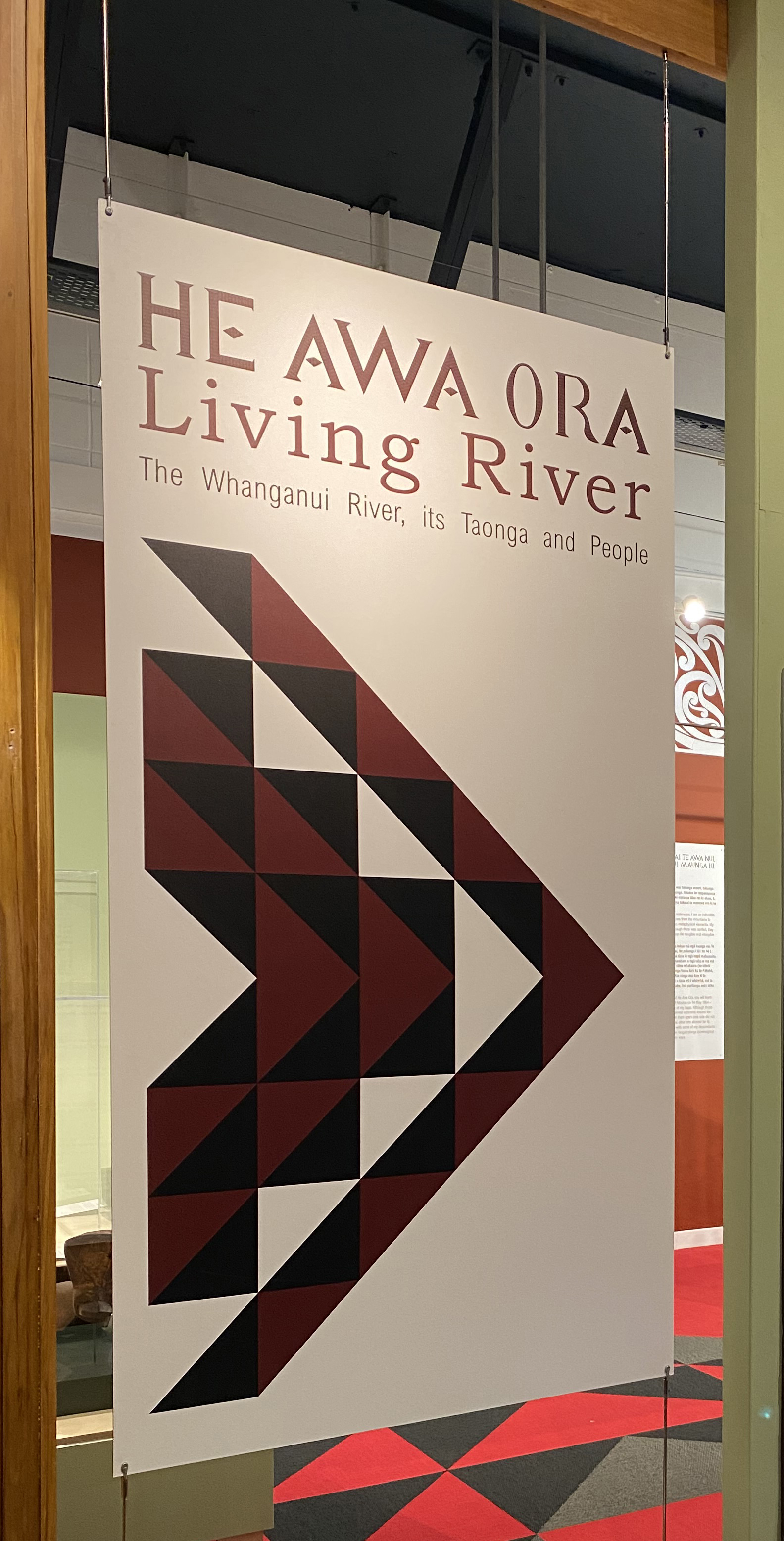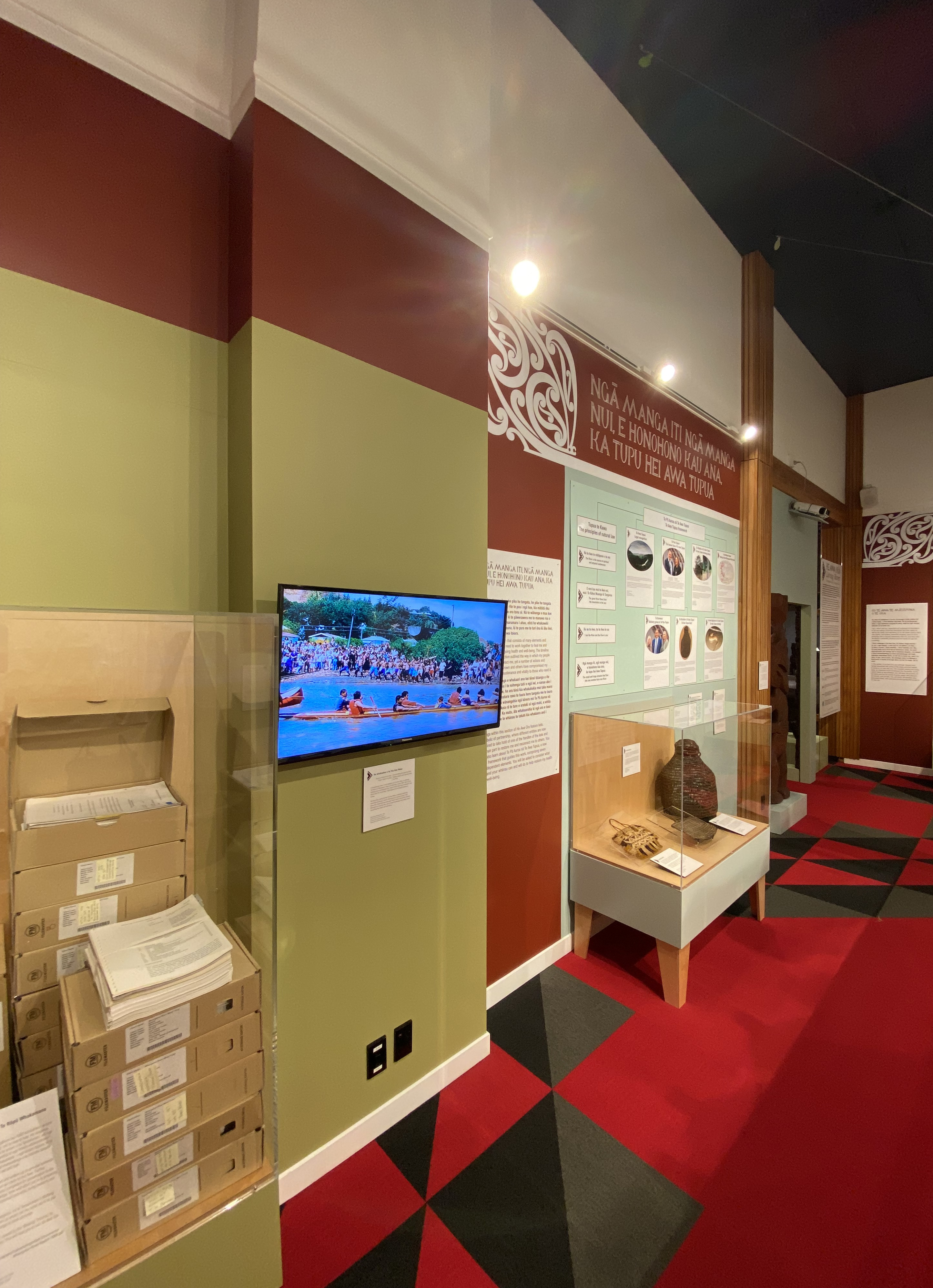 Designed to travel, this work will continually evolve and change, just like the awa it represents. And what a rich story it has to tell and with so many taonga to display. To respect what needed to be achieved within a very tight space and budget, every decision made was an important one. The constrained exhibition space has been transformed to successfully tell the story of Te Awa Tupua, the Whanganui River, and its people. The design starts with dynamic graphic exterior signage and seamlessly continues through to the flooring treatments in the museum atea and a pathway under the tomokanga. The location of taonga within the space has been carefully considered and curated in consultation with hapū and iwi. Clever use of colour helps the viewer navigate their way through the exhibition, from the mountain to the sea.
