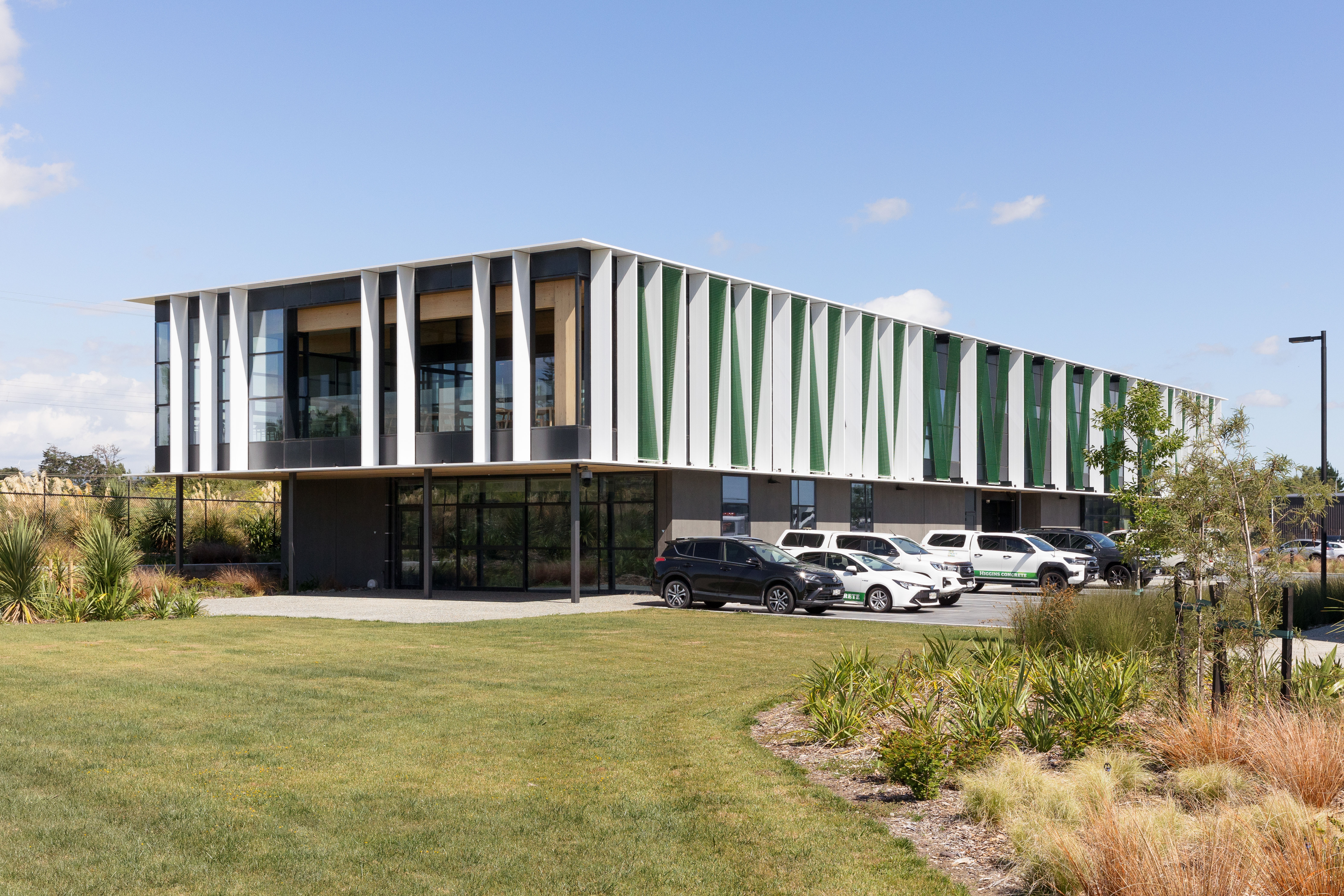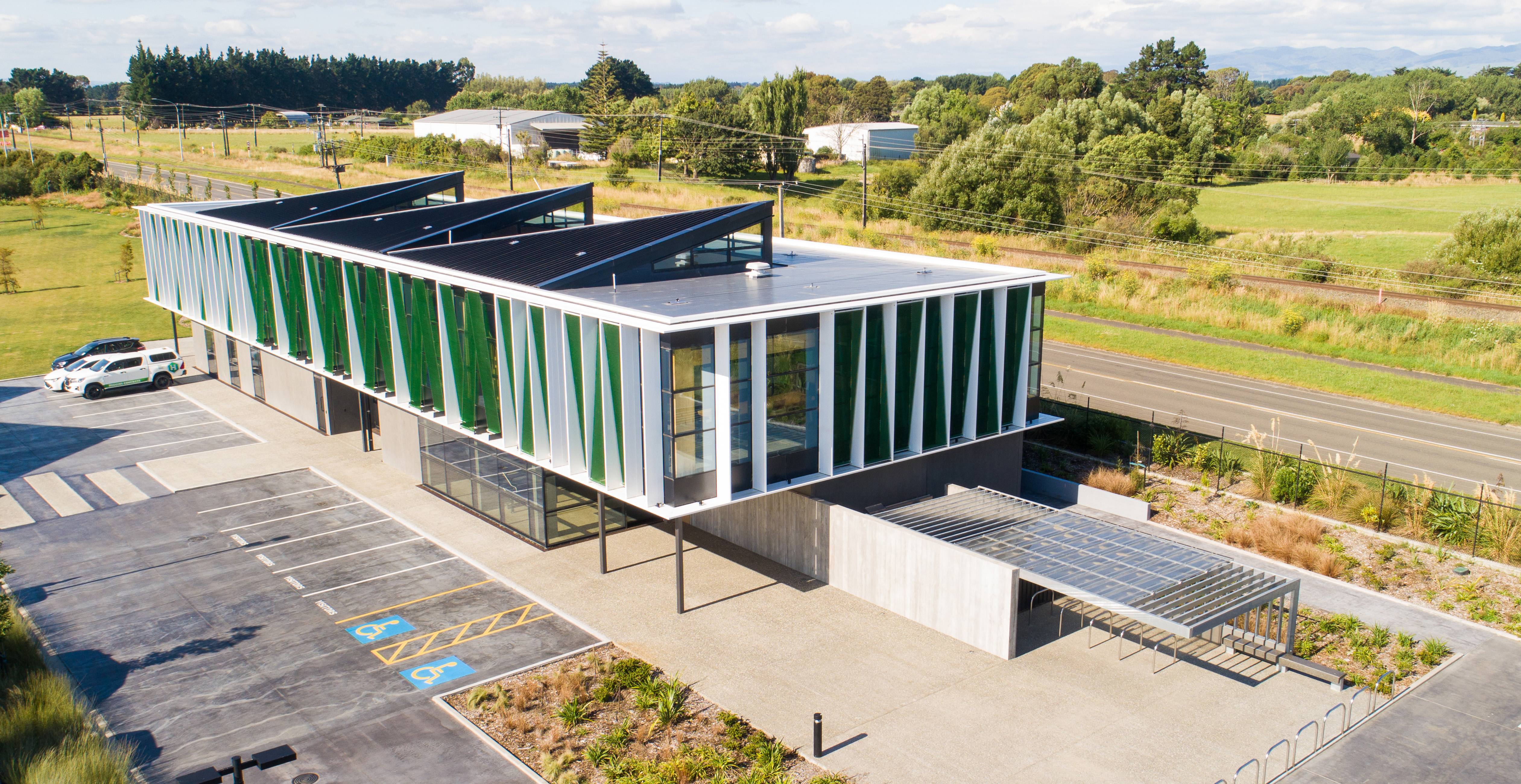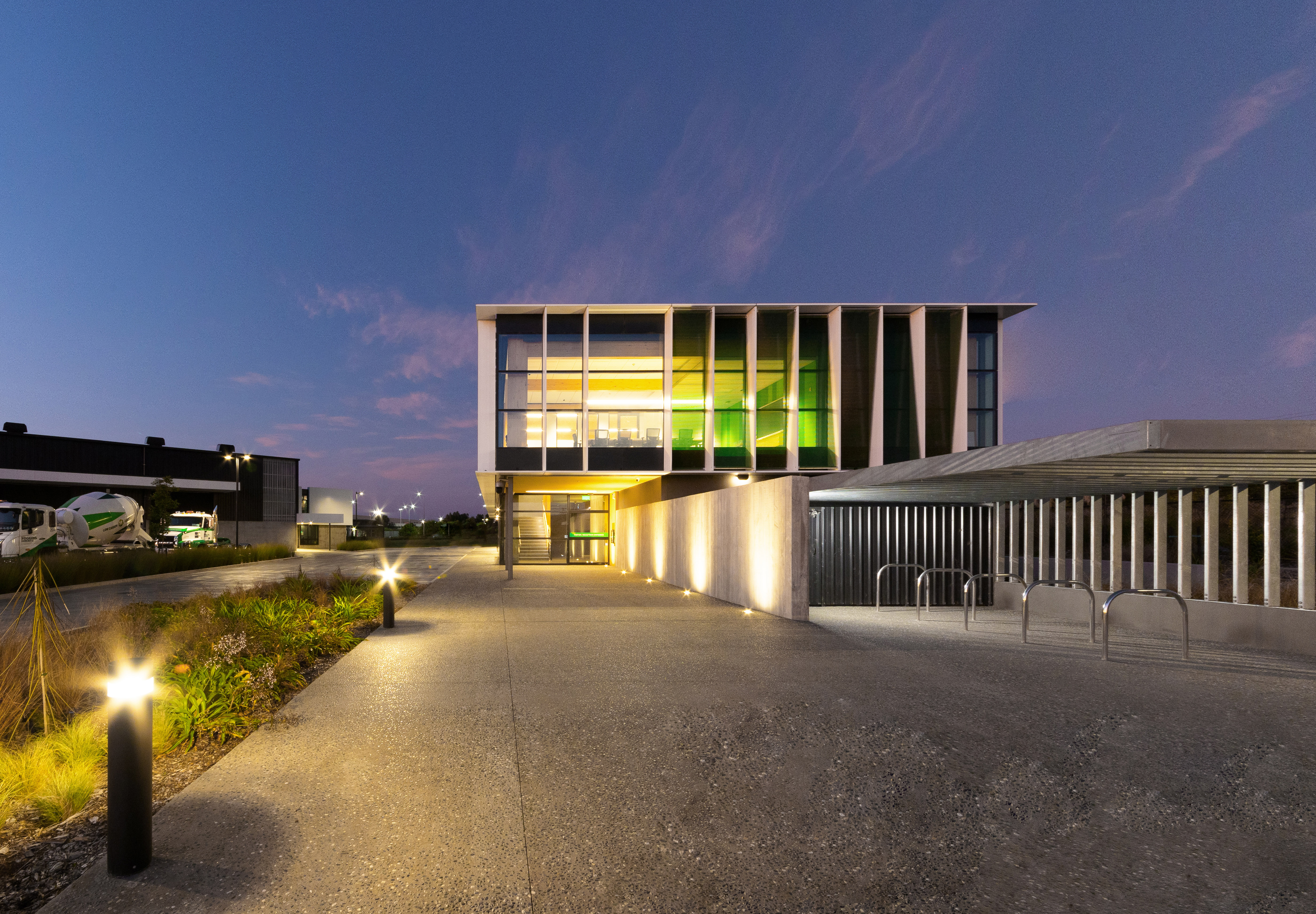 Sitting parallel to the main-trunk railroad, this new office building establishes a dynamic frontage to the industrial zone behind. The design utilises and showcases the positive attributes of concrete, combining it with glulam technology to deliver an energy-efficient structure. The concrete ground floor anchors the building form, providing a robust environment for staff amenities, a truckie’s kitchen and training room. The glulam upper floor provides a lightweight structure that floats above its base, with triangular pop-ups to the roof giving additional elevation. The triangular geometry recurs in the green Kaynemaile screens to the façade, adding a playfulness and moderating the internal environment. The resulting workspace feels protected from the surrounding industrial activities, yet strongly connected to the natural environment.