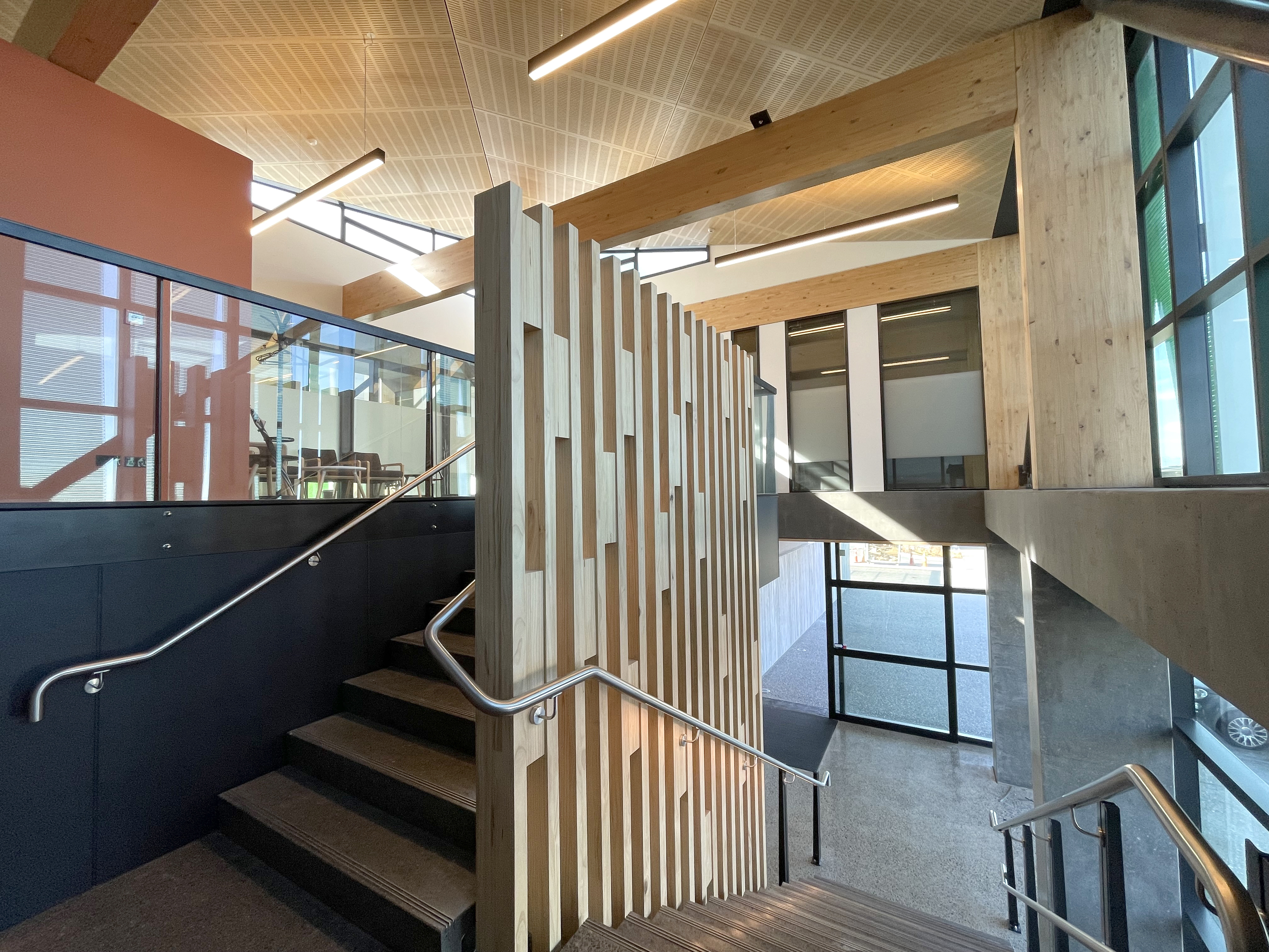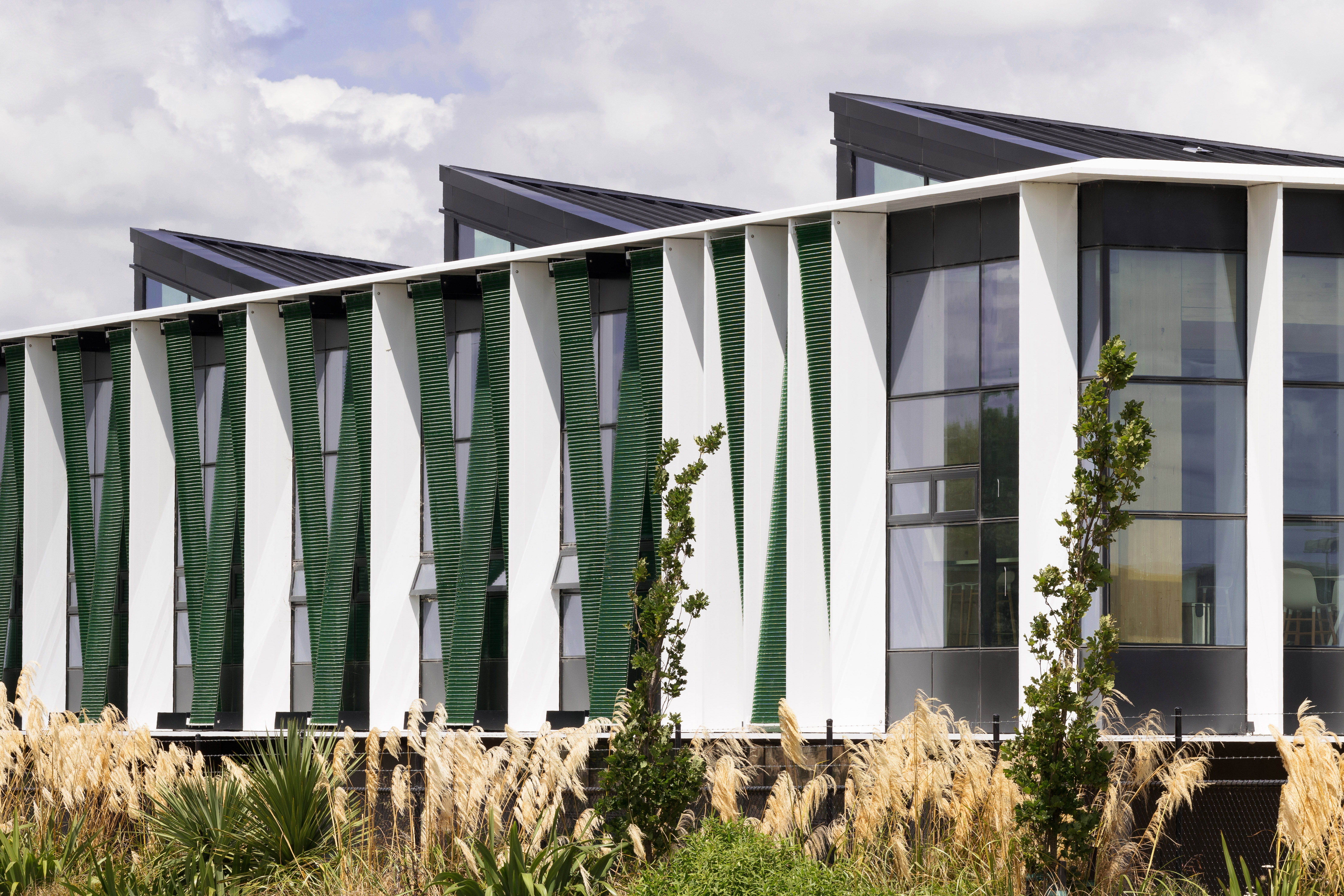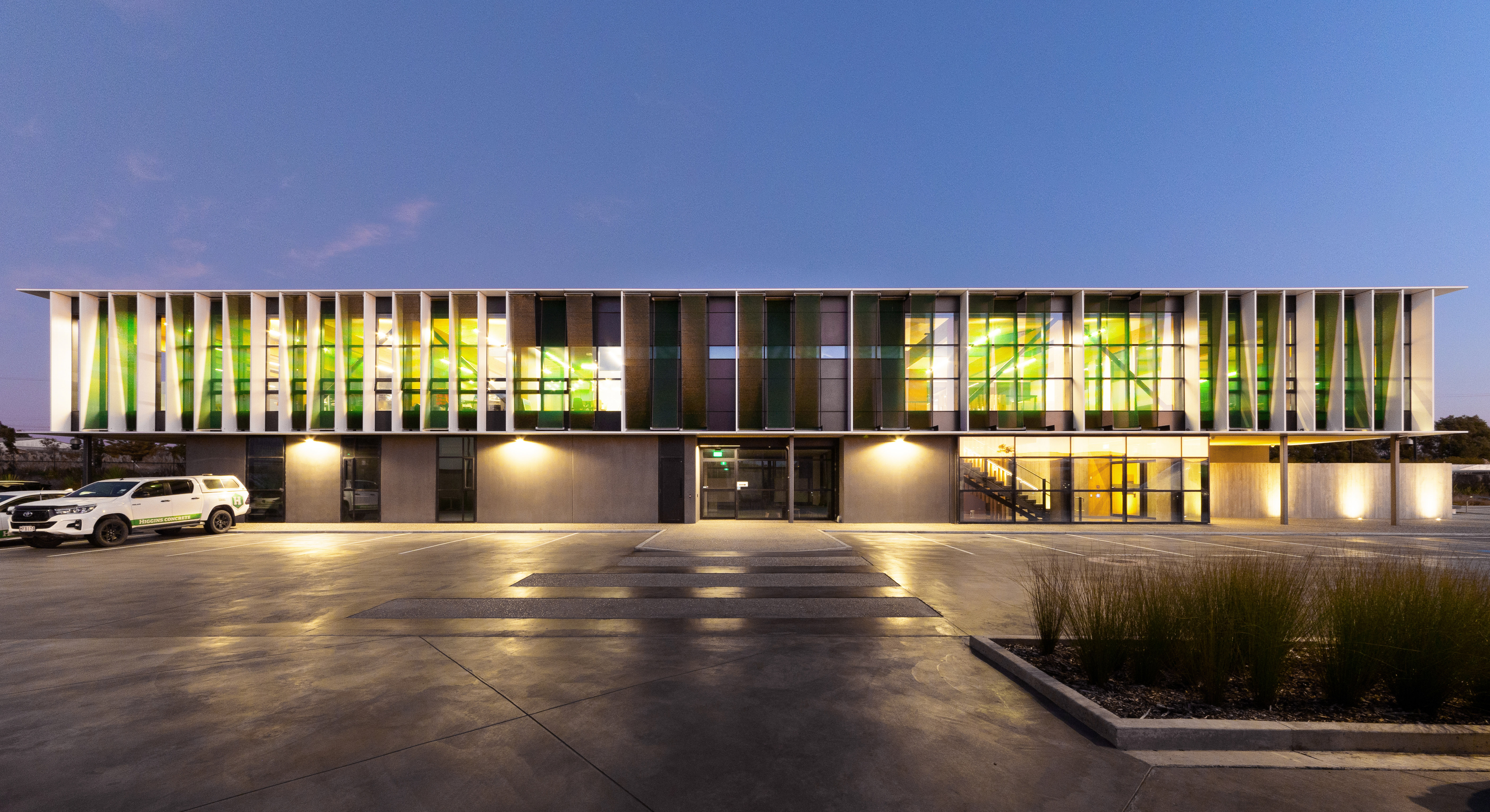 Sitting parallel to the main-trunk railroad, this new office building establishes a dynamic frontage to the industrial zone behind. The design utilises and showcases the positive attributes of concrete, combining it with glulam technology to deliver an energy-efficient structure. The concrete ground floor anchors the building form, providing a robust environment for staff amenities, a truckie’s kitchen and training room. The glulam upper floor provides a lightweight structure that floats above its base, with triangular pop-ups to the roof giving additional elevation. The triangular geometry recurs in the green Kaynemaile screens to the façade, adding a playfulness and moderating the internal environment. The resulting workspace feels protected from the surrounding industrial activities, yet strongly connected to the natural environment.