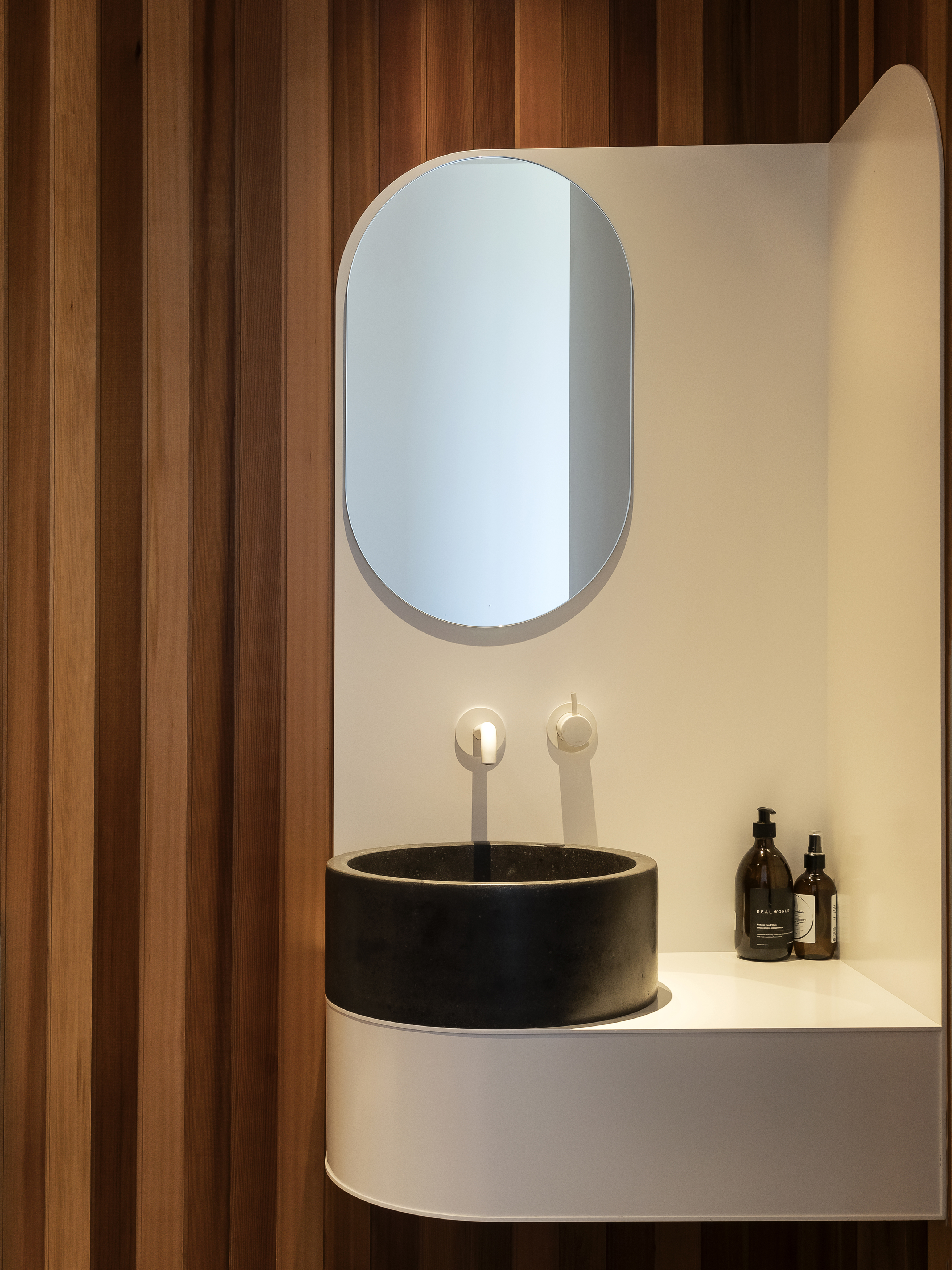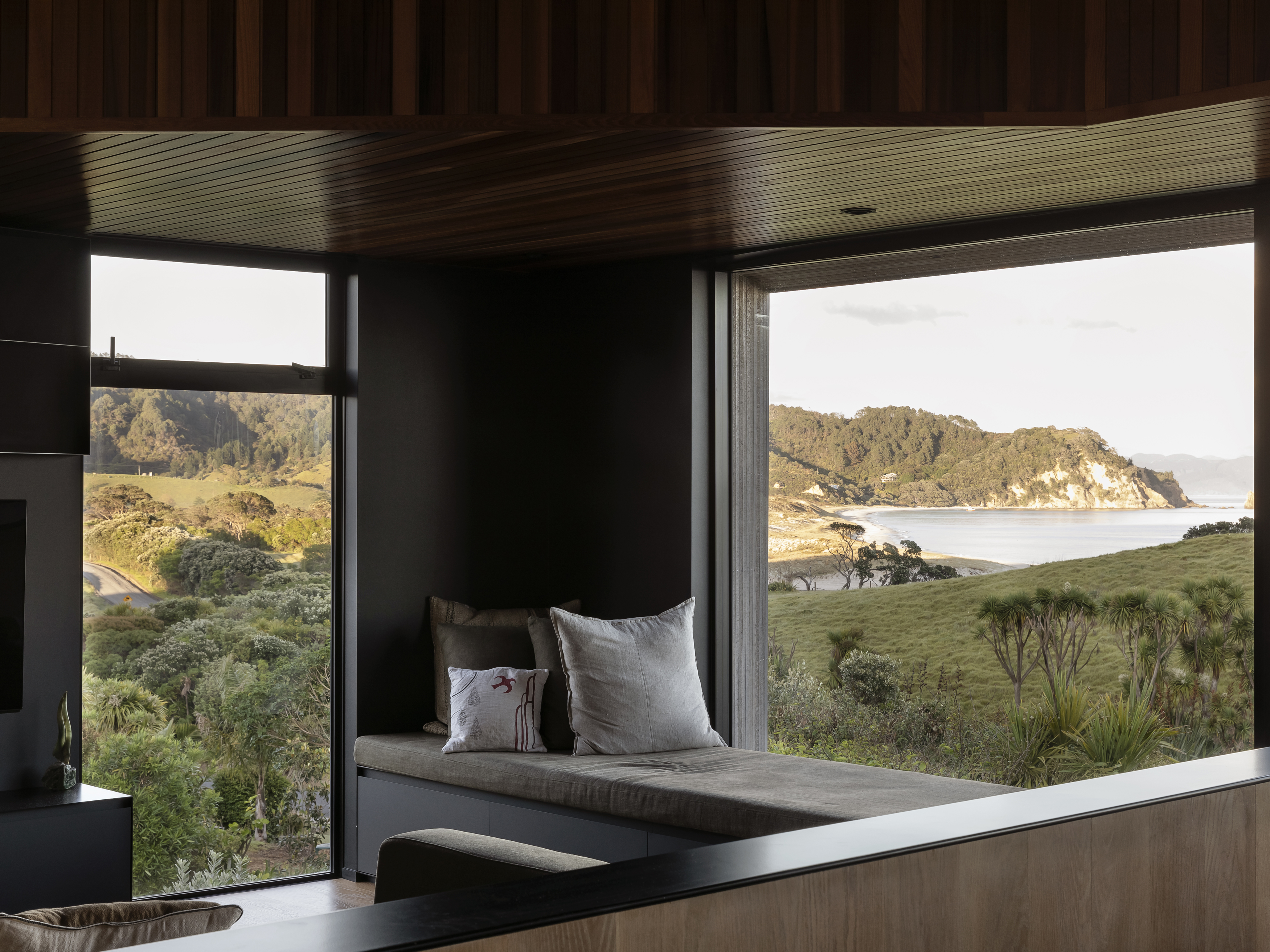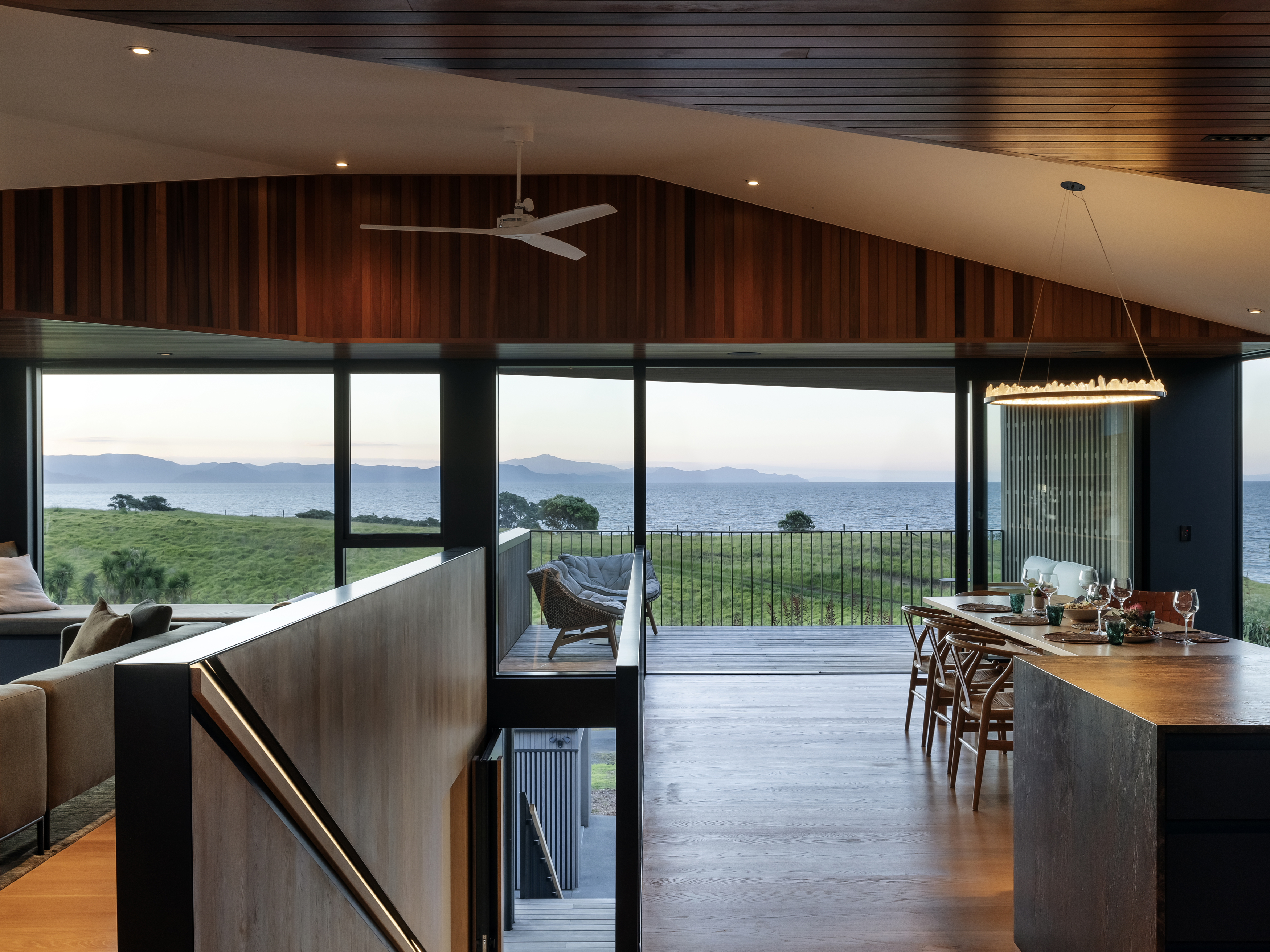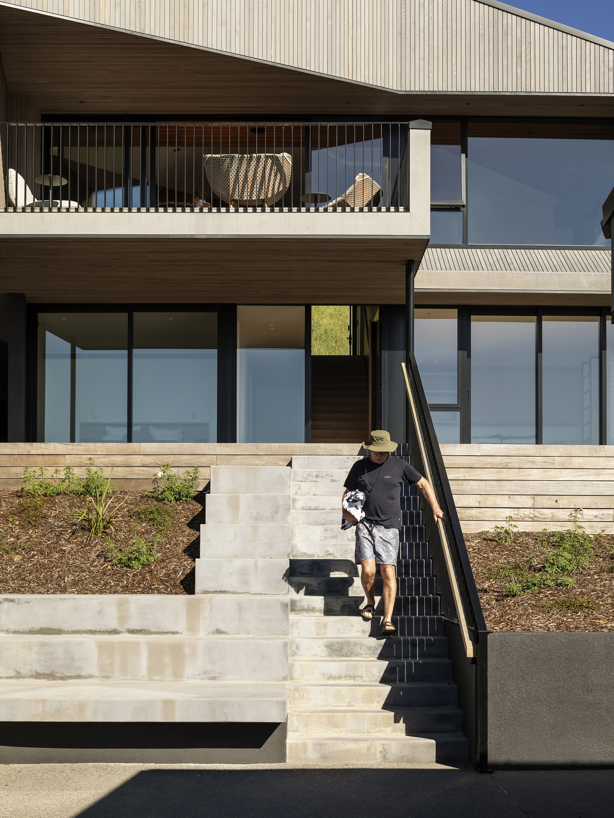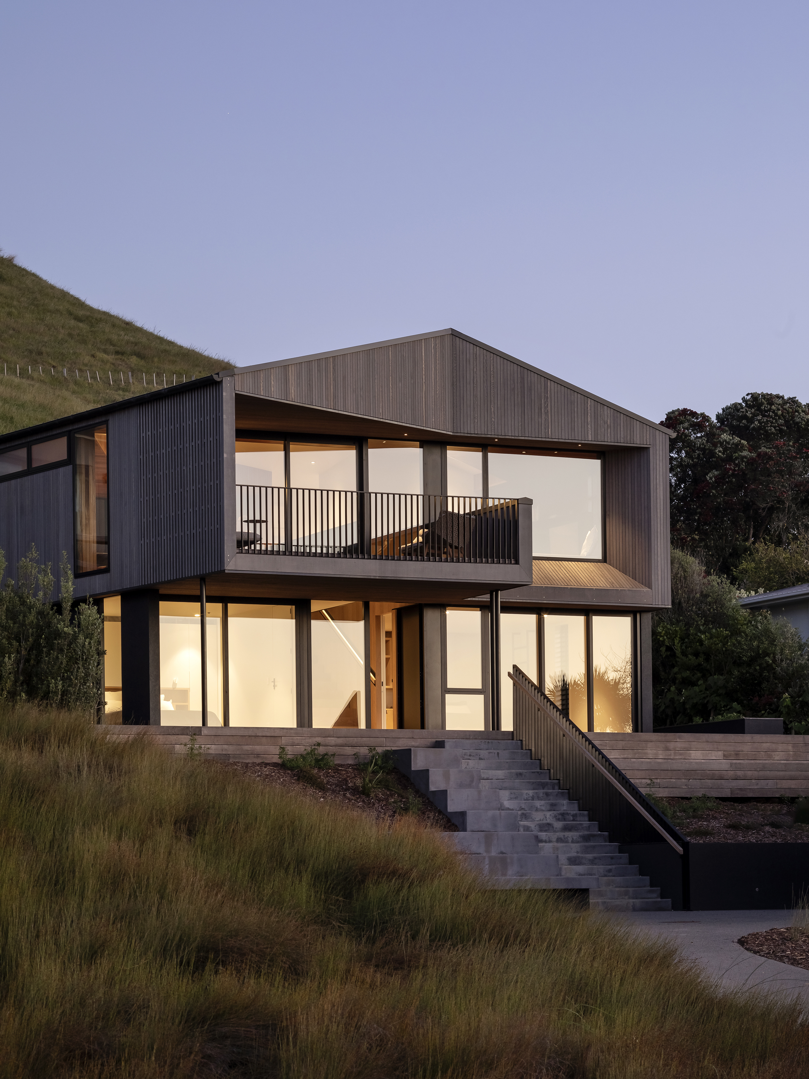 Cleverly modelled with a mannered response to the surrounding neighbourhood, this holiday house fits easily into its coastal and rural setting. The stained cedar upper cladding changes colour with the light and lends a subtle presence to the exterior. The well-appointed and comfortable interior and outdoor living spaces ably cater for a couple or a holiday crowd. The quality of the bathrooms is particularly worthy of mention. Both restful and lively, a house of many moods.