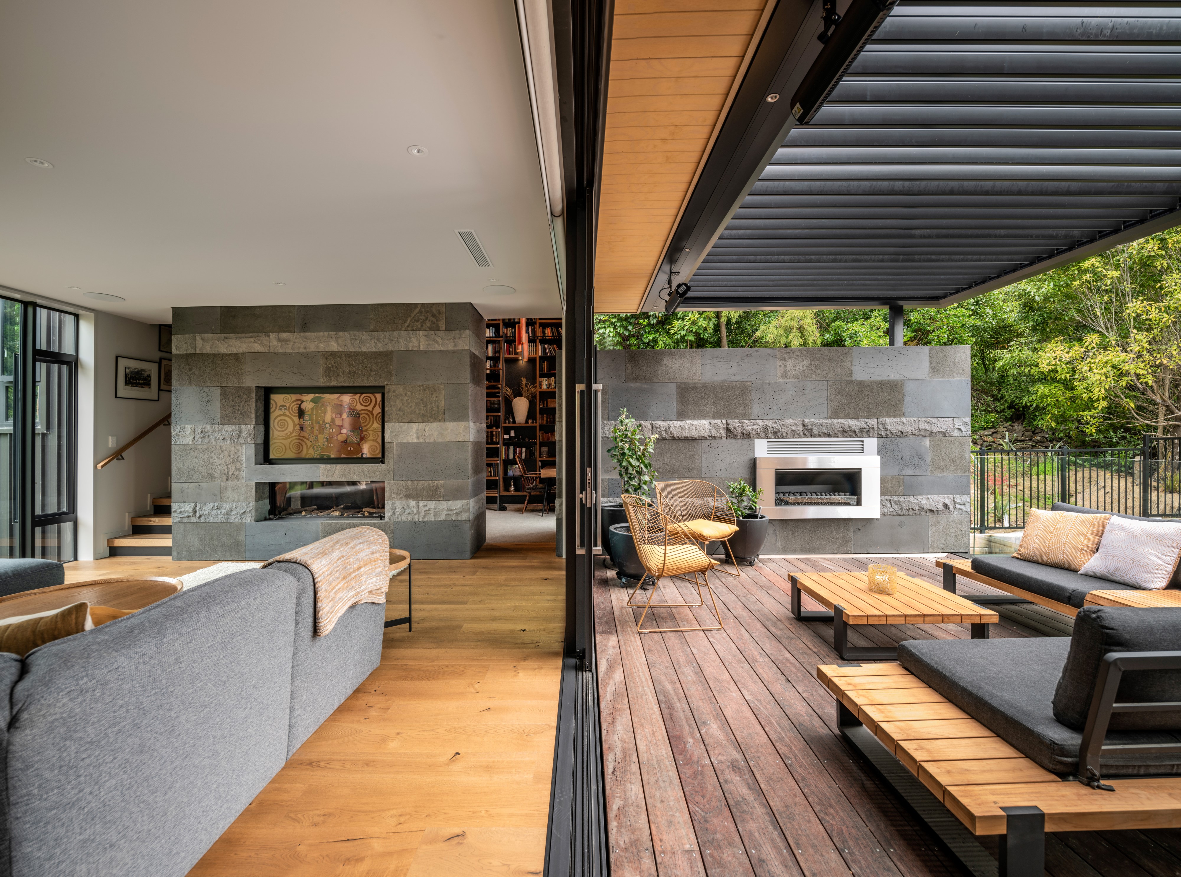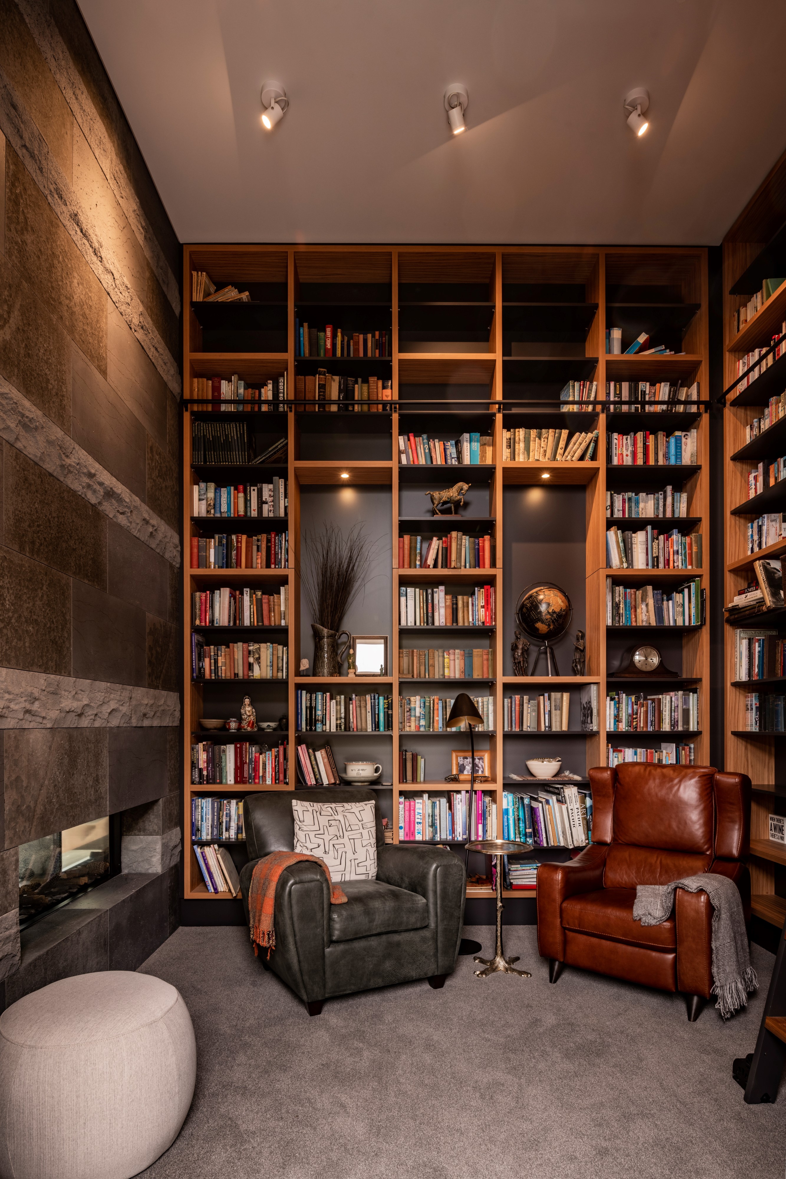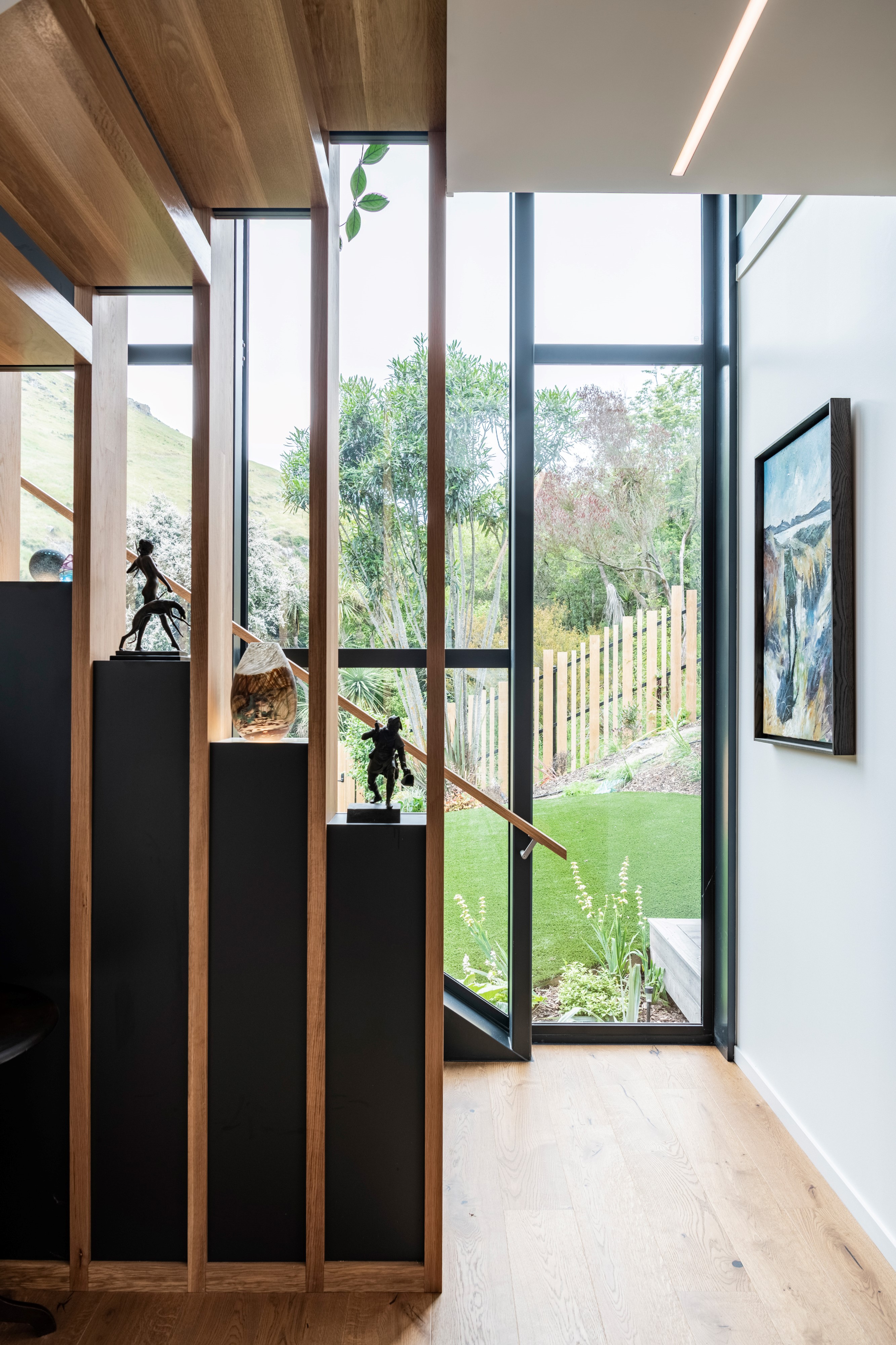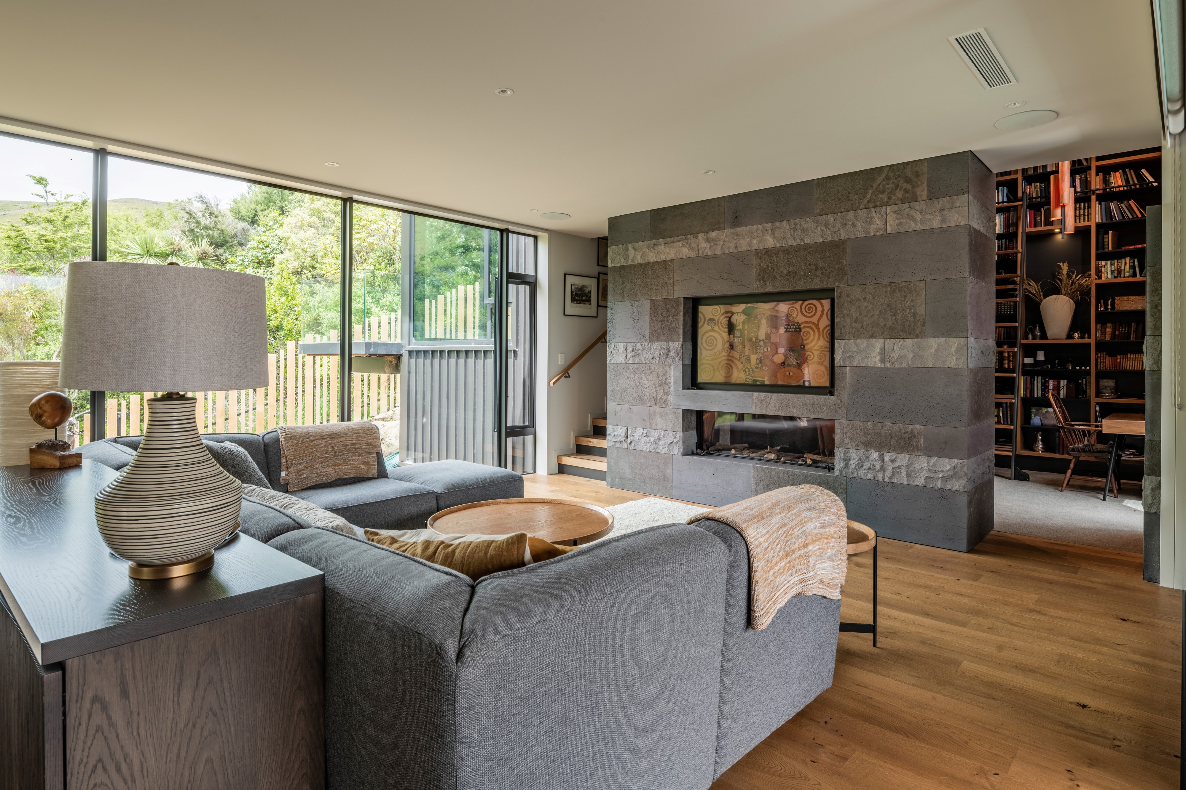 The design of this home is truly remarkable as it seamlessly integrates with its natural setting. Each separate living space is carefully crafted to cater to varying times of day and occasions, providing a truly personalised experience for the occupants. A stone wall that pays homage to the nearby hill makes the dwelling an integral part of its surrounding environment. The staircase is another noteworthy feature that offers breath-taking valley views. Additionally, hidden storage behind the library bookcase adds an exciting element for the grandchildren to enjoy. This sensitive design creates an exceptional living experience in harmony with nature.